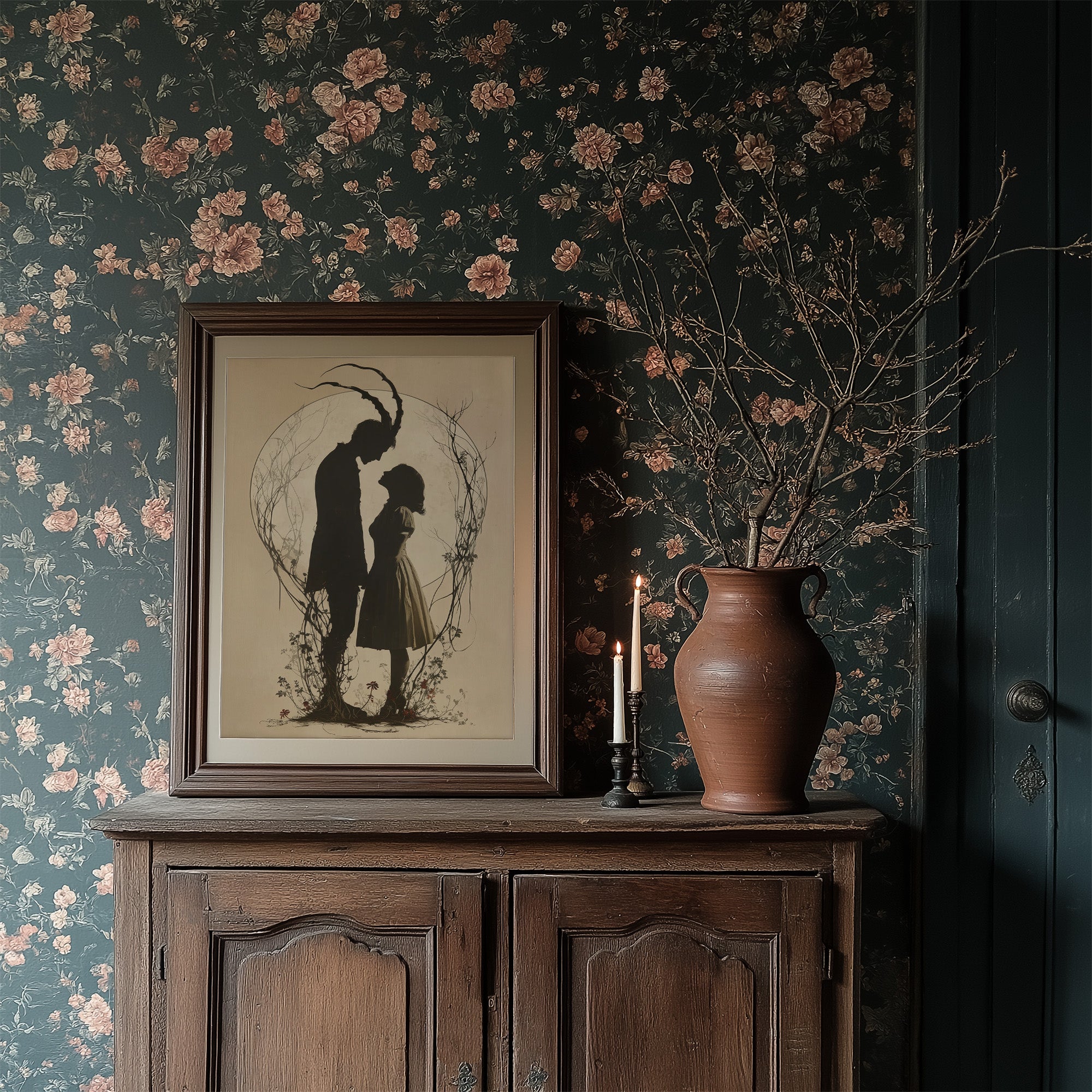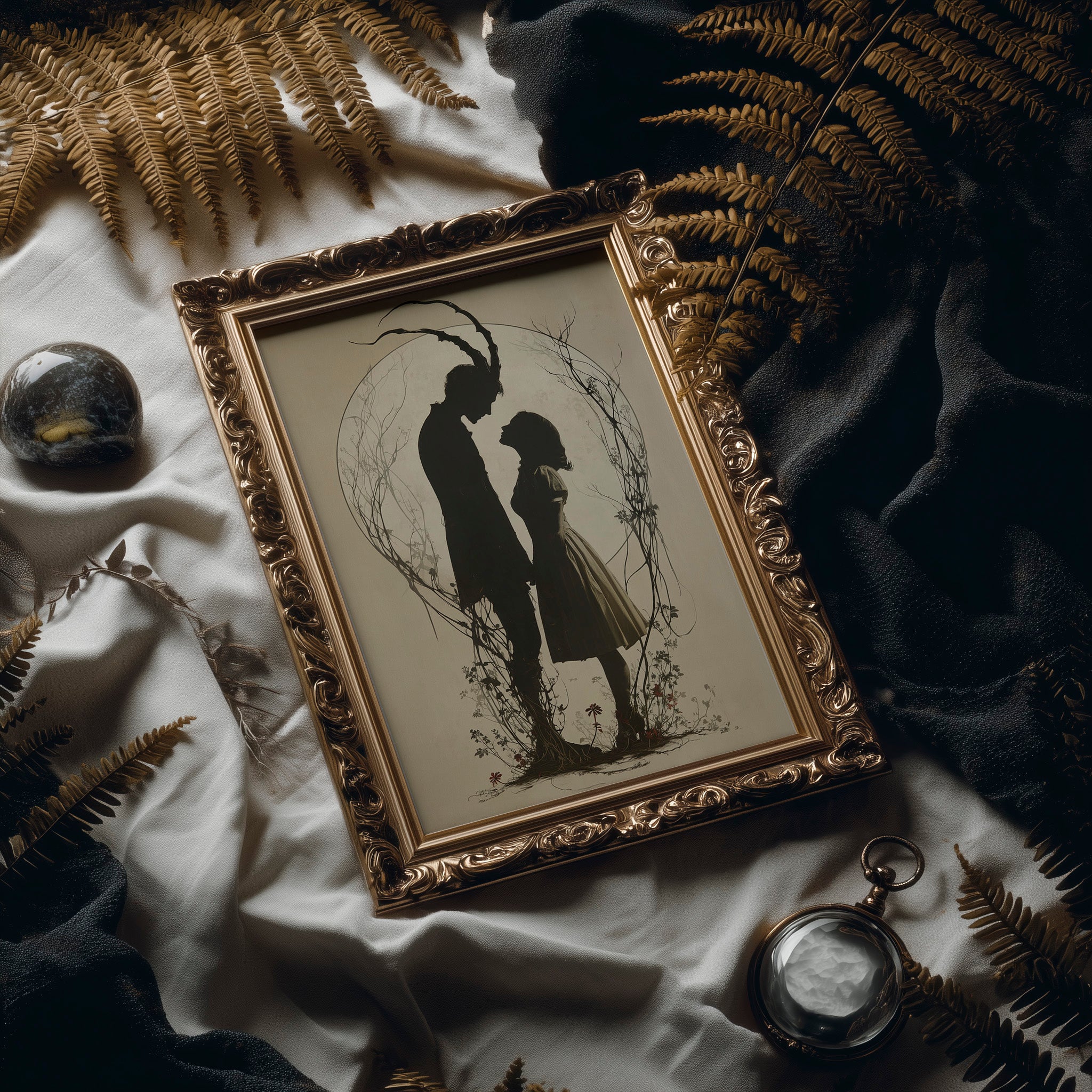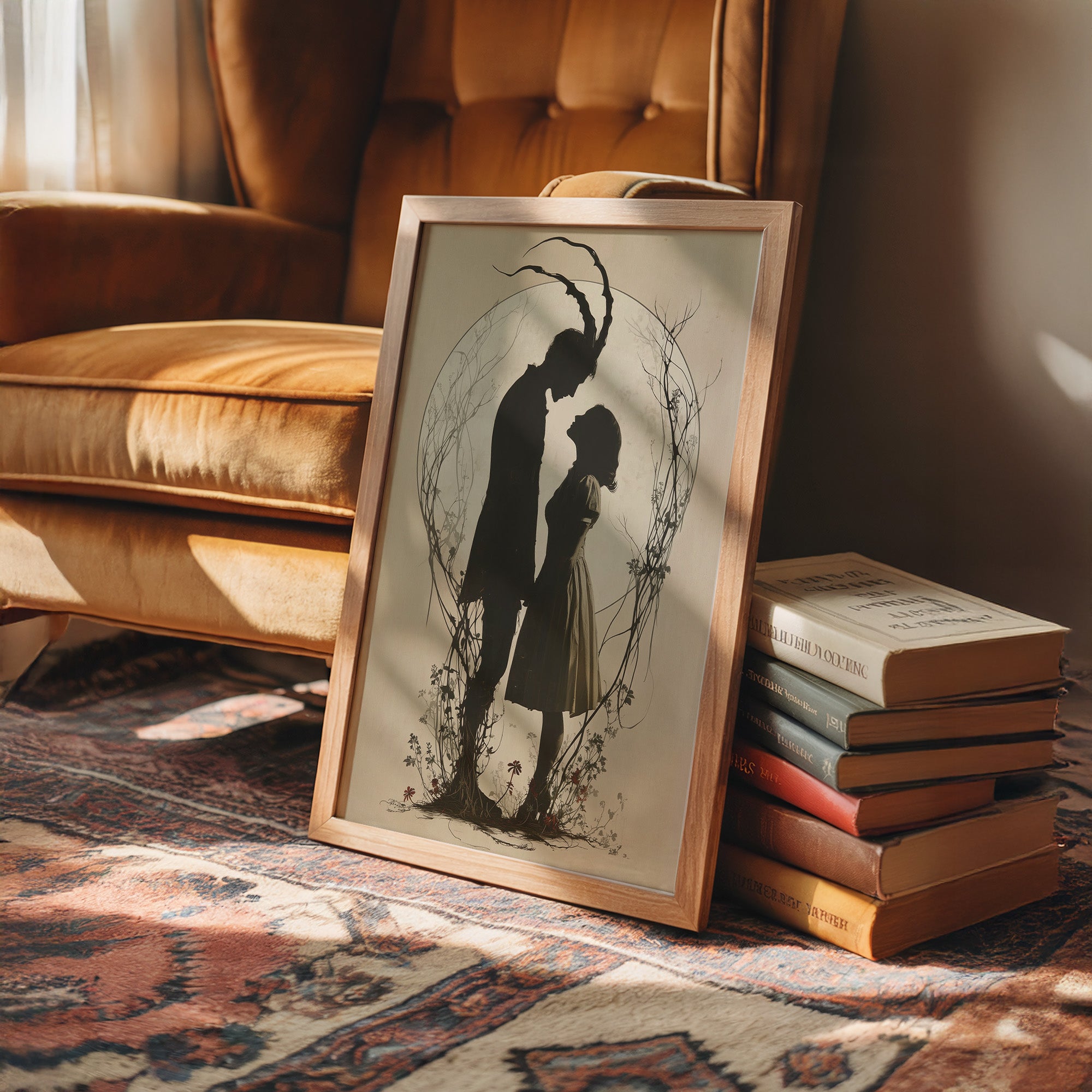Two figures stand frozen in time, their silhouettes captured against a luminous backdrop like characters from a forgotten fable. The delicate circular frame of intertwining branches creates a portal between worlds, where fantasy and reality blur into soft monochrome poetry. Against the dramatic black wall, this ethereal scene speaks of connection, mythology, and the timeless dance of companionship.