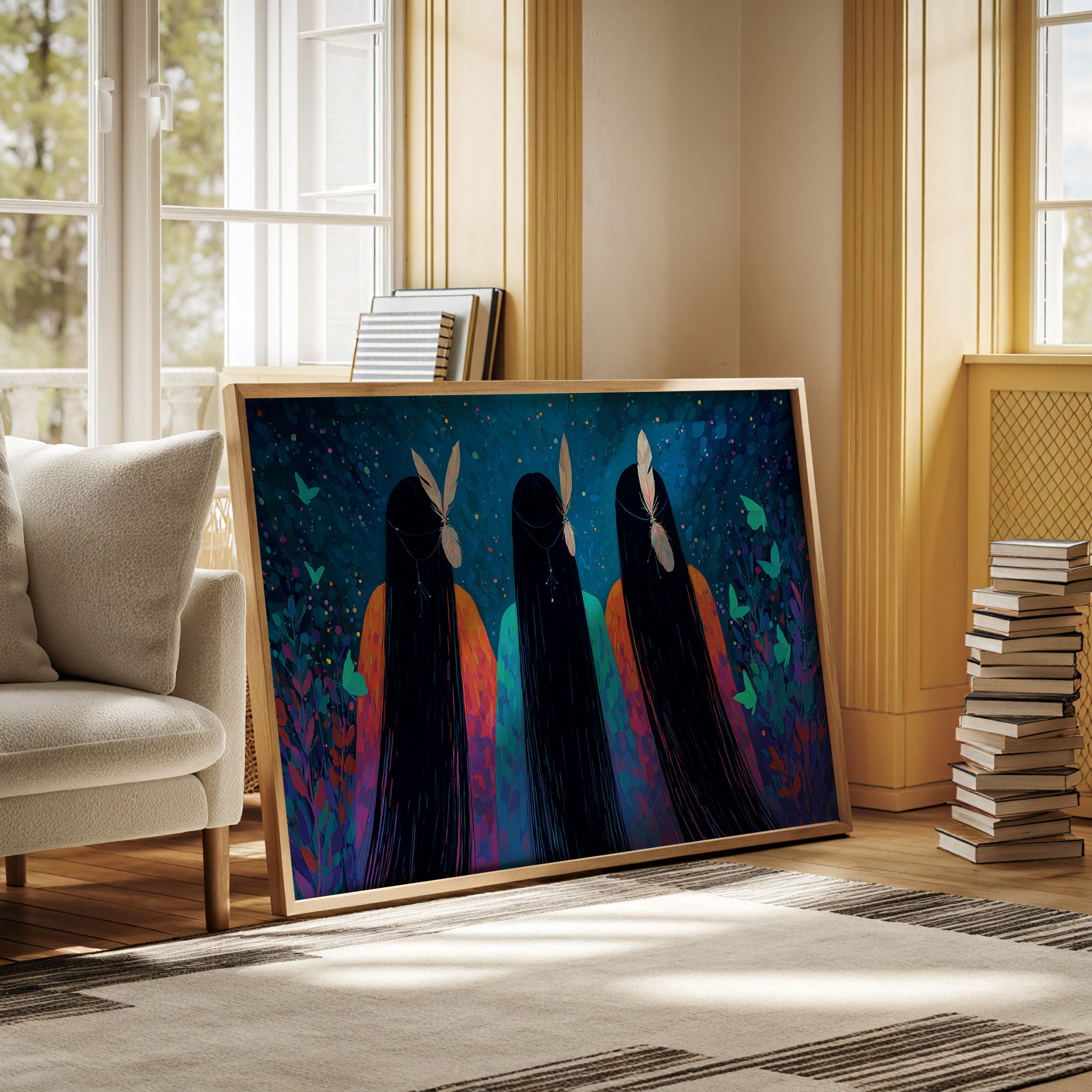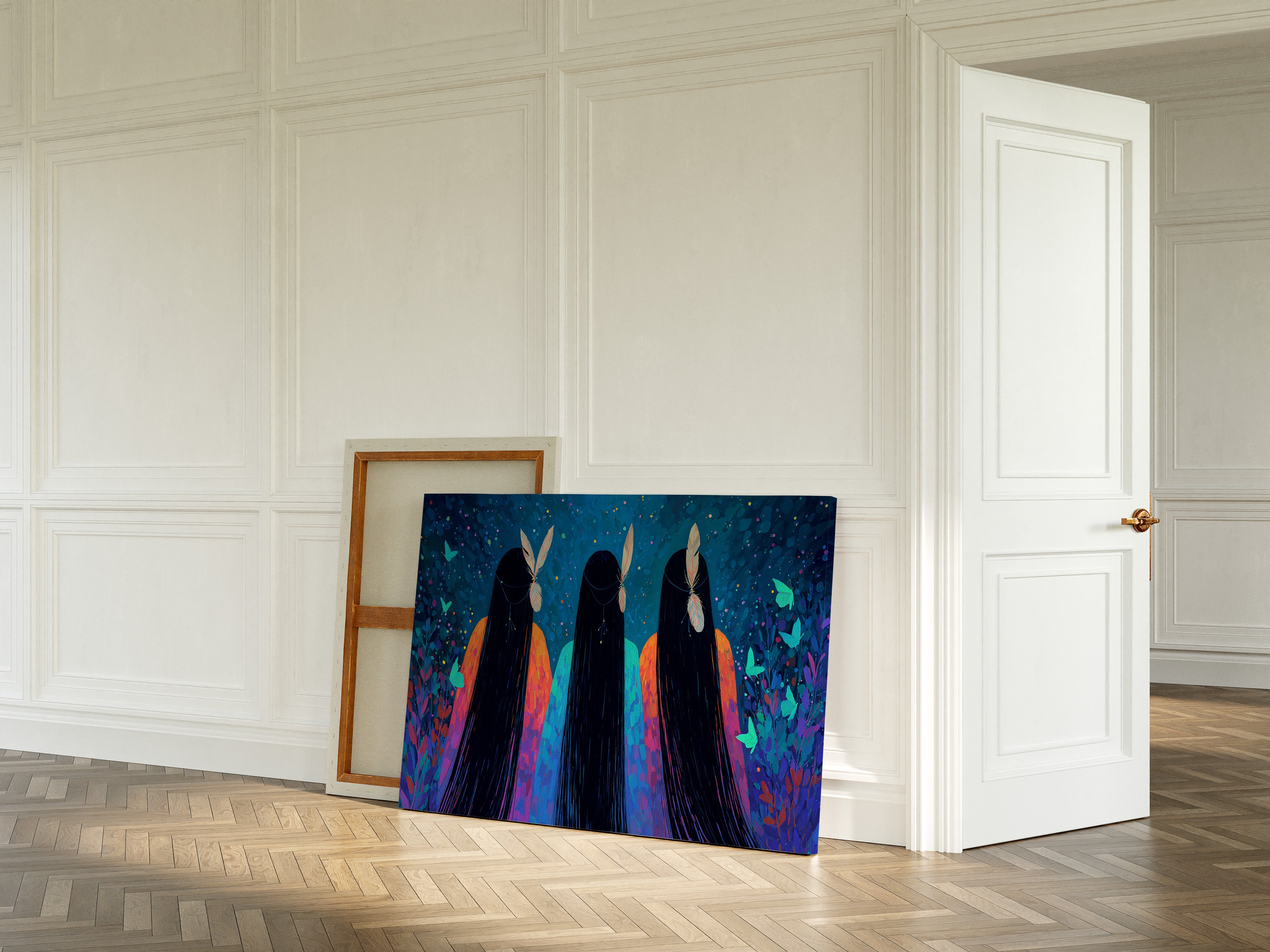 "In the depths of a starlit evening, three figures stand in silent communion with the night. Their flowing ebony hair cascades like silk waterfalls against vibrant robes of coral and turquoise, each crowned with a delicate feather that seems to capture starlight. The scene pulses with magical energy as ethereal butterflies in luminous teal float through purple-tinged foliage.