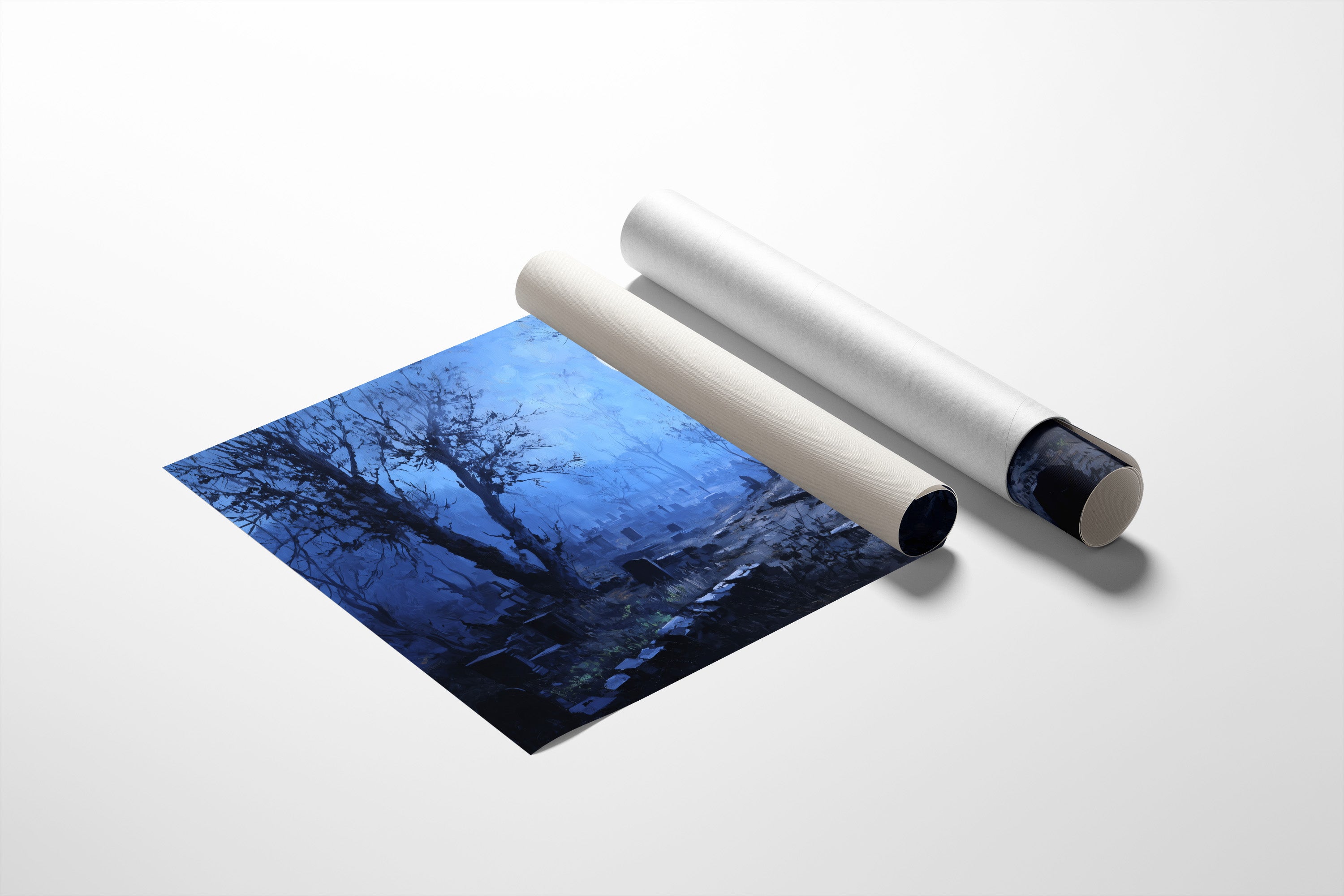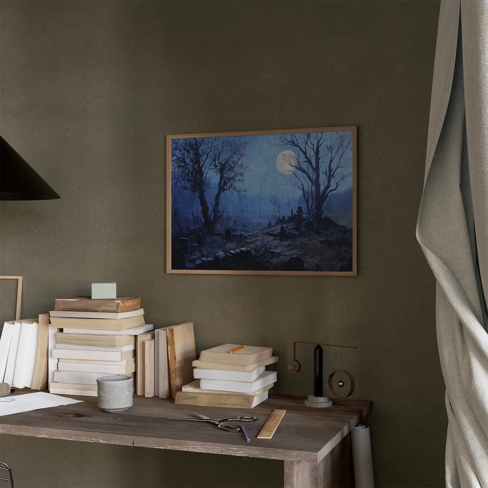 Silence hangs heavy as moonlight spills across forgotten markers and twisted branches. The luminous orb casts an ethereal glow through barren trees, transforming the cemetery into a hauntingly beautiful tableau of blue shadows and silver light. Weathered headstones stand as silent witnesses to time's passage, their stories preserved in this melancholic nocturne framed against a scholarly backdrop. This evocative piece creates a striking focal point in a home library or reading nook, where contemplative moments are treasured.