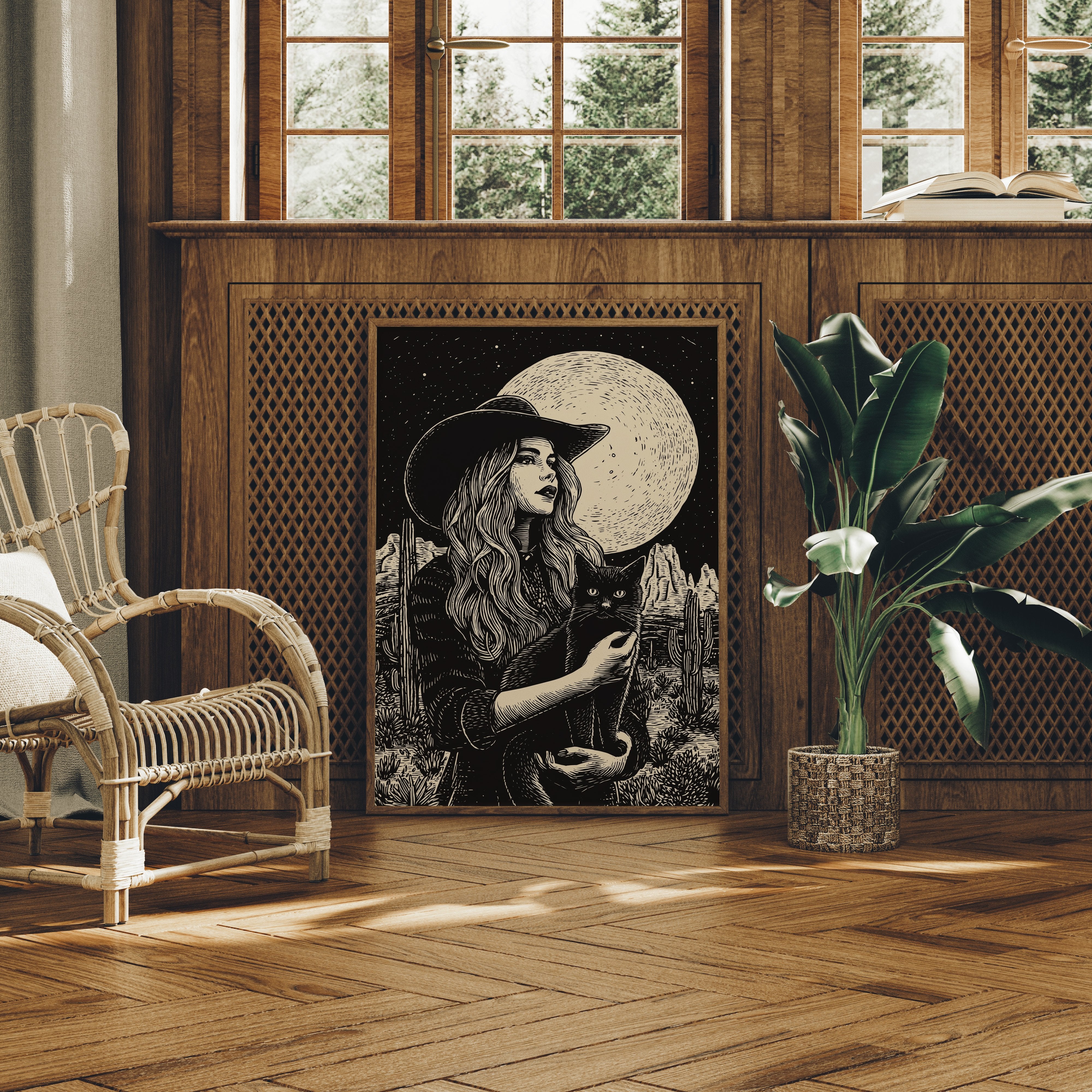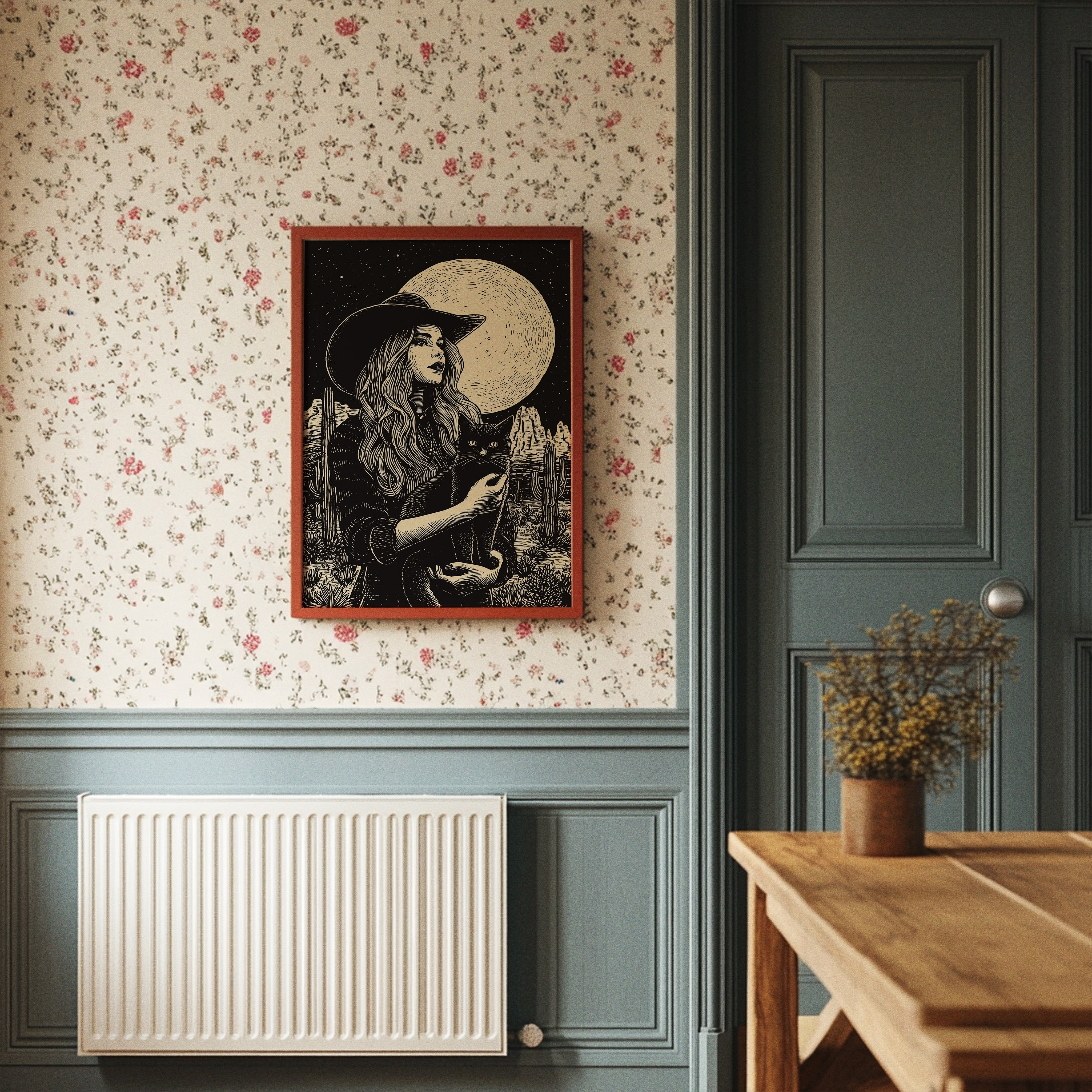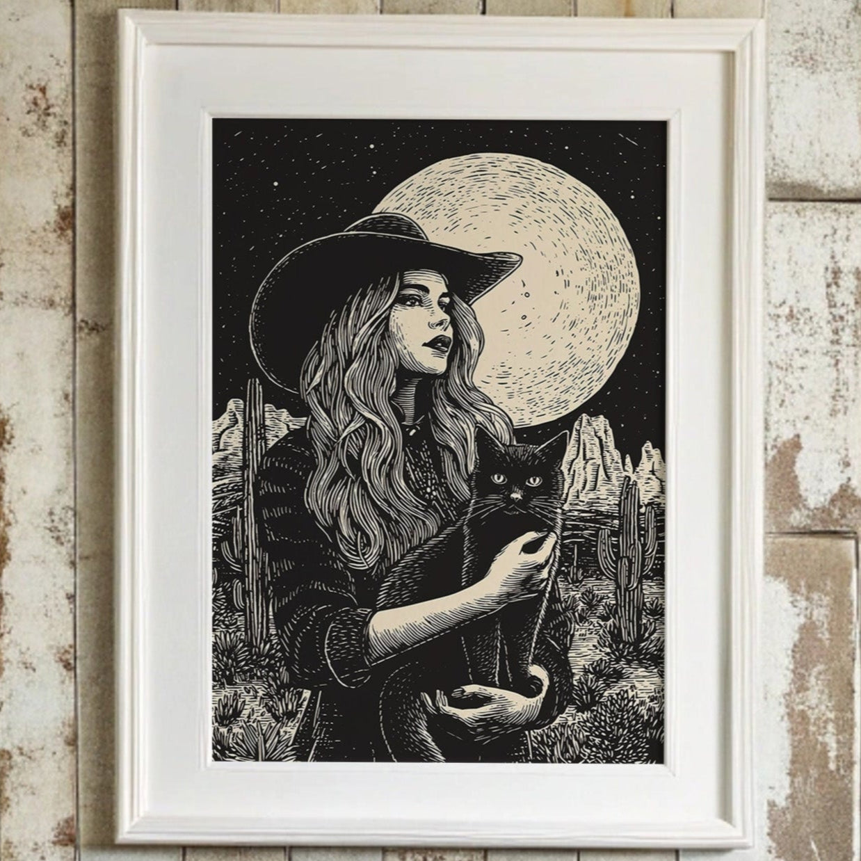 Under a luminous desert moon, mystery unfolds in stark contrasts of light and shadow. This striking woodcut-style piece from our Contemporary collection captures the essence of southwestern mystique and modern folk art. A figure in a wide-brimmed hat cradles a midnight-black cat against the backdrop of towering saguaros and a dramatic full moon, while delicate linework creates texture in every detail from flowing hair to scattered stars. The composition speaks to both solitude and connection, with the vast desert night serving as nature's theater. This piece commands attention in a modern bohemian living space or adds dramatic flair to a reading nook. Its bold contrasts and ethereal mood invite contemplation while grounding a space in artistic sophistication.