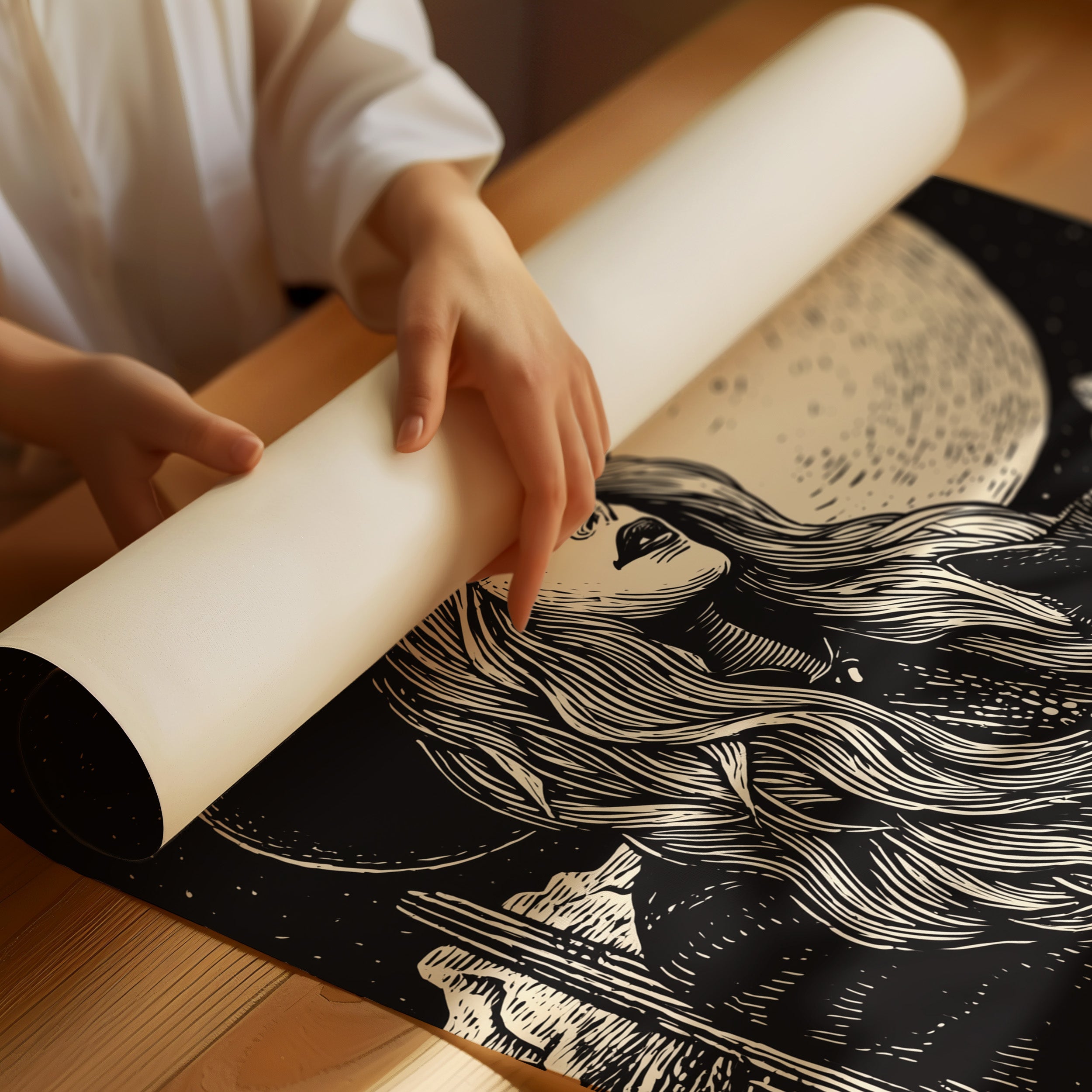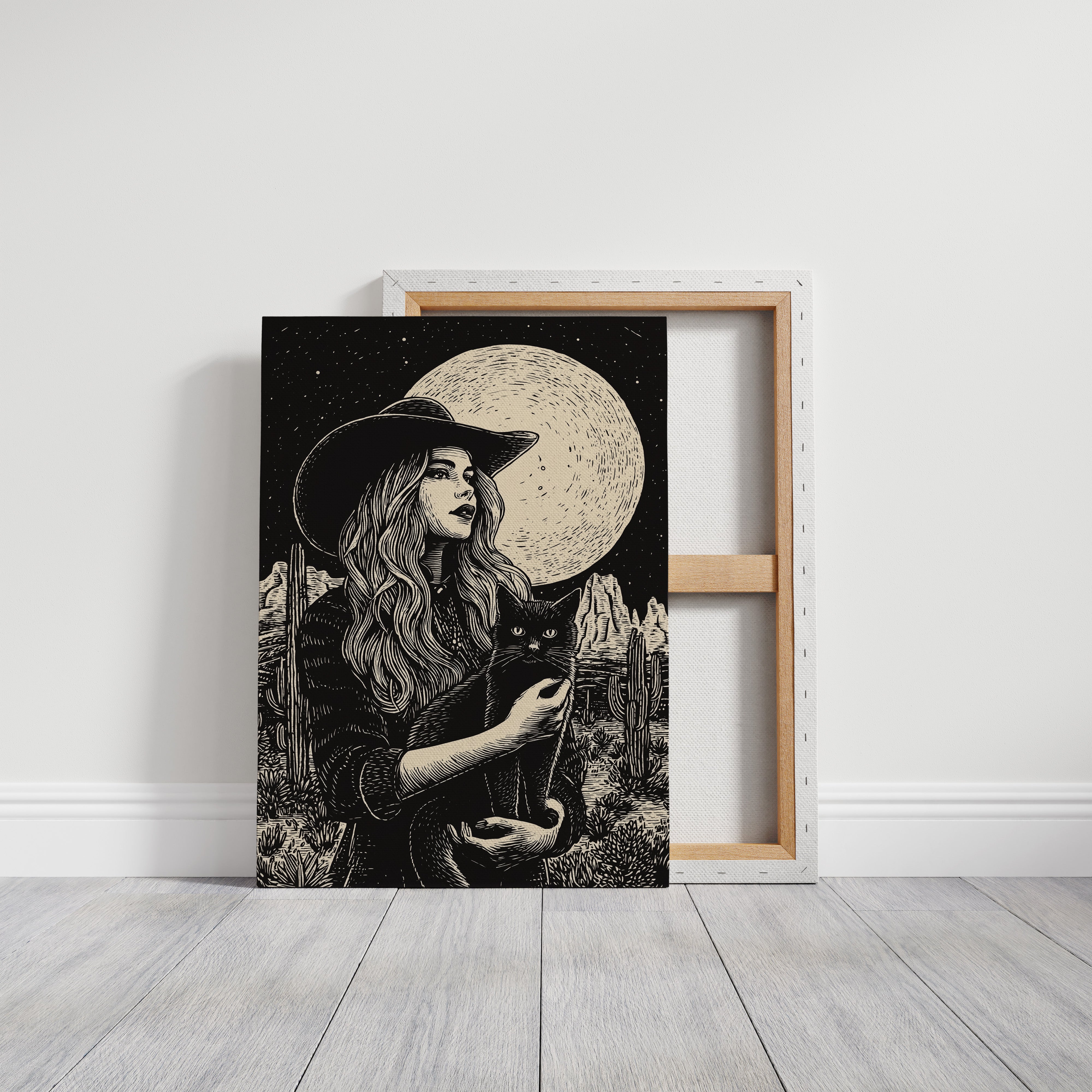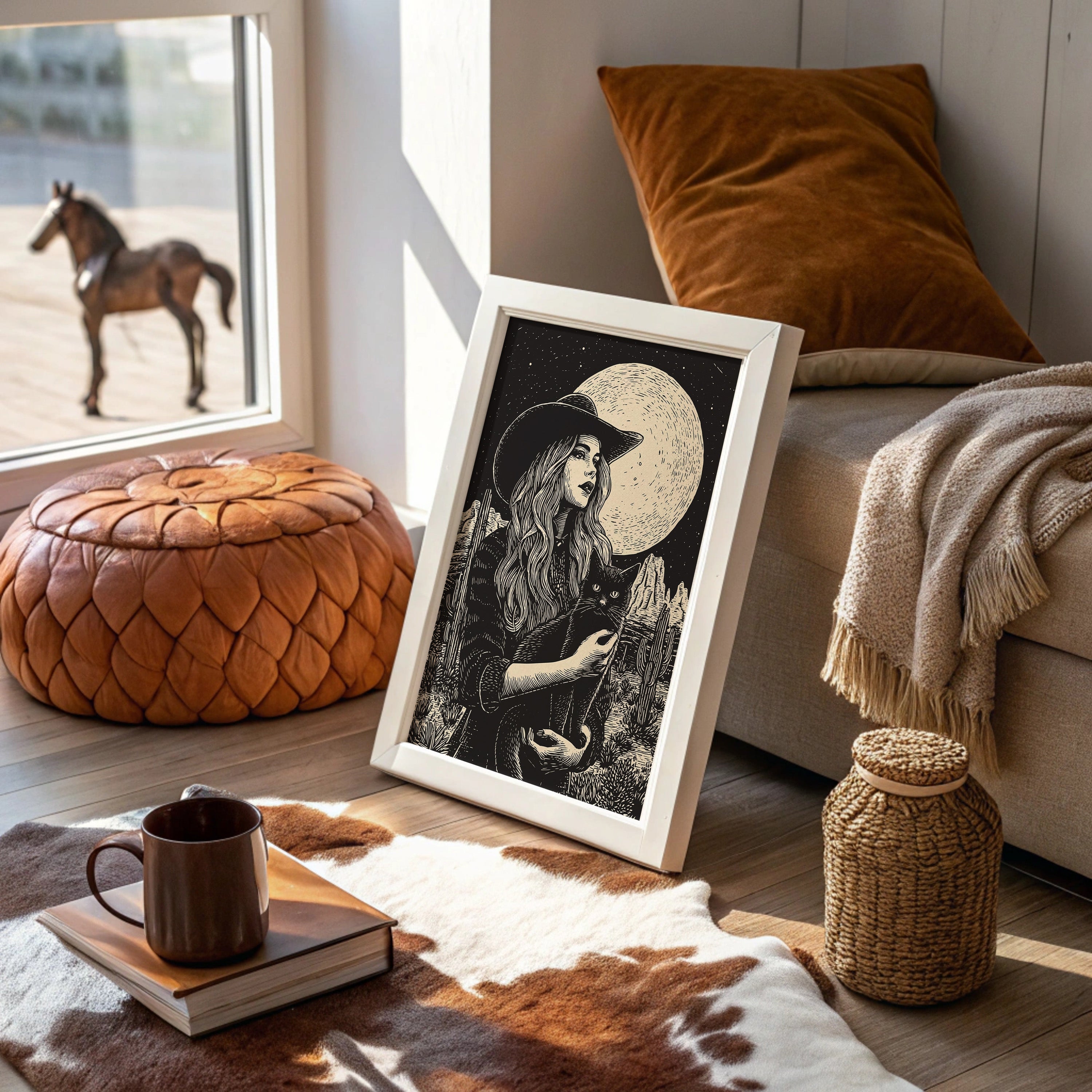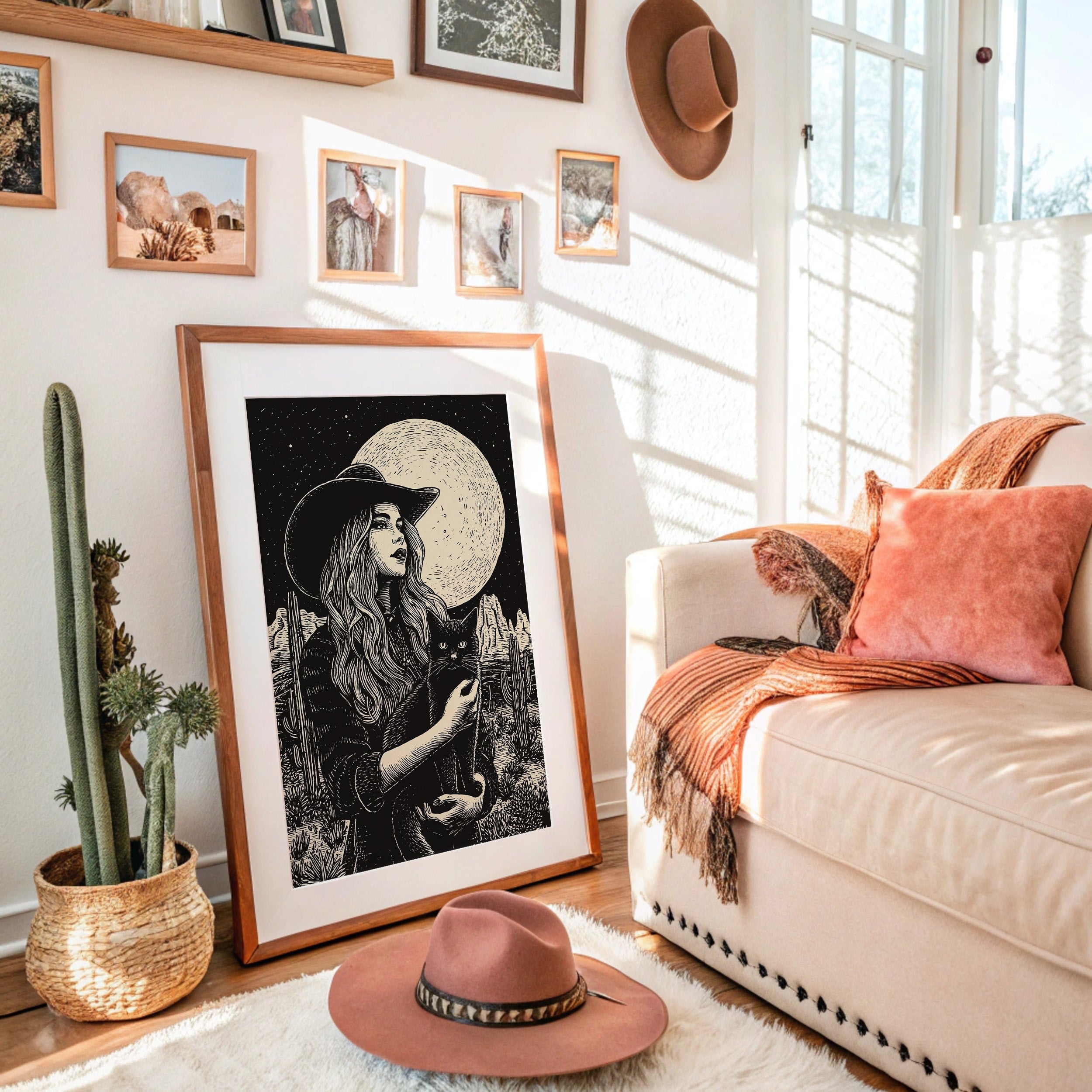 Under a luminous desert moon, mystery unfolds in stark contrasts of light and shadow. This striking woodcut-style piece from our Contemporary collection captures the essence of southwestern mystique and modern folk art. A figure in a wide-brimmed hat cradles a midnight-black cat against the backdrop of towering saguaros and a dramatic full moon, while delicate linework creates texture in every detail from flowing hair to scattered stars. The composition speaks to both solitude and connection, with the vast desert night serving as nature's theater. This piece commands attention in a modern bohemian living space or adds dramatic flair to a reading nook. Its bold contrasts and ethereal mood invite contemplation while grounding a space in artistic sophistication.