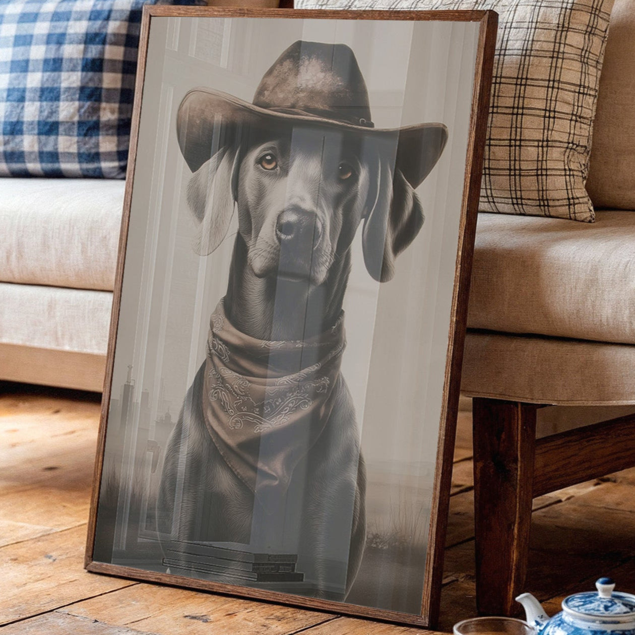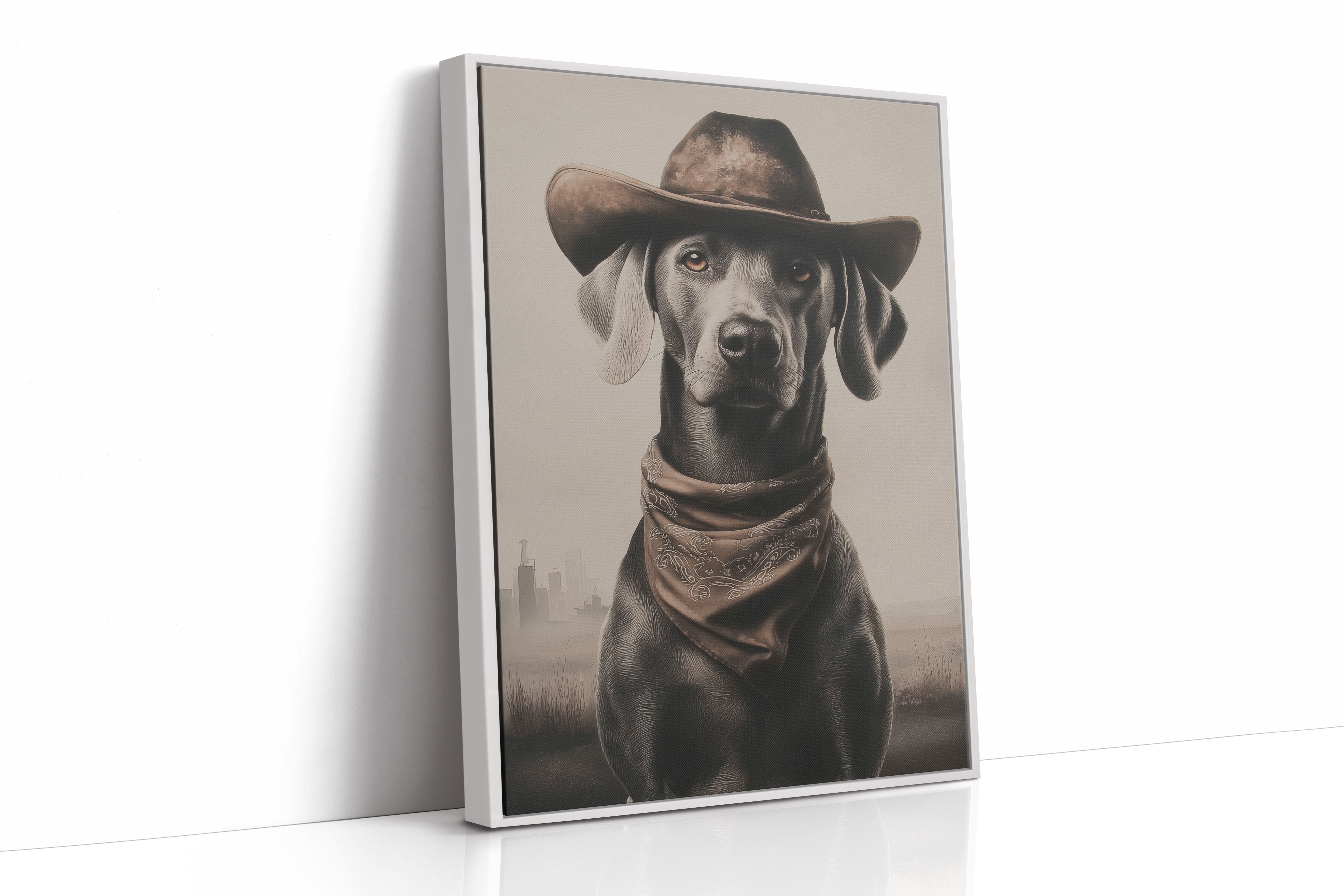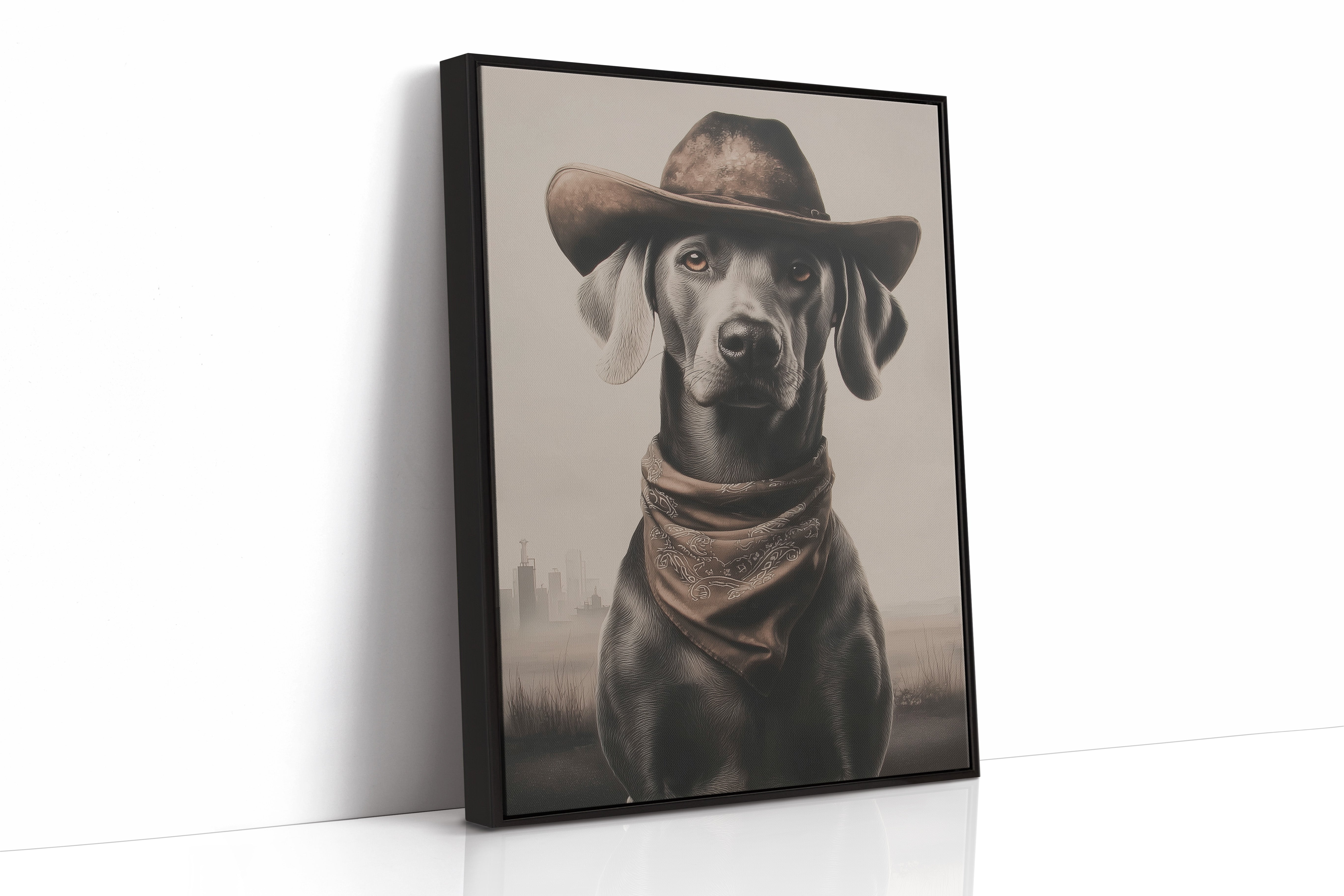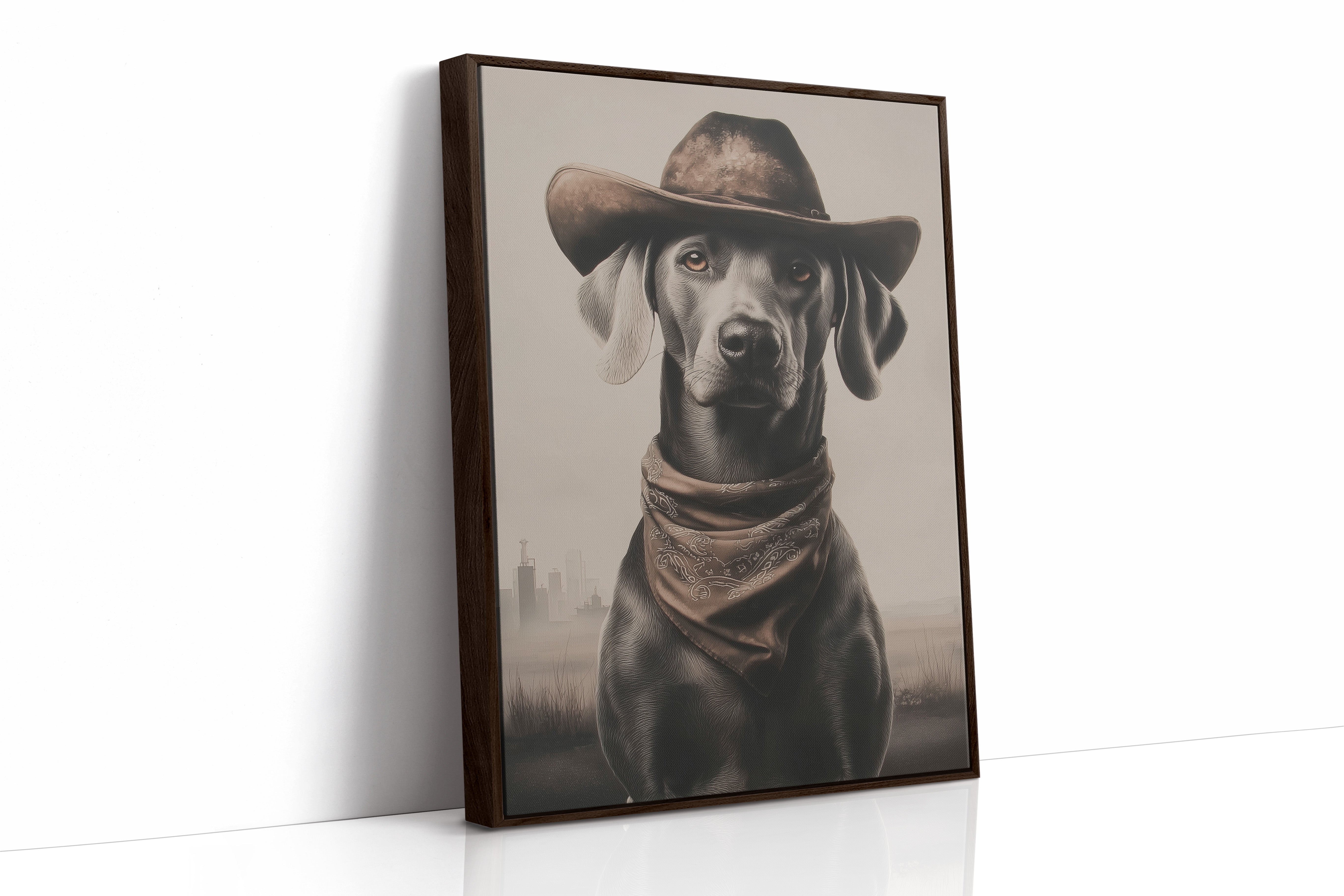 Against the misty skyline, a noble companion stands ready for adventure, wearing the unmistakable marks of an urban explorer - a weathered cowboy hat and a carefully knotted bandana. This striking portrait from our Contemporary collection merges classic Western charm with modern metropolitan edge. The dog's penetrating gaze holds stories of city streets and hidden pathways, while the sepia-toned atmosphere creates a timeless bridge between rural heritage and urban sophistication. The composition masterfully balances sharp detail with atmospheric depth, as distant skyscrapers emerge like ghostly sentinels through the fog. Perfect for adding character to a modern loft space or bringing personality to an office where traditional and contemporary styles meet. This piece invites viewers to imagine their own stories of loyalty, adventure, and the unexpected poetry of city life.