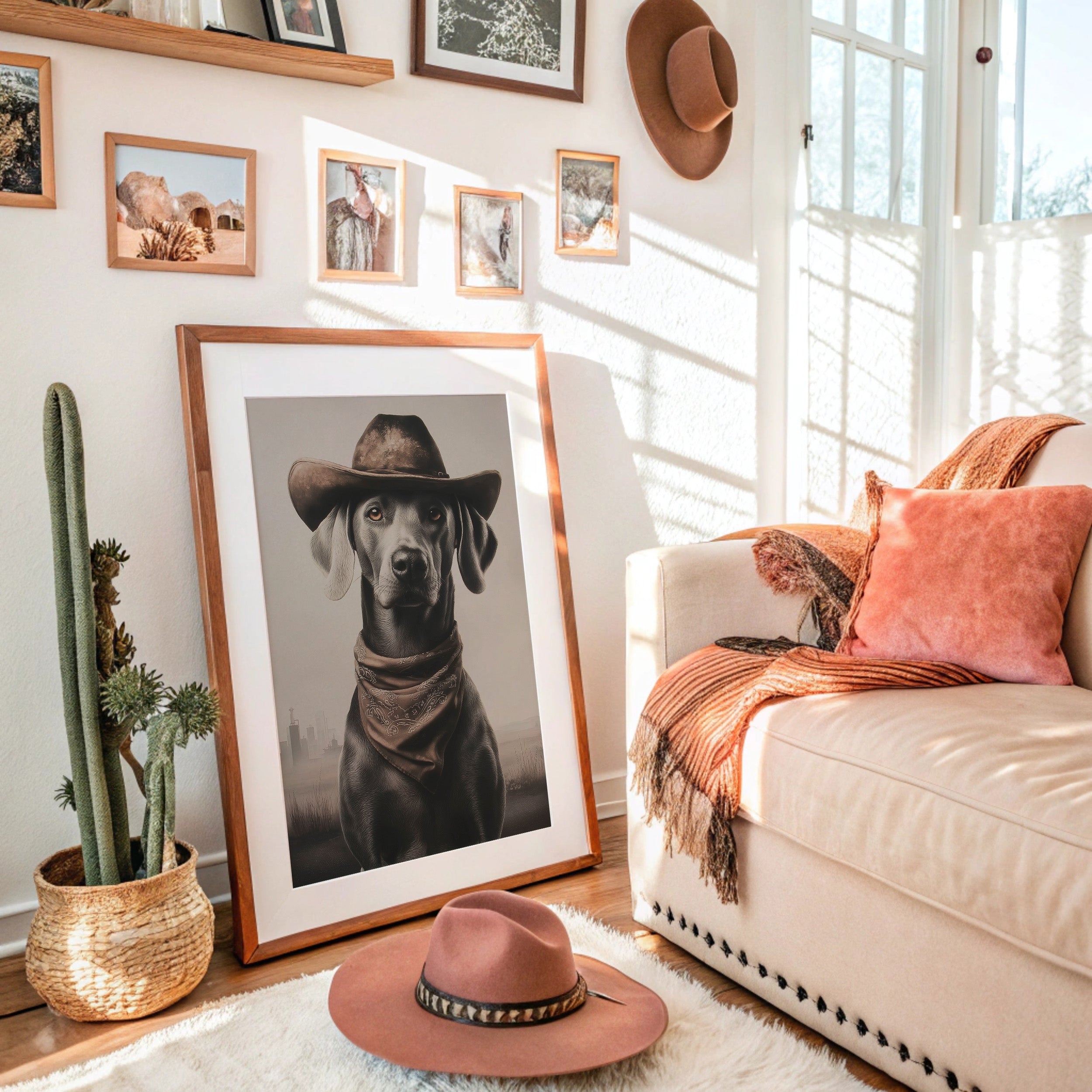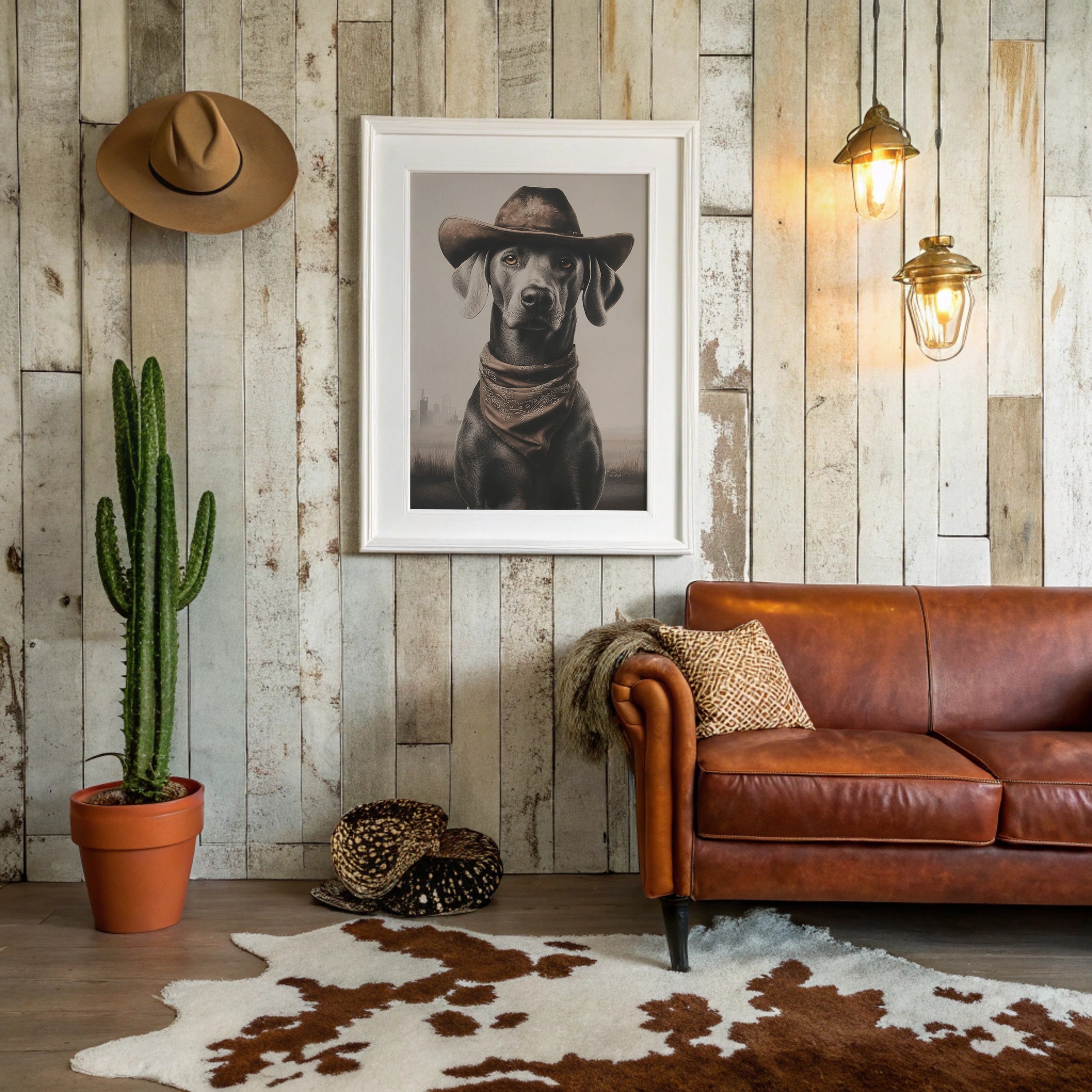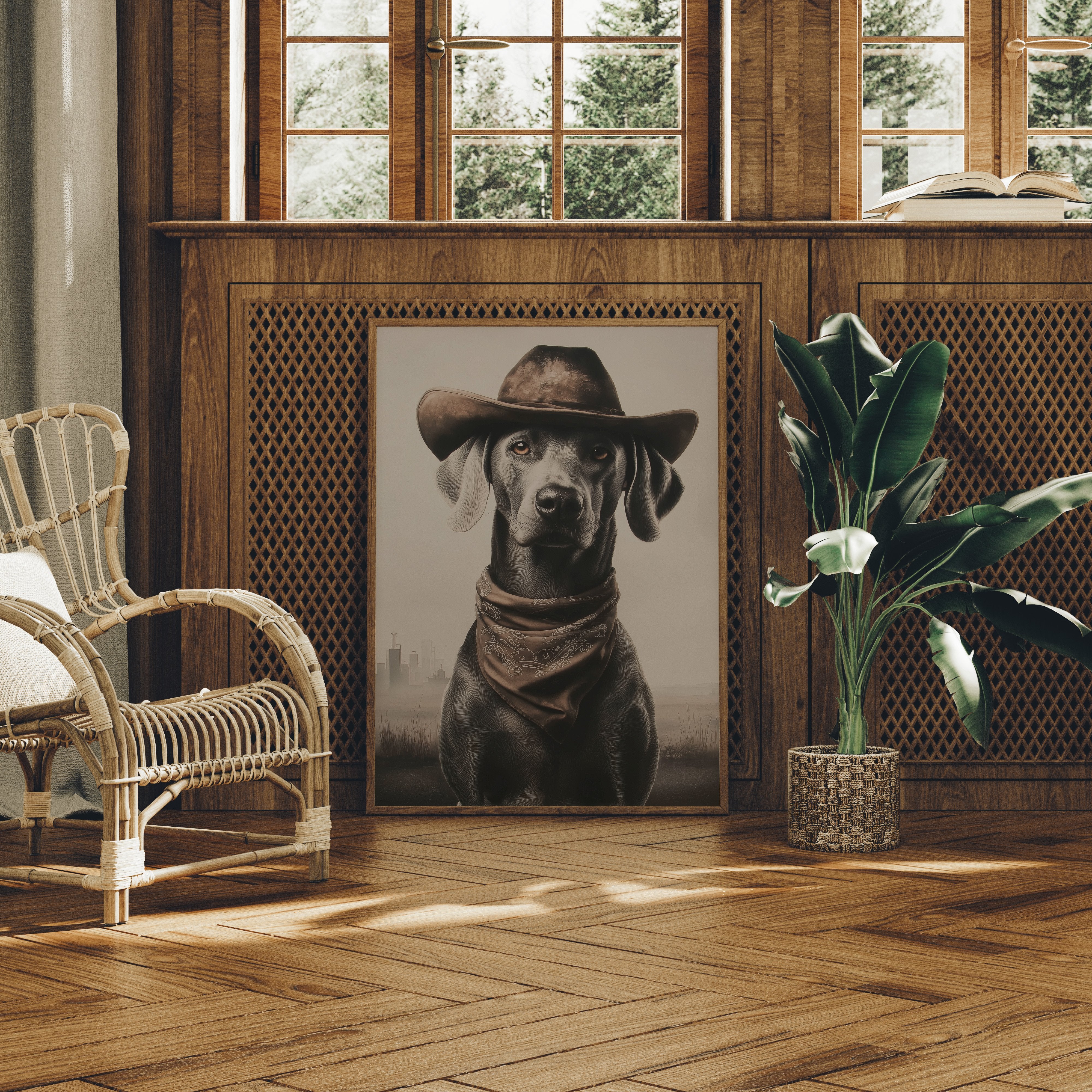 Against the misty skyline, a noble companion stands ready for adventure, wearing the unmistakable marks of an urban explorer - a weathered cowboy hat and a carefully knotted bandana. This striking portrait from our Contemporary collection merges classic Western charm with modern metropolitan edge. The dog's penetrating gaze holds stories of city streets and hidden pathways, while the sepia-toned atmosphere creates a timeless bridge between rural heritage and urban sophistication. The composition masterfully balances sharp detail with atmospheric depth, as distant skyscrapers emerge like ghostly sentinels through the fog. Perfect for adding character to a modern loft space or bringing personality to an office where traditional and contemporary styles meet. This piece invites viewers to imagine their own stories of loyalty, adventure, and the unexpected poetry of city life.