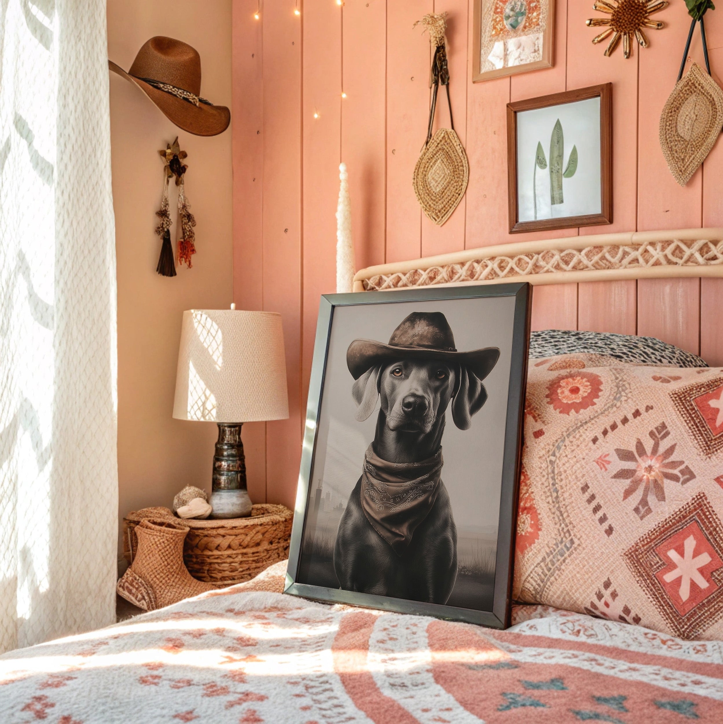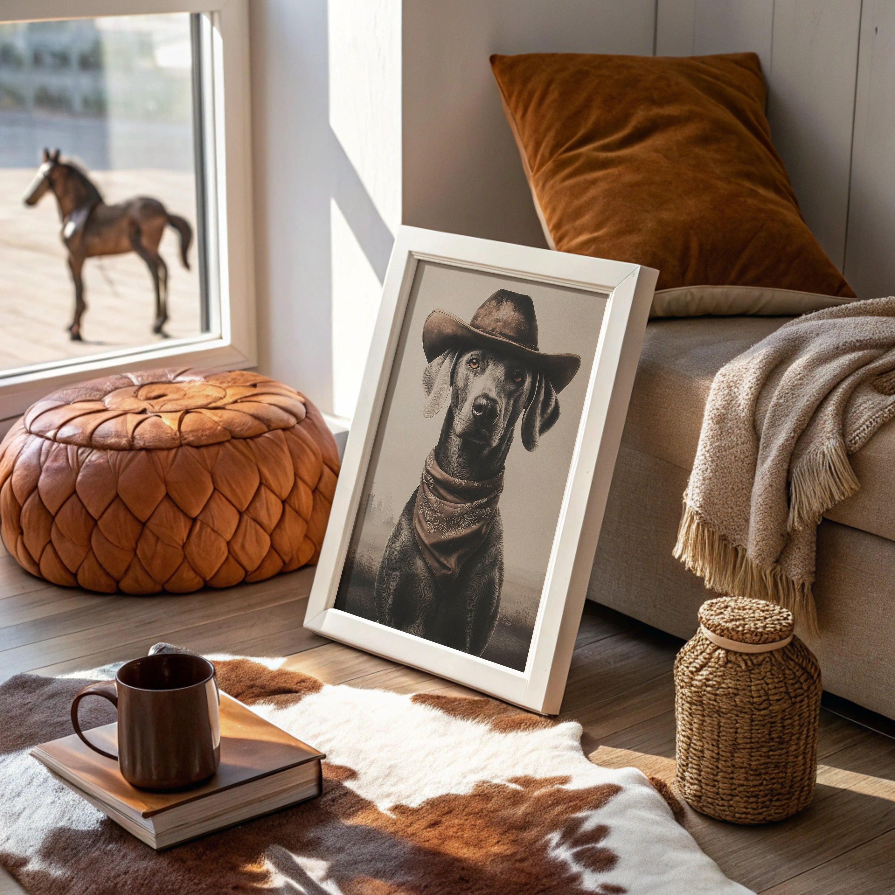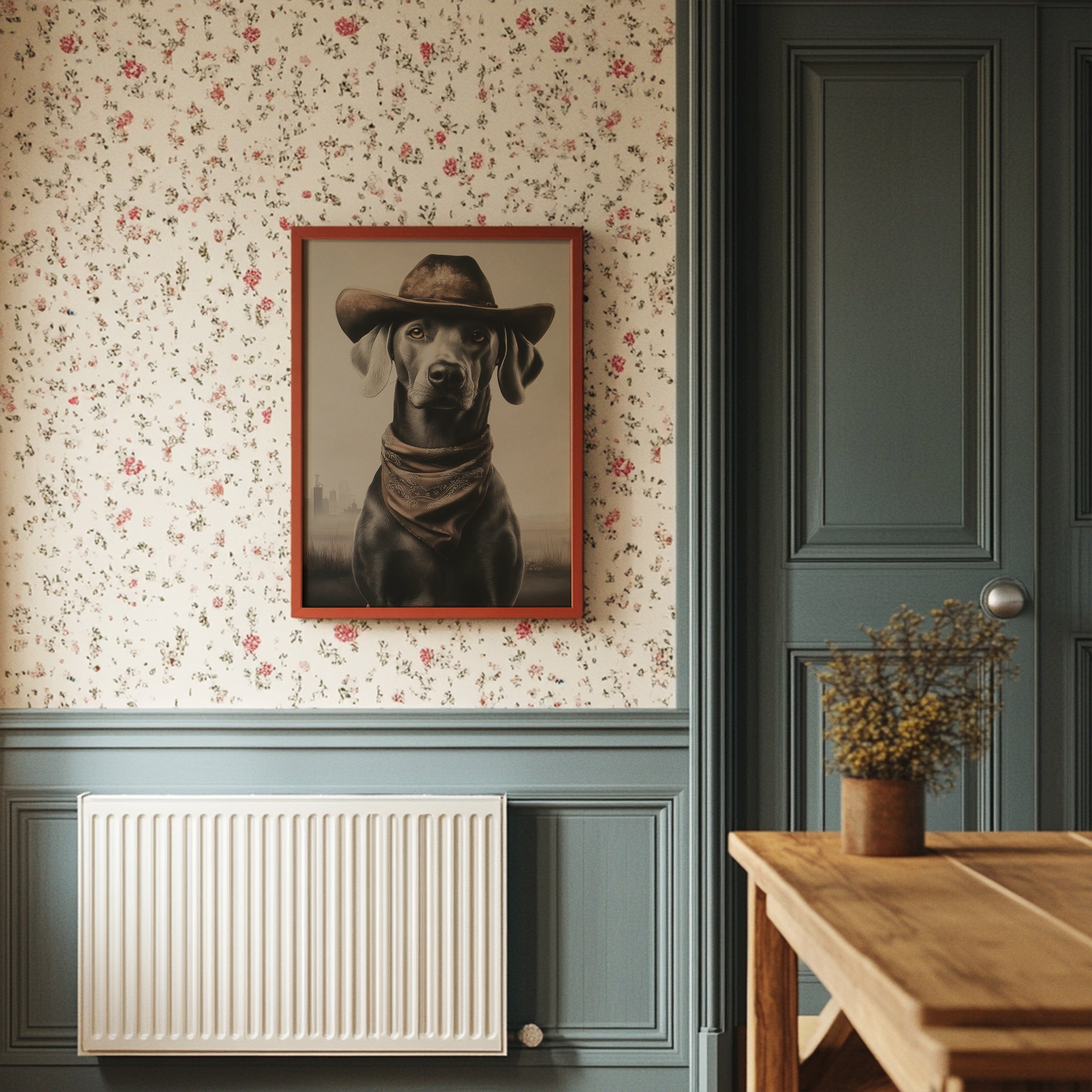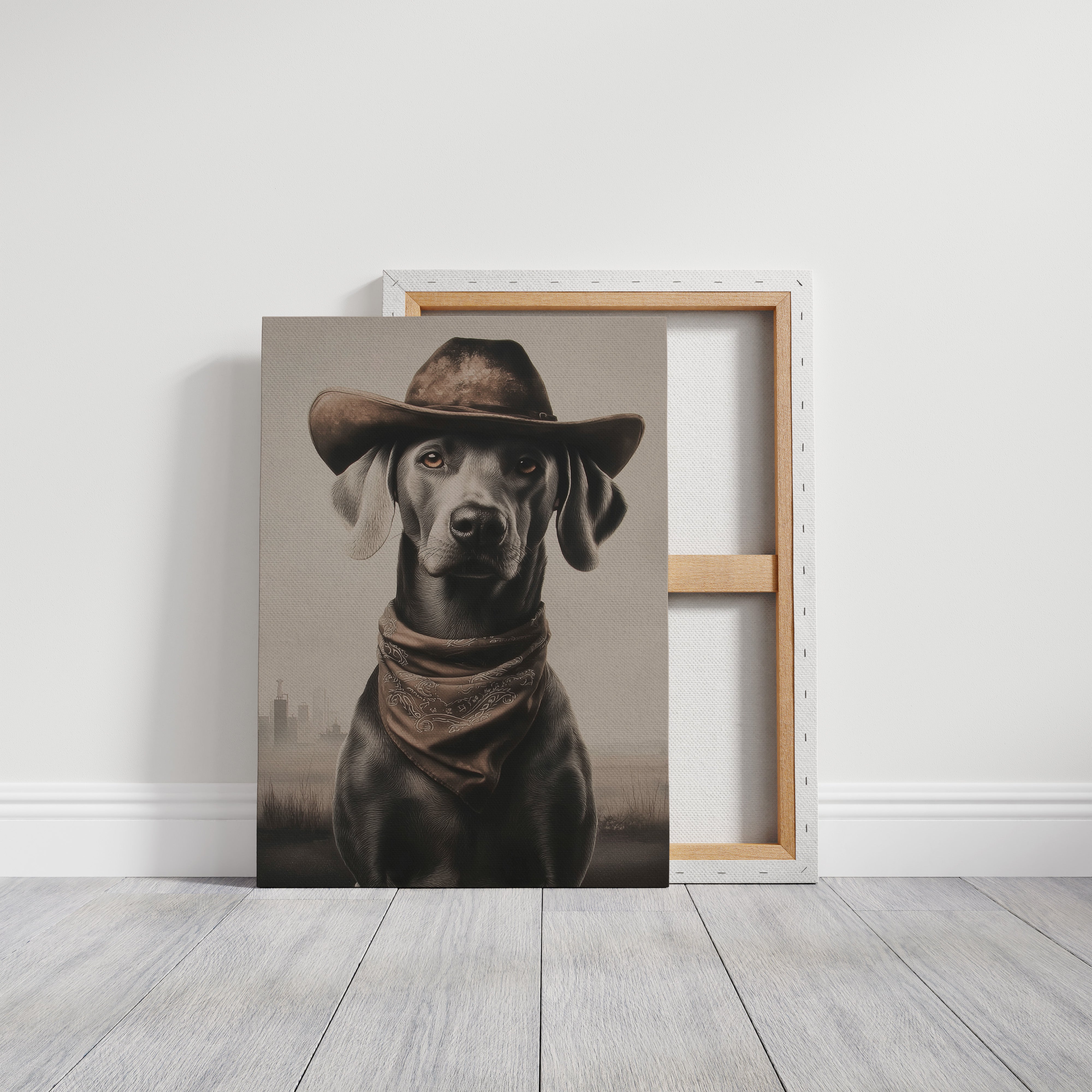 Against the misty skyline, a noble companion stands ready for adventure, wearing the unmistakable marks of an urban explorer - a weathered cowboy hat and a carefully knotted bandana. This striking portrait from our Contemporary collection merges classic Western charm with modern metropolitan edge. The dog's penetrating gaze holds stories of city streets and hidden pathways, while the sepia-toned atmosphere creates a timeless bridge between rural heritage and urban sophistication. The composition masterfully balances sharp detail with atmospheric depth, as distant skyscrapers emerge like ghostly sentinels through the fog. Perfect for adding character to a modern loft space or bringing personality to an office where traditional and contemporary styles meet. This piece invites viewers to imagine their own stories of loyalty, adventure, and the unexpected poetry of city life.