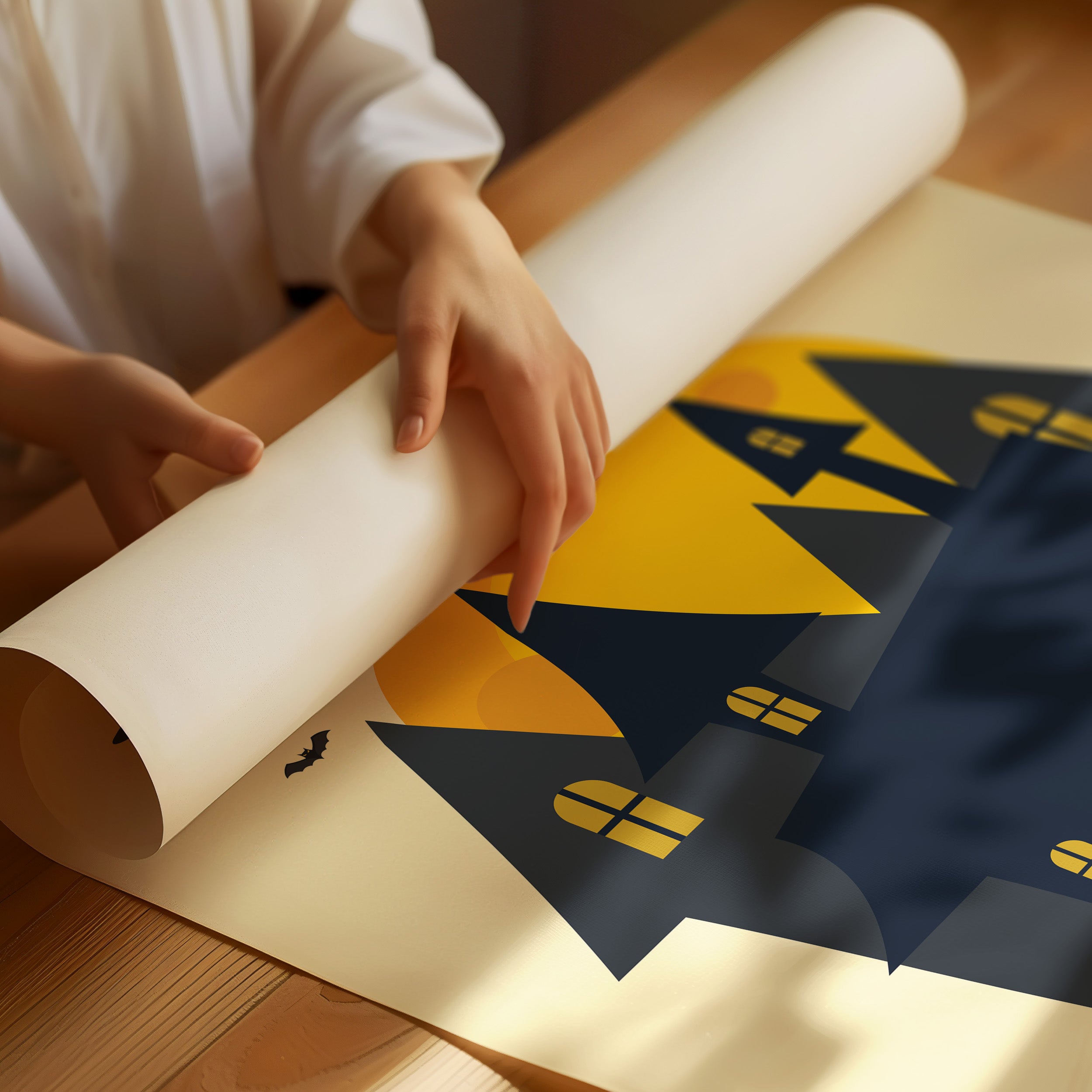 Against a harvest moon, silhouettes of pointed roofs pierce the night sky while tiny bats dance in twilight air. This piece captures the playful spirit of vintage Halloween illustrations with a contemporary minimalist twist. Dark navy shadows create a mysterious mansion outlined against a glowing amber moon, while warm yellow windows hint at cozy secrets within. The composition balances whimsical holiday charm with sophisticated geometric shapes and a limited color palette that speaks to modern design sensibilities. Perfect for adding a touch of seasonal magic to a home office, reading nook, or anywhere you want to inspire imagination year-round. The timeless appeal of this piece makes it a delightful conversation starter that brings out the child in everyone who views it.
