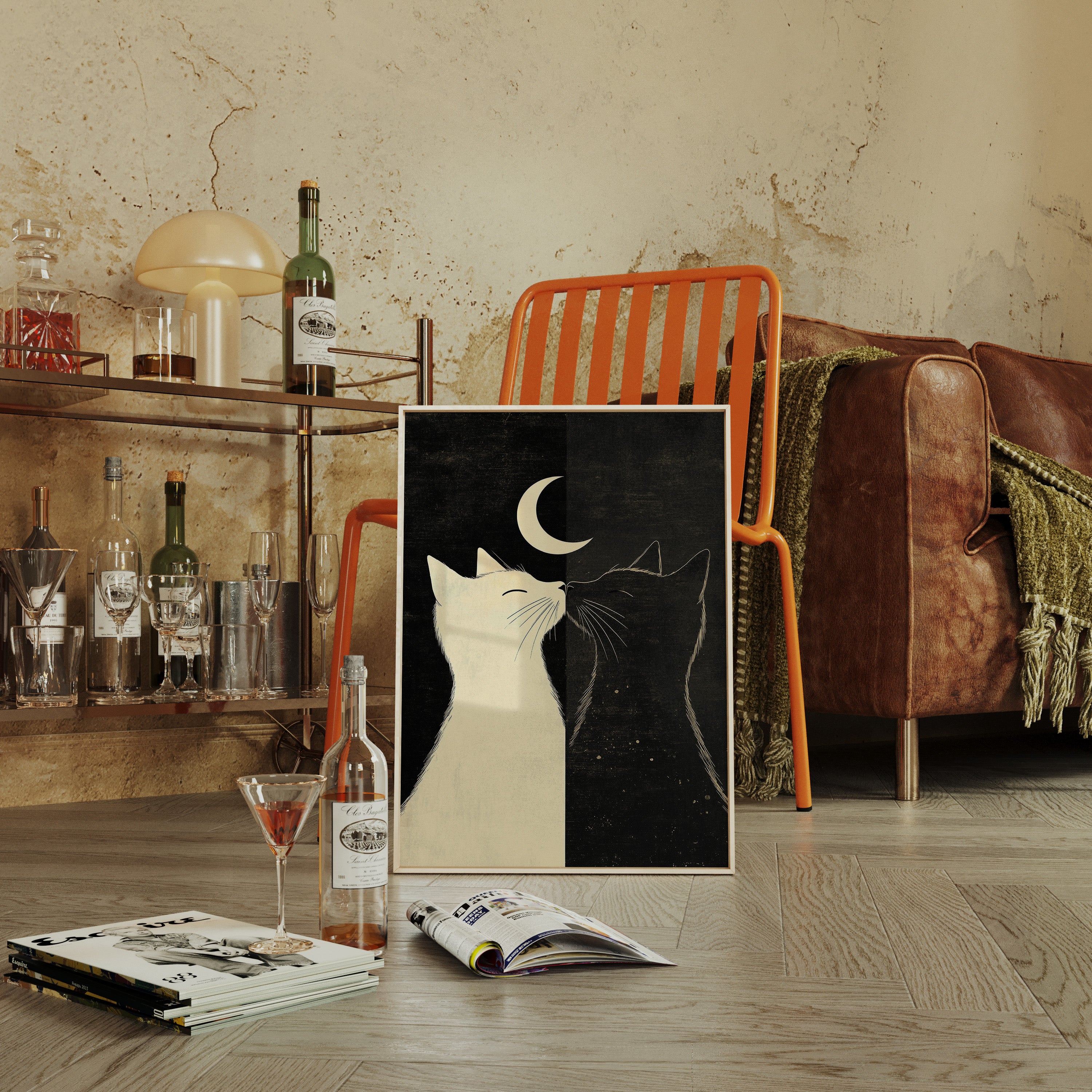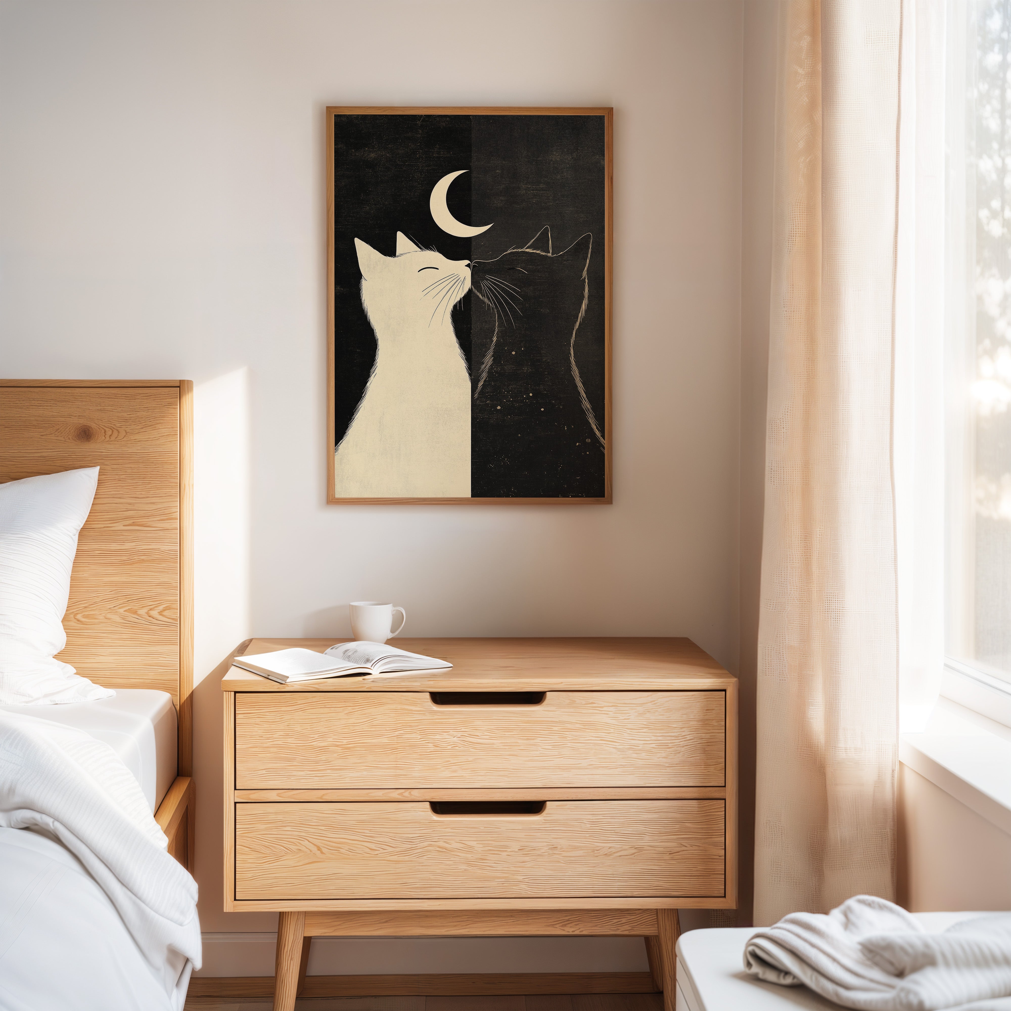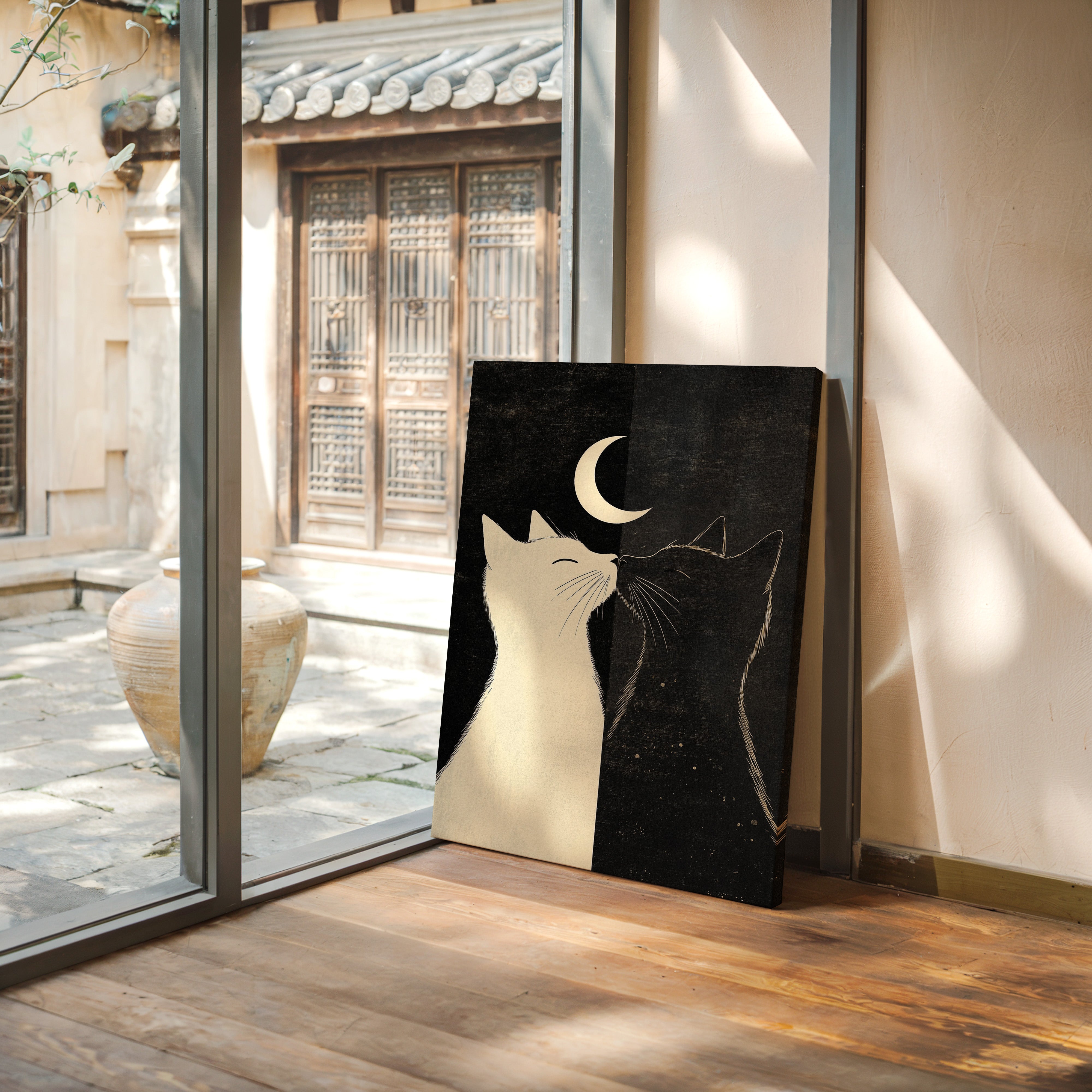In the stillness of night, two feline silhouettes mirror each other in perfect duality, their profiles etched against contrasting backgrounds of light and shadow. A delicate crescent moon hangs above, casting its gentle luminescence across the scene. The minimalist composition captures the essence of feline grace - one cat rendered in pure white, the other a mysterious dark shadow, their whiskers reaching toward each other in a moment of quiet connection. Perfect for modern spaces seeking balance and serenity, this piece brings sophisticated charm to minimalist interiors and contemporary rooms.