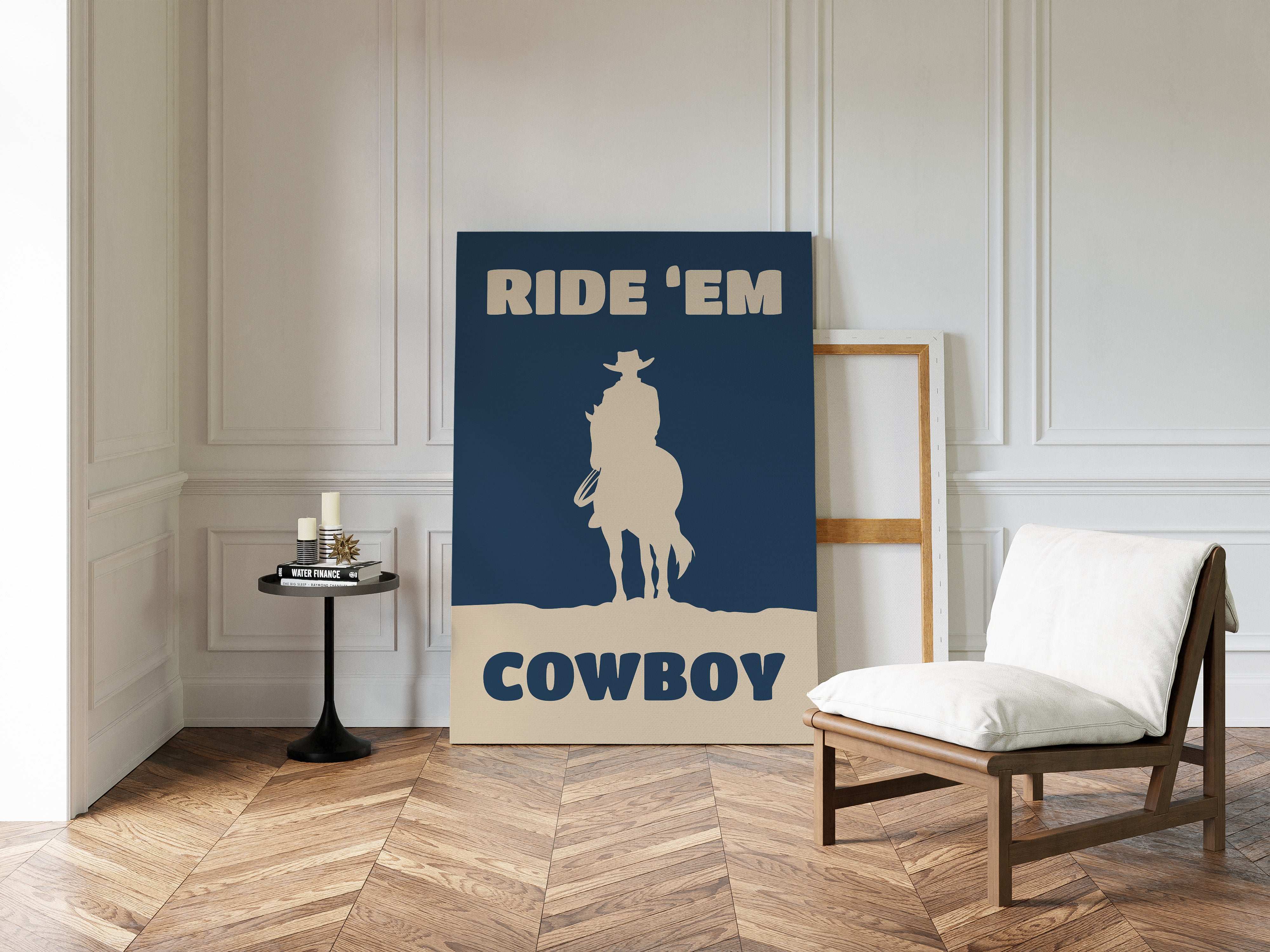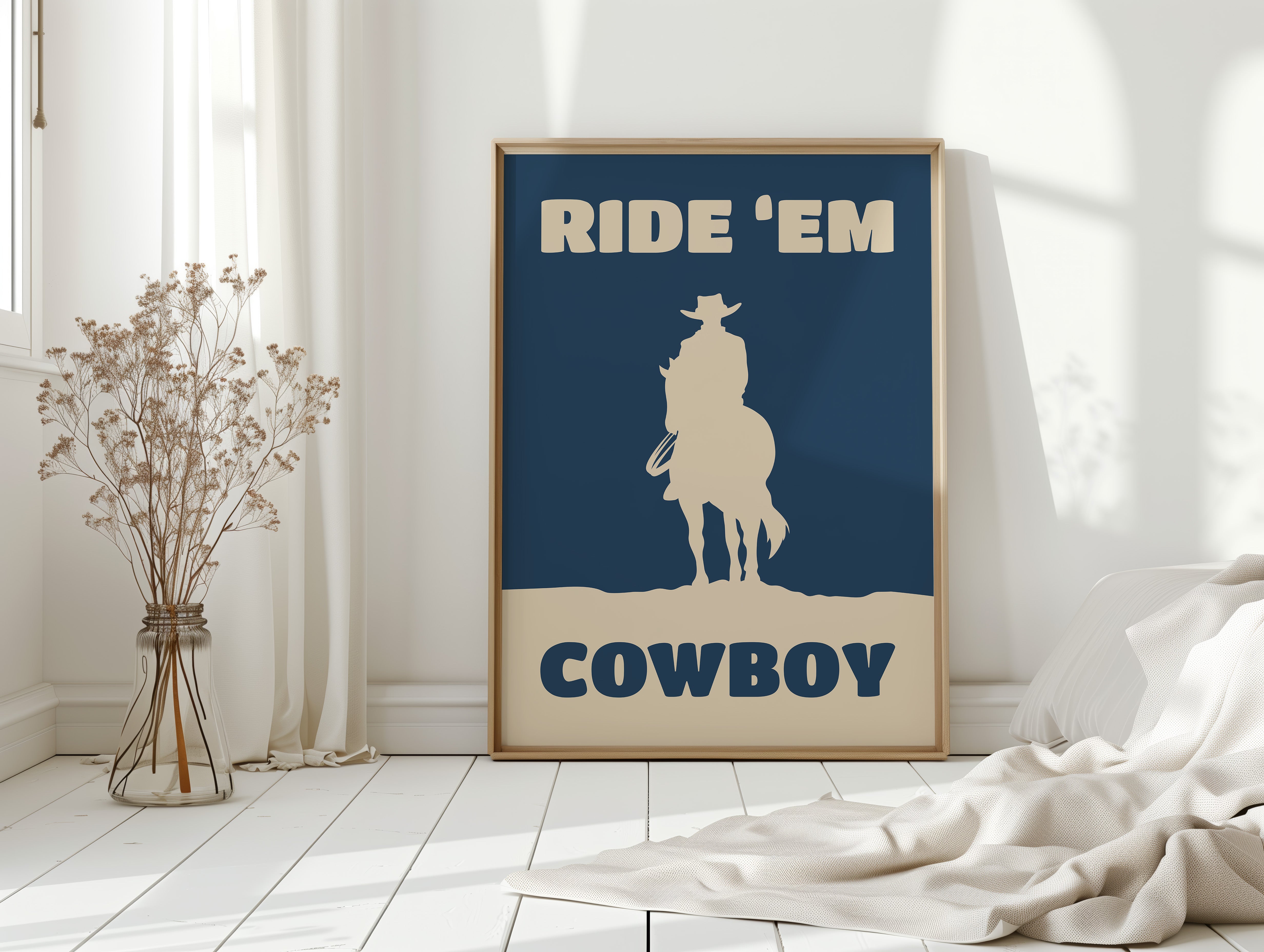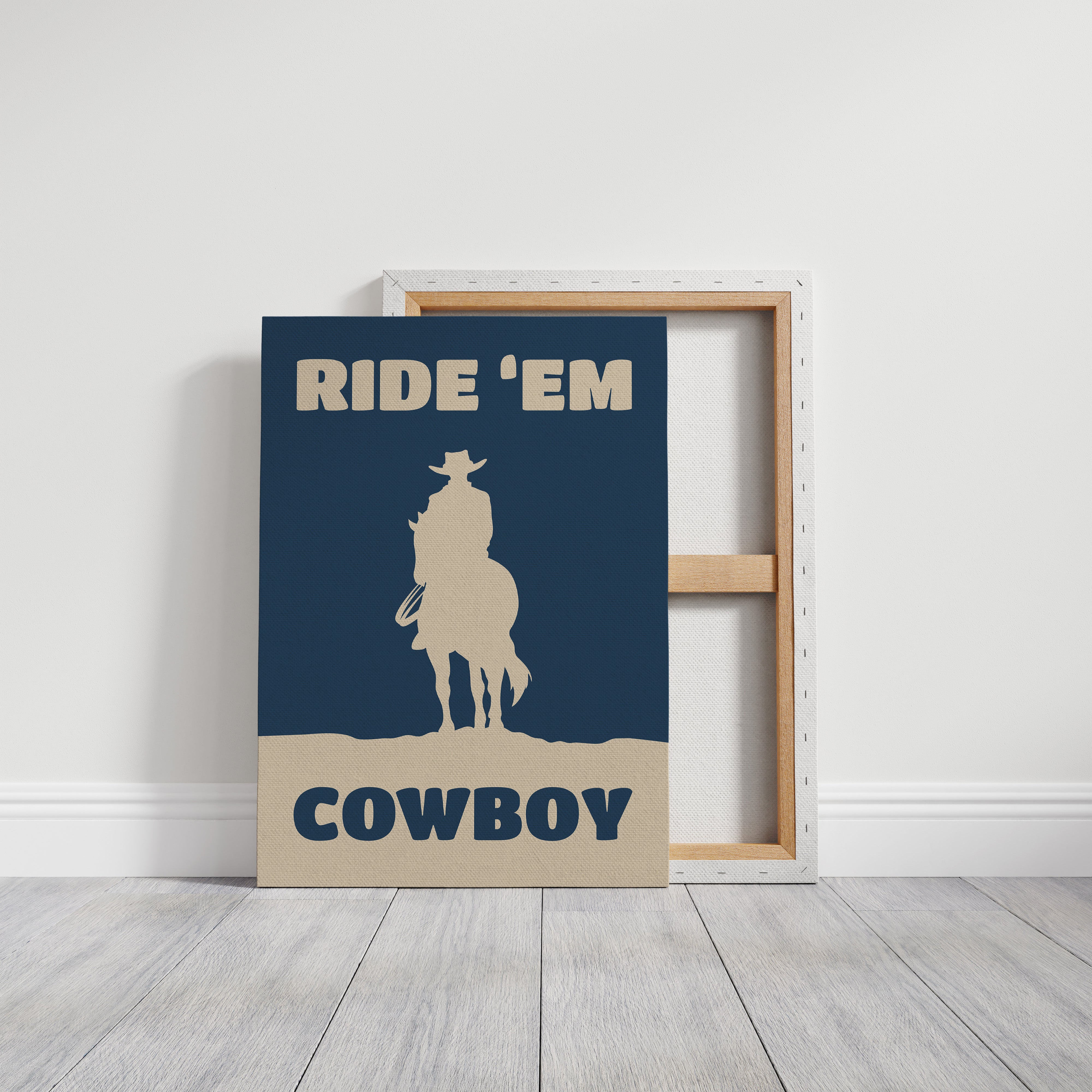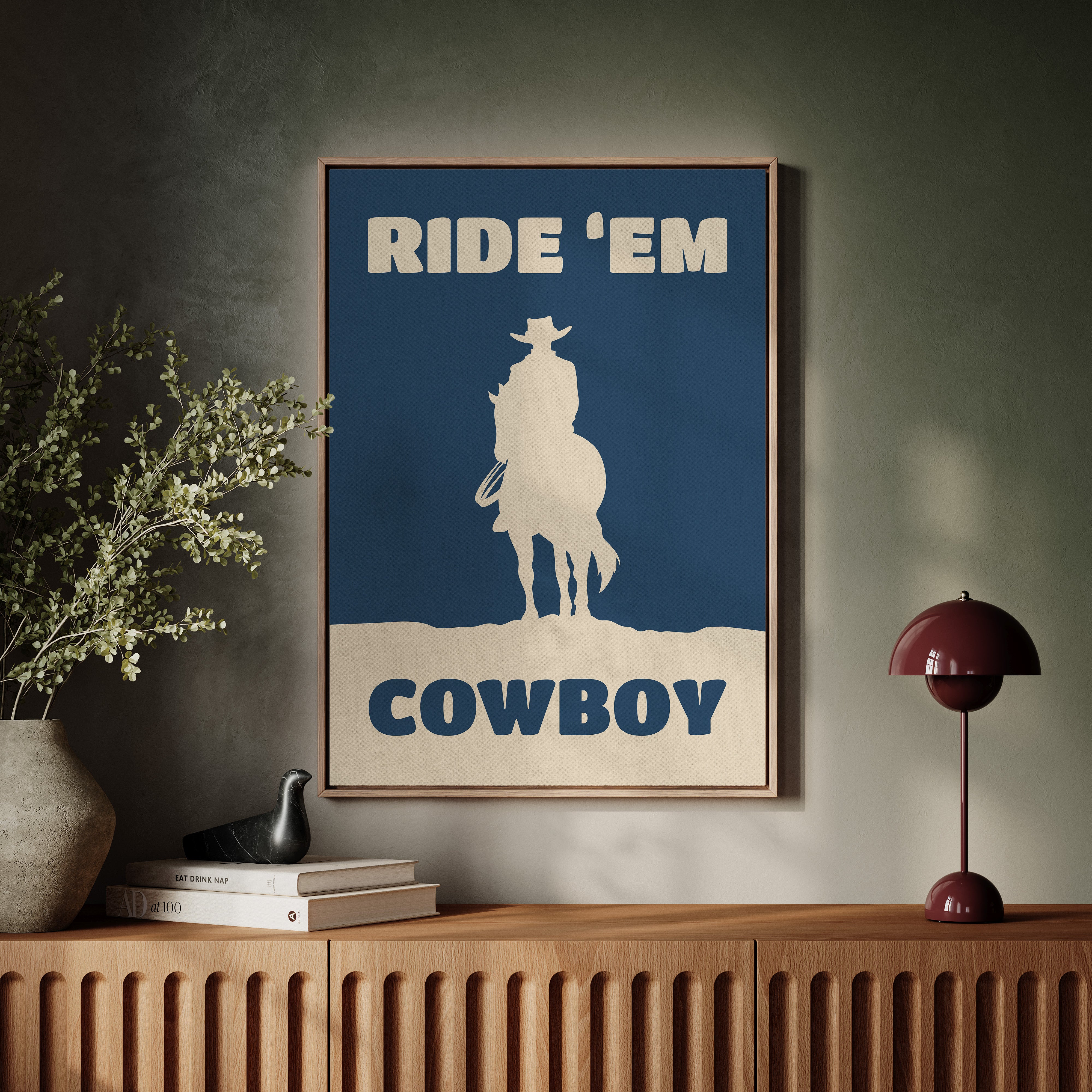 A lone silhouette stands proud against the deepening dusk, where tradition meets modern simplicity. Part of our Contemporary Western collection, this piece captures the timeless spirit of the American frontier through minimalist design. The stark contrast between the cream figure and navy background creates a powerful statement of strength and solitude, while the bold typography adds a modern edge to classic western imagery. The composition speaks to both heritage and innovation, making it a compelling focal point for any space. Perfect for adding character to a home office or bringing rugged elegance to a living room, this piece bridges the gap between classic western decor and contemporary aesthetic sensibilities.