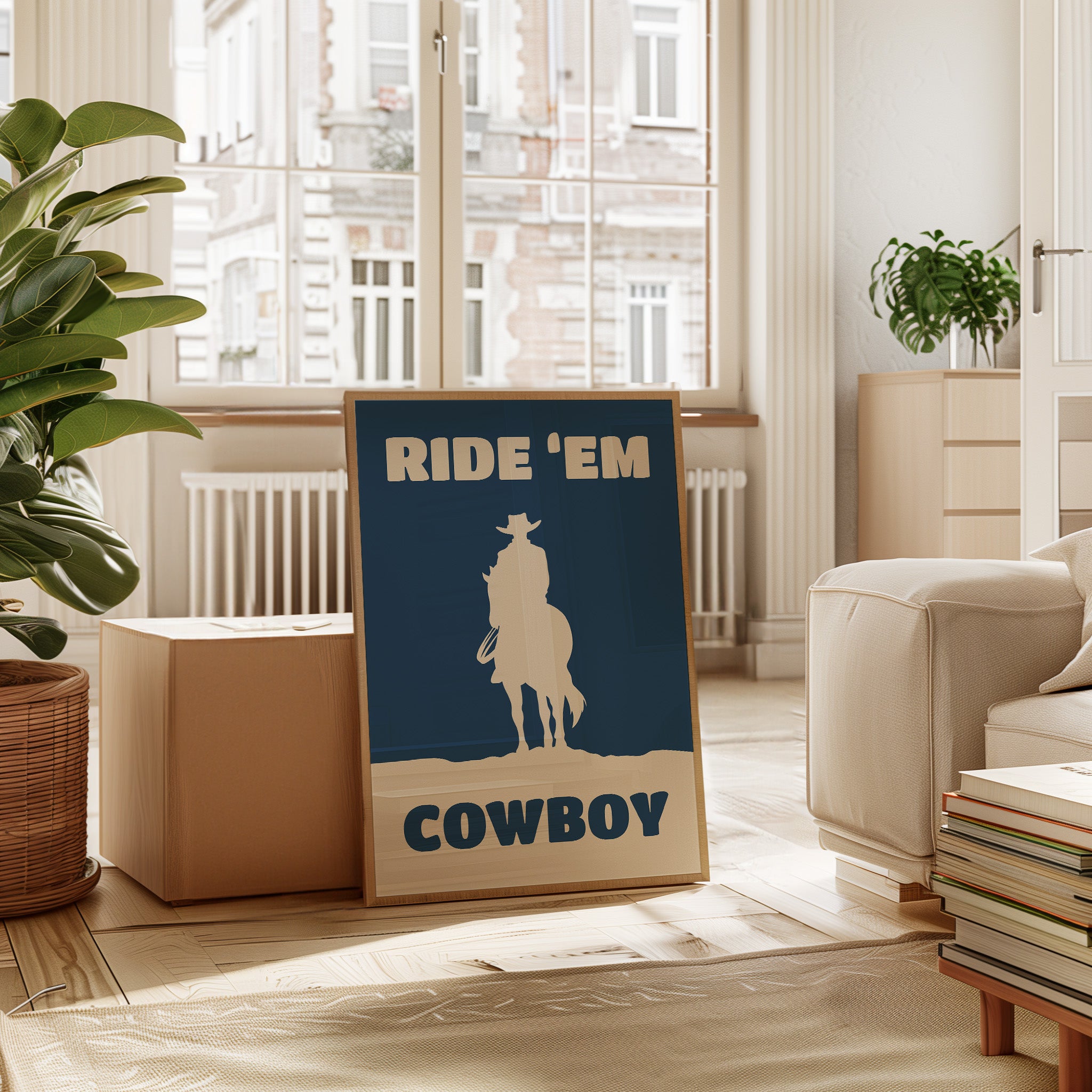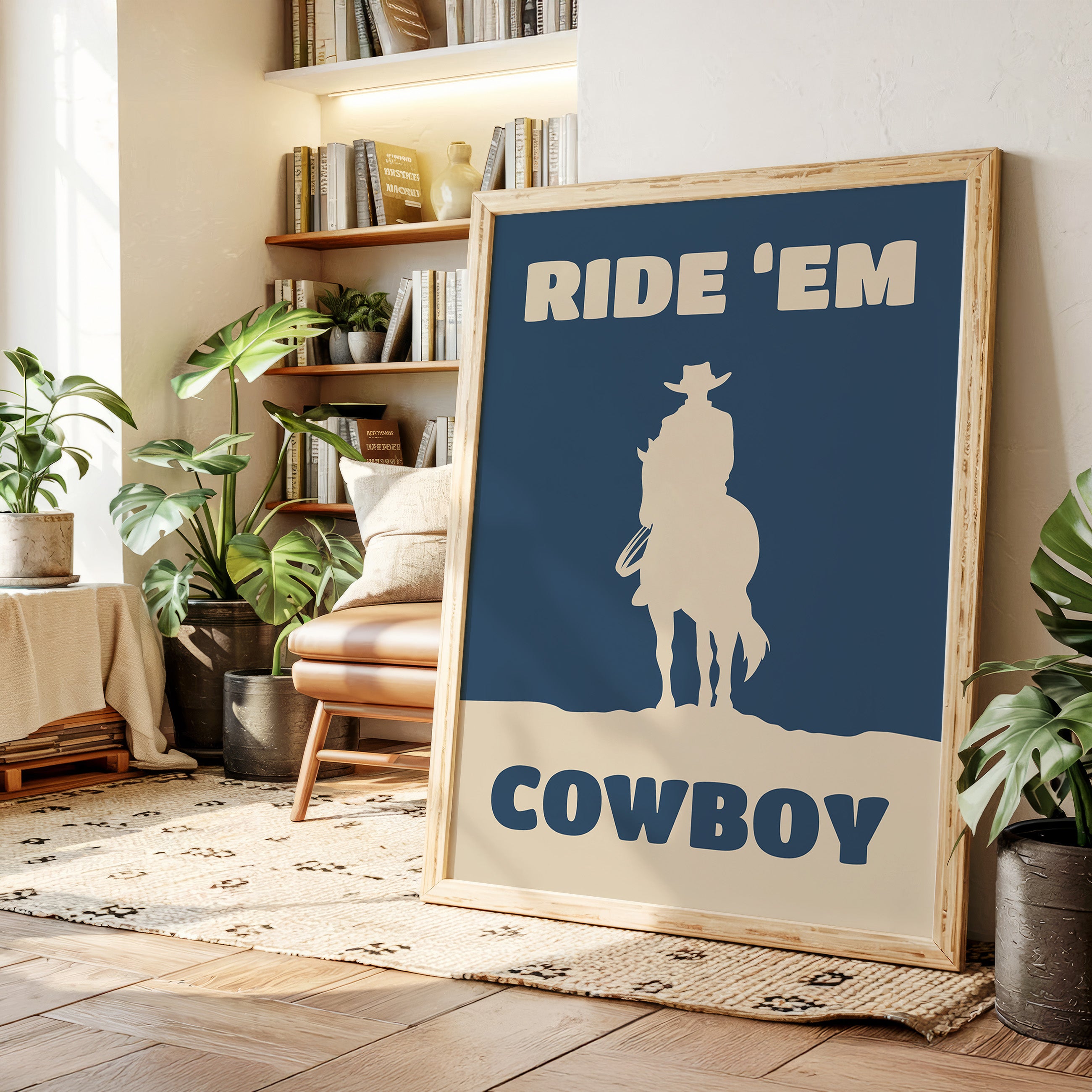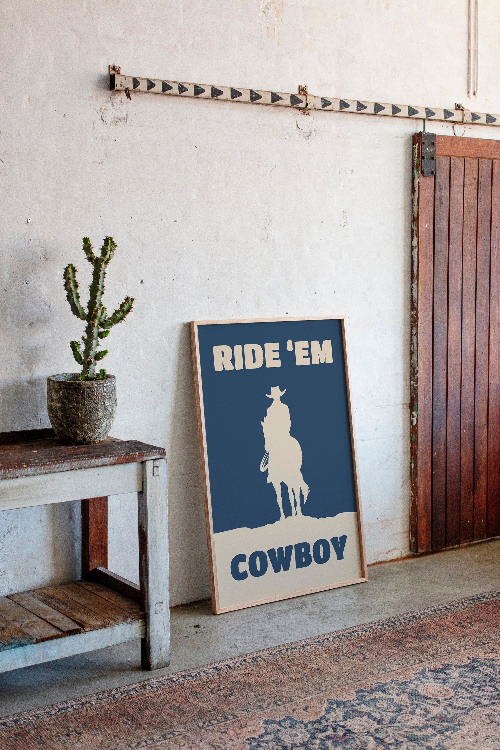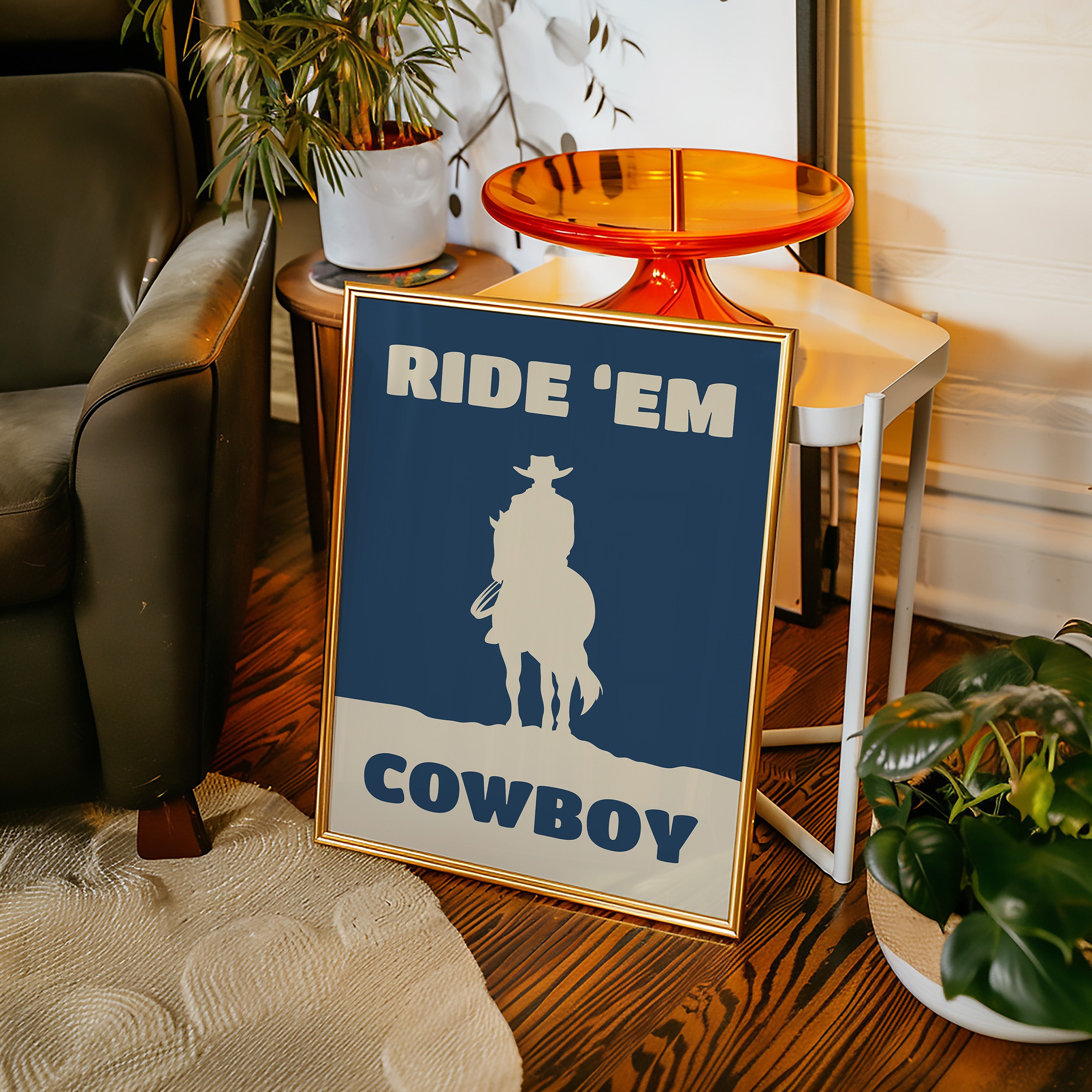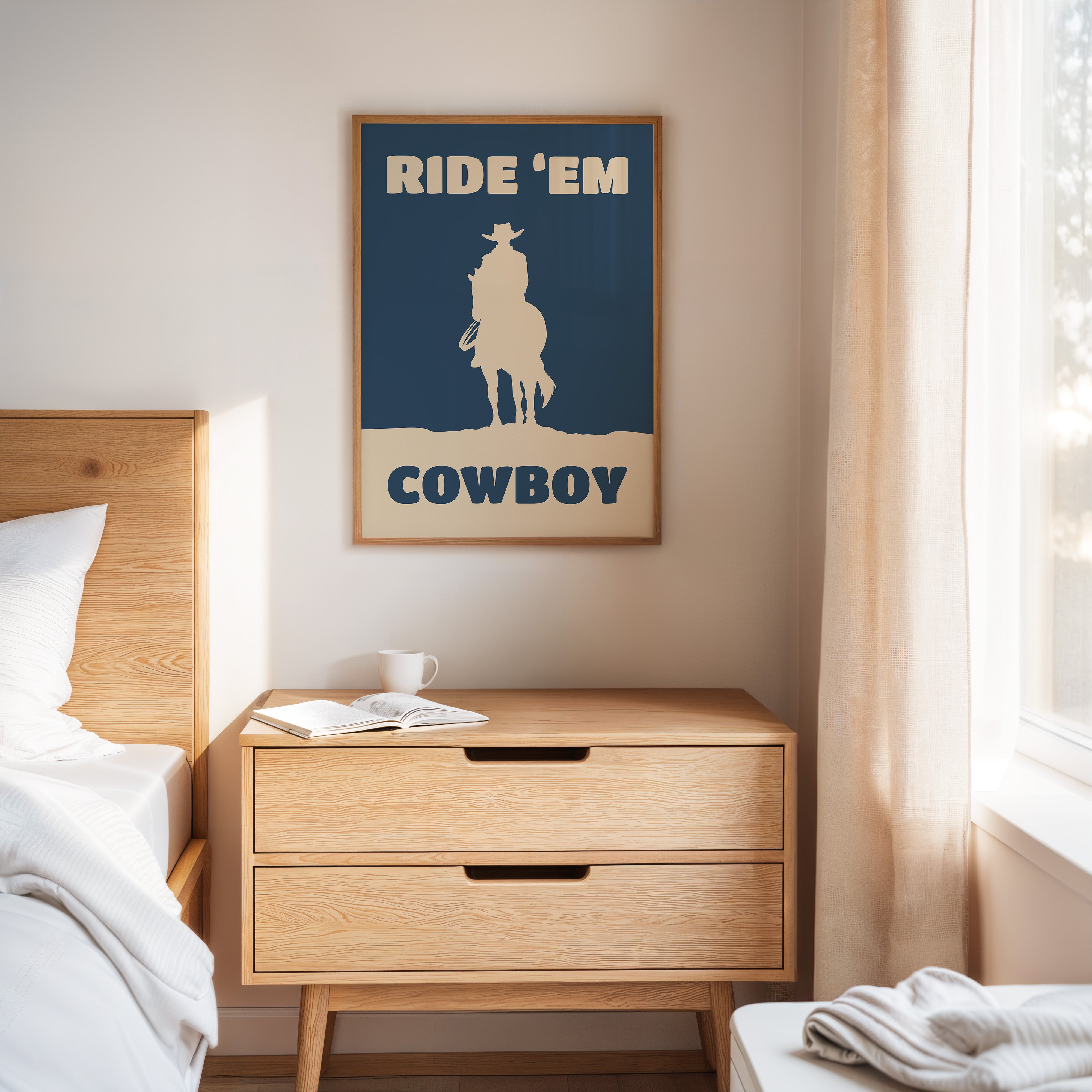 A lone silhouette stands proud against the deepening dusk, where tradition meets modern simplicity. Part of our Contemporary Western collection, this piece captures the timeless spirit of the American frontier through minimalist design. The stark contrast between the cream figure and navy background creates a powerful statement of strength and solitude, while the bold typography adds a modern edge to classic western imagery. The composition speaks to both heritage and innovation, making it a compelling focal point for any space. Perfect for adding character to a home office or bringing rugged elegance to a living room, this piece bridges the gap between classic western decor and contemporary aesthetic sensibilities.