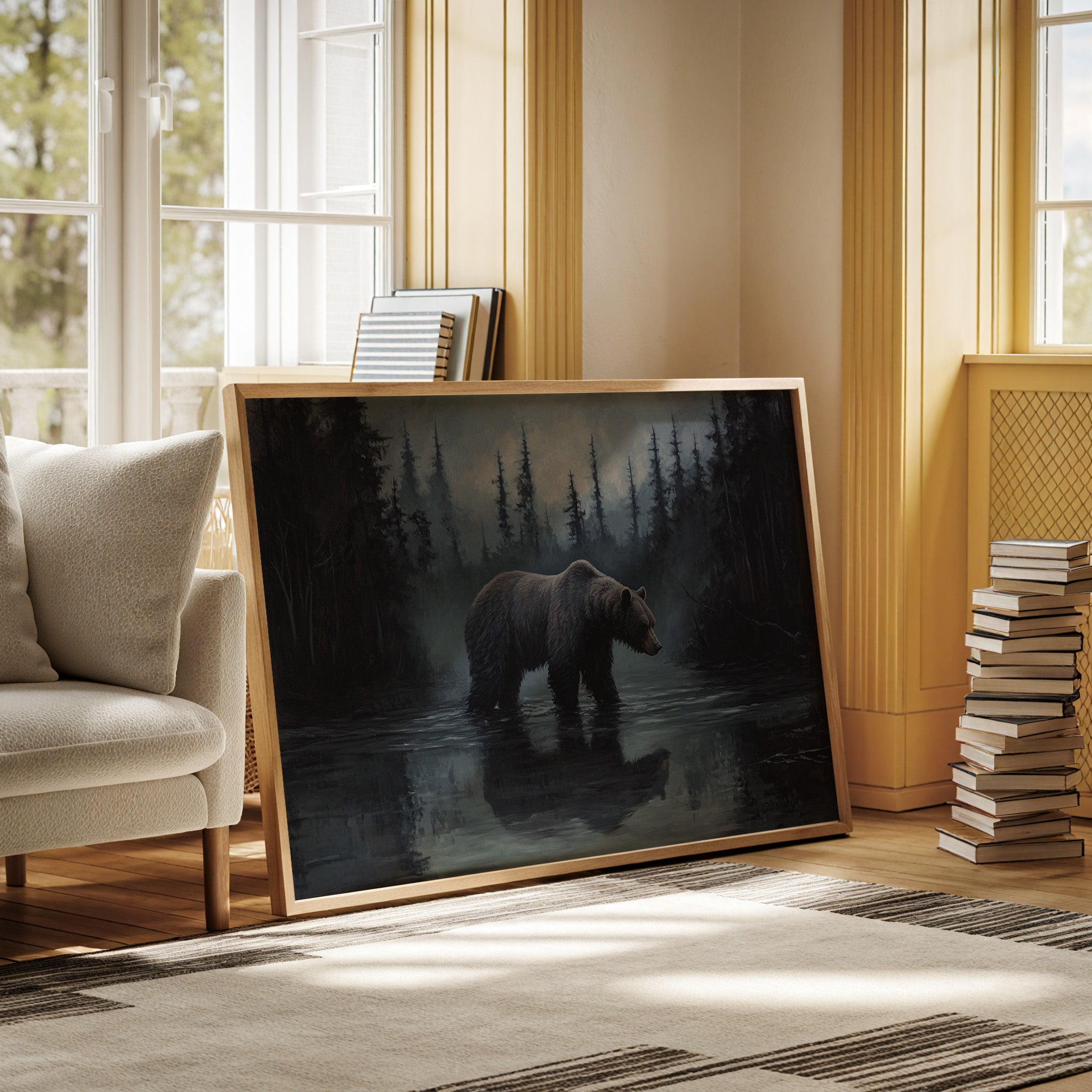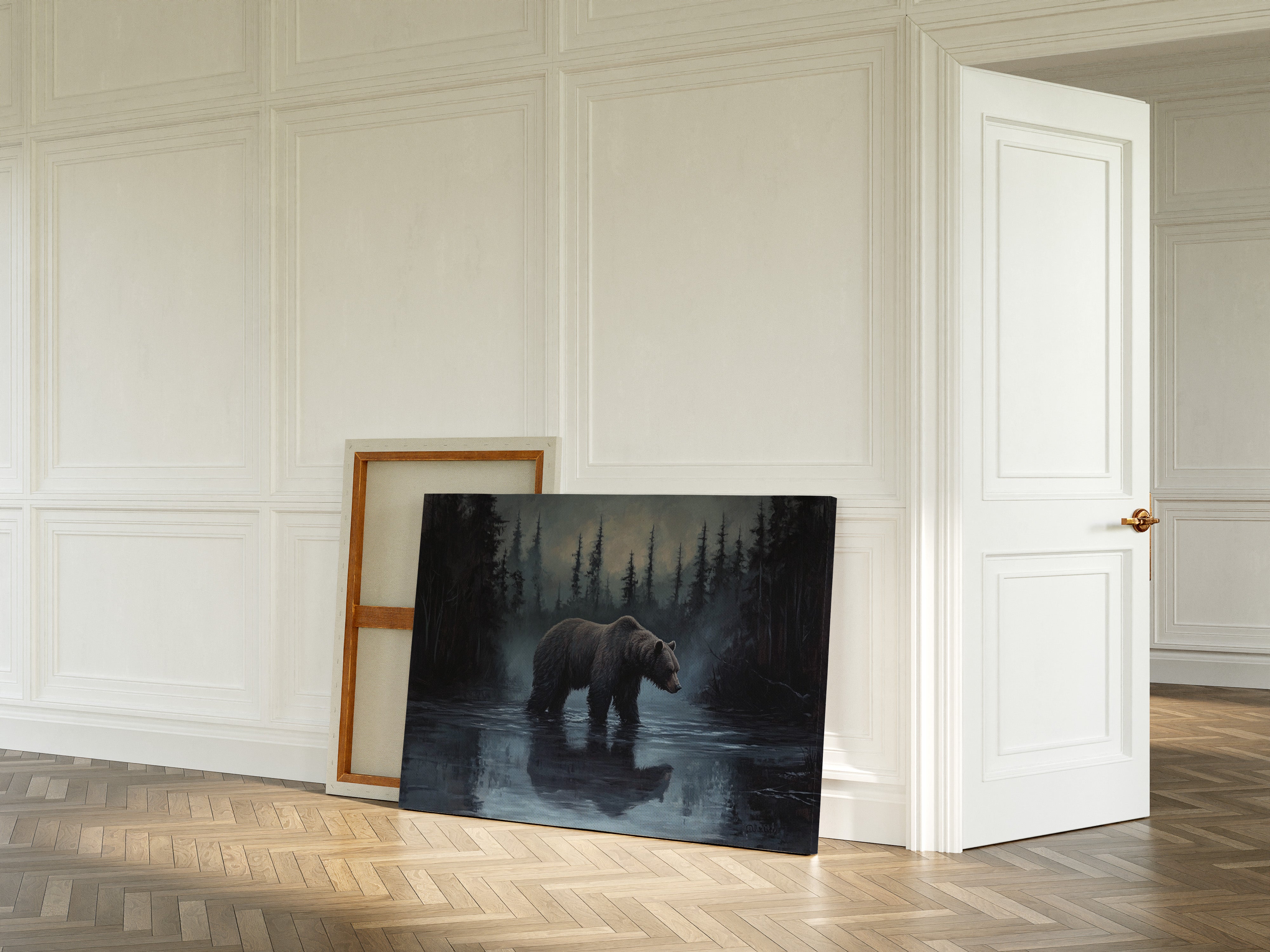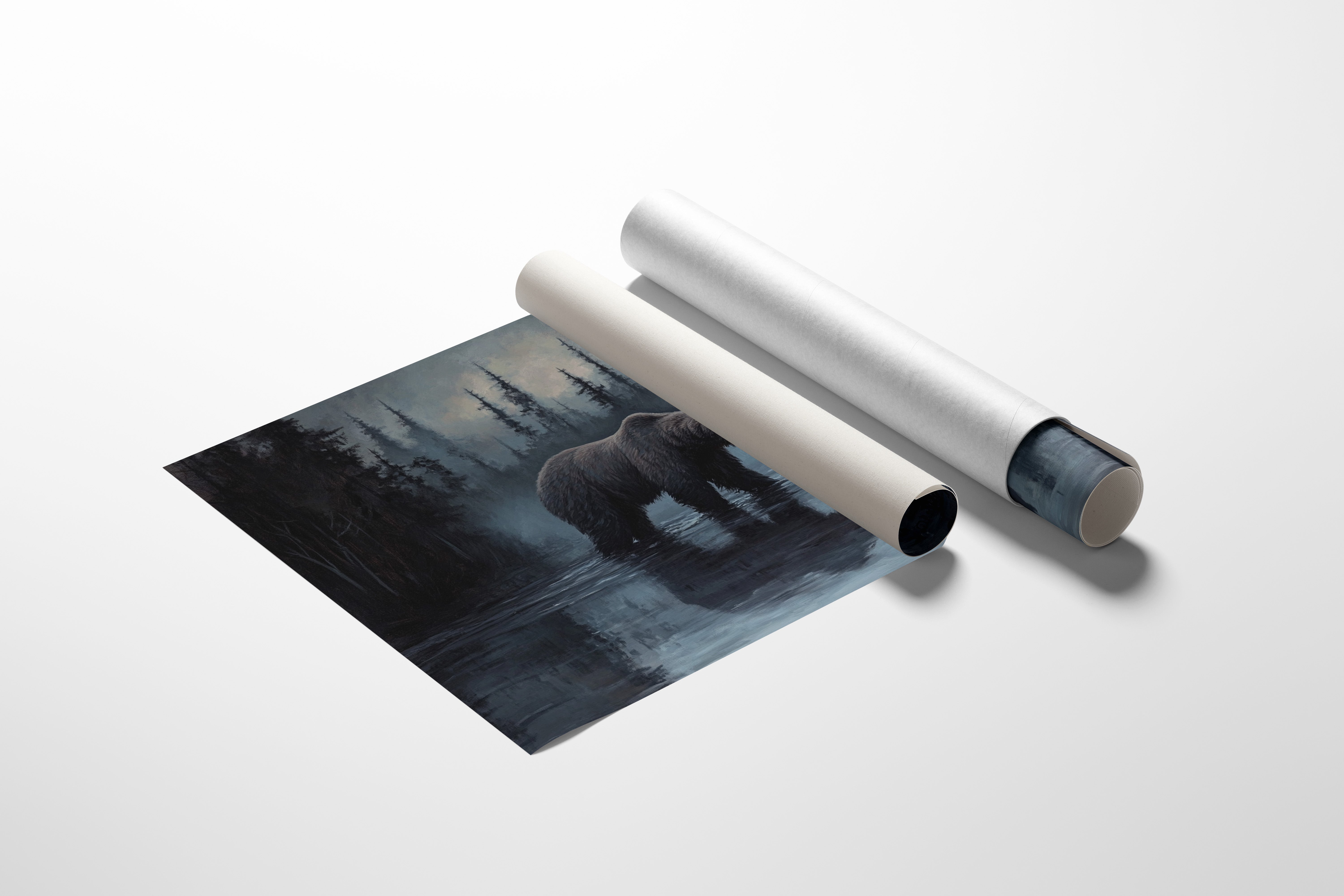 A powerful grizzly wades through misty waters, its reflection rippling across the surface like a ghost of wilderness past. The scene captures a moment of pure wildness, where ancient pines stand sentinel against a moody twilight sky. Deep blues and grays blend together in an ethereal dance, while the bear's massive form commands attention with its quiet strength and natural dignity. This piece speaks to the raw beauty of untamed places, where creatures of legend still roam free.