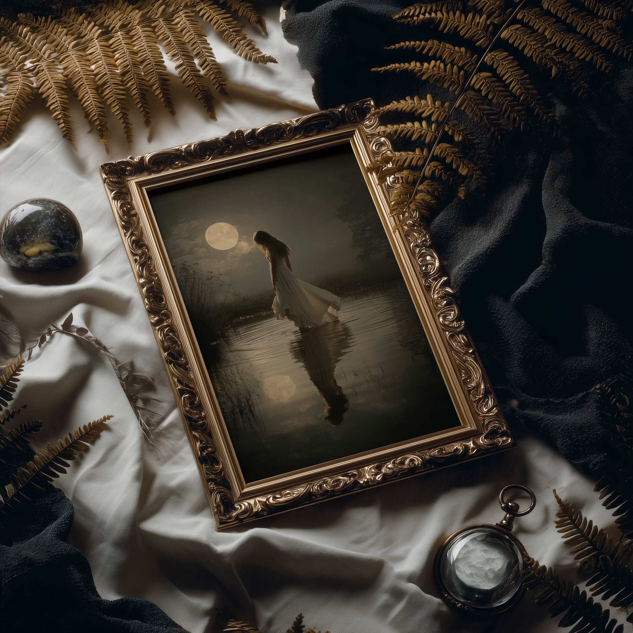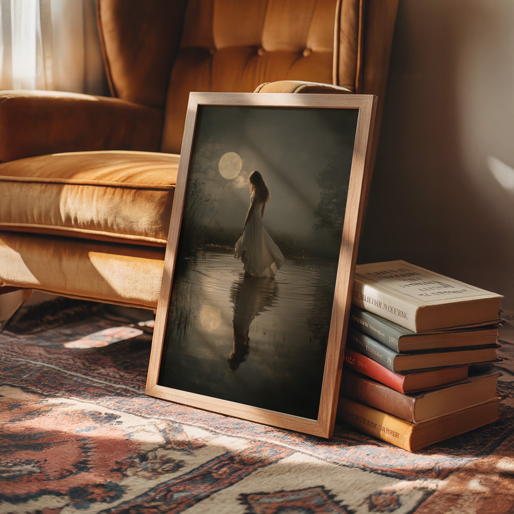 A solitary figure wades through still waters, her white dress floating like mist around her legs. The full moon hangs heavy in the twilight sky, casting a luminous path across the water's surface that mirrors both the celestial body and the wanderer below. The ethereal scene captures that liminal space between reality and dreams, where silhouettes blur and time seems suspended in the gentle ripples surrounding her.