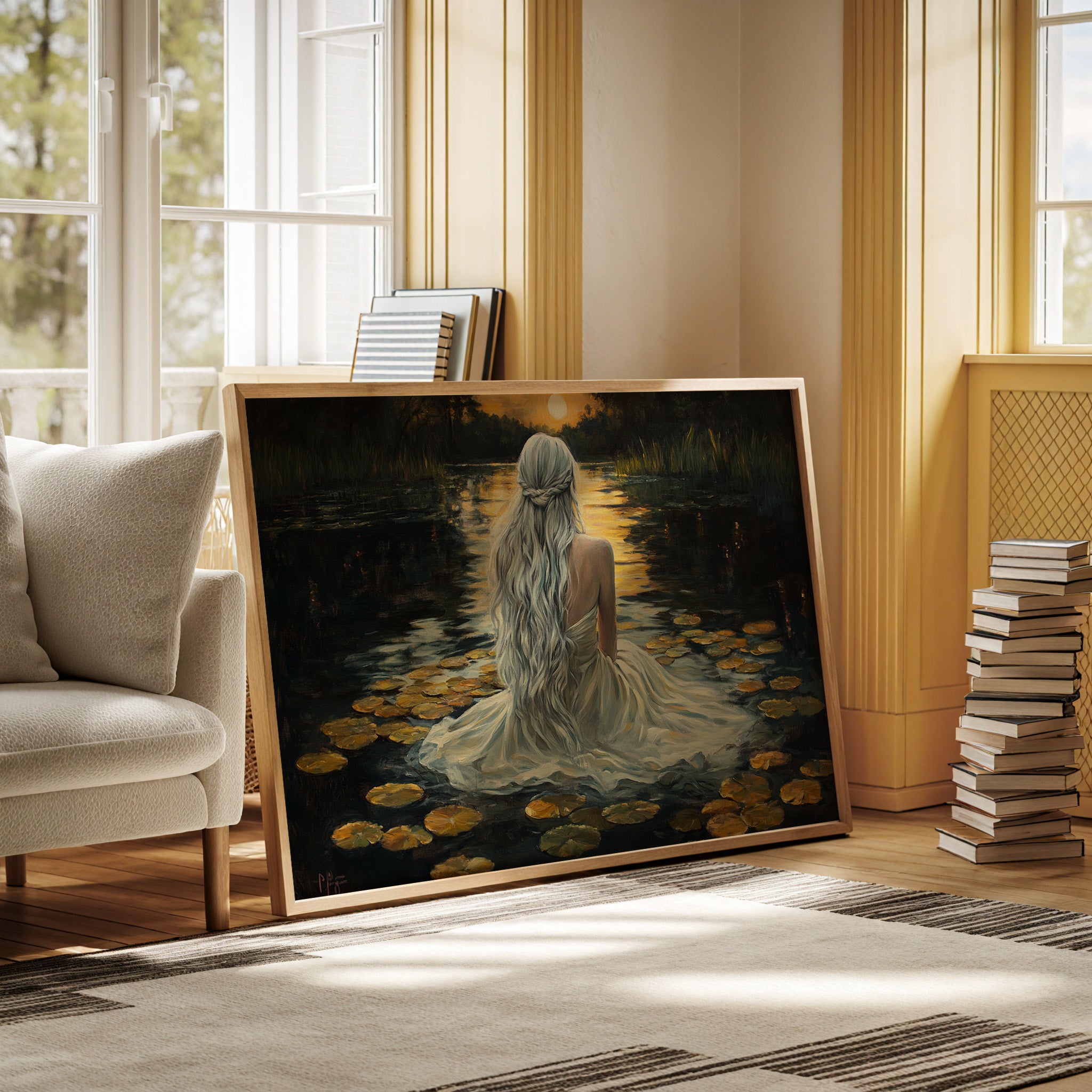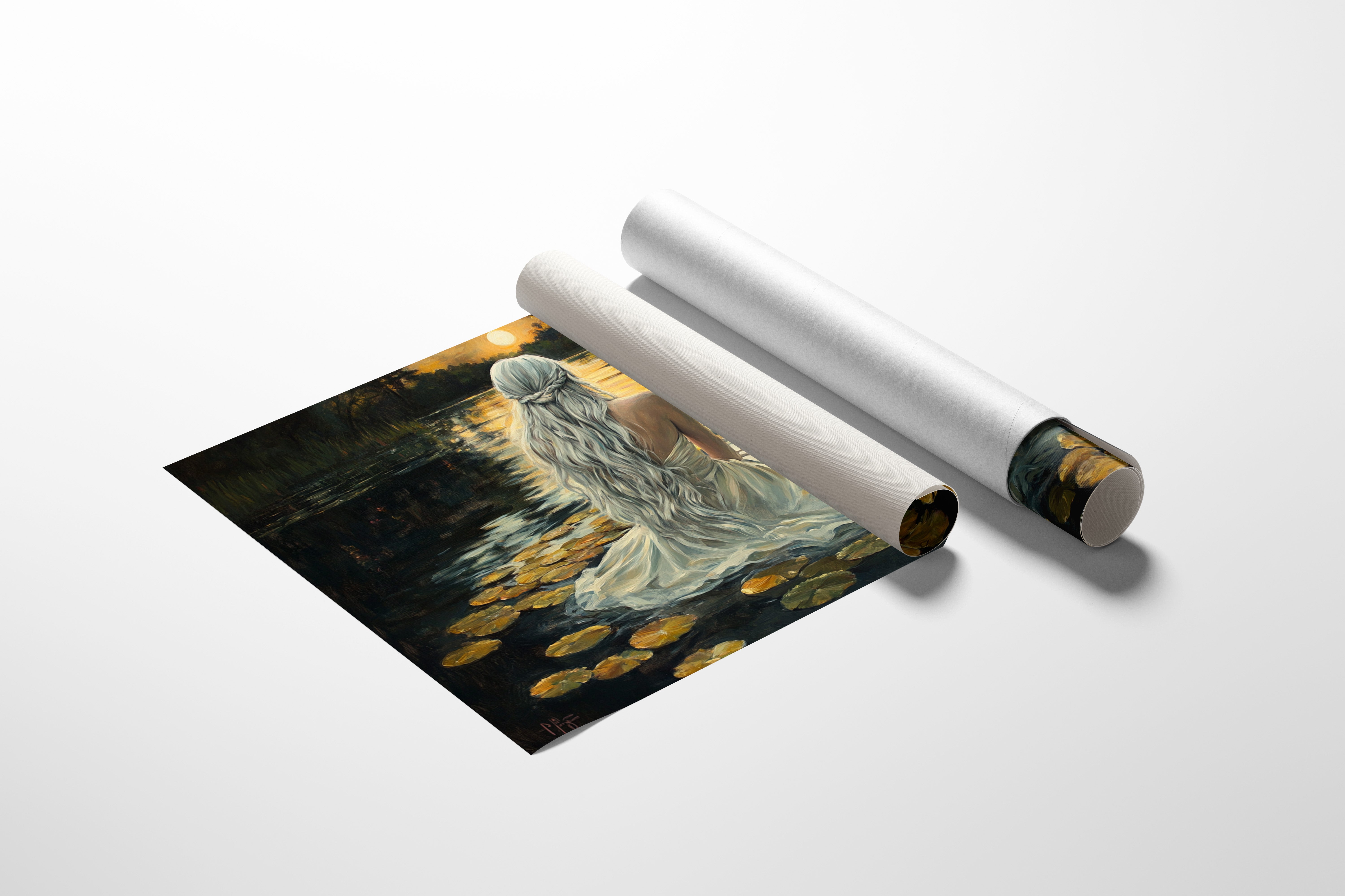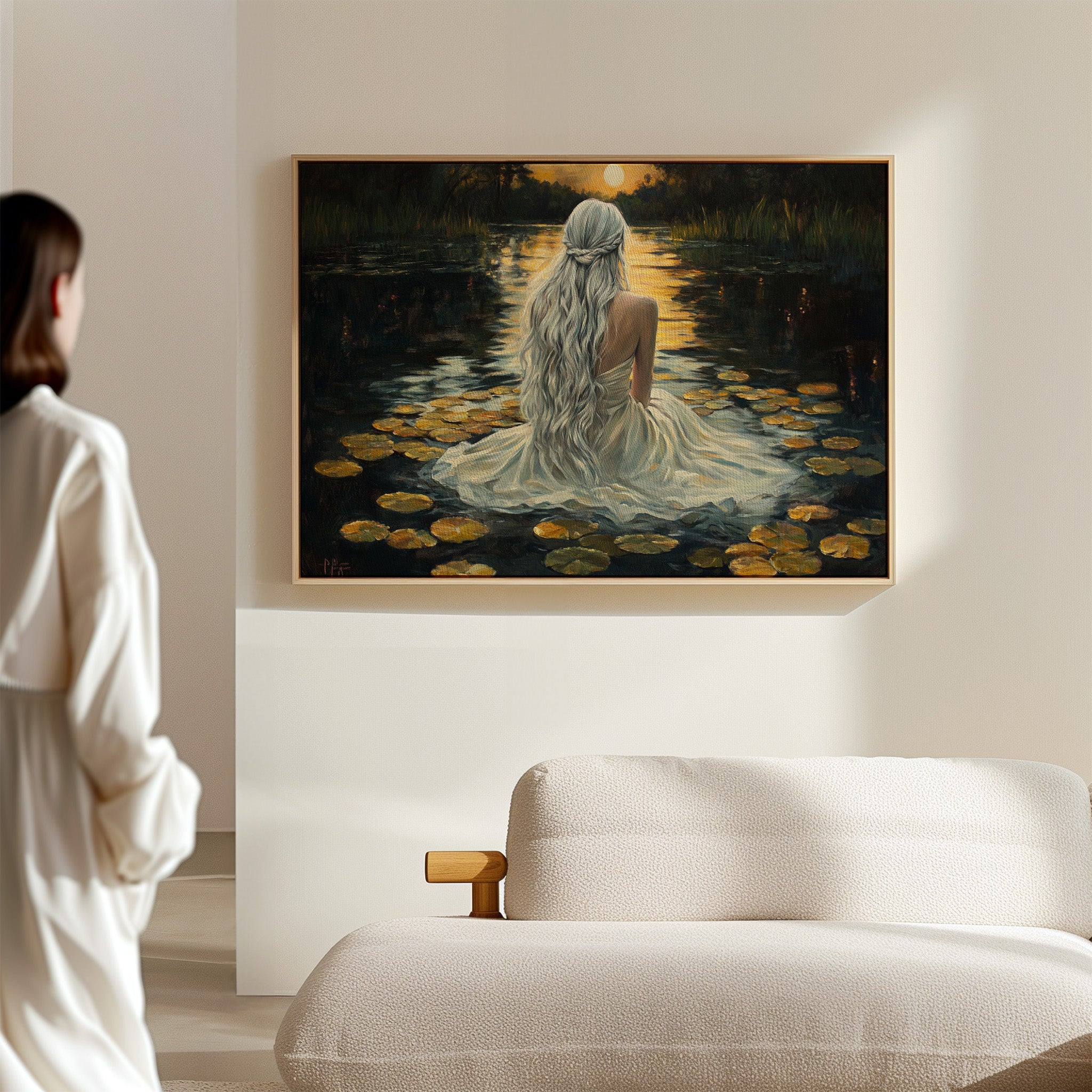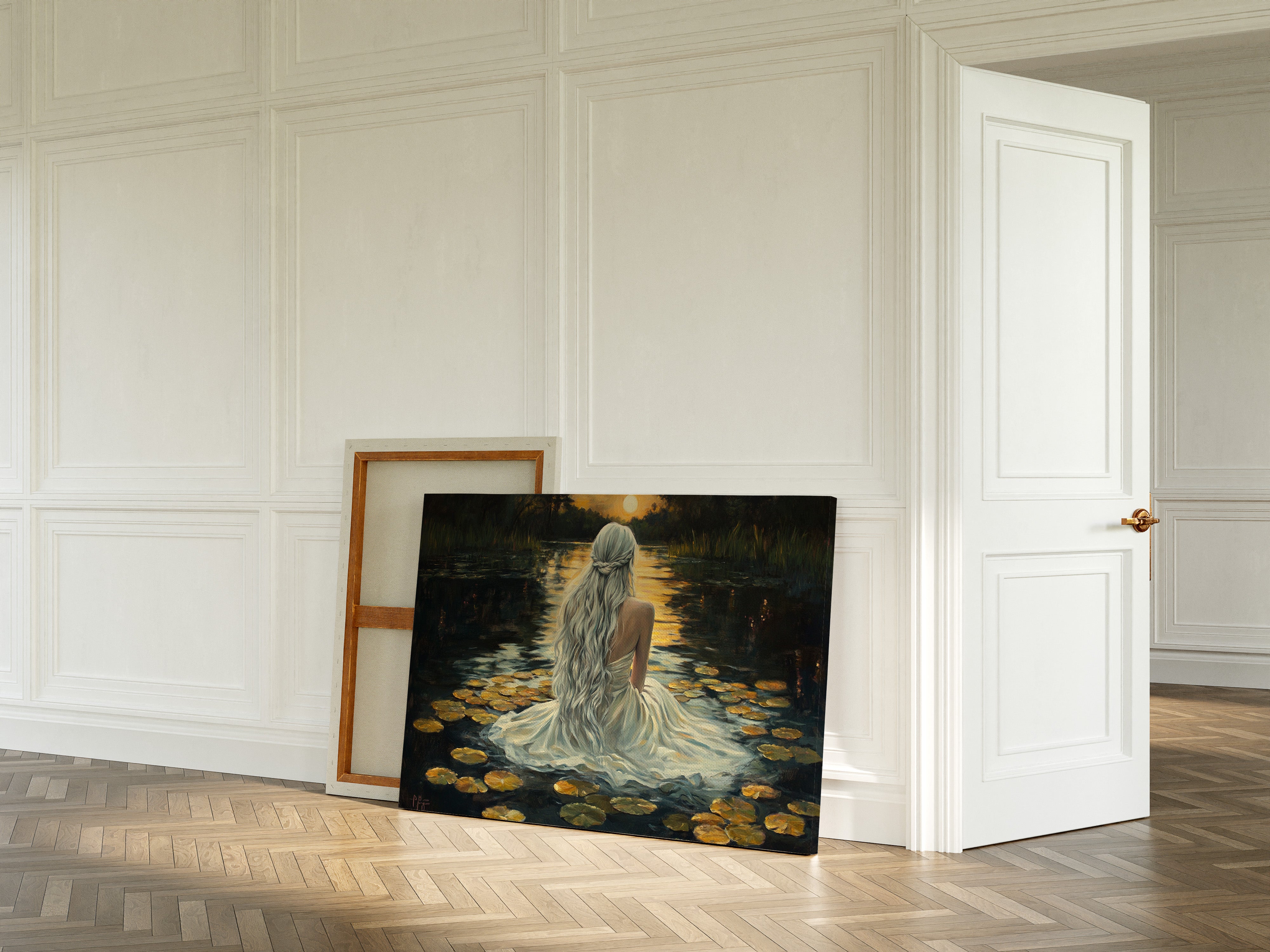 A tranquil pond reflects the golden orb of the moon, casting ethereal light across still waters. Long silver tresses cascade down a flowing white dress, creating ripples among scattered lily pads that glow like coins in the evening light. The scene captures a moment of pure serenity, where nature and grace intertwine in perfect harmony beneath the watchful gaze of surrounding pines. This romantic composition speaks to the soul's quiet moments of contemplation and connection with the natural world. Perfect for a master bedroom or meditation space where its dreamy atmosphere can inspire moments of peaceful reflection.
