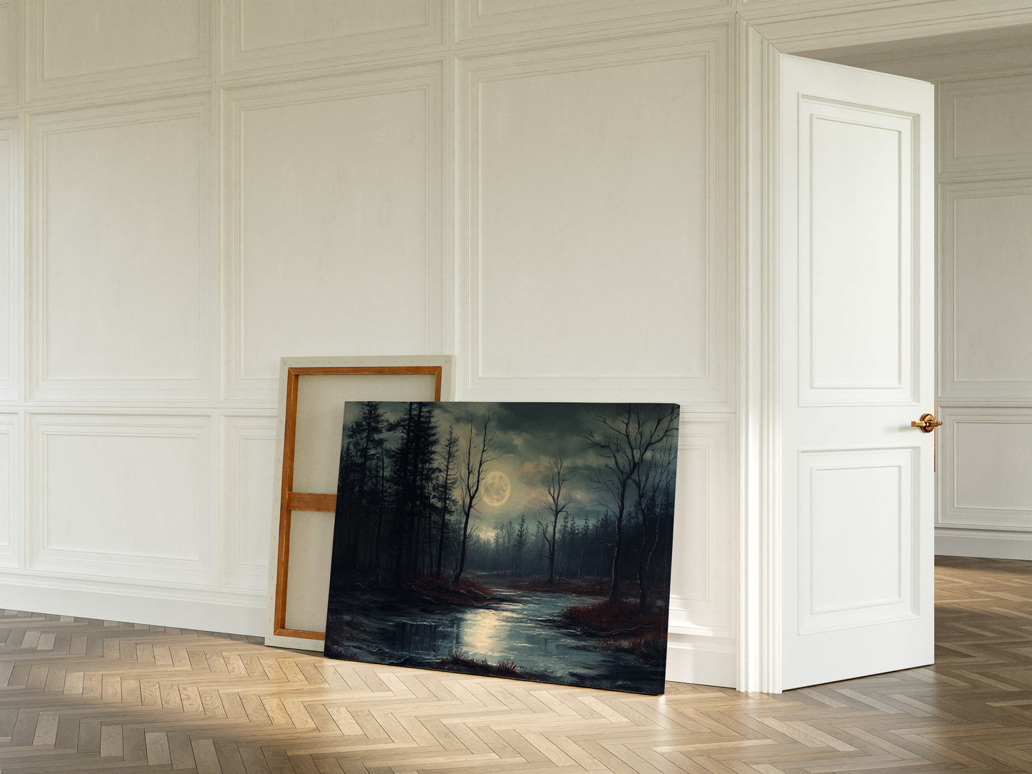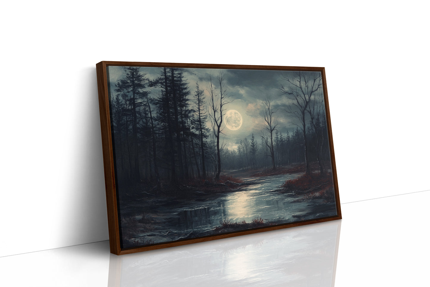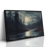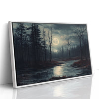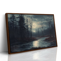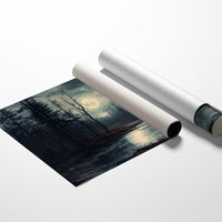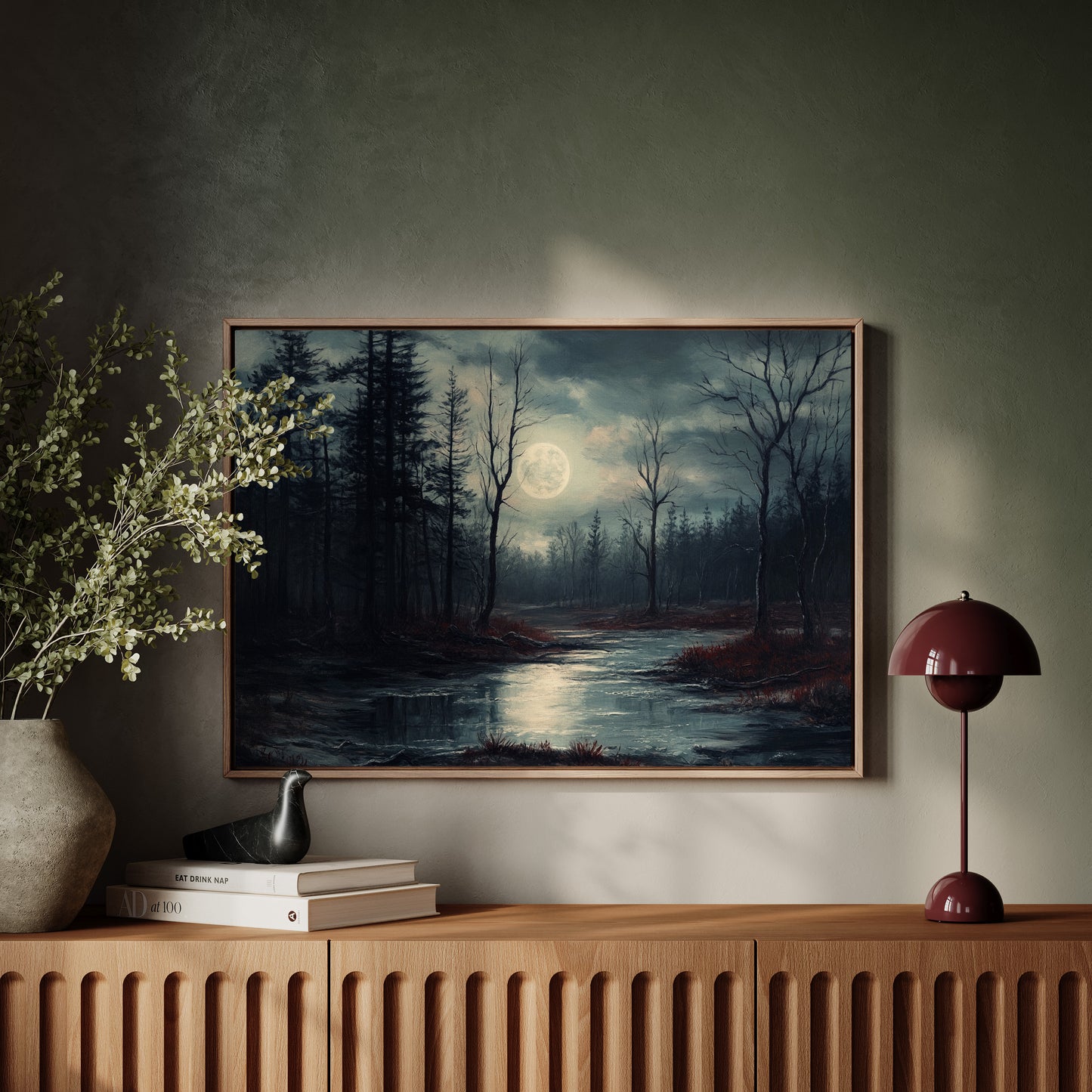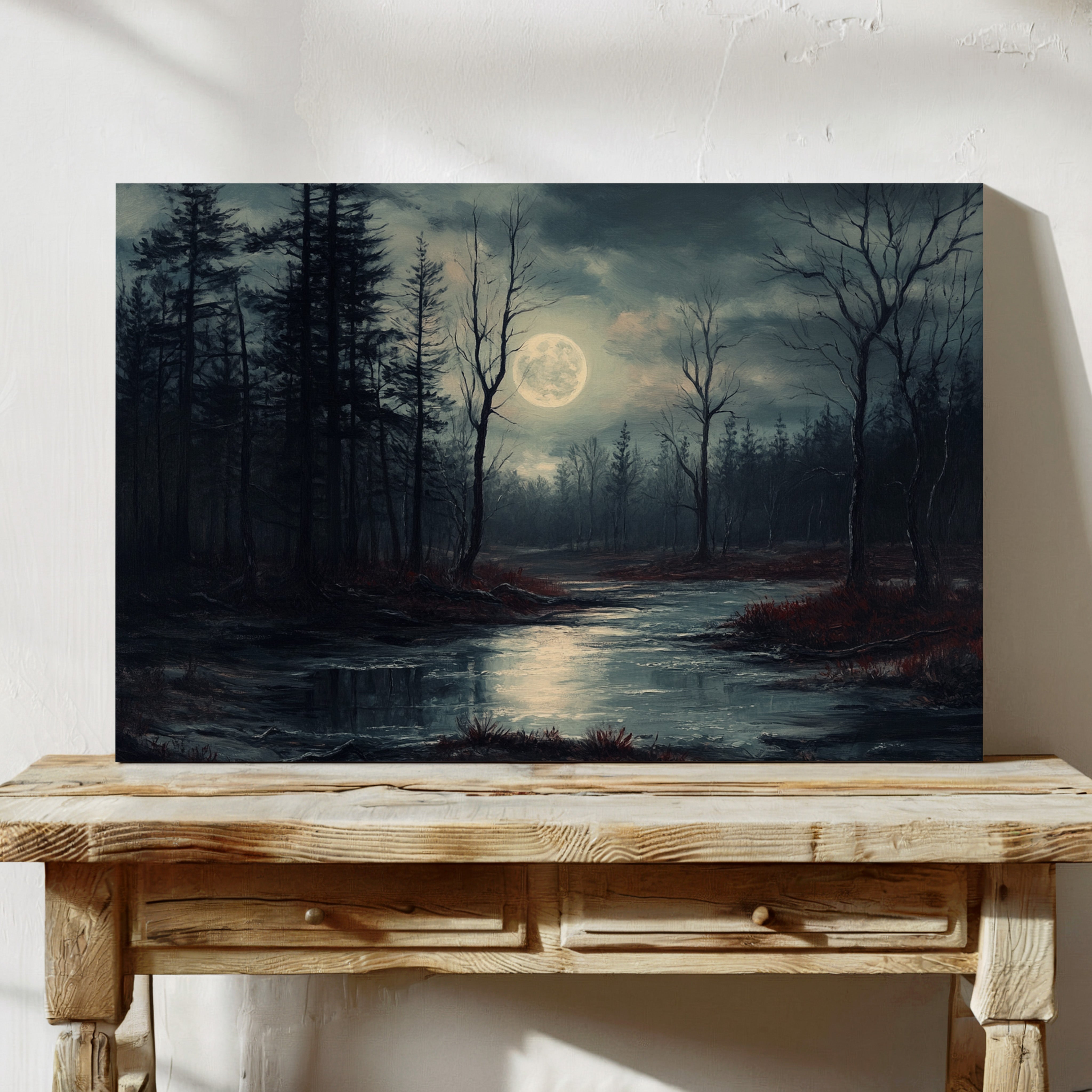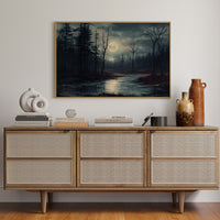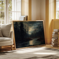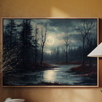 A full moon hangs like a luminous pearl in the winter sky, casting its ethereal glow across a tranquil forest stream. The silvery light dances on the water's surface, creating a path of liquid moonlight that winds through the darkness. Bare trees stand as silent sentinels, their stark branches reaching skyward, while evergreen pines add depth to the mysterious woodland scene. Deep teals and midnight blues dominate the palette, punctuated by touches of russet undergrowth that add warmth to the otherwise cool landscape. This moody piece would create a captivating focal point in a study or reading nook, where its contemplative atmosphere can inspire quiet reflection.