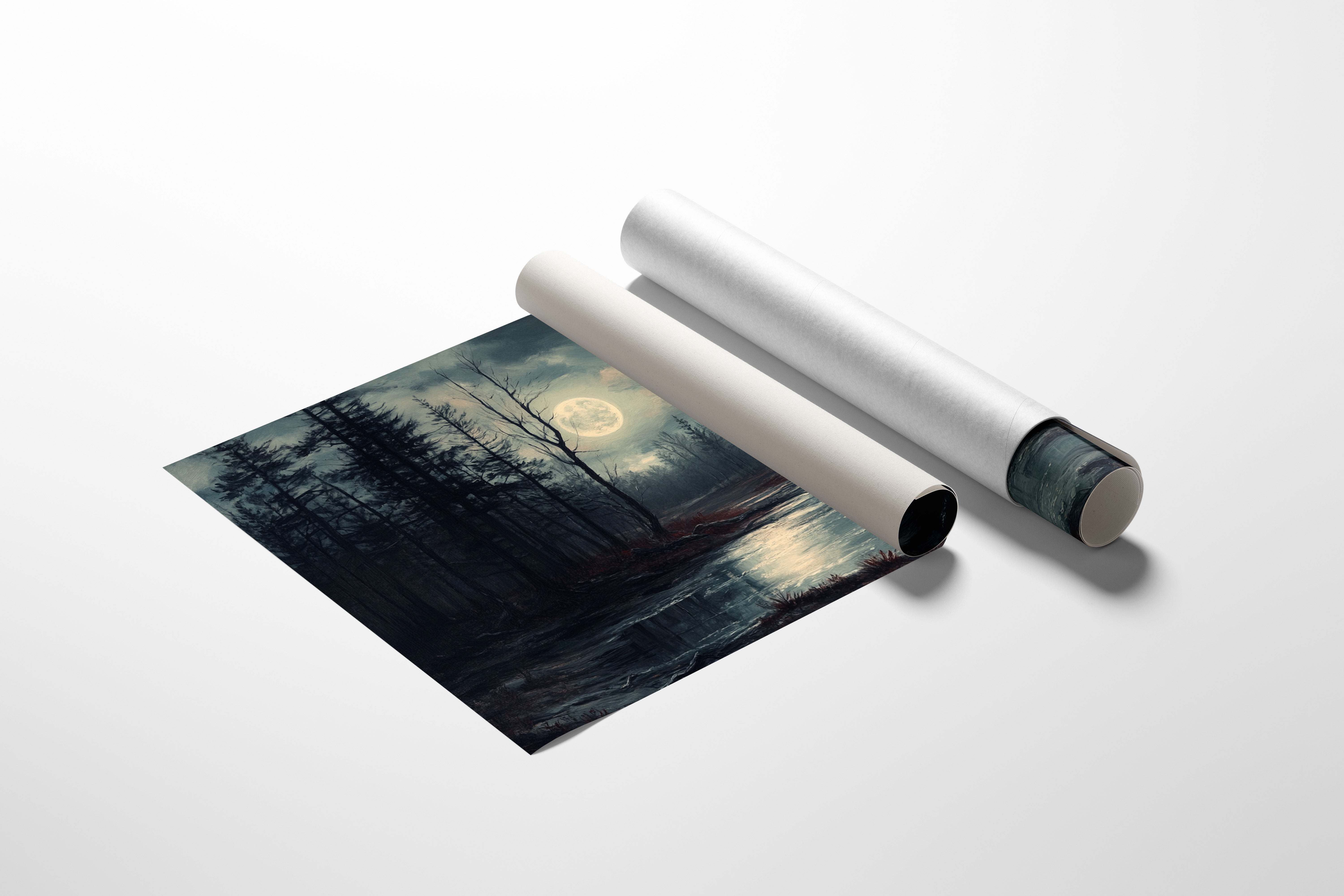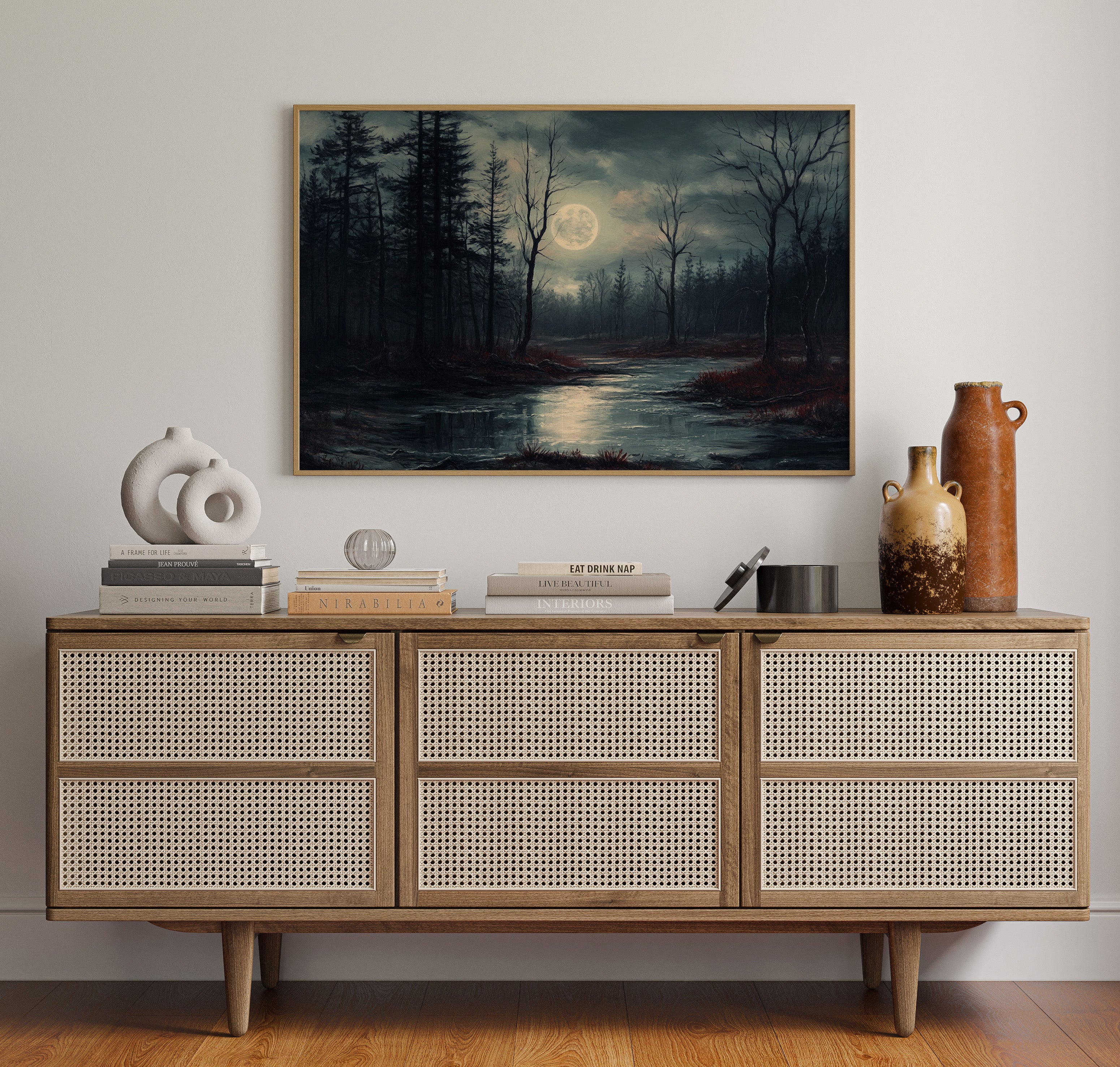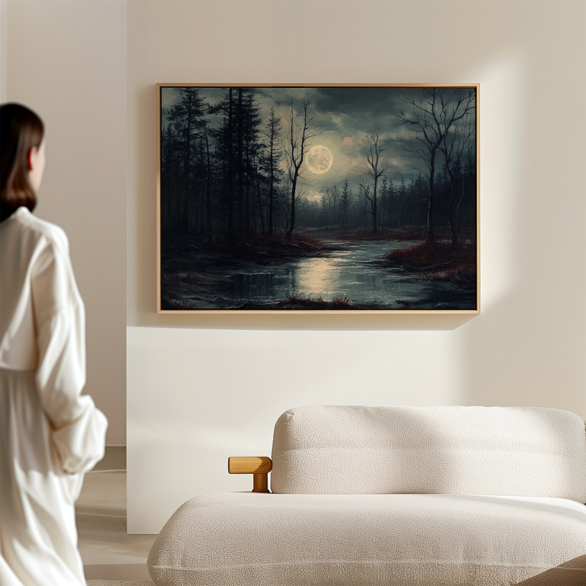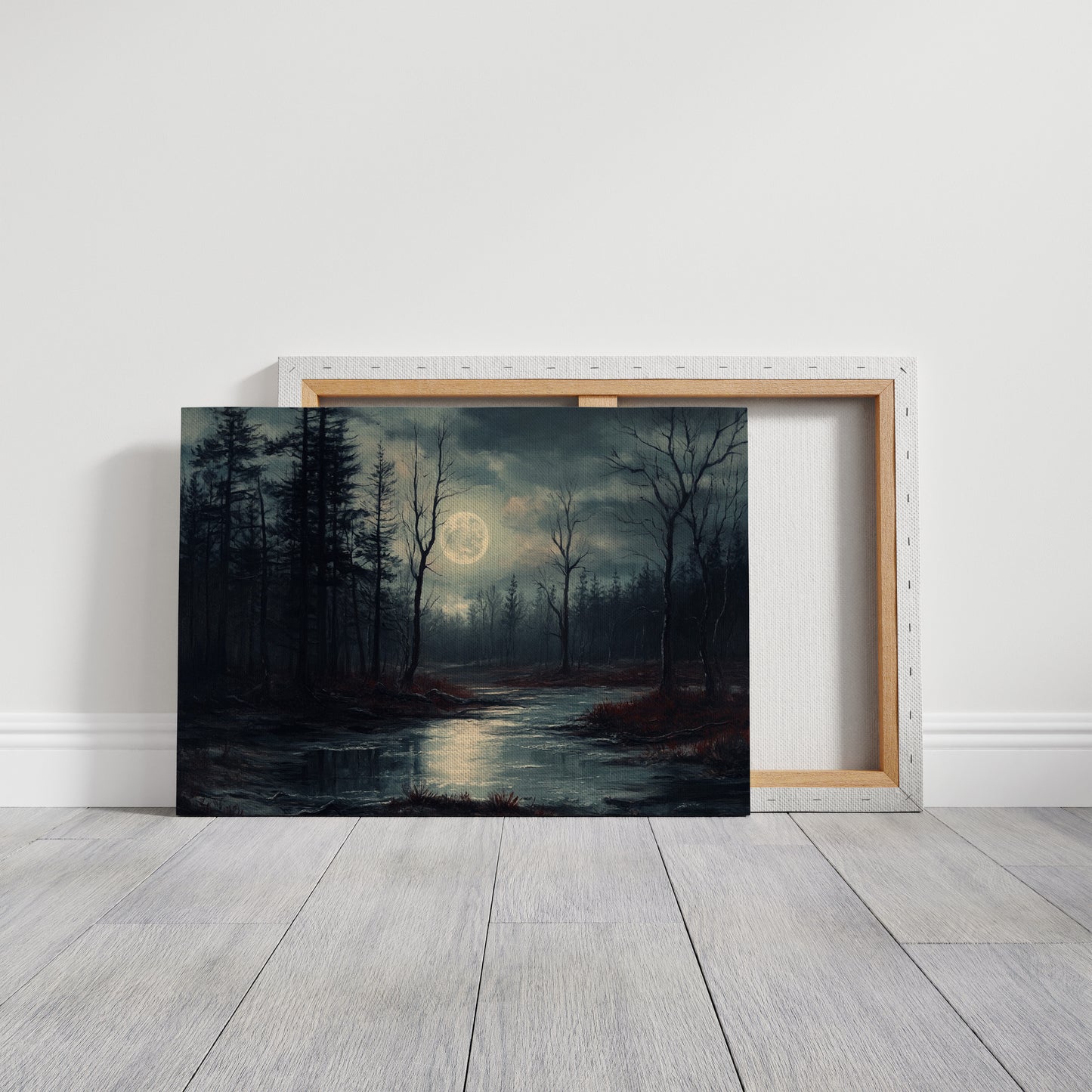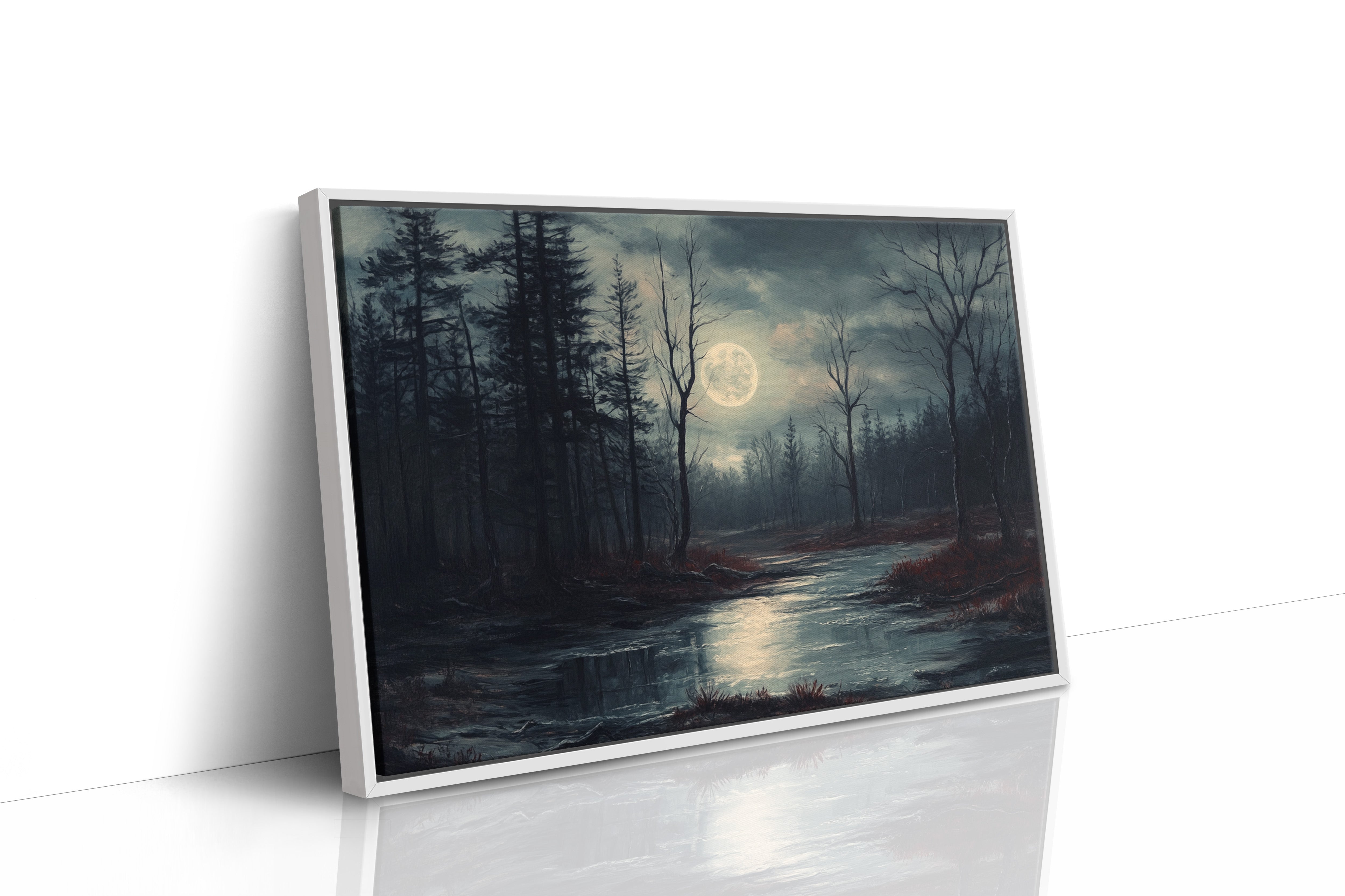 A full moon hangs like a luminous pearl in the winter sky, casting its ethereal glow across a tranquil forest stream. The silvery light dances on the water's surface, creating a path of liquid moonlight that winds through the darkness. Bare trees stand as silent sentinels, their stark branches reaching skyward, while evergreen pines add depth to the mysterious woodland scene. Deep teals and midnight blues dominate the palette, punctuated by touches of russet undergrowth that add warmth to the otherwise cool landscape. This moody piece would create a captivating focal point in a study or reading nook, where its contemplative atmosphere can inspire quiet reflection.