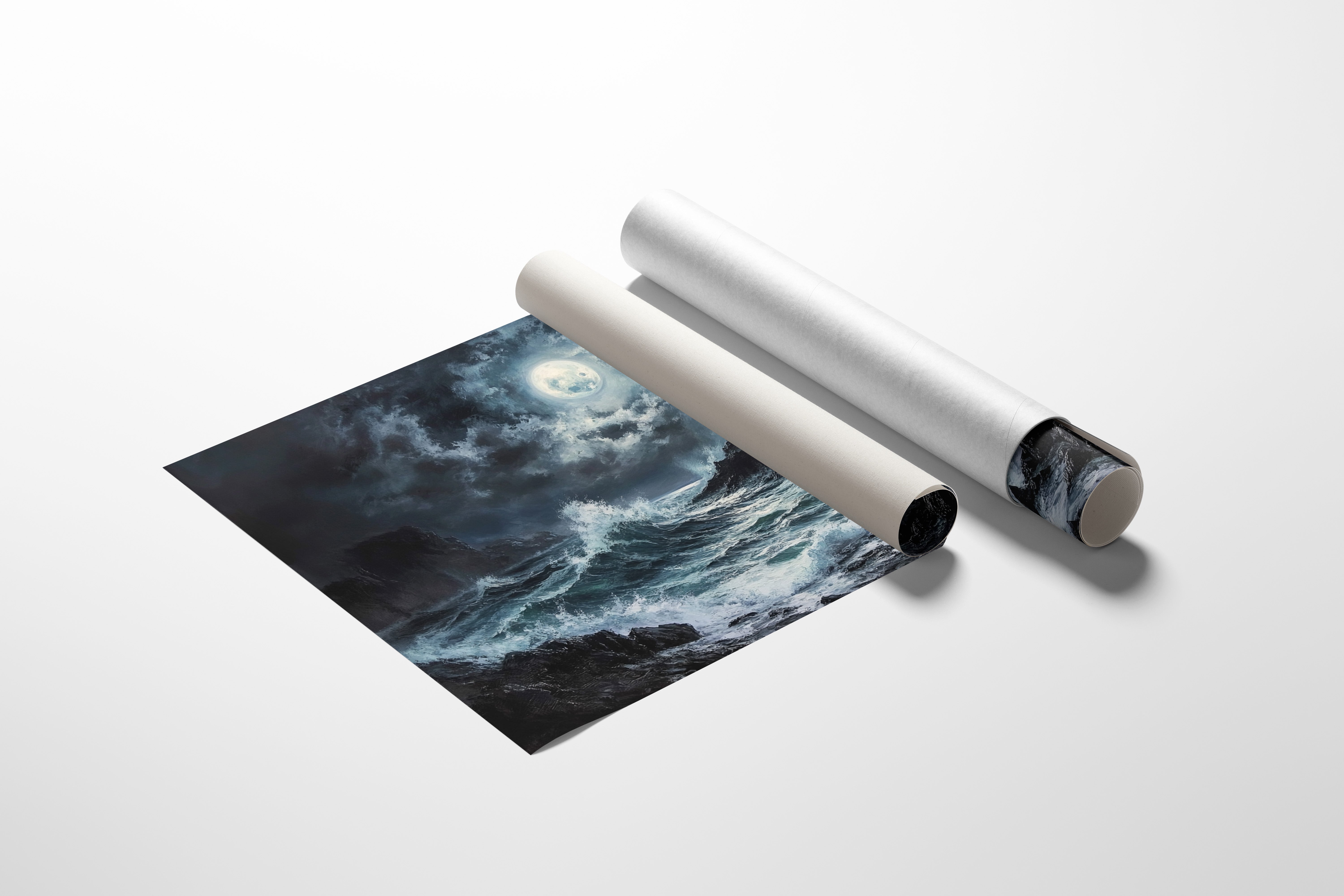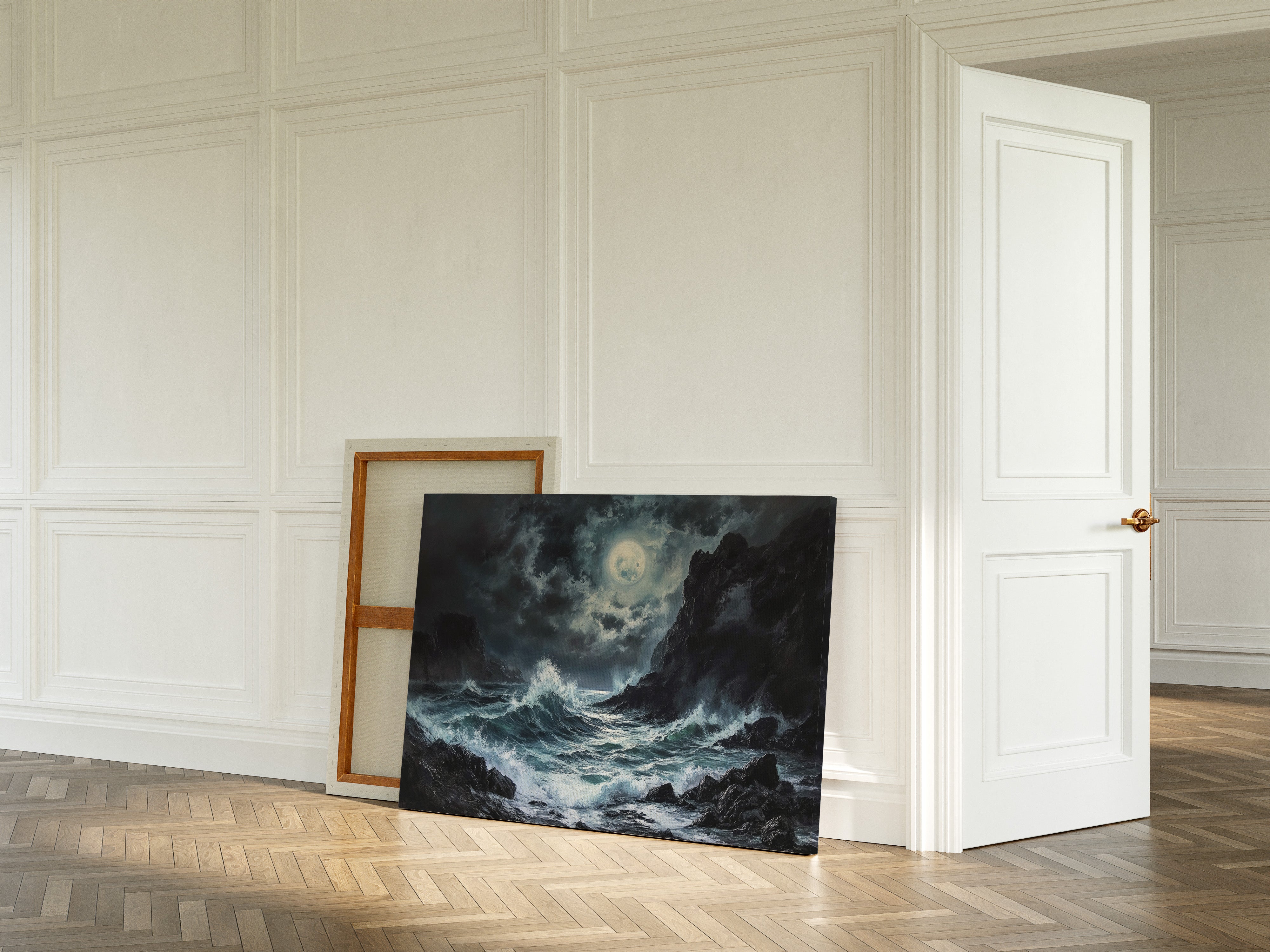 Turbulent waters crash against ancient cliffs, their foam-tipped waves illuminated by a brilliant full moon. The dramatic seascape captures nature's raw power as stormy waters surge through the rocky channel, creating a symphony of motion and might. Deep teals and silvery blues dance across the churning surface, while imposing black cliffs frame the scene like sentinels of the shore. This moody masterpiece would command attention in a modern coastal home, bringing untamed maritime energy to a living room or master suite.