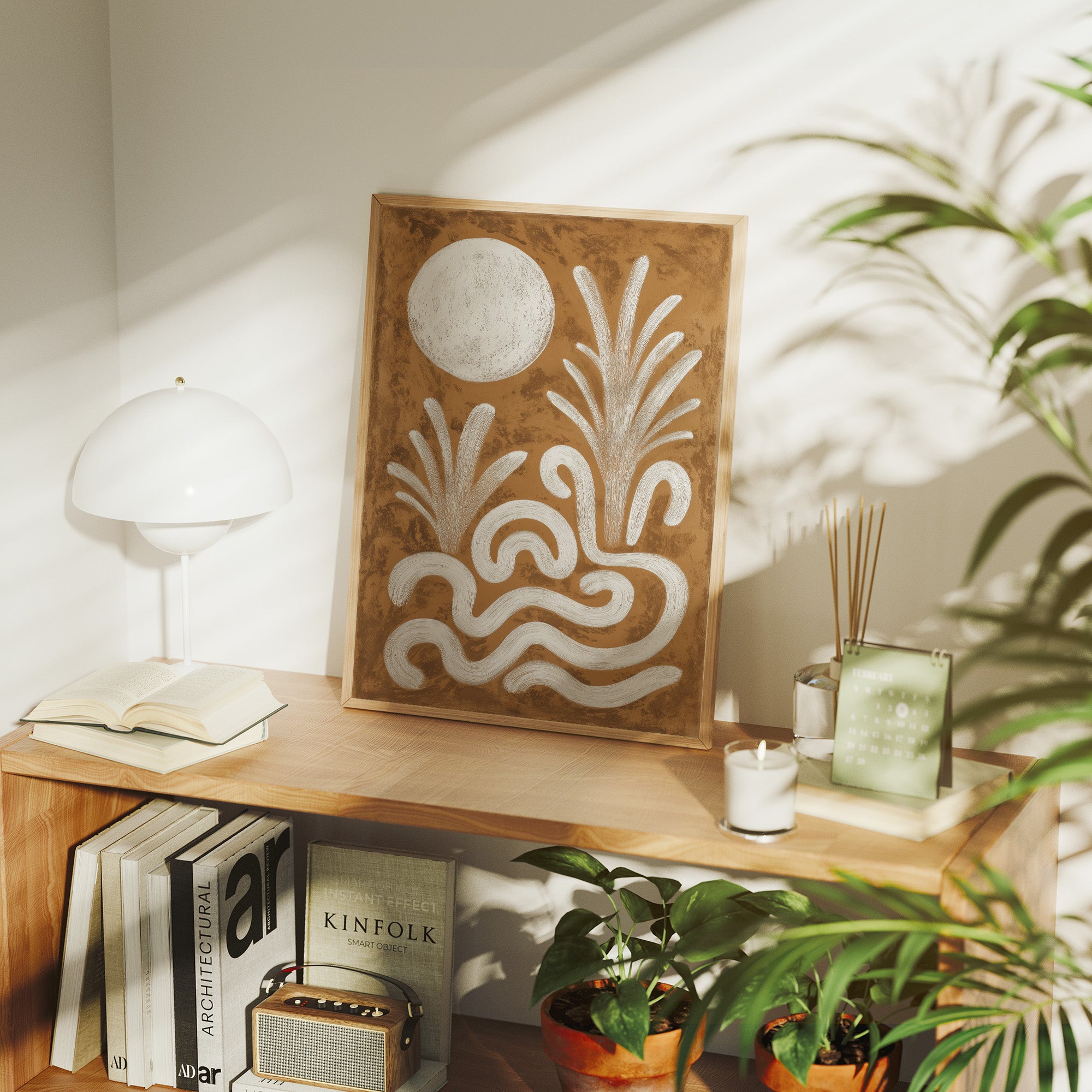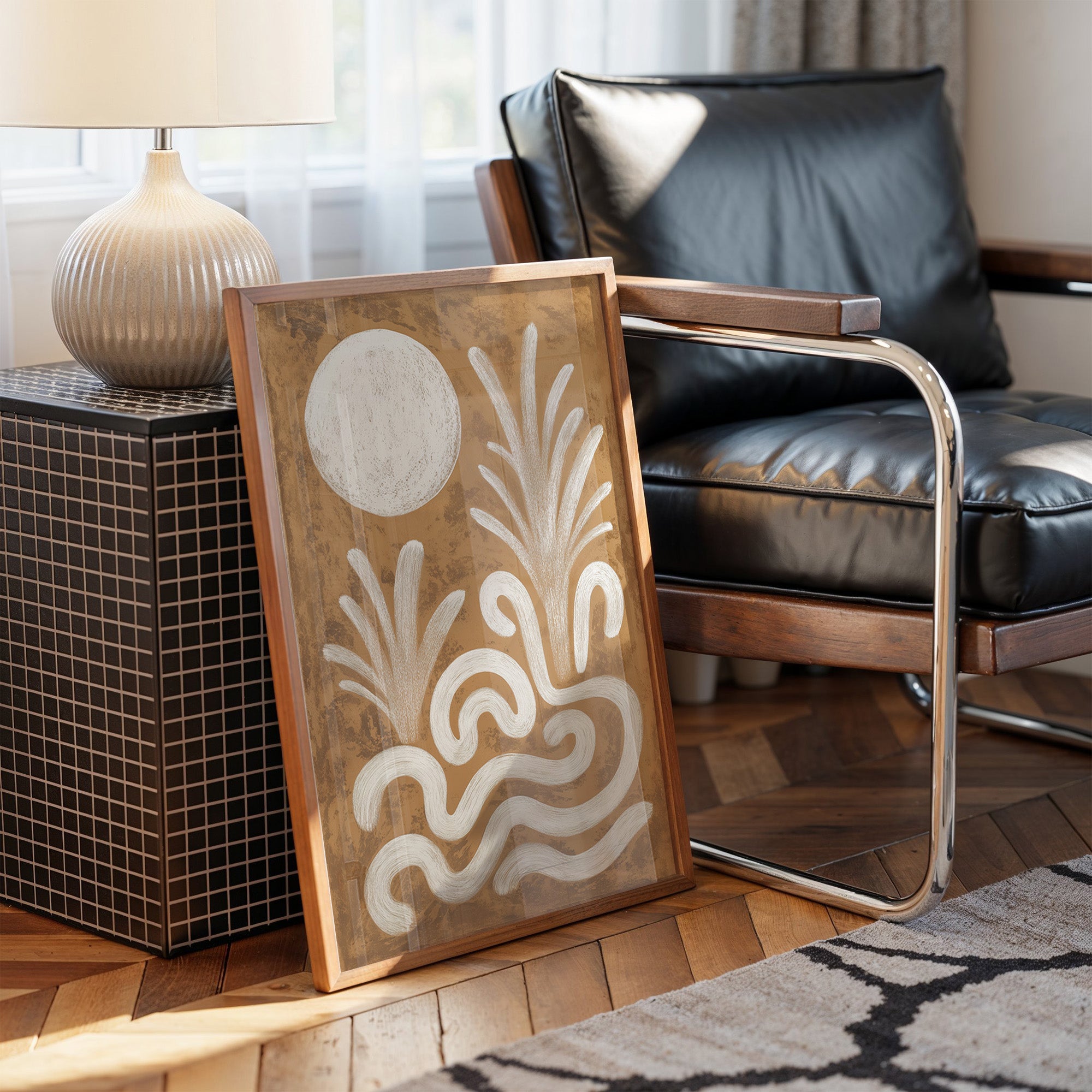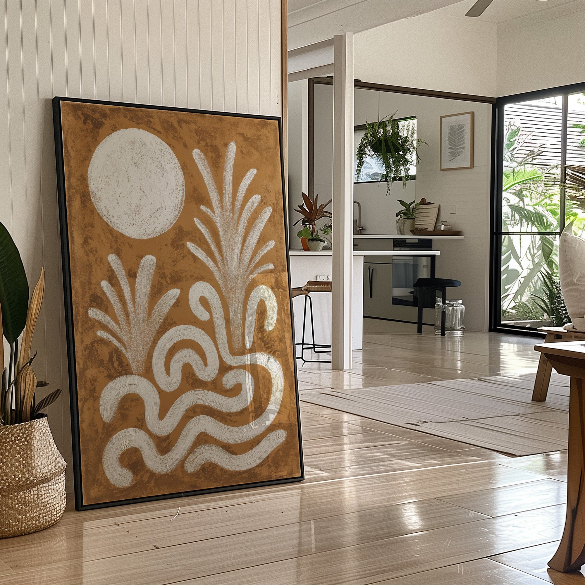 Gentle curves flow like ocean spray beneath a luminous full moon, painted in ethereal white against warm sepia tones. The abstract composition merges organic movement with geometric precision, creating a harmonious dance of forms that feels both ancient and modern. The textured background adds depth and warmth, while the flowing lines suggest a natural rhythm of growth and movement. This piece would bring sophisticated serenity to a reading nook or creative workspace, where its balanced energy can inspire quiet contemplation.
