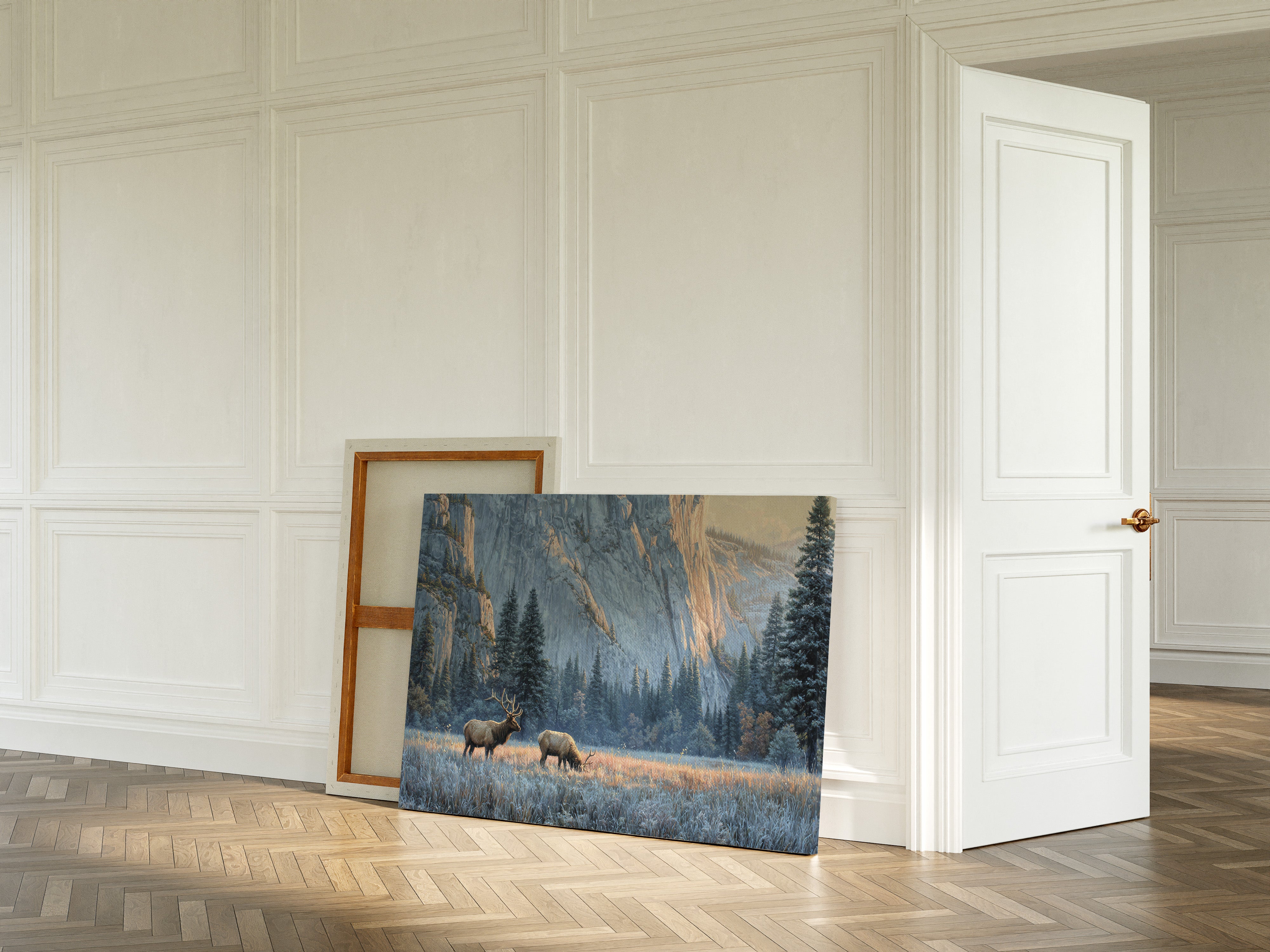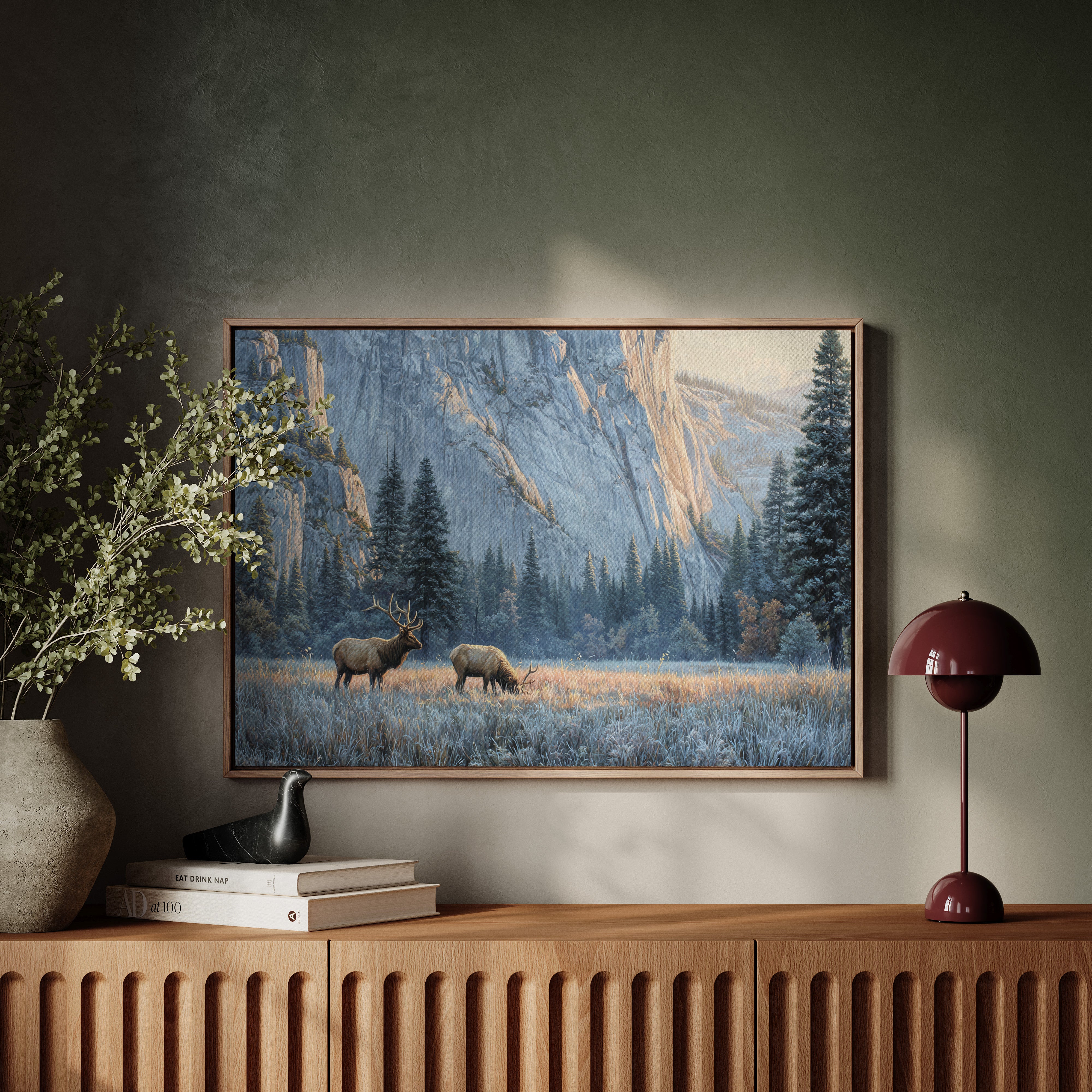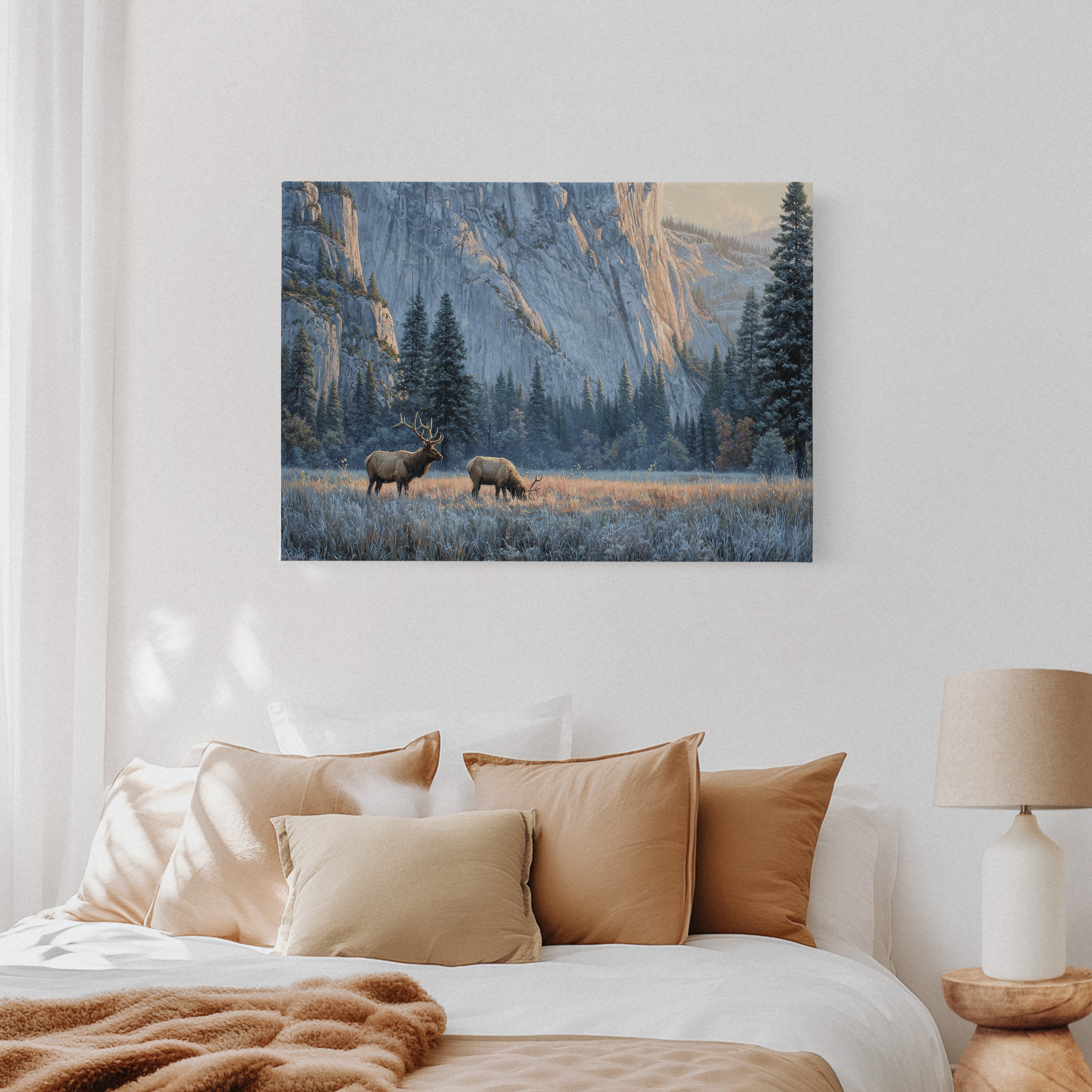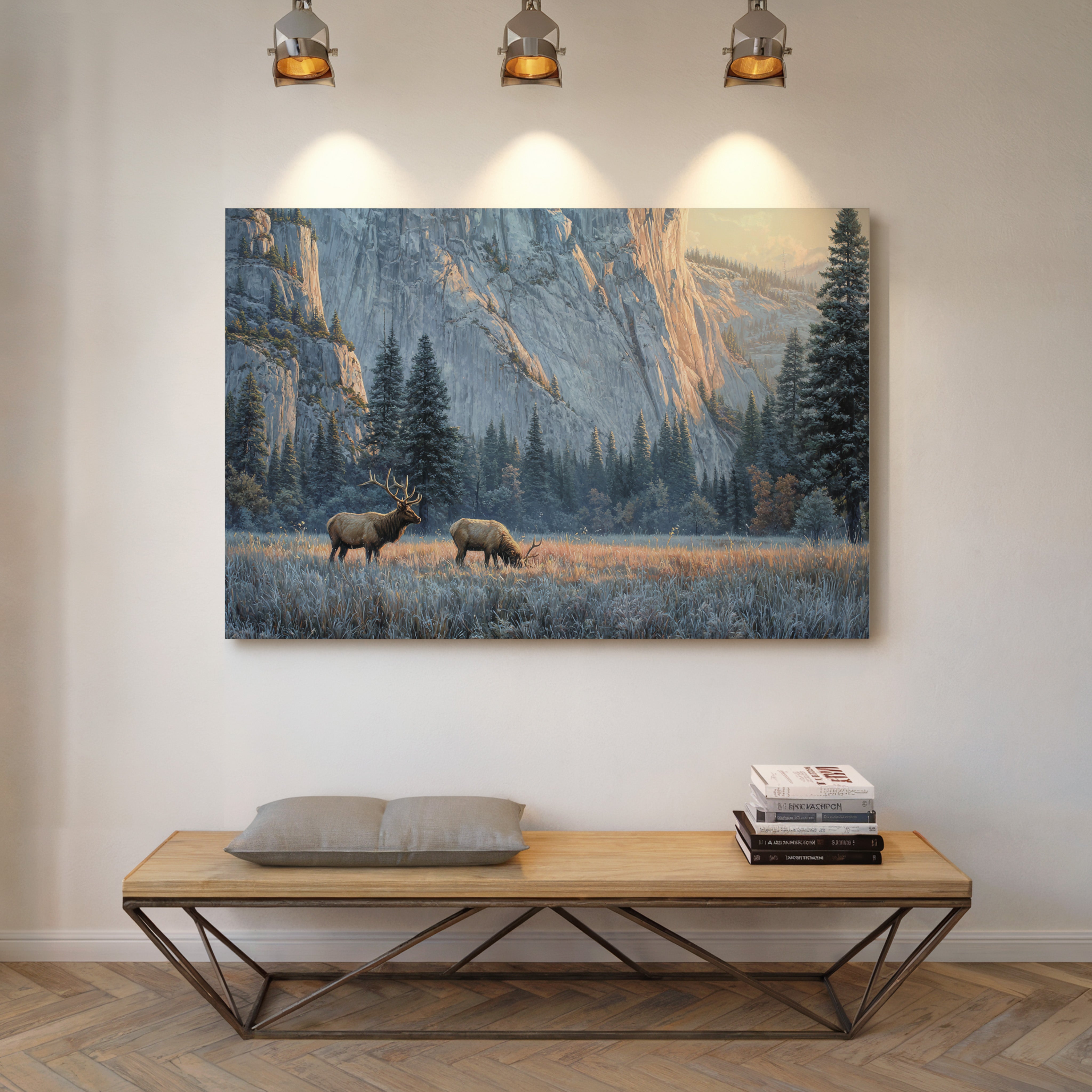 Dawn light spills across a frosted meadow, where two majestic elk pause in their morning ritual. Against the backdrop of towering granite cliffs, their breath mingles with the crisp mountain air, creating ephemeral clouds that dance briefly before disappearing. The contrast between the warm golden grasses and the cool blue-grey stone tells a story of nature's masterful touch, while evergreen sentinels stand watch along the valley floor. This scene captures the raw beauty of wilderness where wild creatures roam freely beneath ancient stone faces. Perfect for a great room or lodge-style space where its grand scale and serene energy can set a commanding yet peaceful tone.
