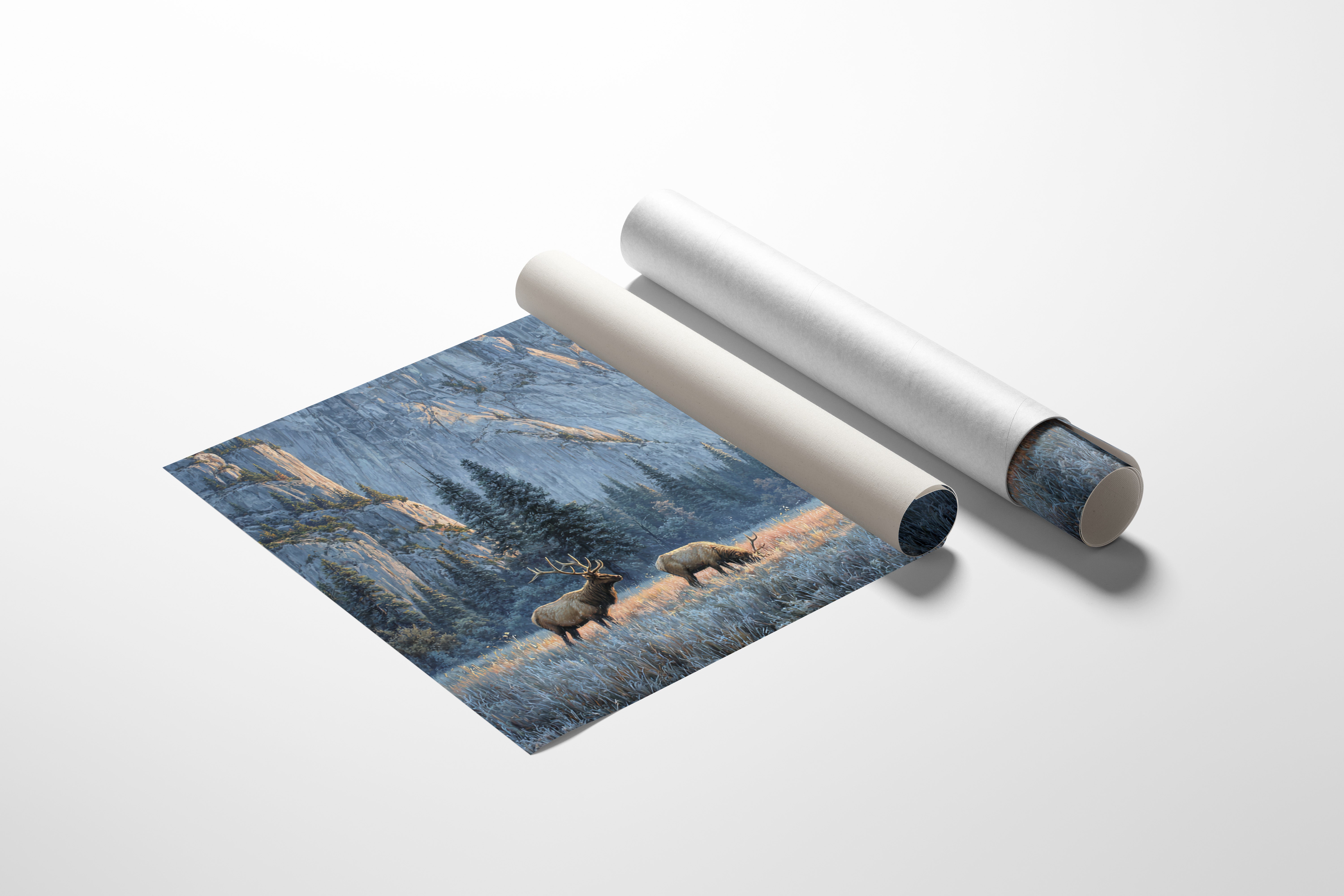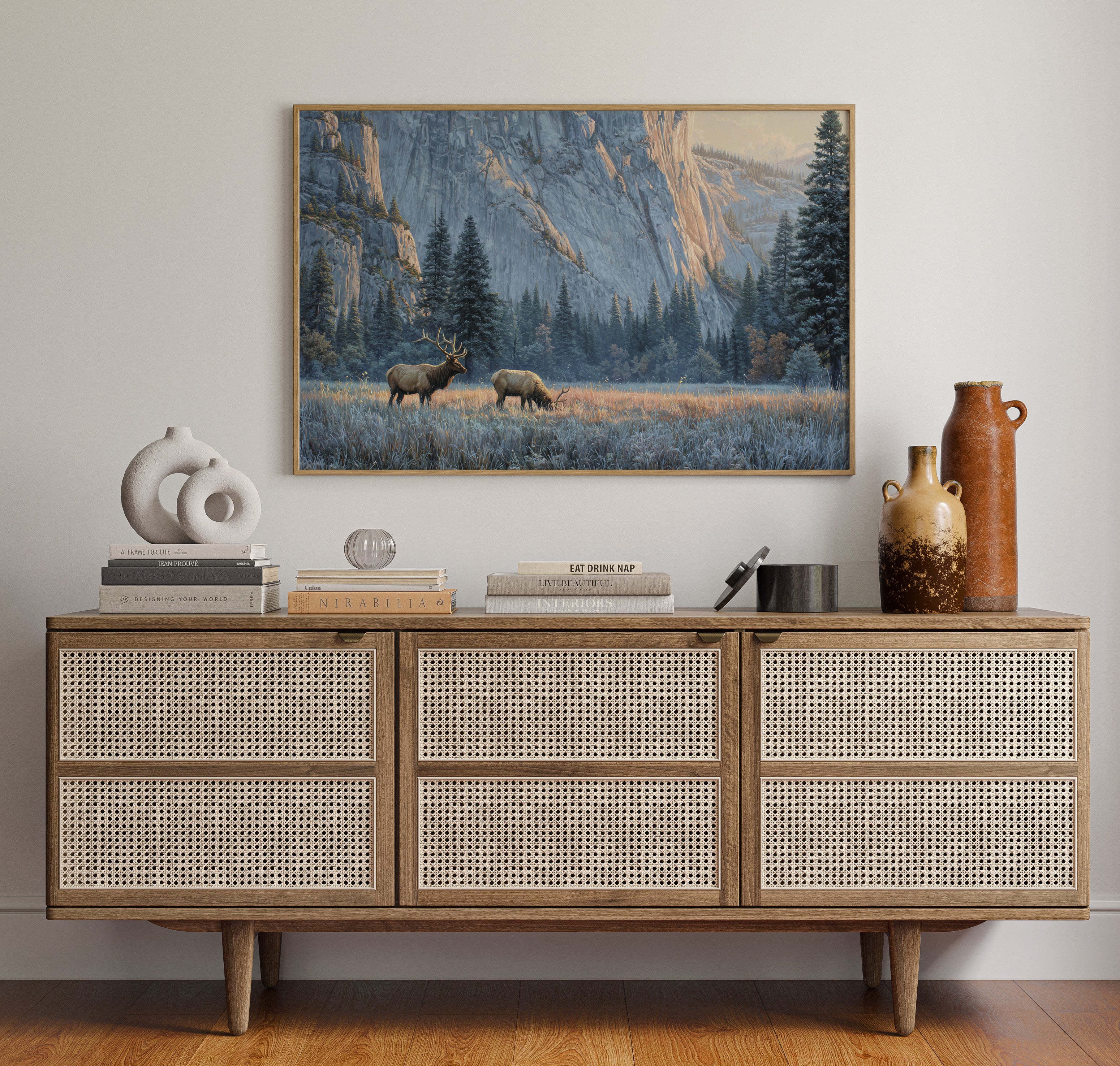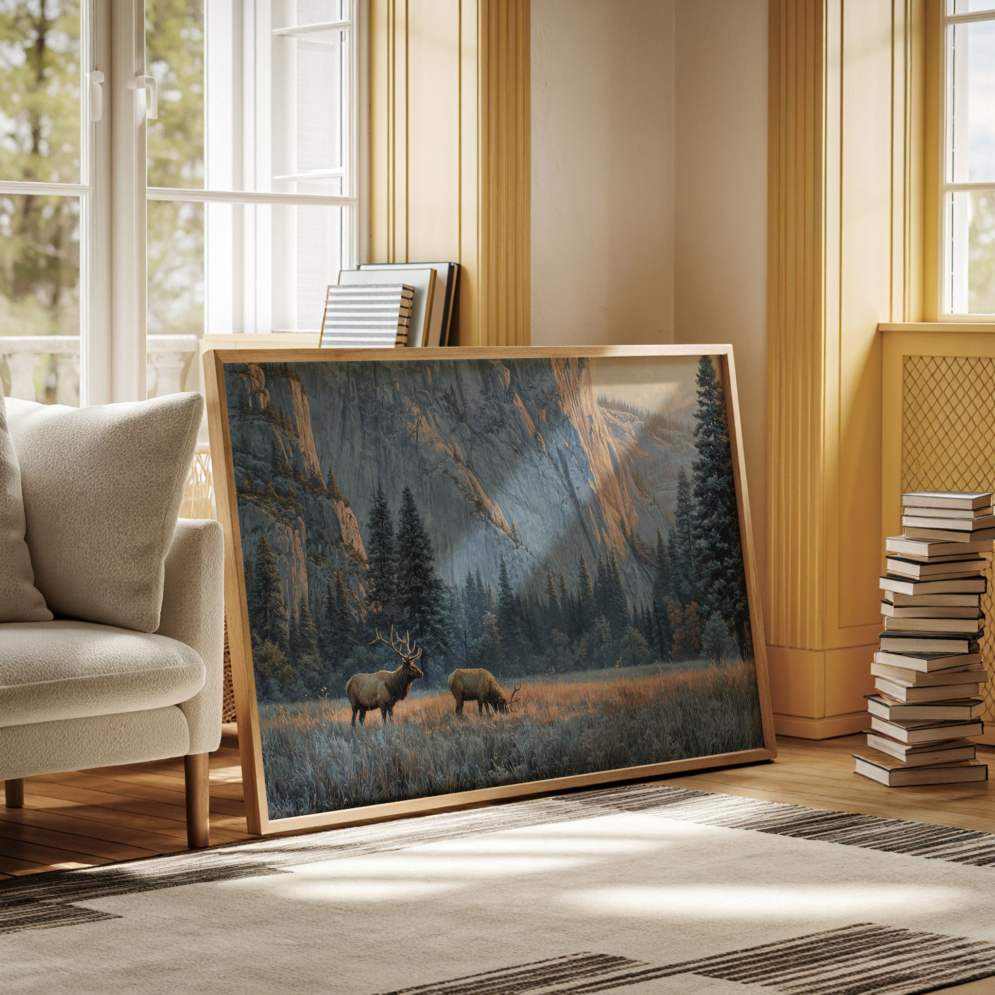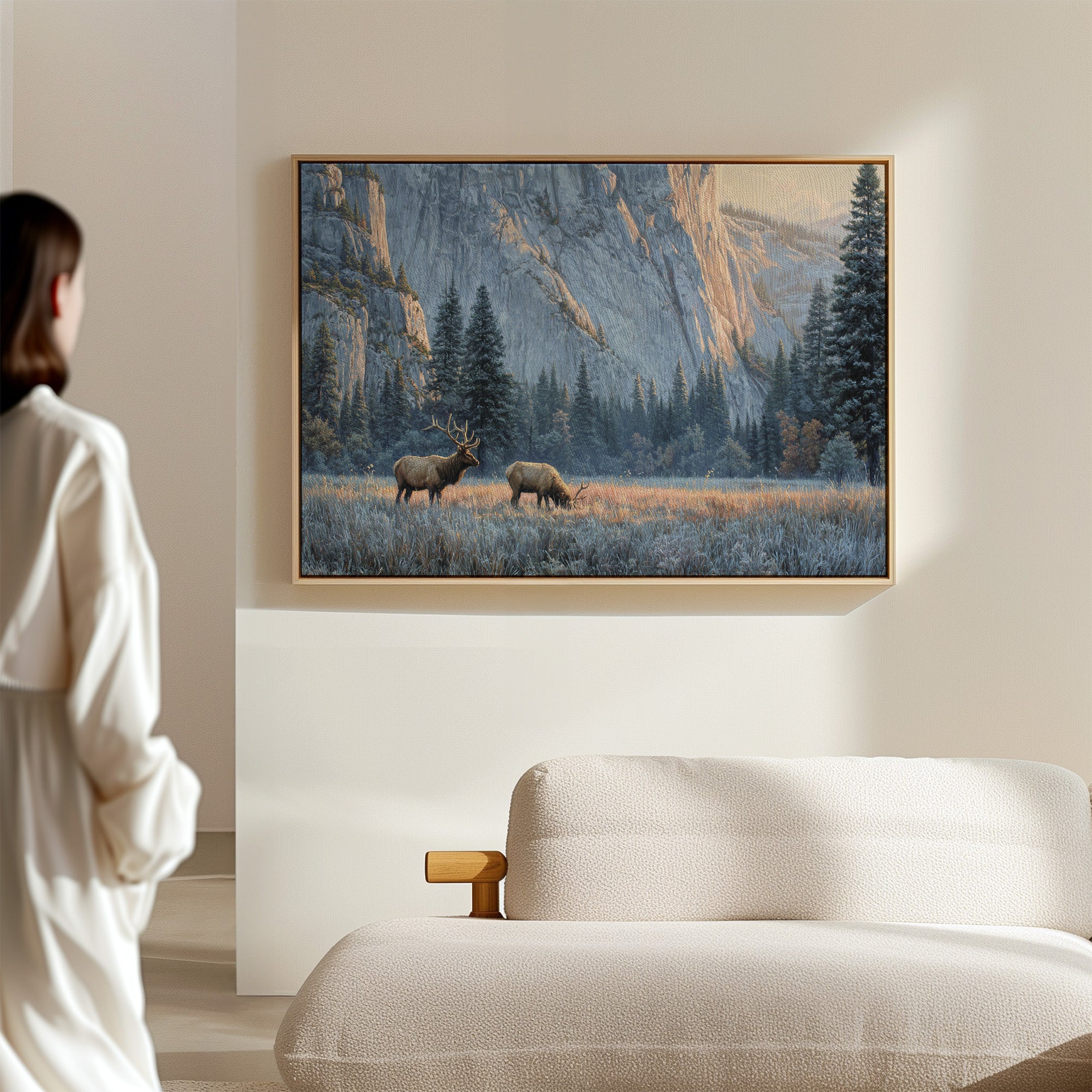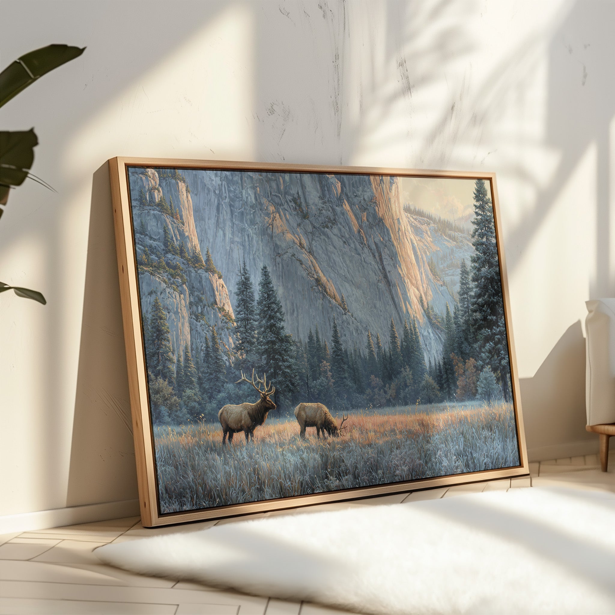 Dawn light spills across a frosted meadow, where two majestic elk pause in their morning ritual. Against the backdrop of towering granite cliffs, their breath mingles with the crisp mountain air, creating ephemeral clouds that dance briefly before disappearing. The contrast between the warm golden grasses and the cool blue-grey stone tells a story of nature's masterful touch, while evergreen sentinels stand watch along the valley floor. This scene captures the raw beauty of wilderness where wild creatures roam freely beneath ancient stone faces. Perfect for a great room or lodge-style space where its grand scale and serene energy can set a commanding yet peaceful tone.