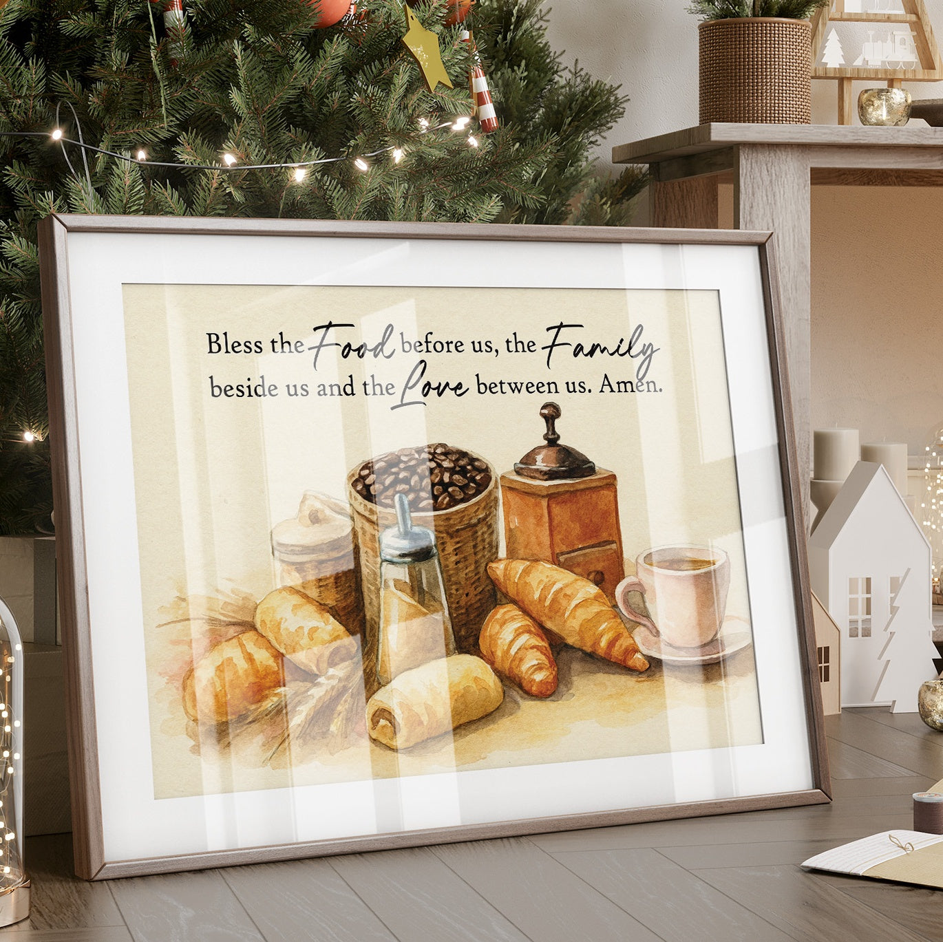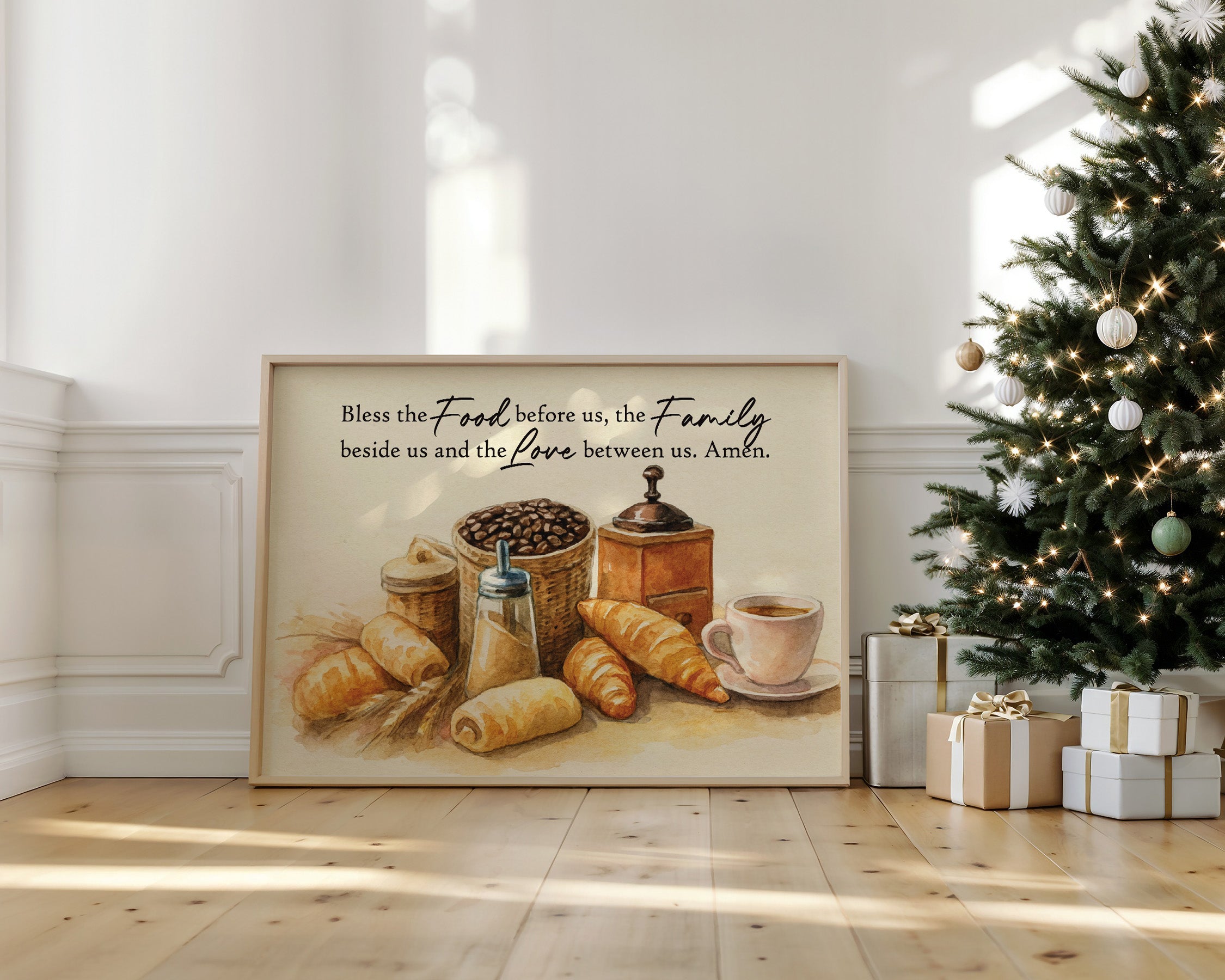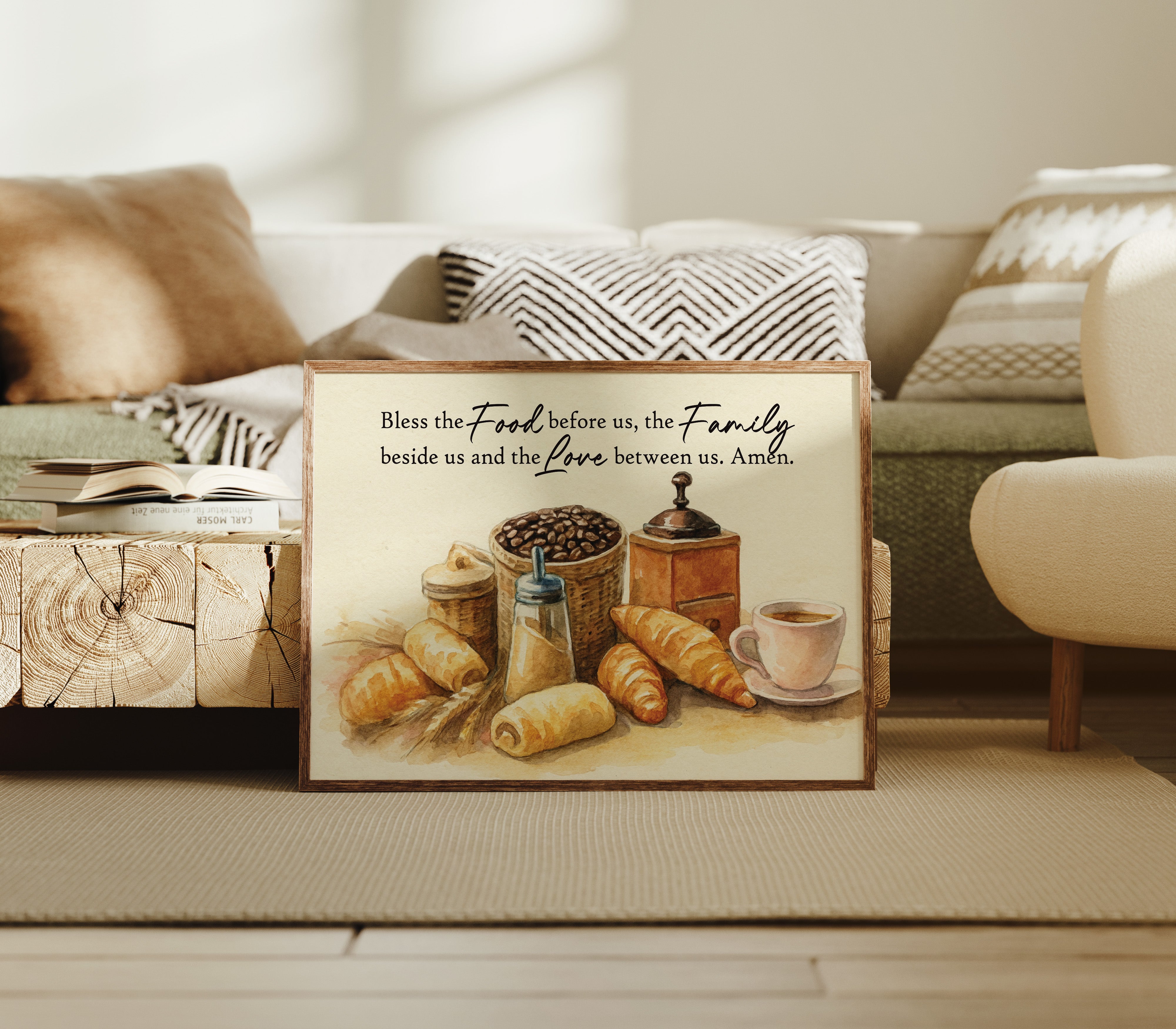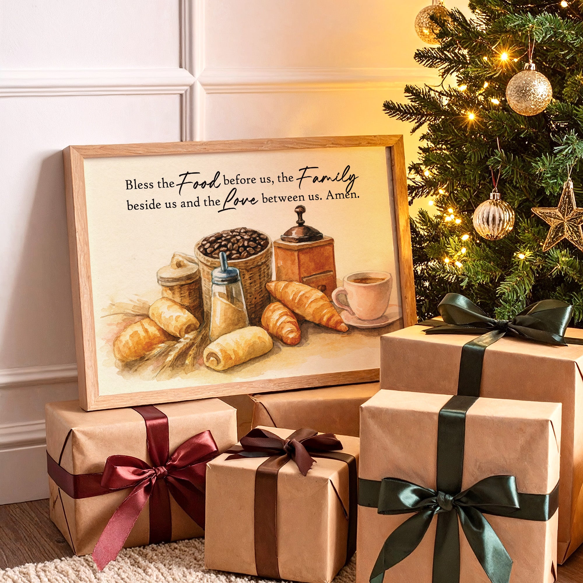 The gentle warmth of fresh-baked croissants mingles with the rich aroma of coffee in this heartfelt watercolor scene. Golden pastries rest beside a wooden coffee grinder and woven basket of beans, all rendered in soft amber and caramel tones that evoke the comfort of unhurried mornings. Above, a timeless blessing reminds us that nourishment extends beyond the physicalcelebrating connection, gratitude, and the sacred ritual of breaking bread together.