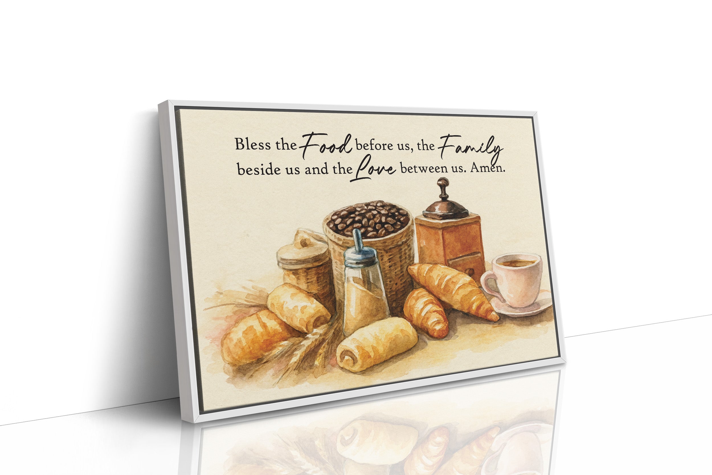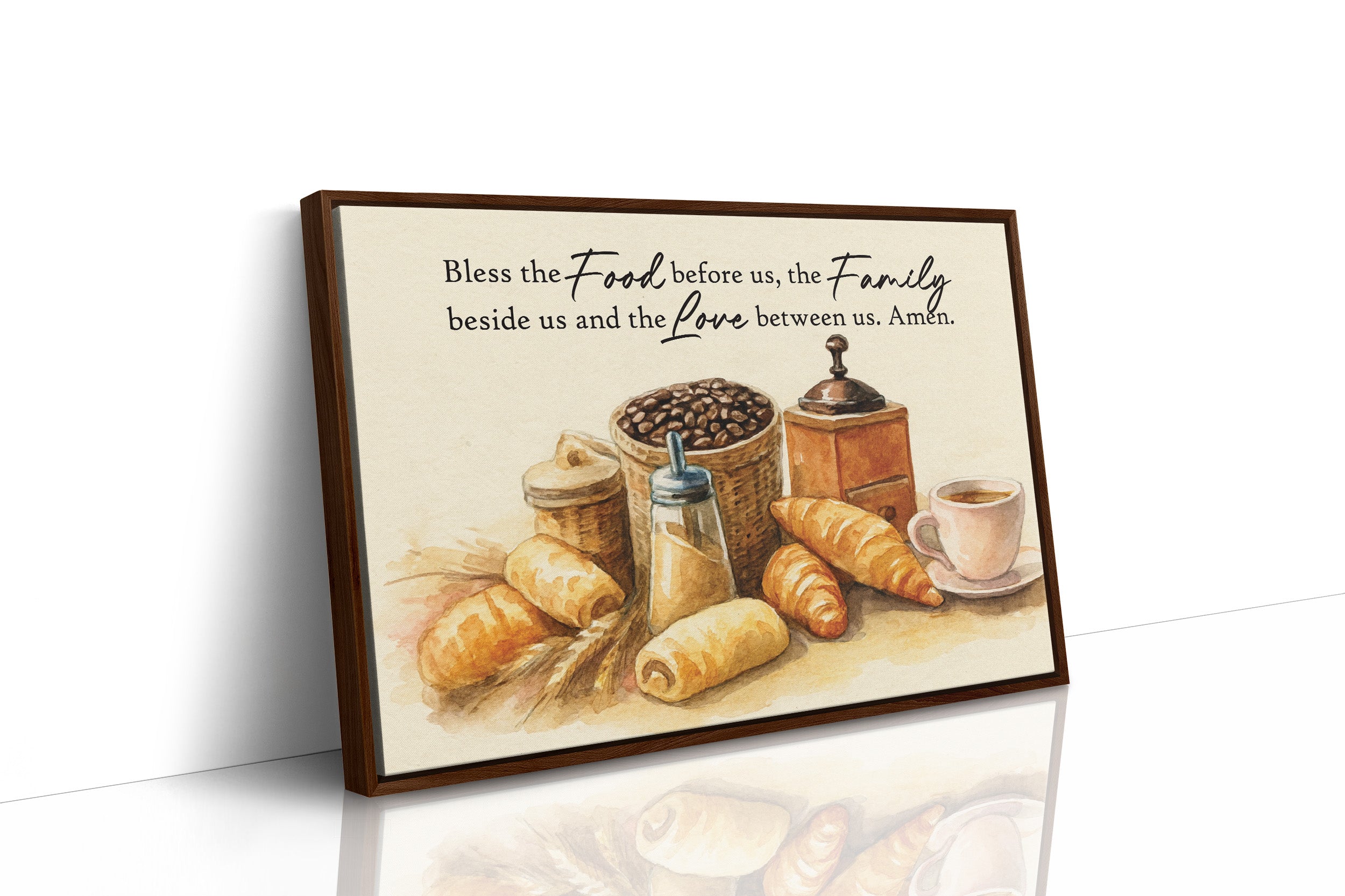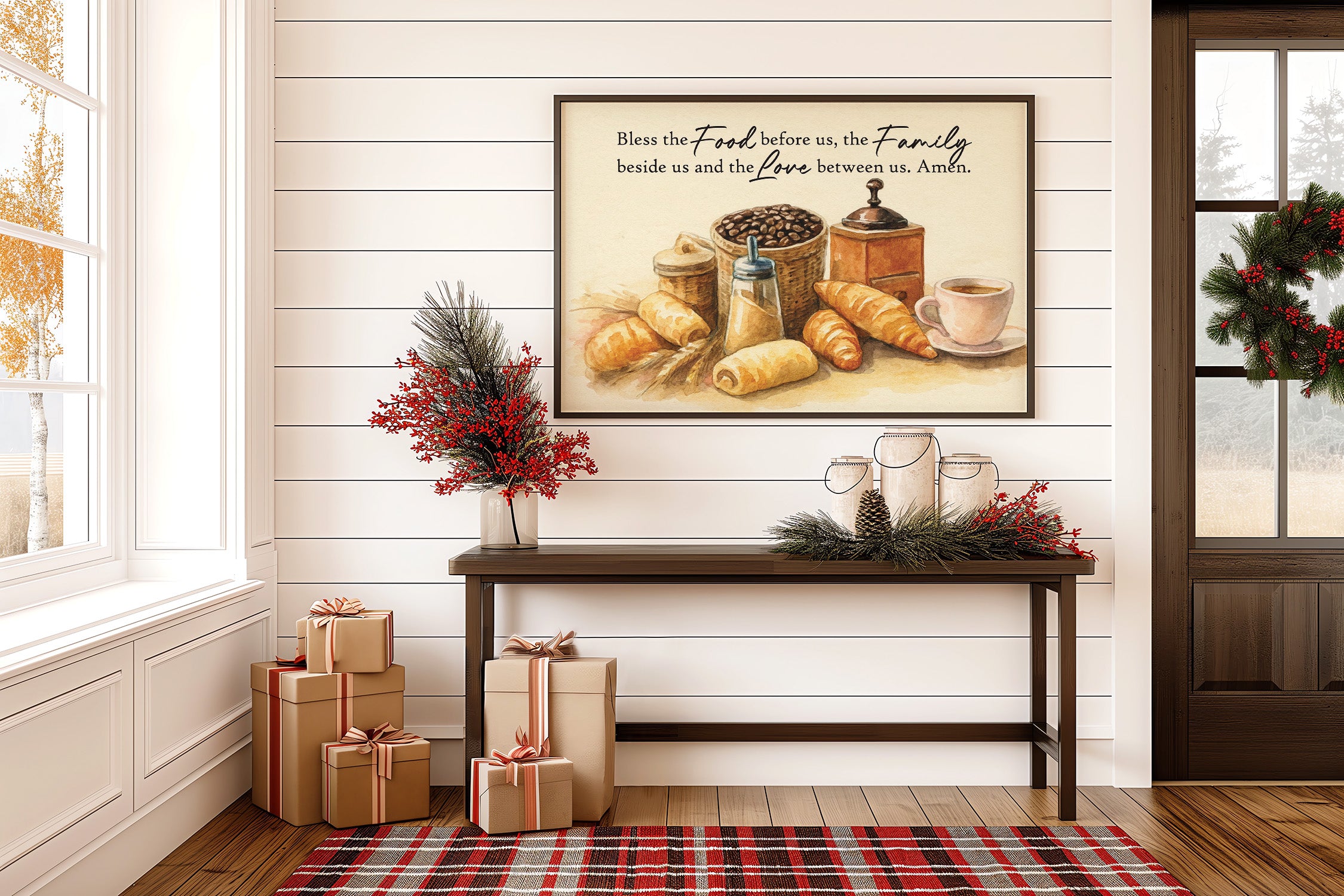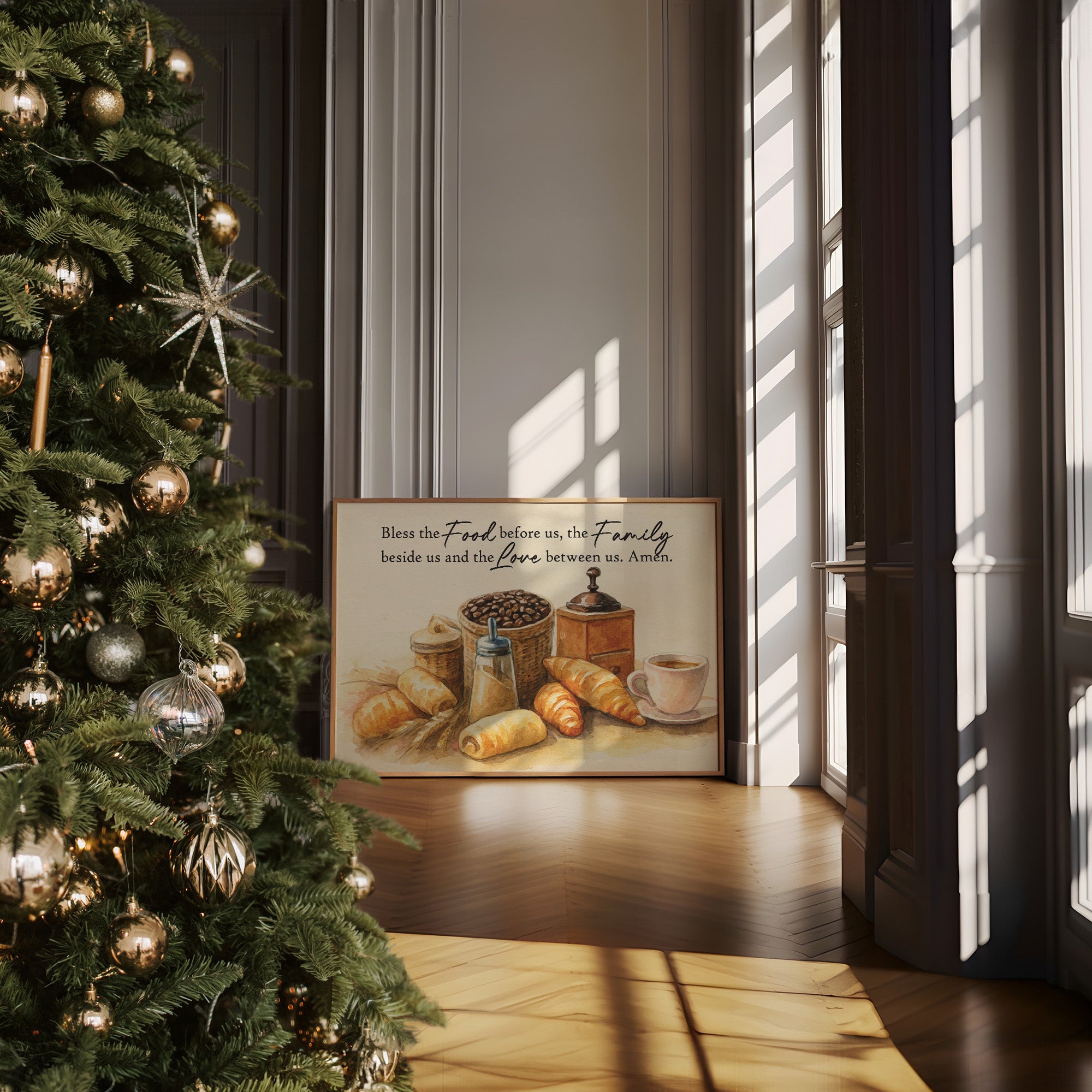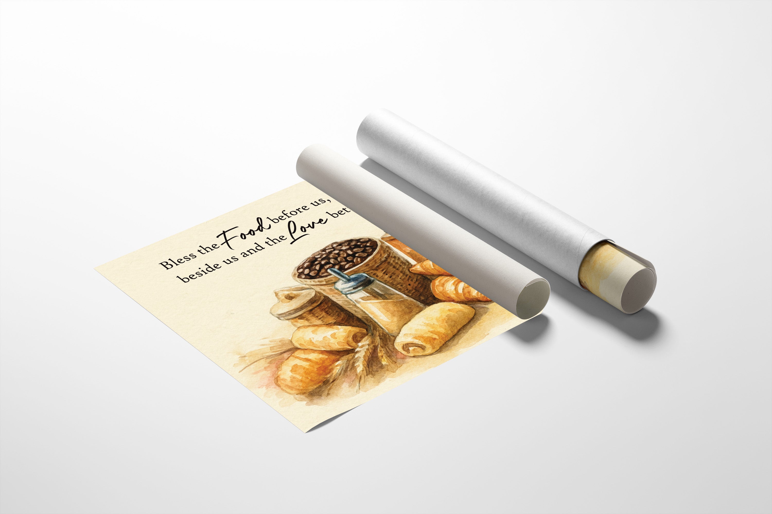 The gentle warmth of fresh-baked croissants mingles with the rich aroma of coffee in this heartfelt watercolor scene. Golden pastries rest beside a wooden coffee grinder and woven basket of beans, all rendered in soft amber and caramel tones that evoke the comfort of unhurried mornings. Above, a timeless blessing reminds us that nourishment extends beyond the physicalcelebrating connection, gratitude, and the sacred ritual of breaking bread together.