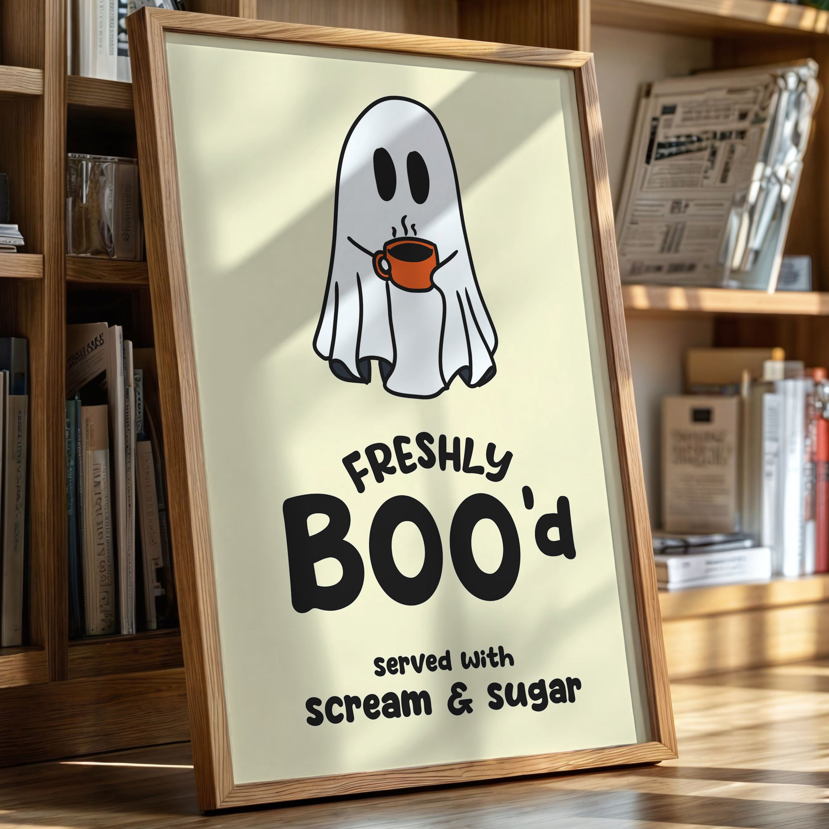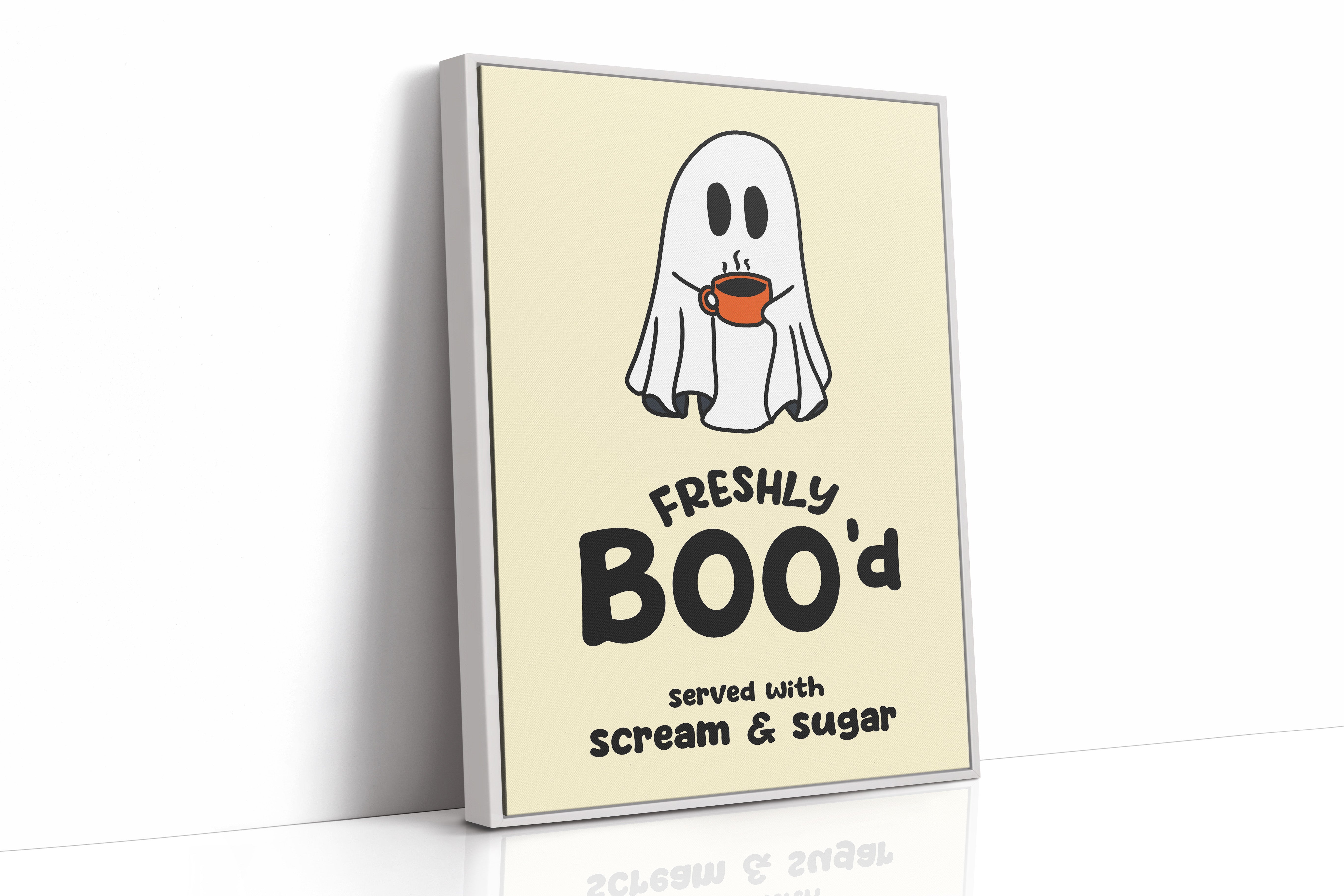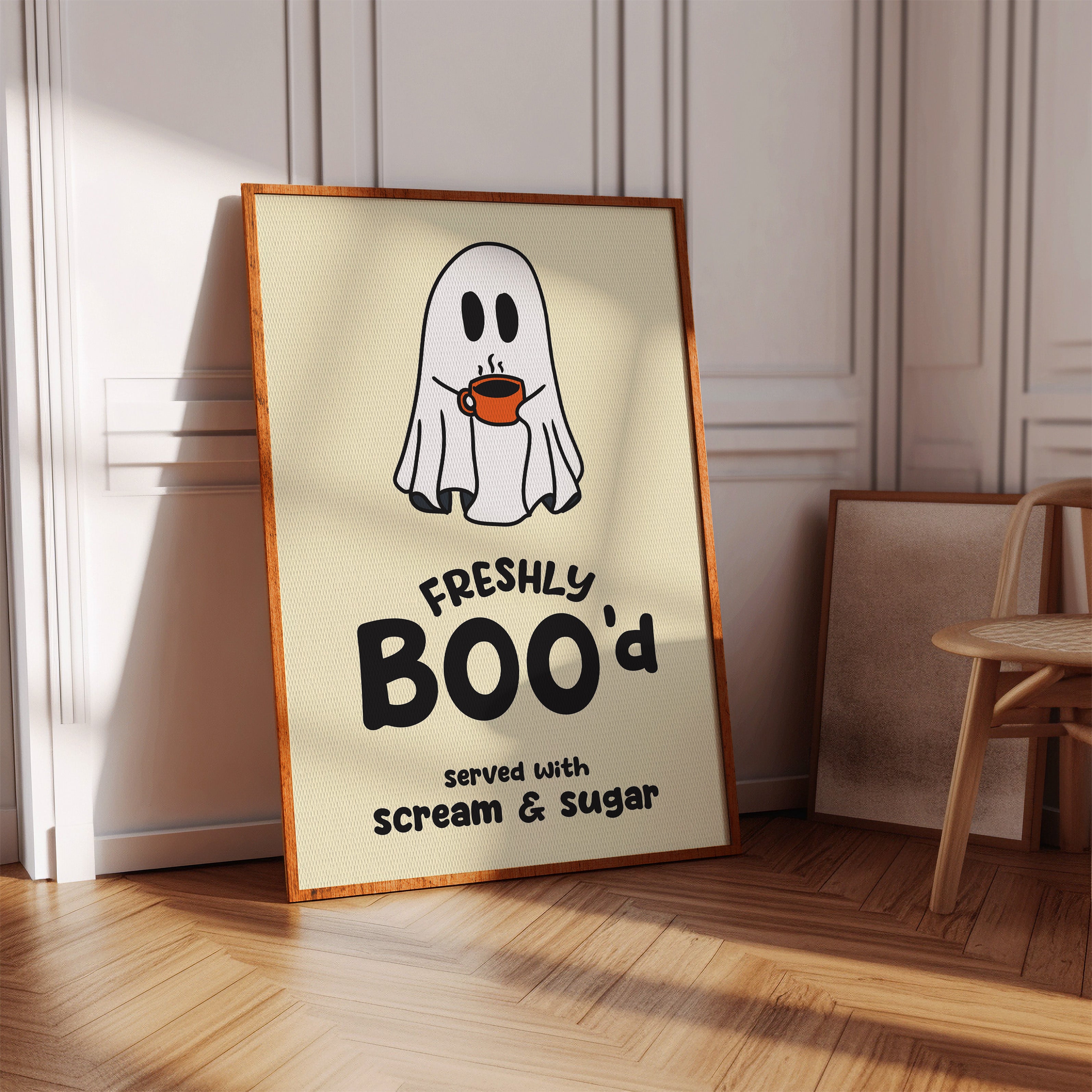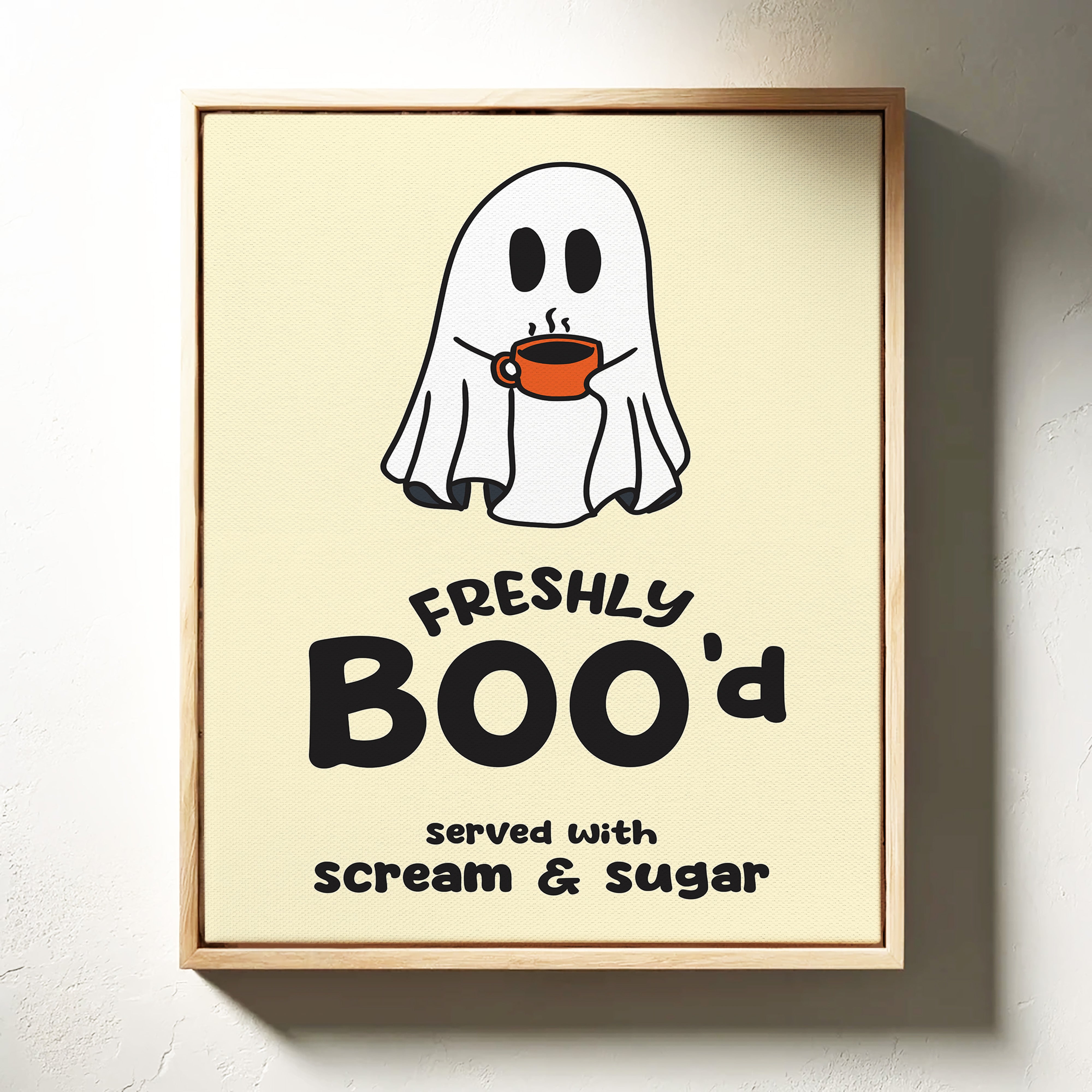 A charming ghost floats contentedly with their morning coffee, bringing an unexpected warmth to the supernatural world. This playful piece from our Contemporary collection pairs whimsical illustration with clever typography to create an irresistible character. Against a soft cream background, the stark white spirit and bold orange coffee cup create a delightful contrast, while the hand-drawn text adds a dash of modern personality. Perfect for adding a touch of lighthearted humor to a kitchen nook or coffee station. This piece invites smiles and conversation, making everyday moments just a little more magical.