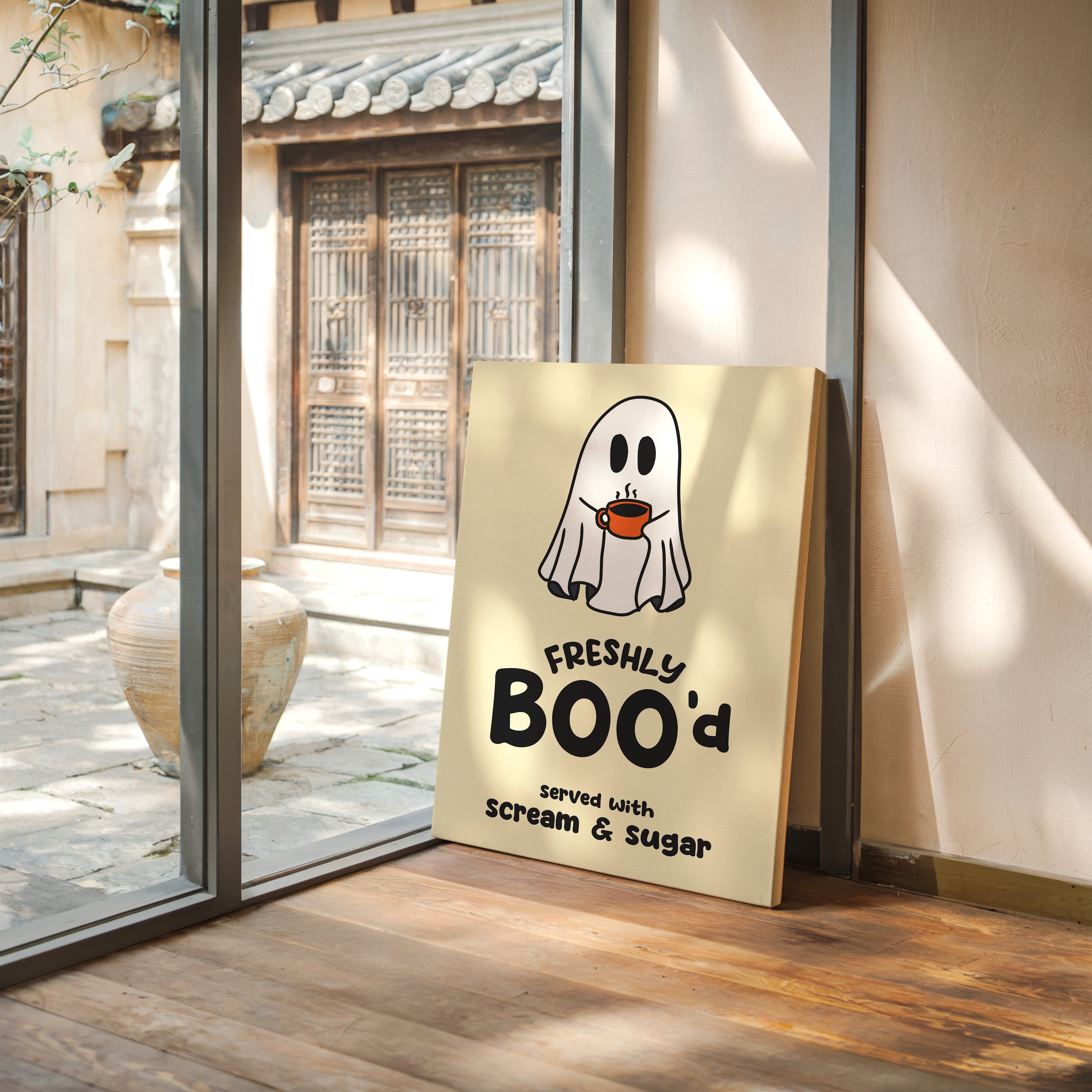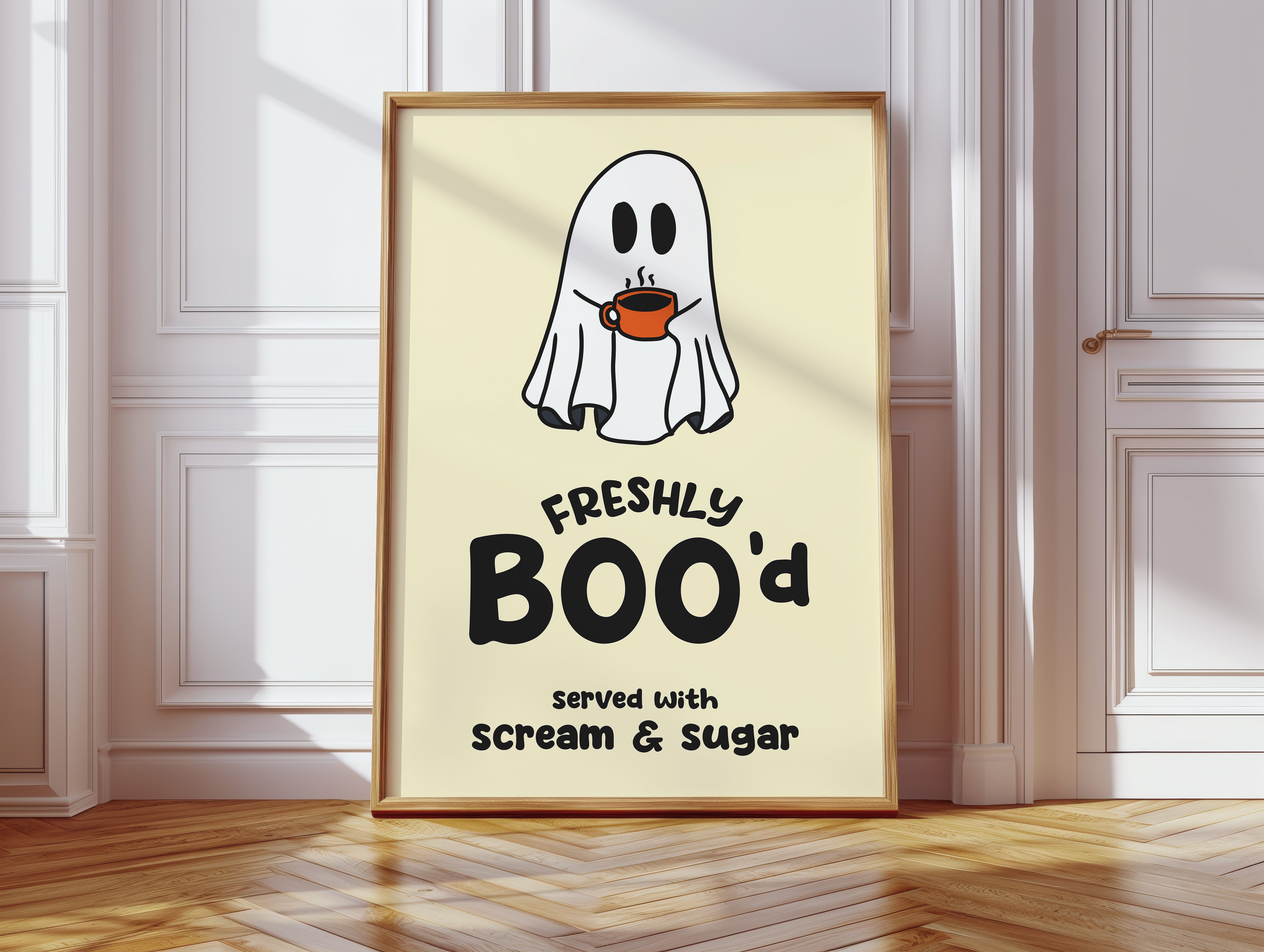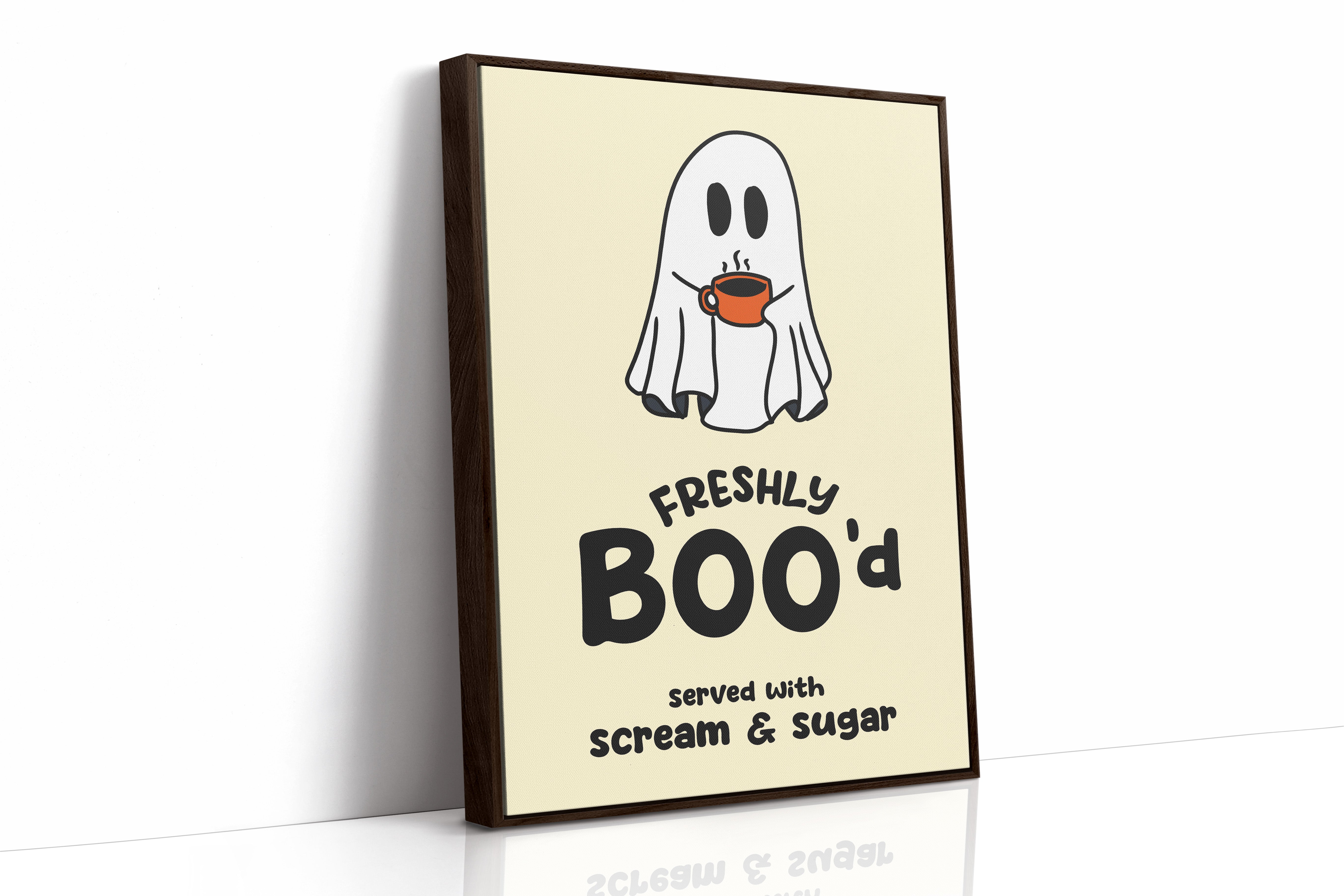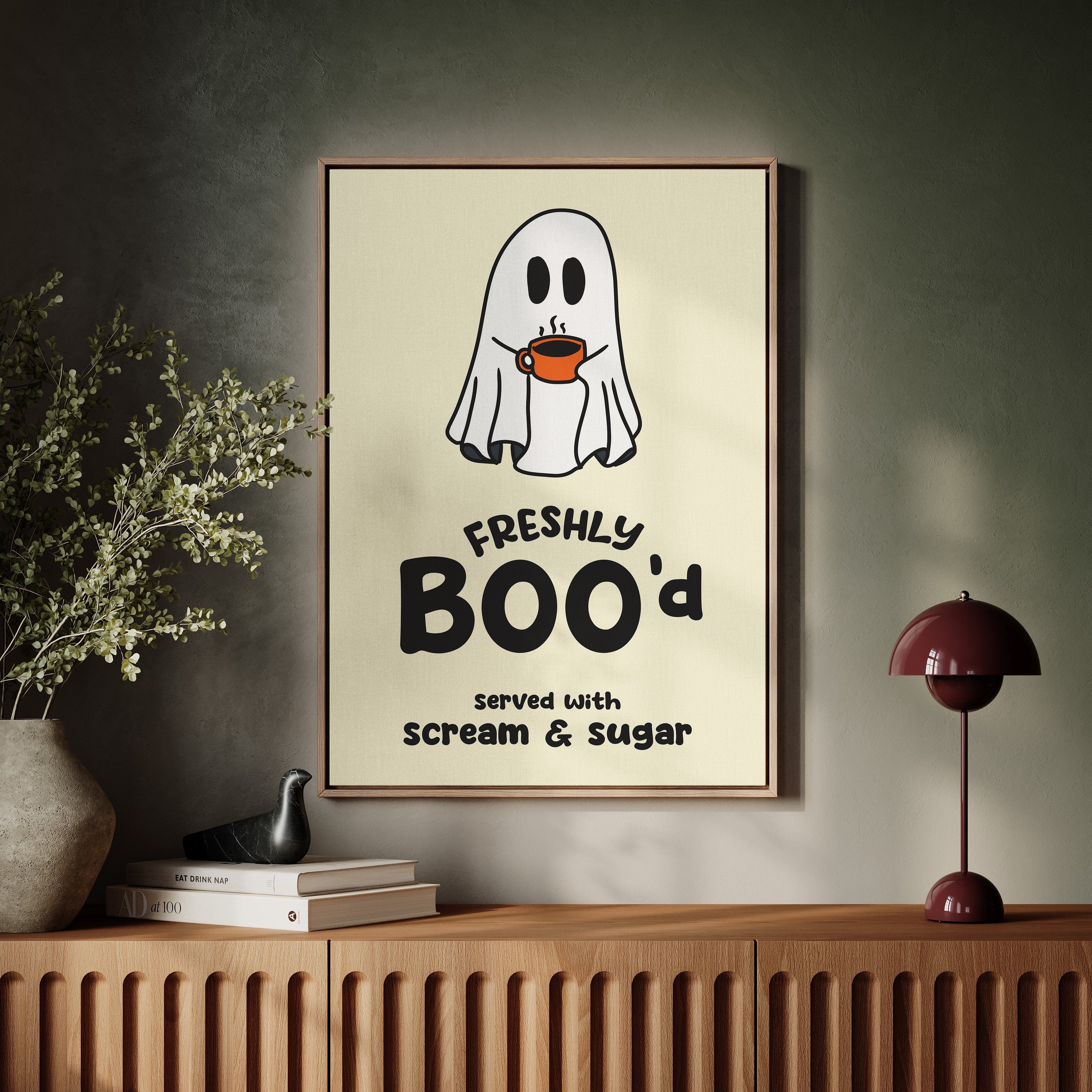 A charming ghost floats contentedly with their morning coffee, bringing an unexpected warmth to the supernatural world. This playful piece from our Contemporary collection pairs whimsical illustration with clever typography to create an irresistible character. Against a soft cream background, the stark white spirit and bold orange coffee cup create a delightful contrast, while the hand-drawn text adds a dash of modern personality. Perfect for adding a touch of lighthearted humor to a kitchen nook or coffee station. This piece invites smiles and conversation, making everyday moments just a little more magical.