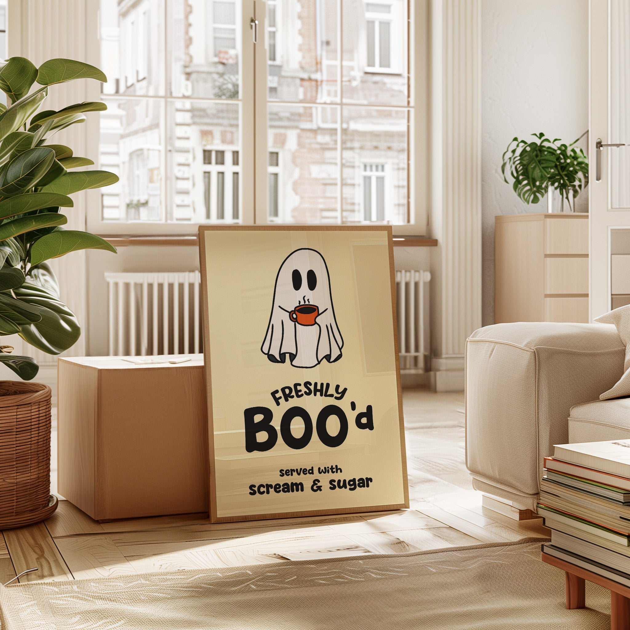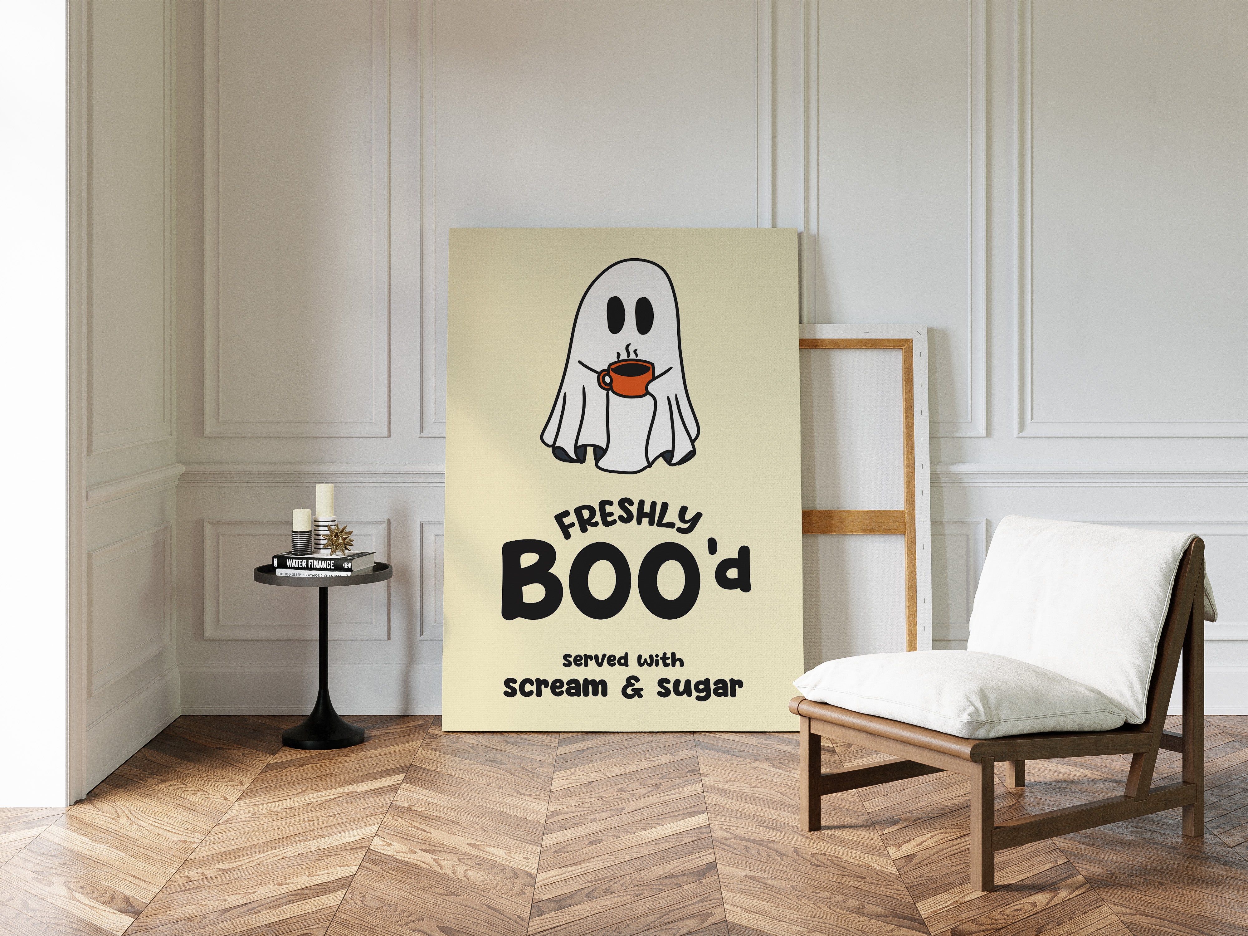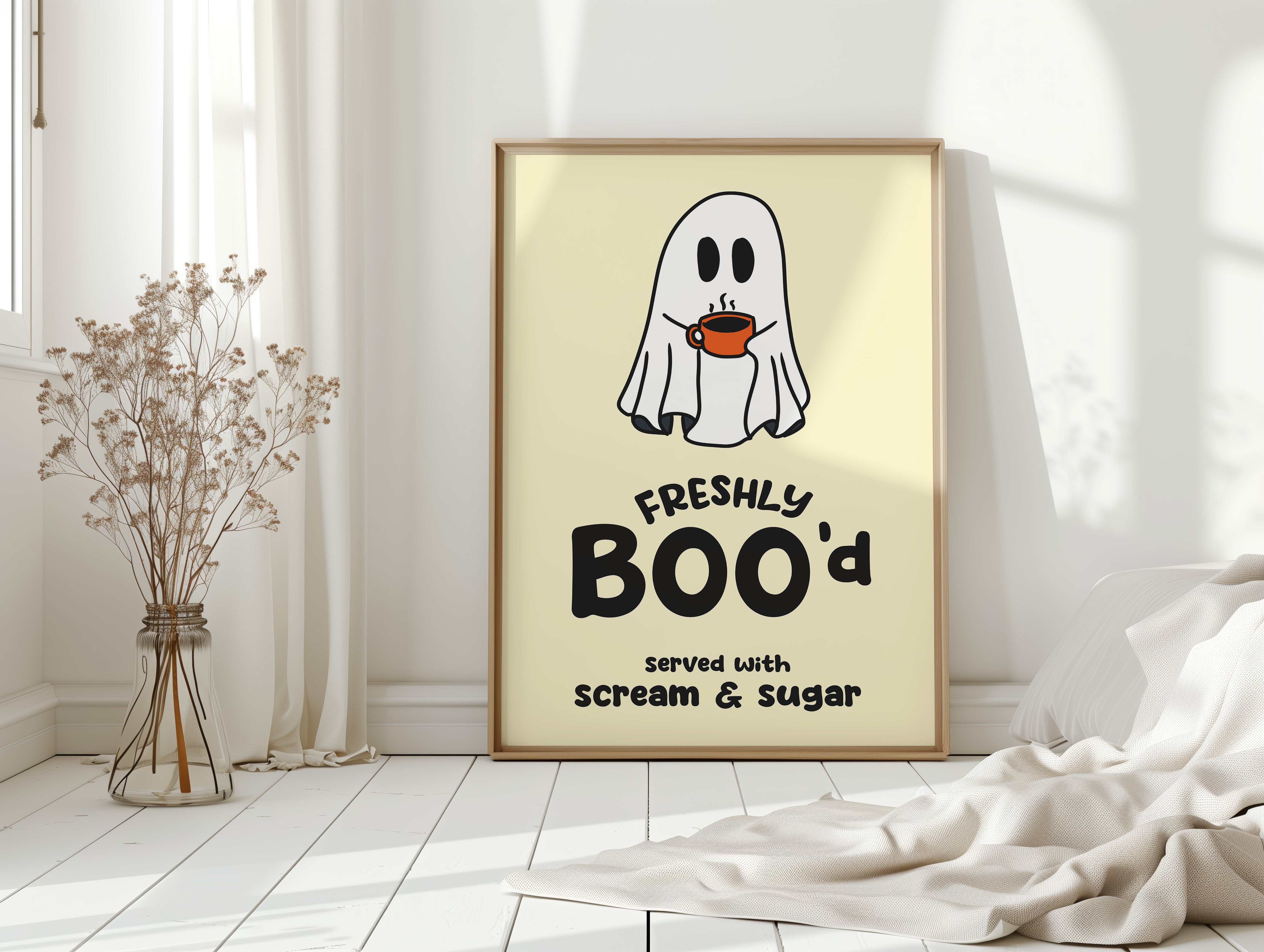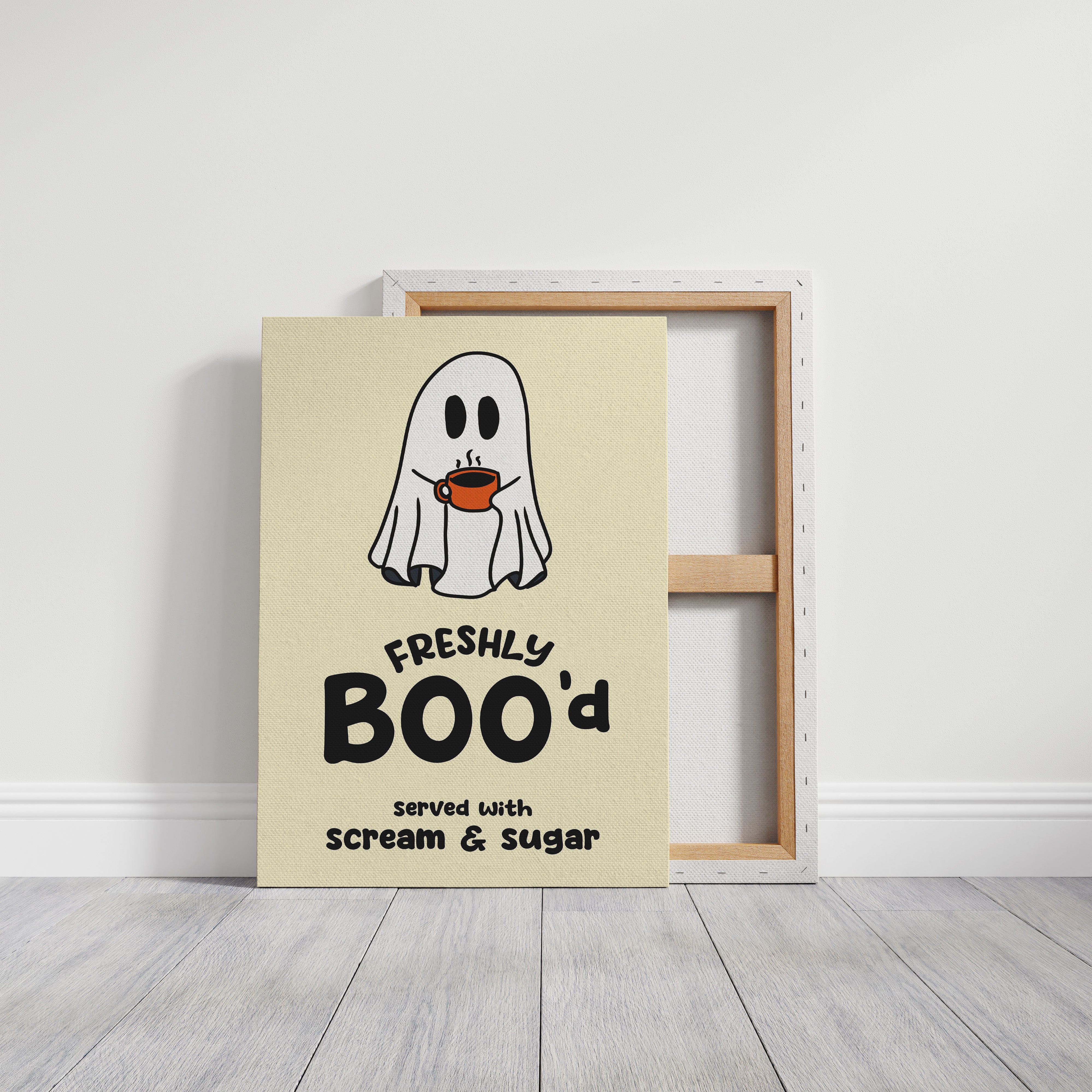 A charming ghost floats contentedly with their morning coffee, bringing an unexpected warmth to the supernatural world. This playful piece from our Contemporary collection pairs whimsical illustration with clever typography to create an irresistible character. Against a soft cream background, the stark white spirit and bold orange coffee cup create a delightful contrast, while the hand-drawn text adds a dash of modern personality. Perfect for adding a touch of lighthearted humor to a kitchen nook or coffee station. This piece invites smiles and conversation, making everyday moments just a little more magical.