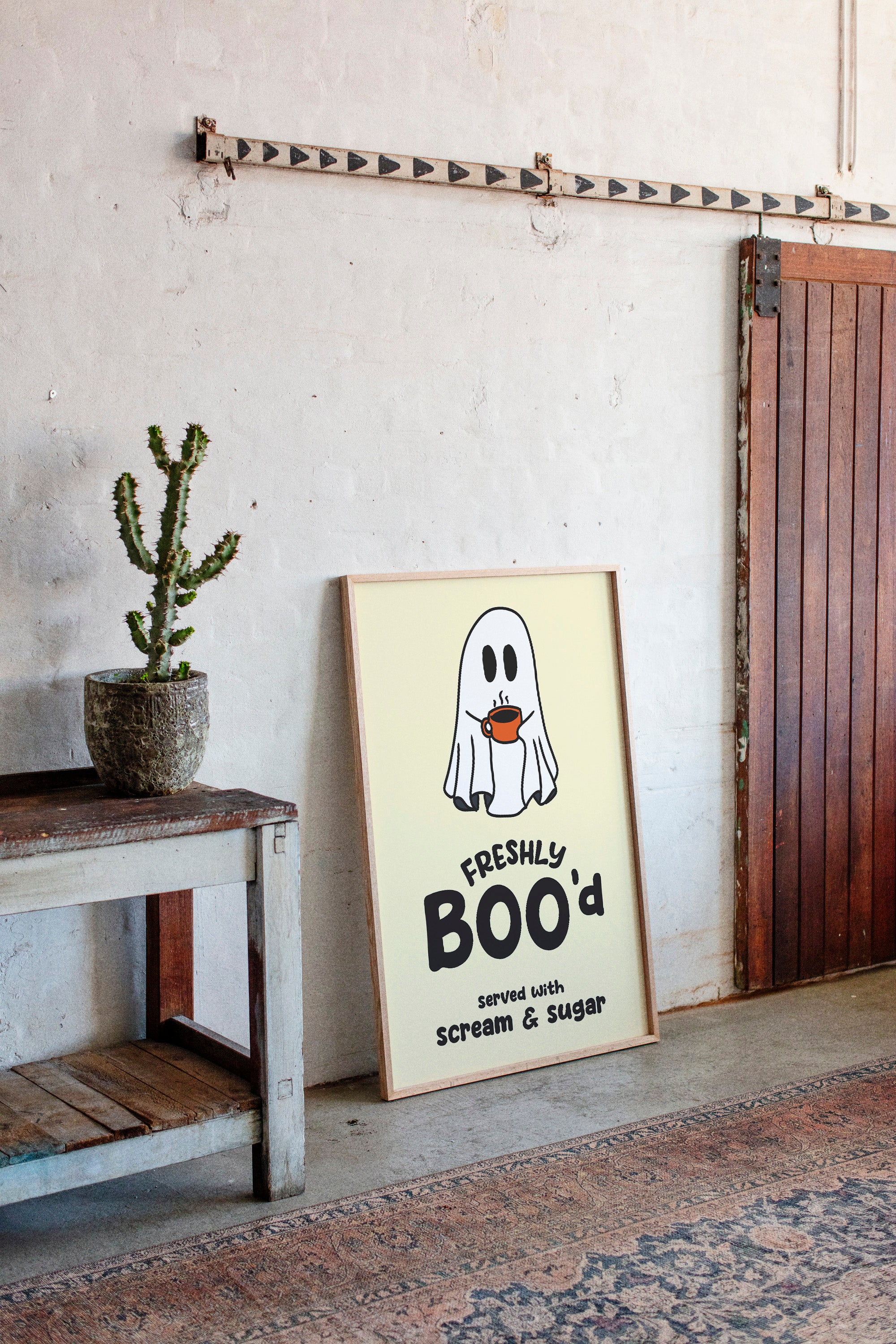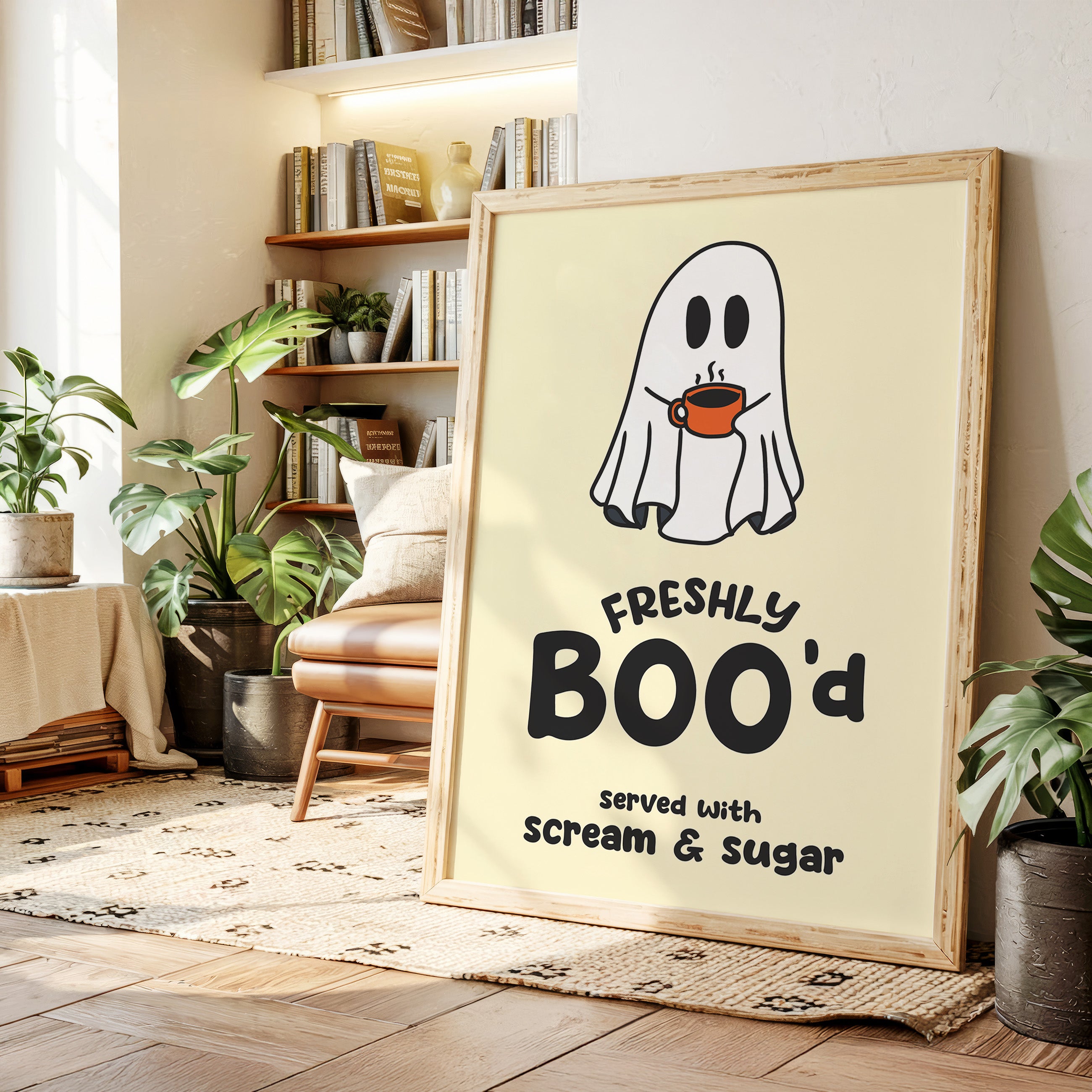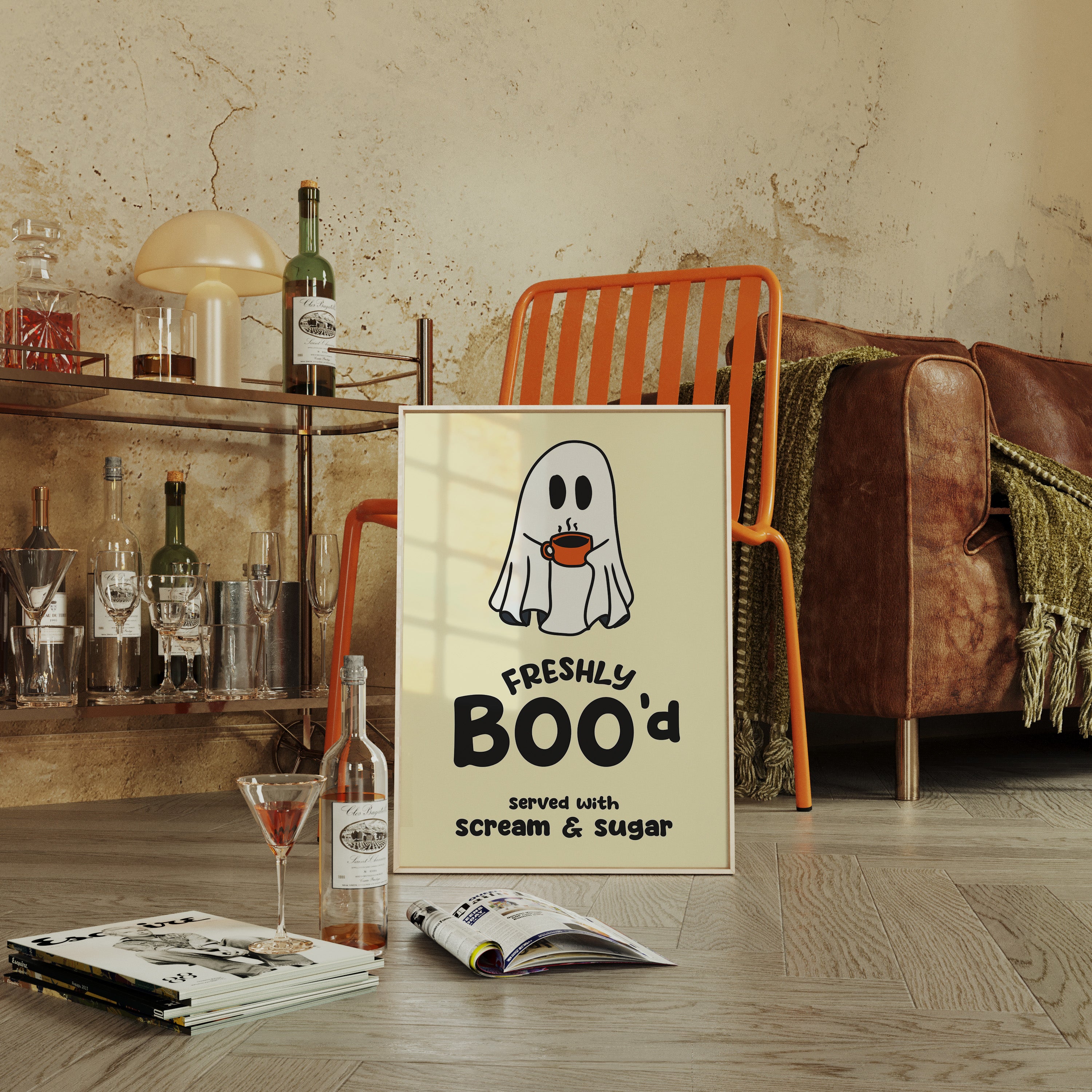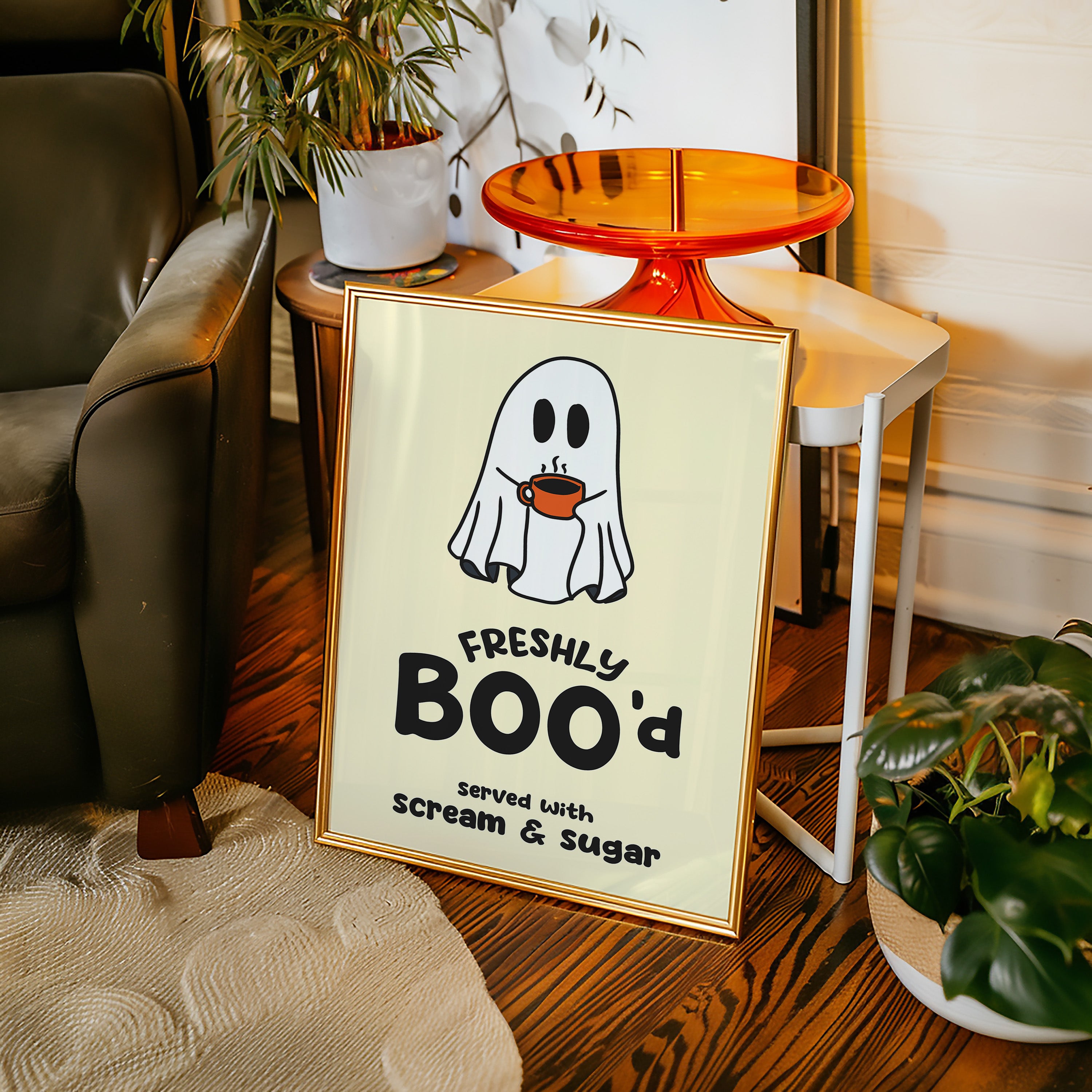 A charming ghost floats contentedly with their morning coffee, bringing an unexpected warmth to the supernatural world. This playful piece from our Contemporary collection pairs whimsical illustration with clever typography to create an irresistible character. Against a soft cream background, the stark white spirit and bold orange coffee cup create a delightful contrast, while the hand-drawn text adds a dash of modern personality. Perfect for adding a touch of lighthearted humor to a kitchen nook or coffee station. This piece invites smiles and conversation, making everyday moments just a little more magical.