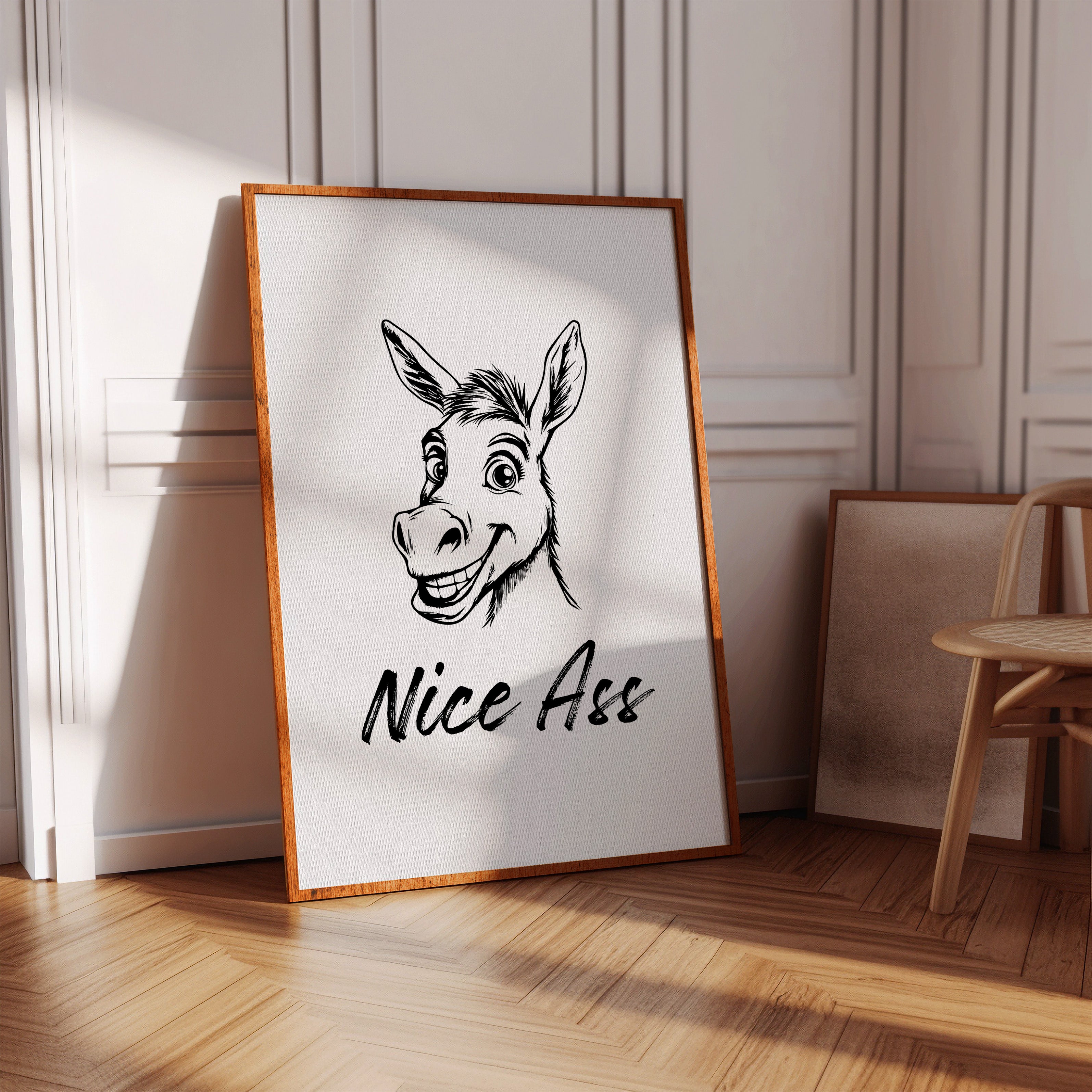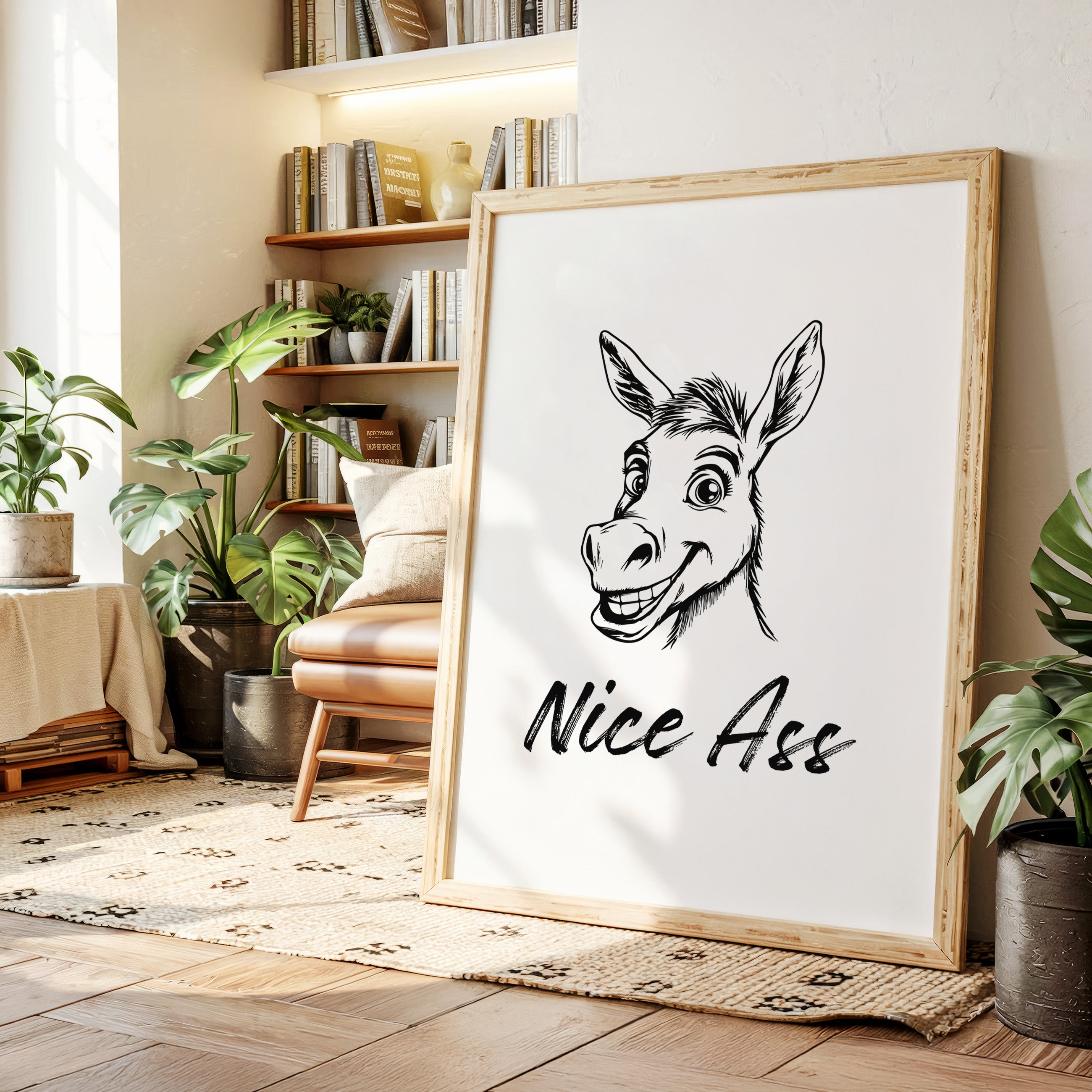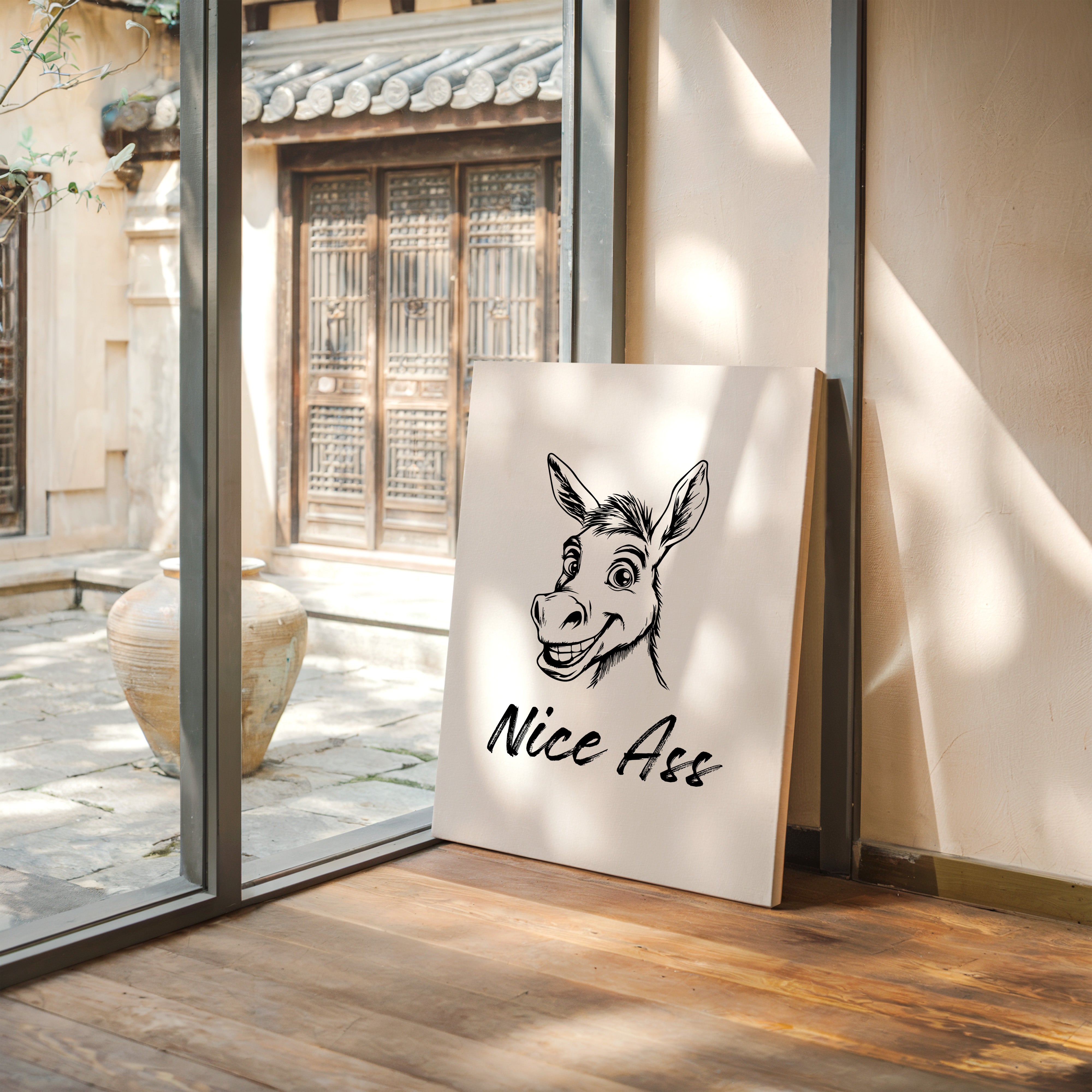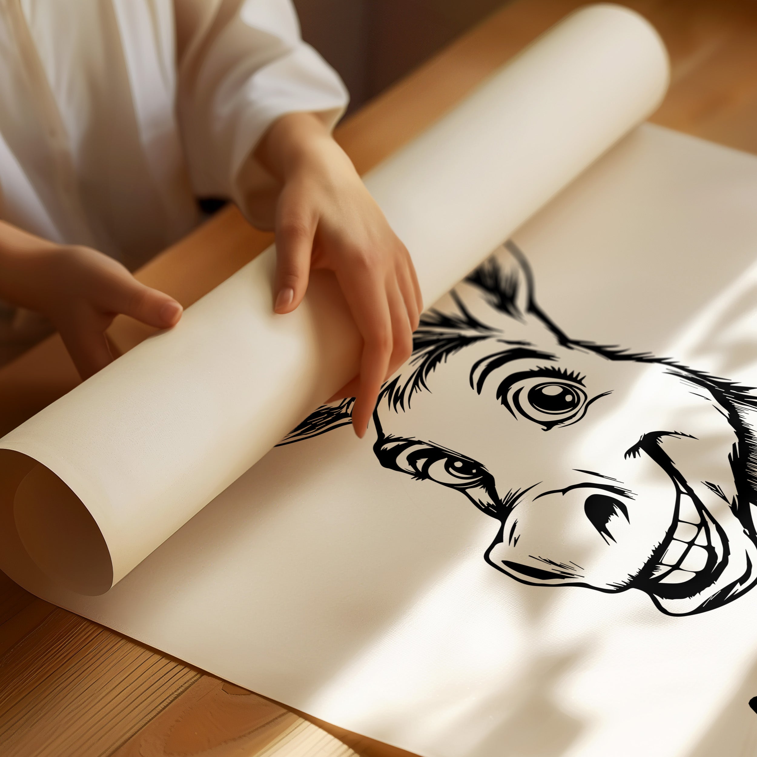 A playful smirk dances across the donkey's face, capturing that perfect moment of pure, unfiltered joy. This contemporary illustration brings a fresh twist to classic farmyard charm with bold, minimalist strokes. The expressive eyes and cheeky grin tell a story of mischief and merriment, while confident brush strokes create a striking balance of personality and artistic restraint. The piece radiates warmth and character, making it an ideal addition to a modern kitchen or cheerful breakfast nook. Its simple yet impactful design brings a dash of whimsy to any space, inviting smiles and conversation.