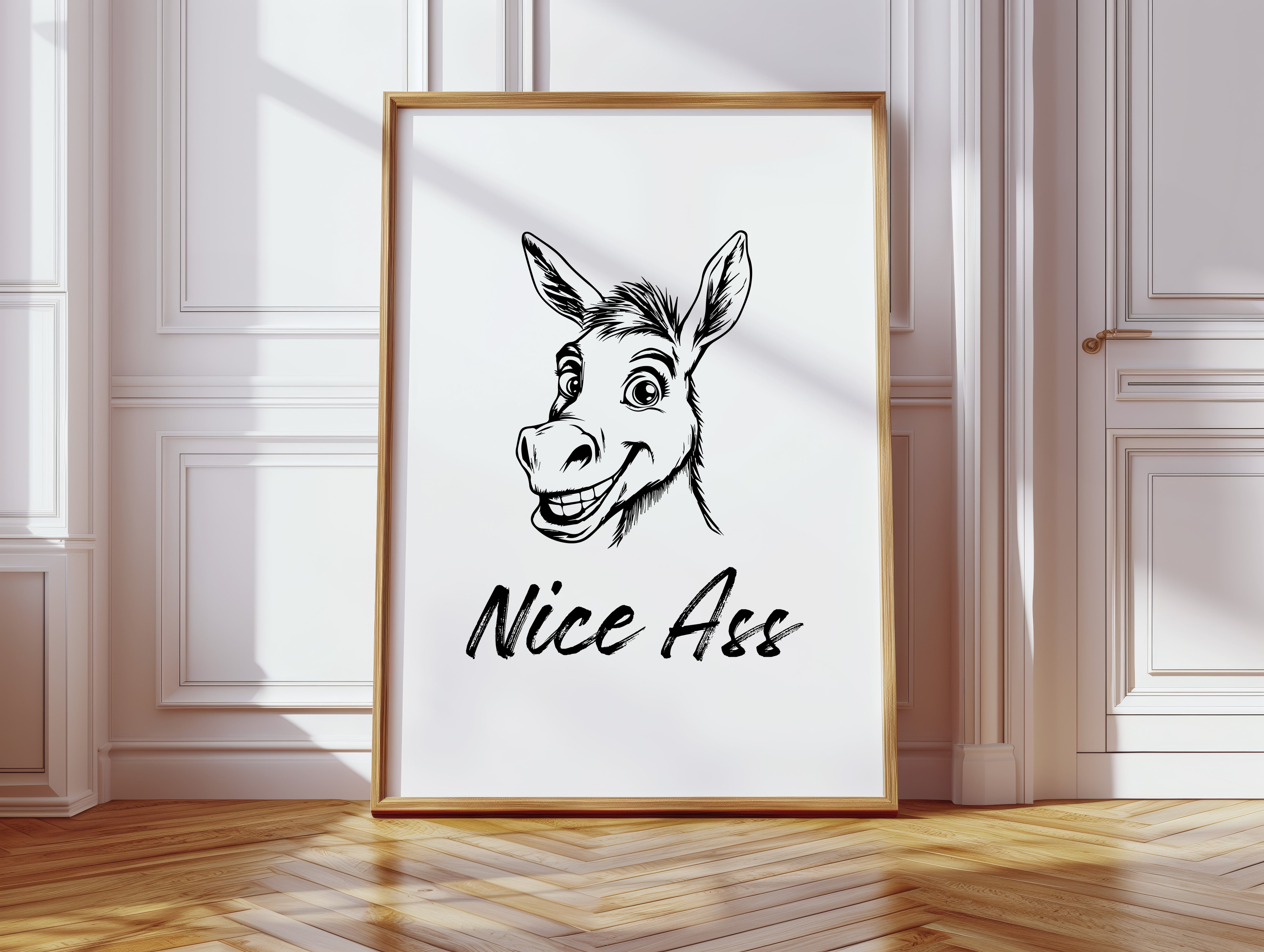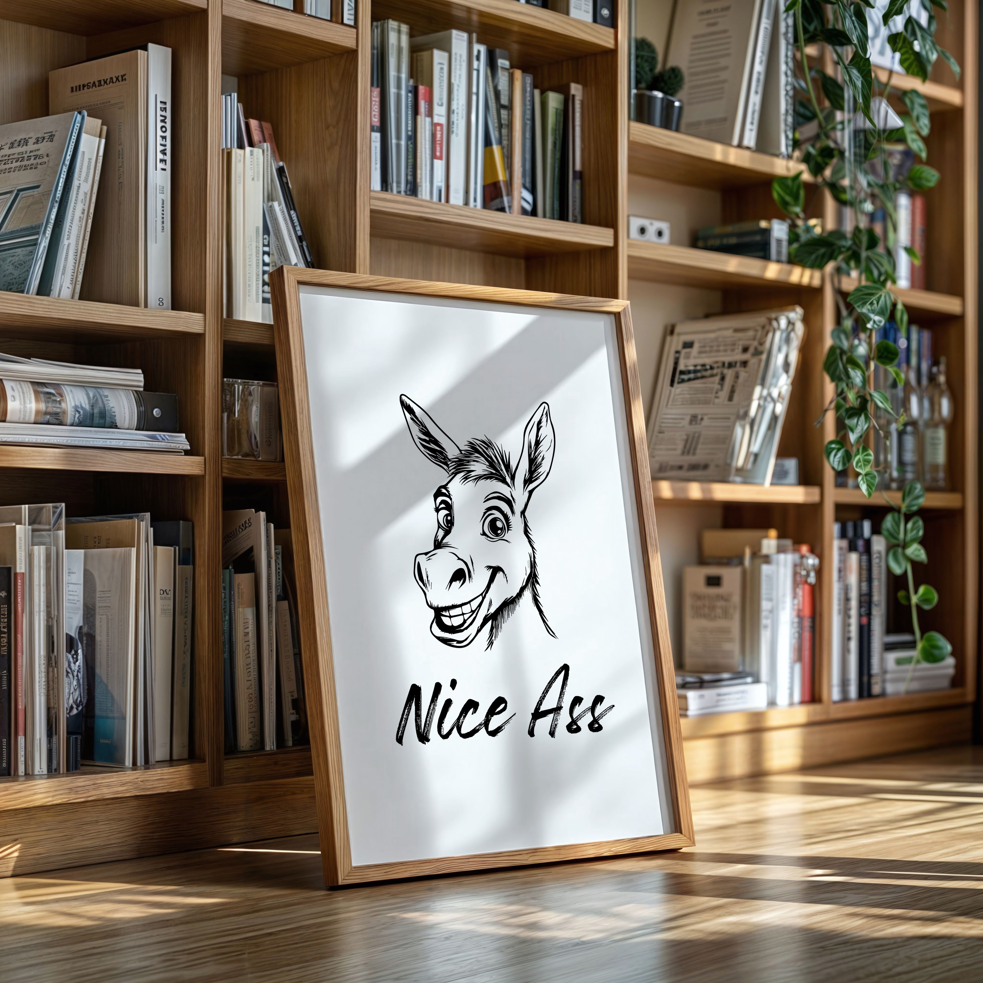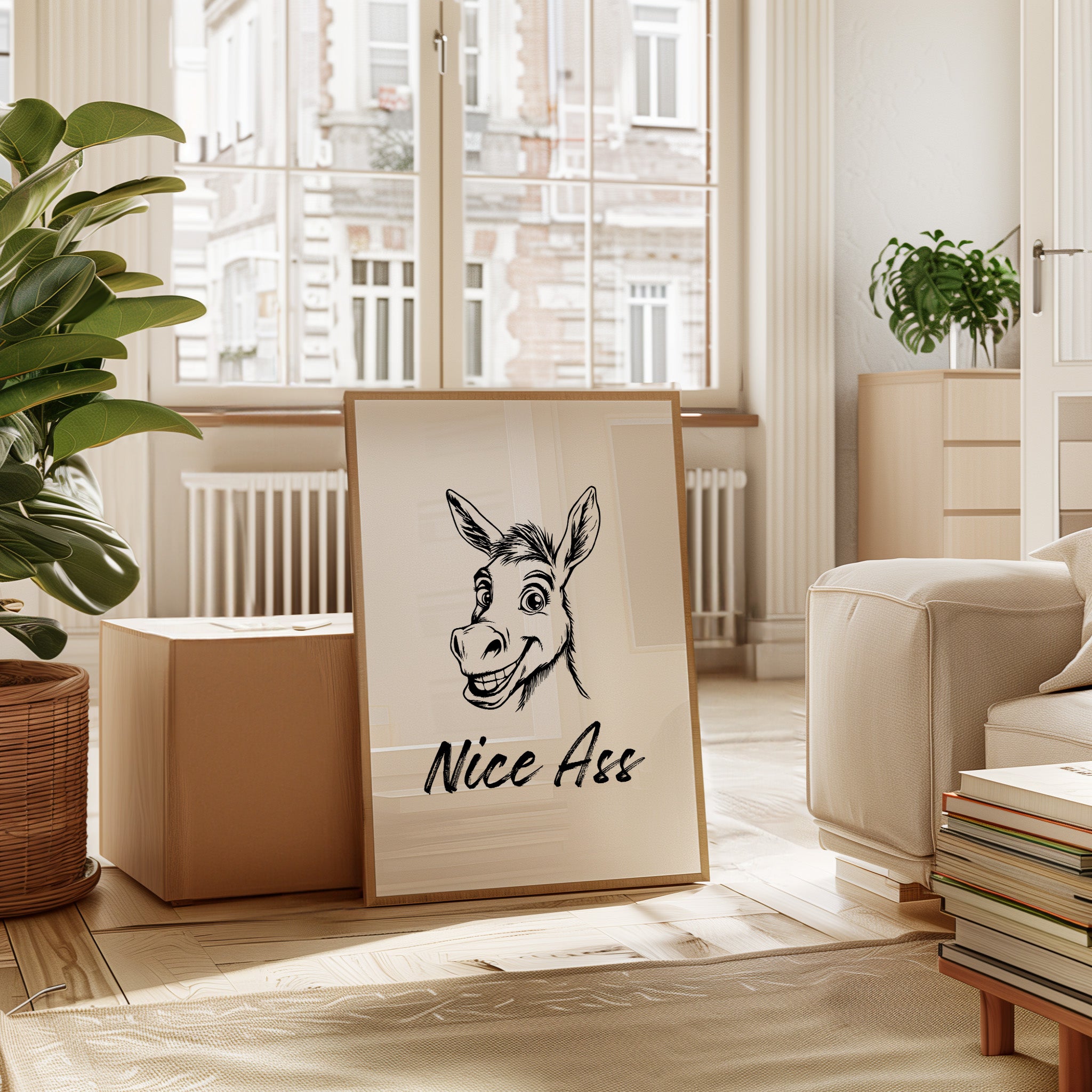 A playful smirk dances across the donkey's face, capturing that perfect moment of pure, unfiltered joy. This contemporary illustration brings a fresh twist to classic farmyard charm with bold, minimalist strokes. The expressive eyes and cheeky grin tell a story of mischief and merriment, while confident brush strokes create a striking balance of personality and artistic restraint. The piece radiates warmth and character, making it an ideal addition to a modern kitchen or cheerful breakfast nook. Its simple yet impactful design brings a dash of whimsy to any space, inviting smiles and conversation.
