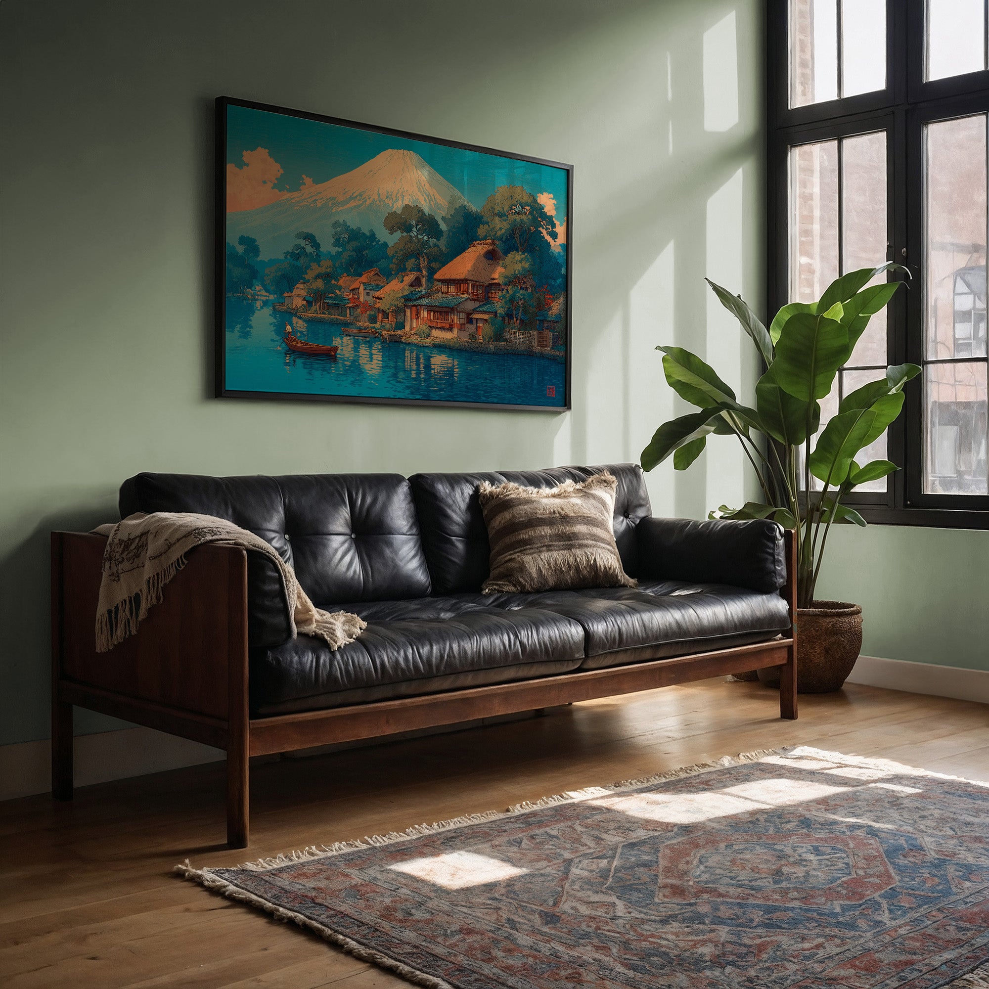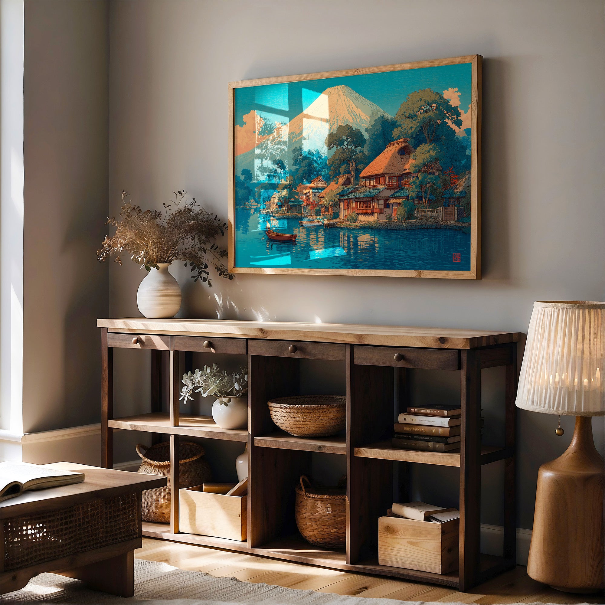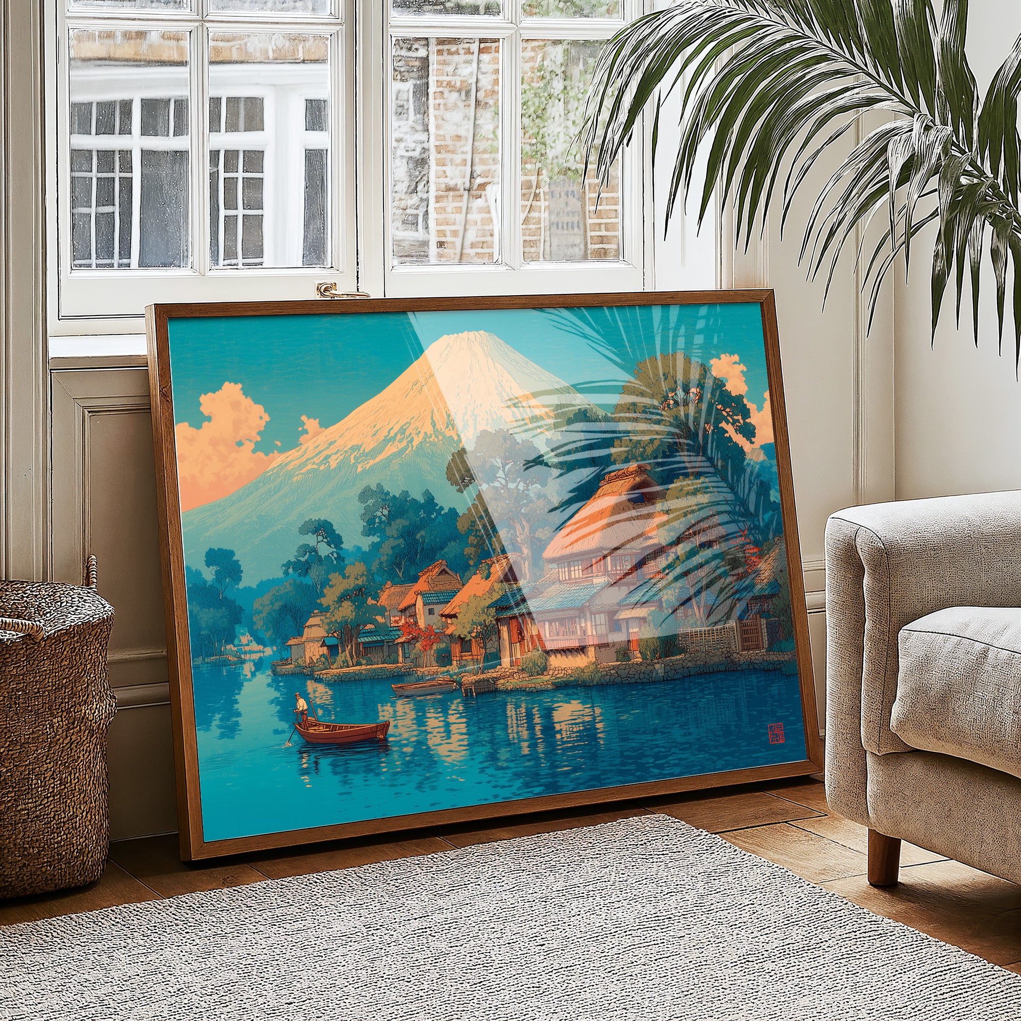 Tranquil waters mirror a serene Japanese village nestled beneath the majestic Mount Fuji, as coral-tinted clouds dance across a turquoise sky. Traditional wooden houses line the shoreline, their warm orange tones complementing the peaceful blue waters, while a solitary boat glides through the crystalline lake. The scene captures the perfect harmony between human settlement and nature's grandeur, painted in a style that honors classic Japanese landscape artistry. This striking piece would create a captivating focal point in a modern living room or bring serene energy to a home office space, especially when paired with natural materials and clean lines.