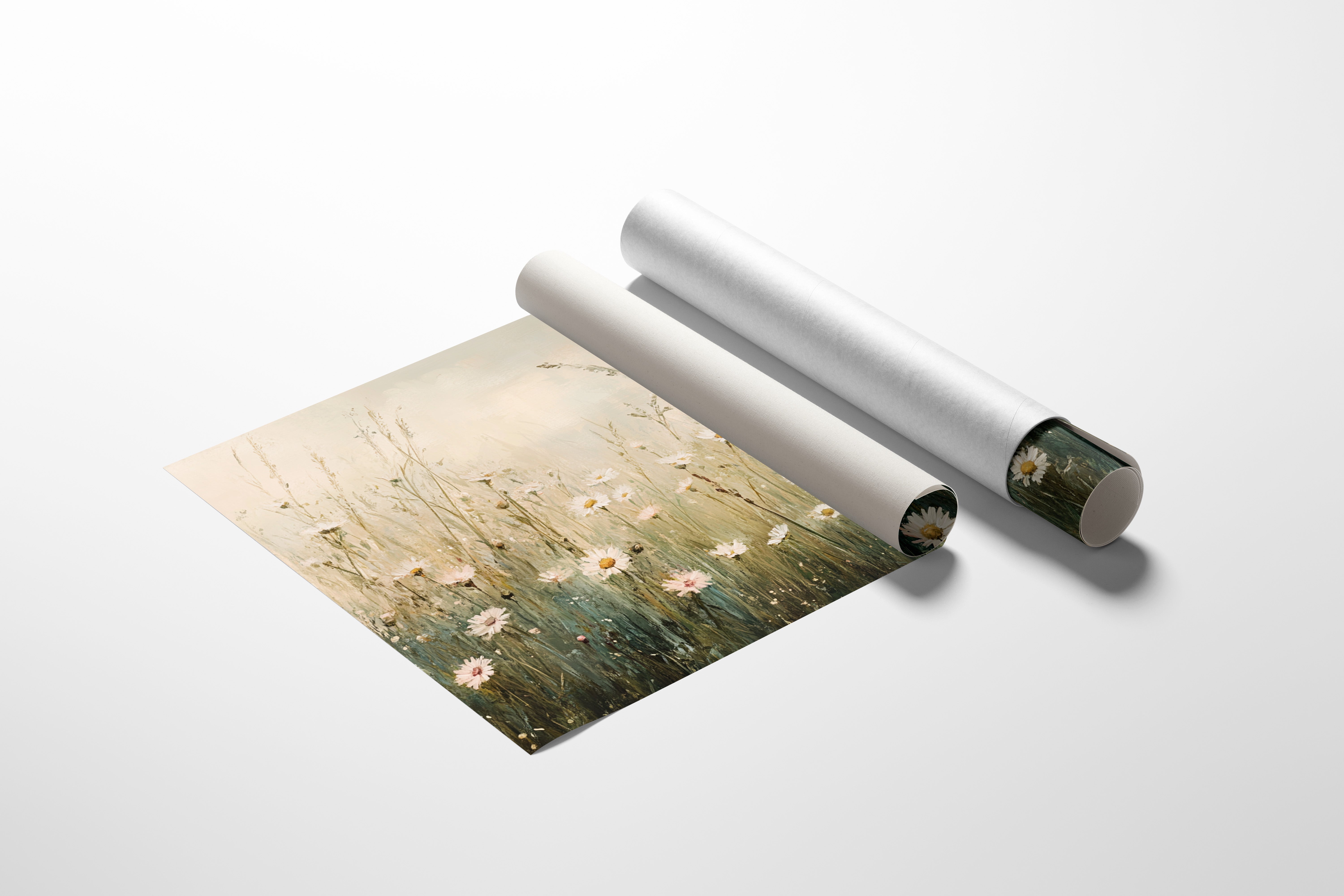 Delicate daisies sway in a gentle breeze, their white petals catching the soft morning light like scattered pieces of dawn. The meadow comes alive with a symphony of textures - tall grass stems in sage green weave between the blooms, creating an ethereal dance of nature. Golden centers of the daisies punctuate the misty palette of creams and greens, while subtle brushstrokes capture the essence of wildflower freedom and untamed beauty. This piece brings the serenity of a summer meadow indoors, perfect for creating a peaceful sanctuary in a bedroom or adding natural charm to a reading nook.