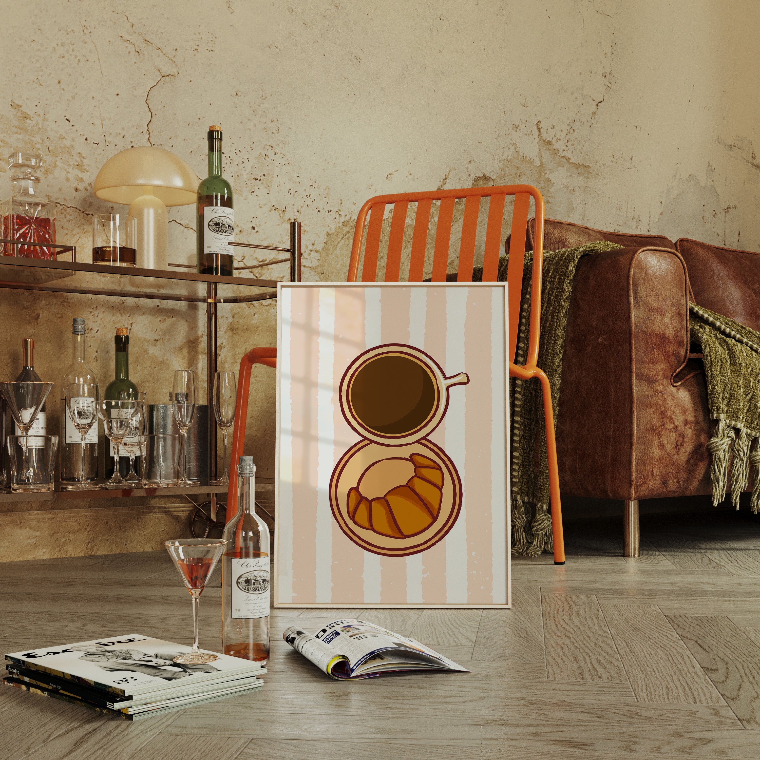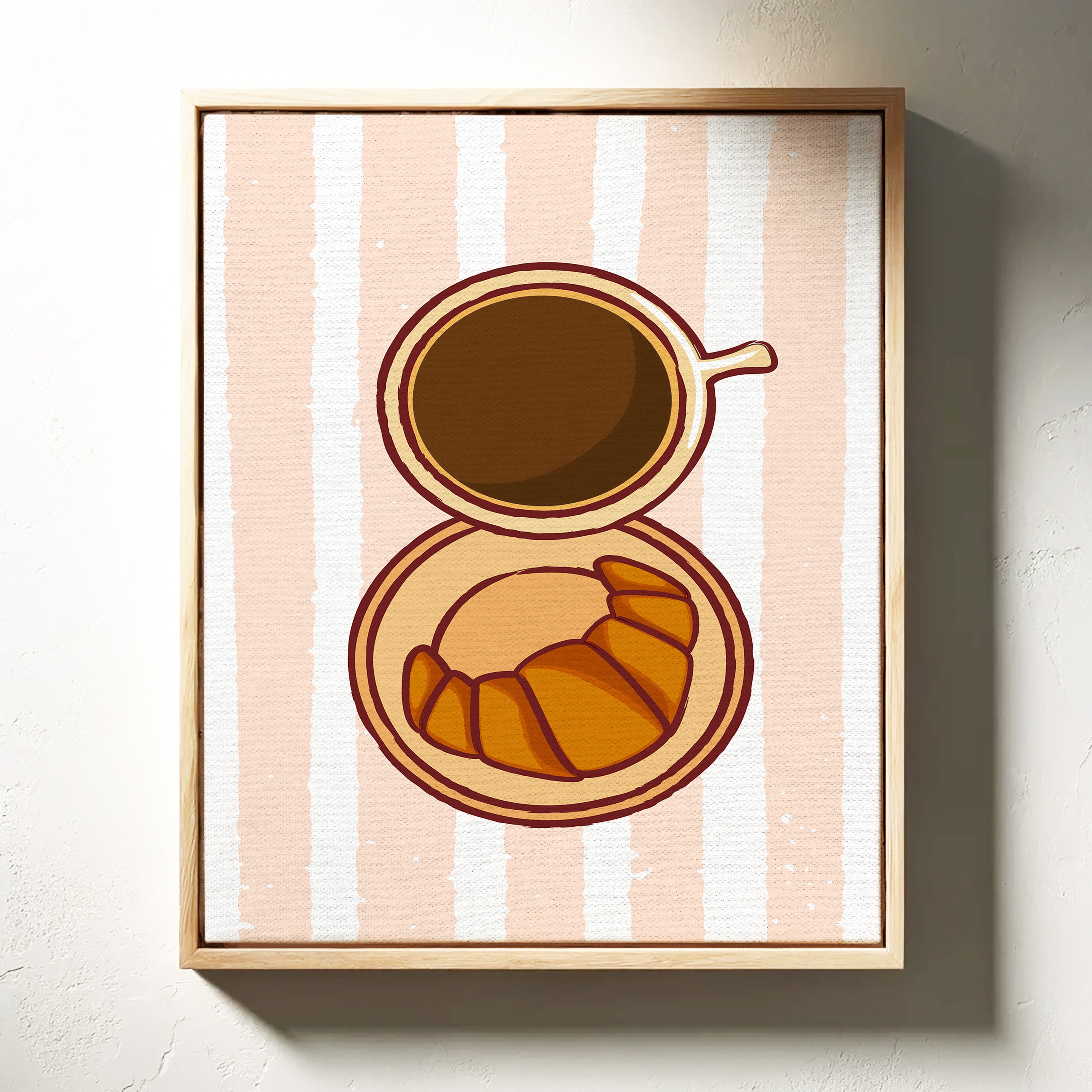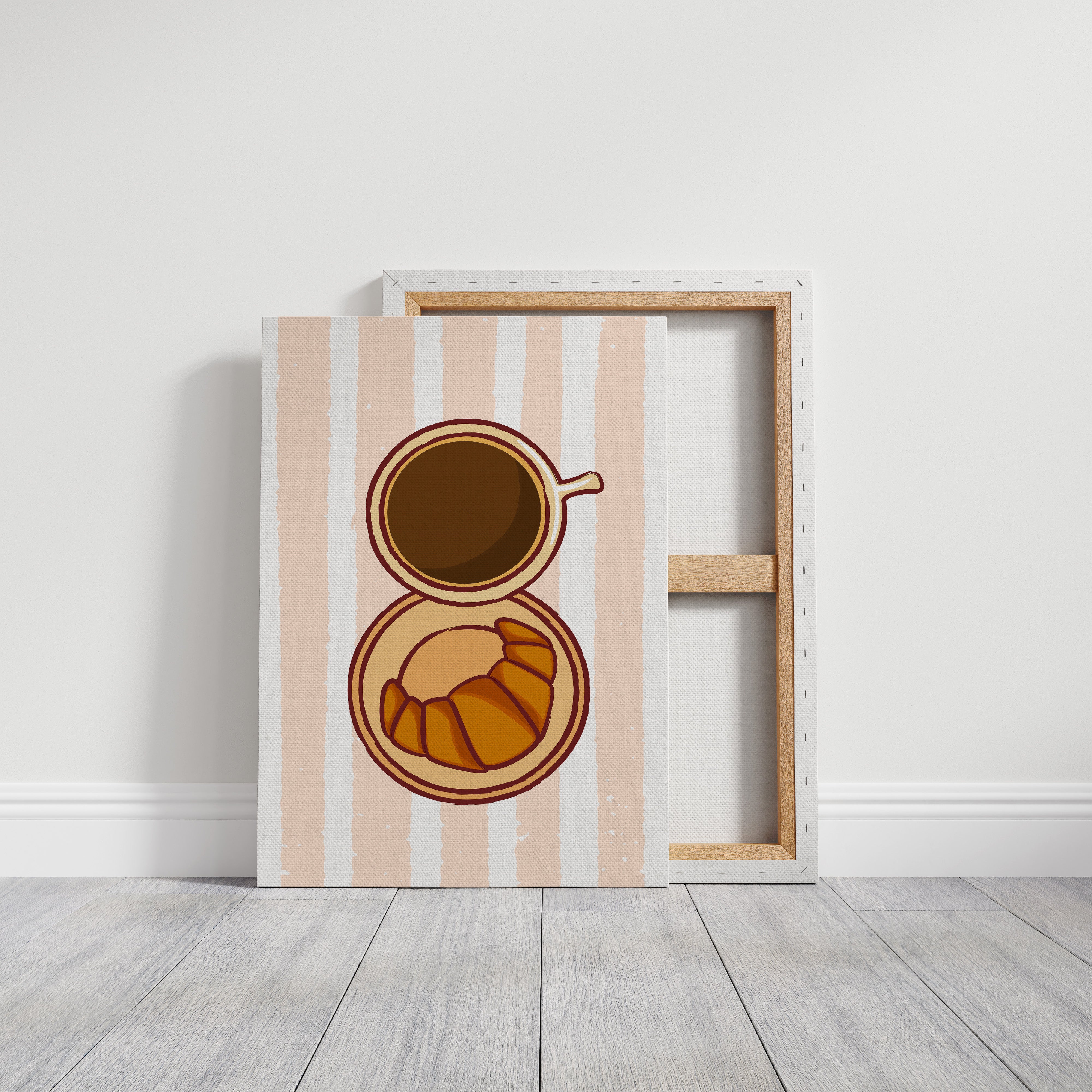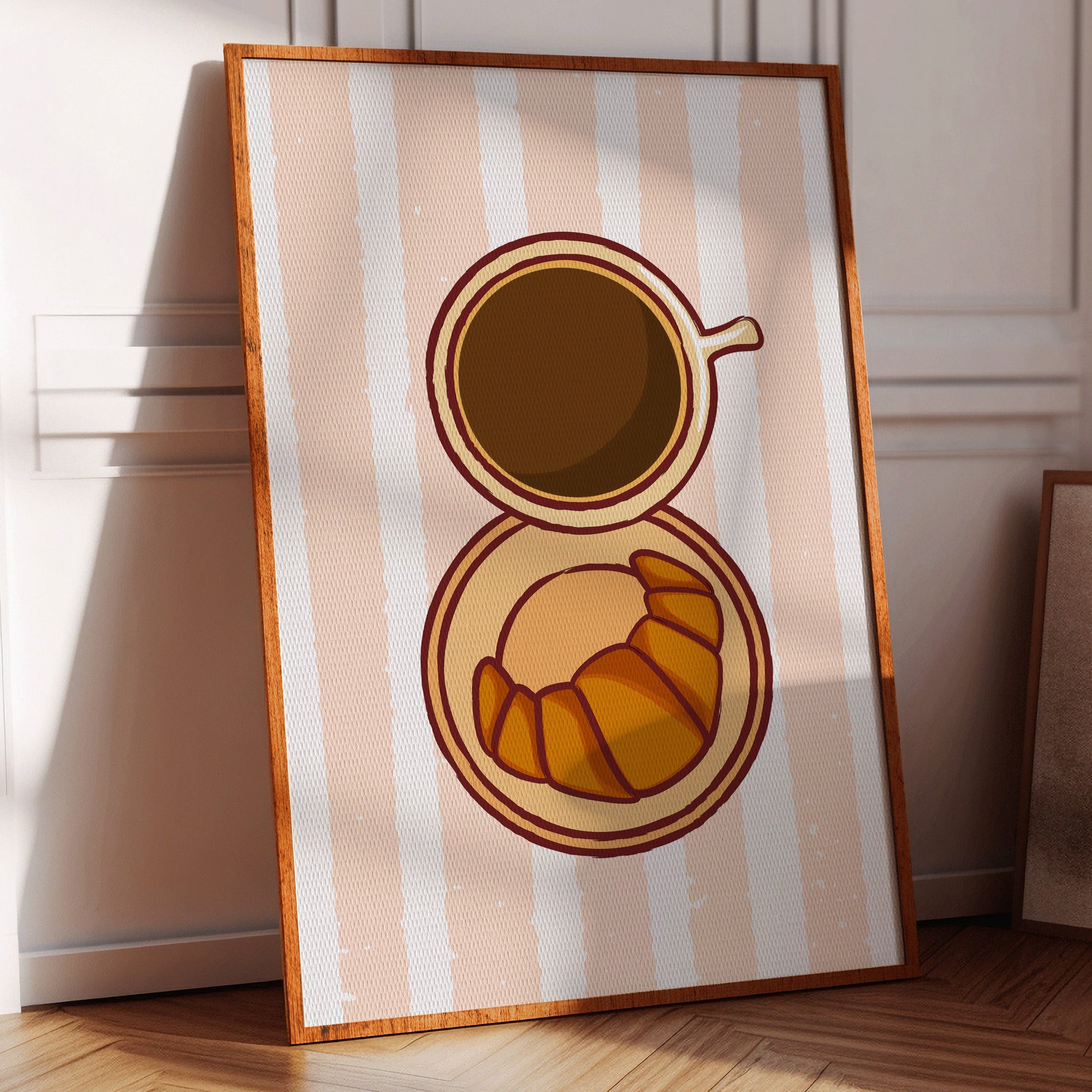 Steam rises gently from a perfectly brewed coffee, paired with a golden croissant on simple ceramic plates against soft striped warmth. A signature piece from our Contemporary collection that celebrates life's quiet morning rituals. The minimalist composition in warm browns and peachy pinks creates an inviting scene, where the buttery layers of the pastry seem to catch the early light. Every curve and shadow speaks to the comfort of familiar routines and anticipated pleasures. This piece brings a touch of Parisian cafe culture to any kitchen or dining space, perfect for creating a cozy breakfast nook or adding character to a coffee station. Each viewing invites you to slow down and savor the moment.