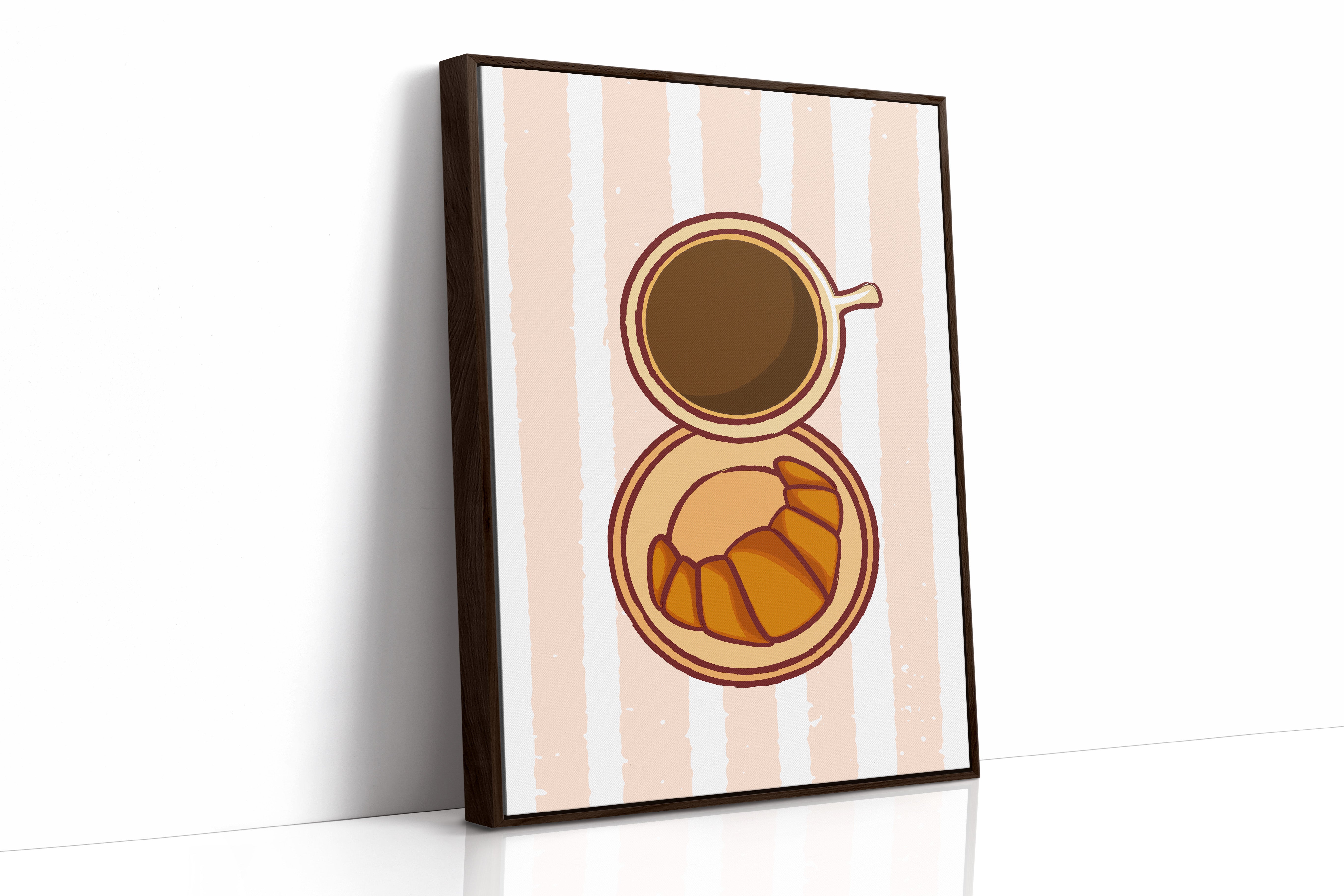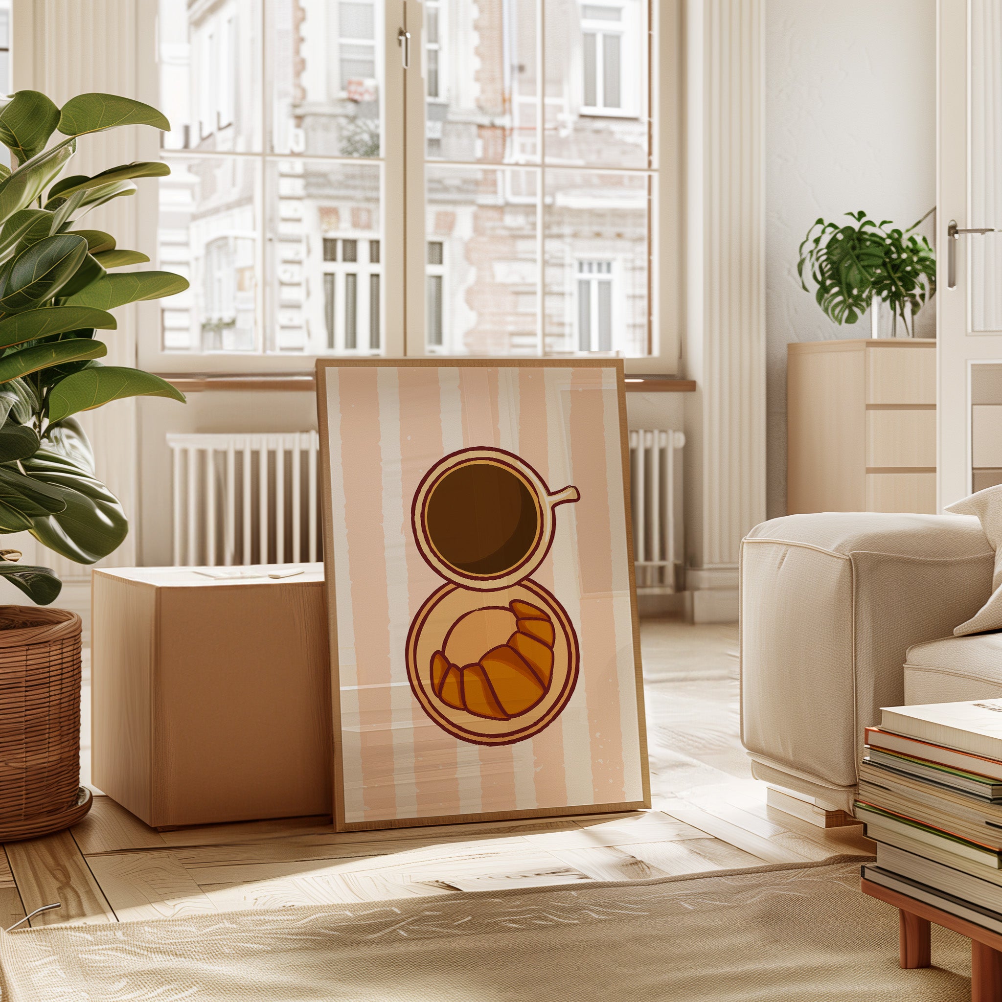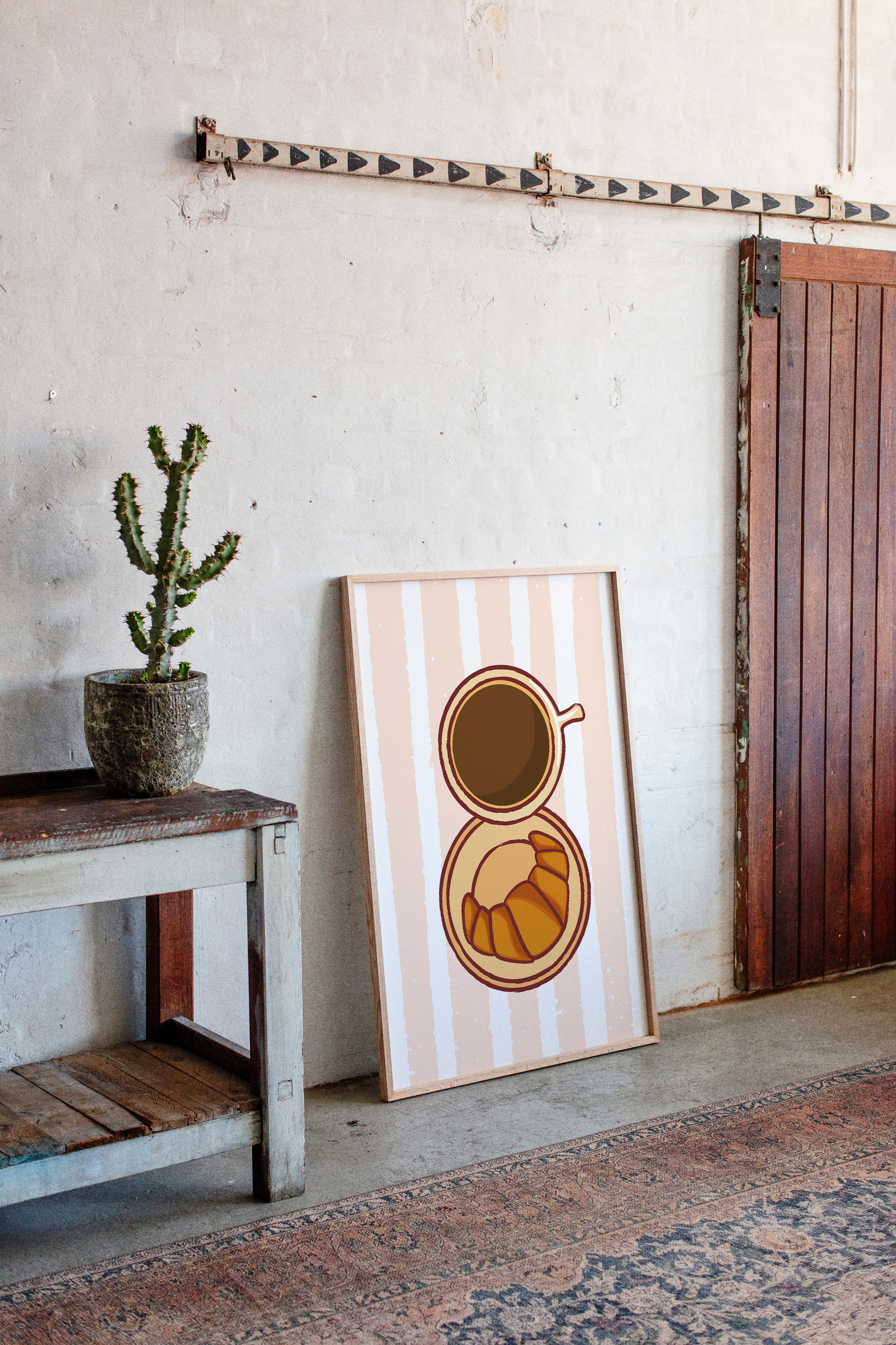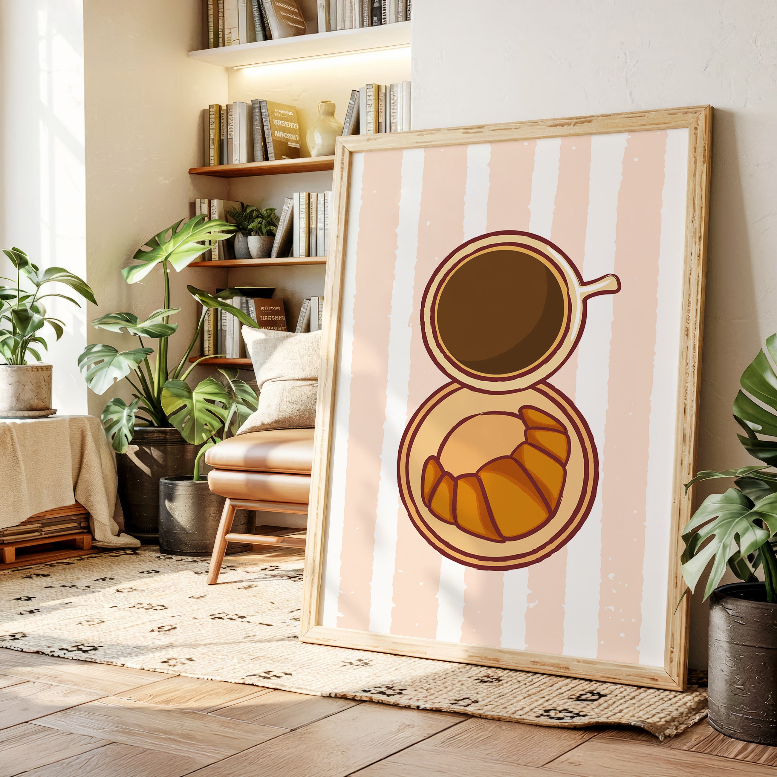 Steam rises gently from a perfectly brewed coffee, paired with a golden croissant on simple ceramic plates against soft striped warmth. A signature piece from our Contemporary collection that celebrates life's quiet morning rituals. The minimalist composition in warm browns and peachy pinks creates an inviting scene, where the buttery layers of the pastry seem to catch the early light. Every curve and shadow speaks to the comfort of familiar routines and anticipated pleasures. This piece brings a touch of Parisian cafe culture to any kitchen or dining space, perfect for creating a cozy breakfast nook or adding character to a coffee station. Each viewing invites you to slow down and savor the moment.