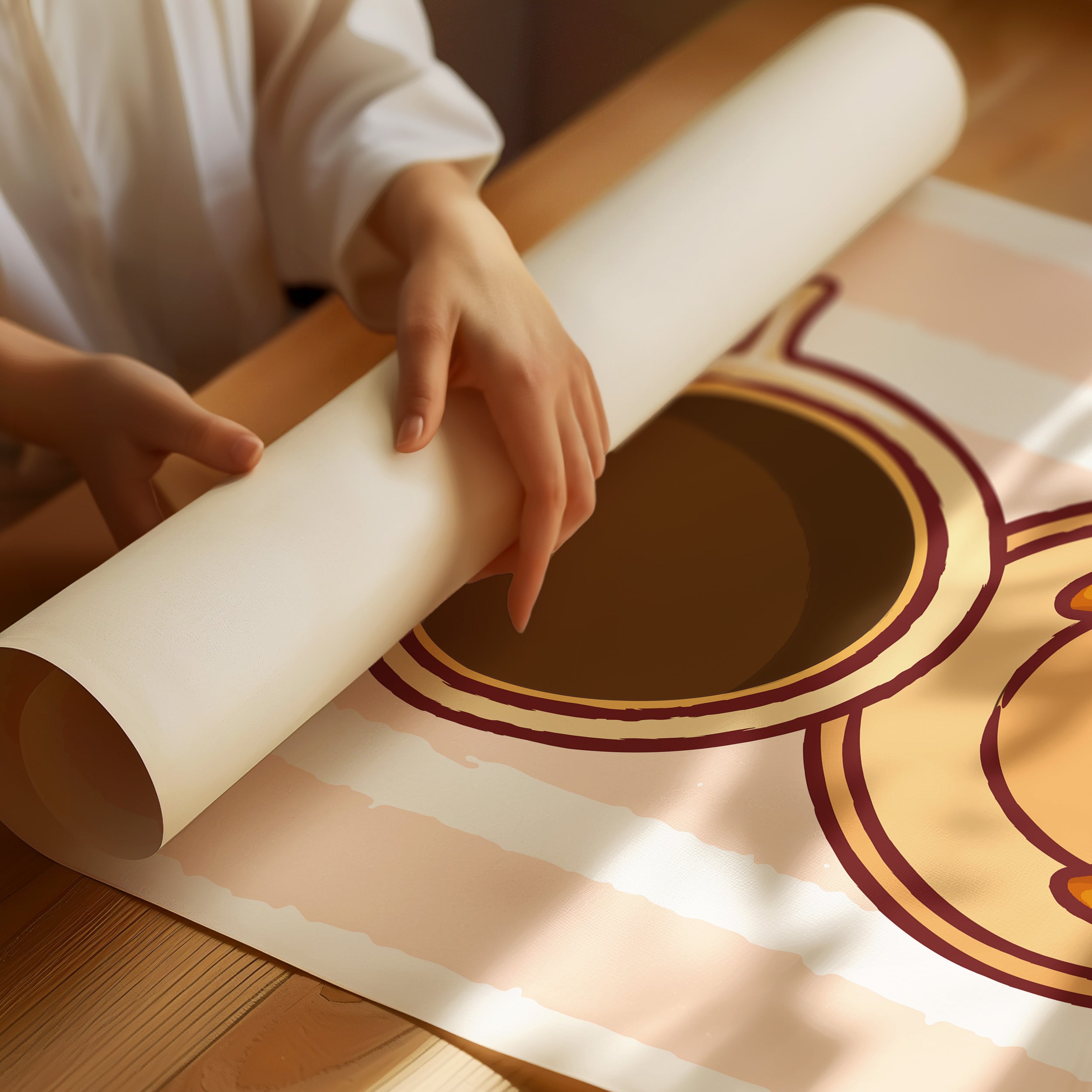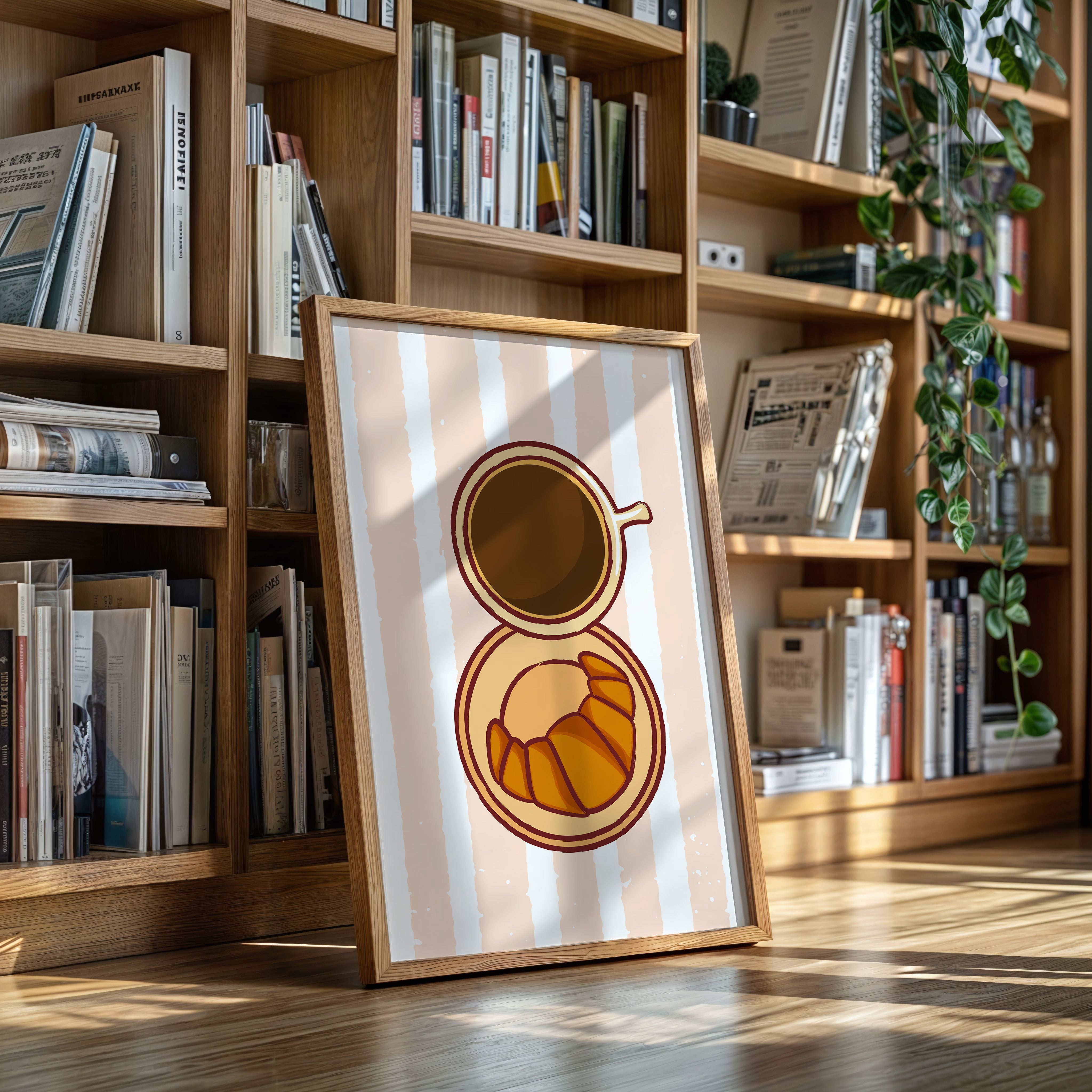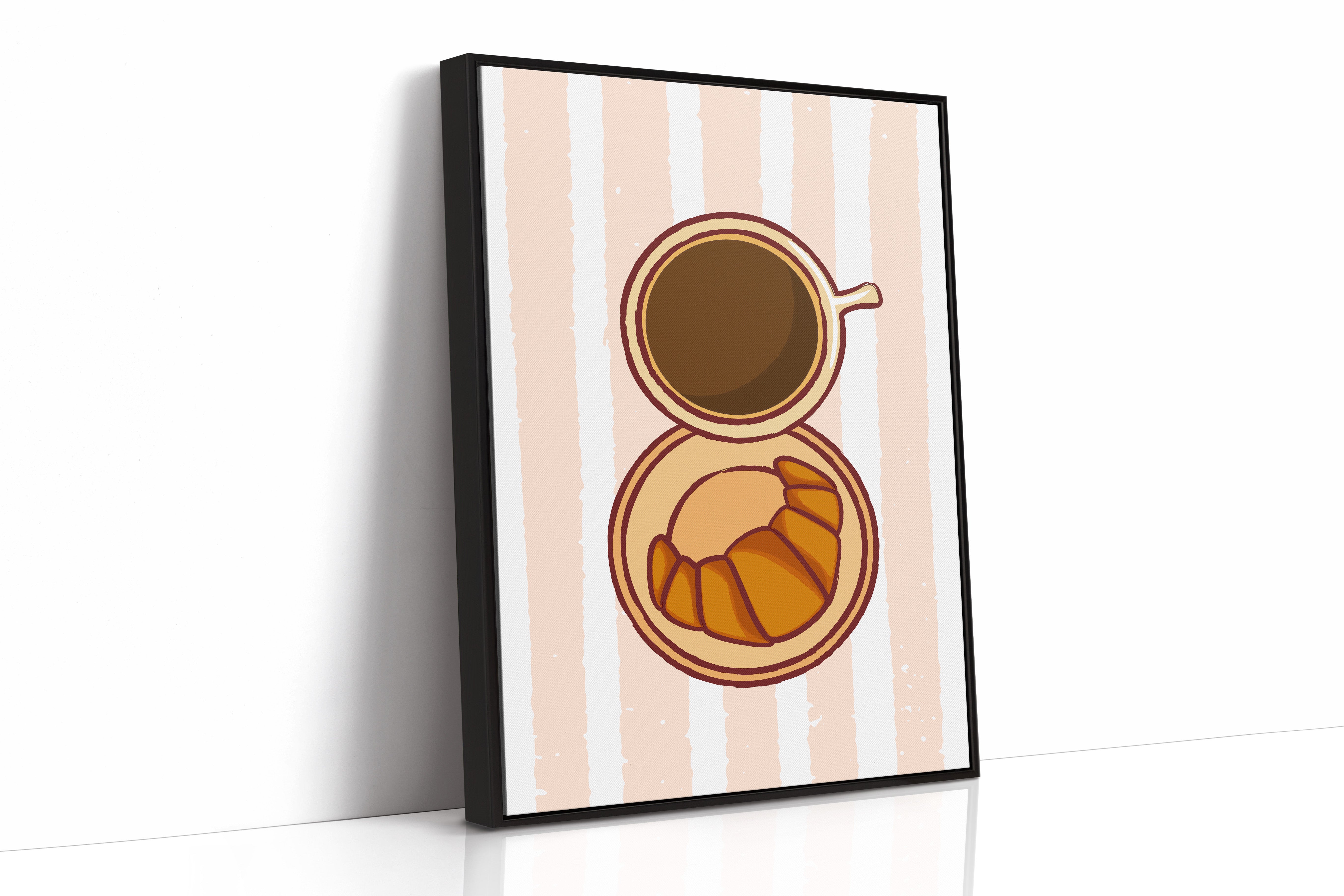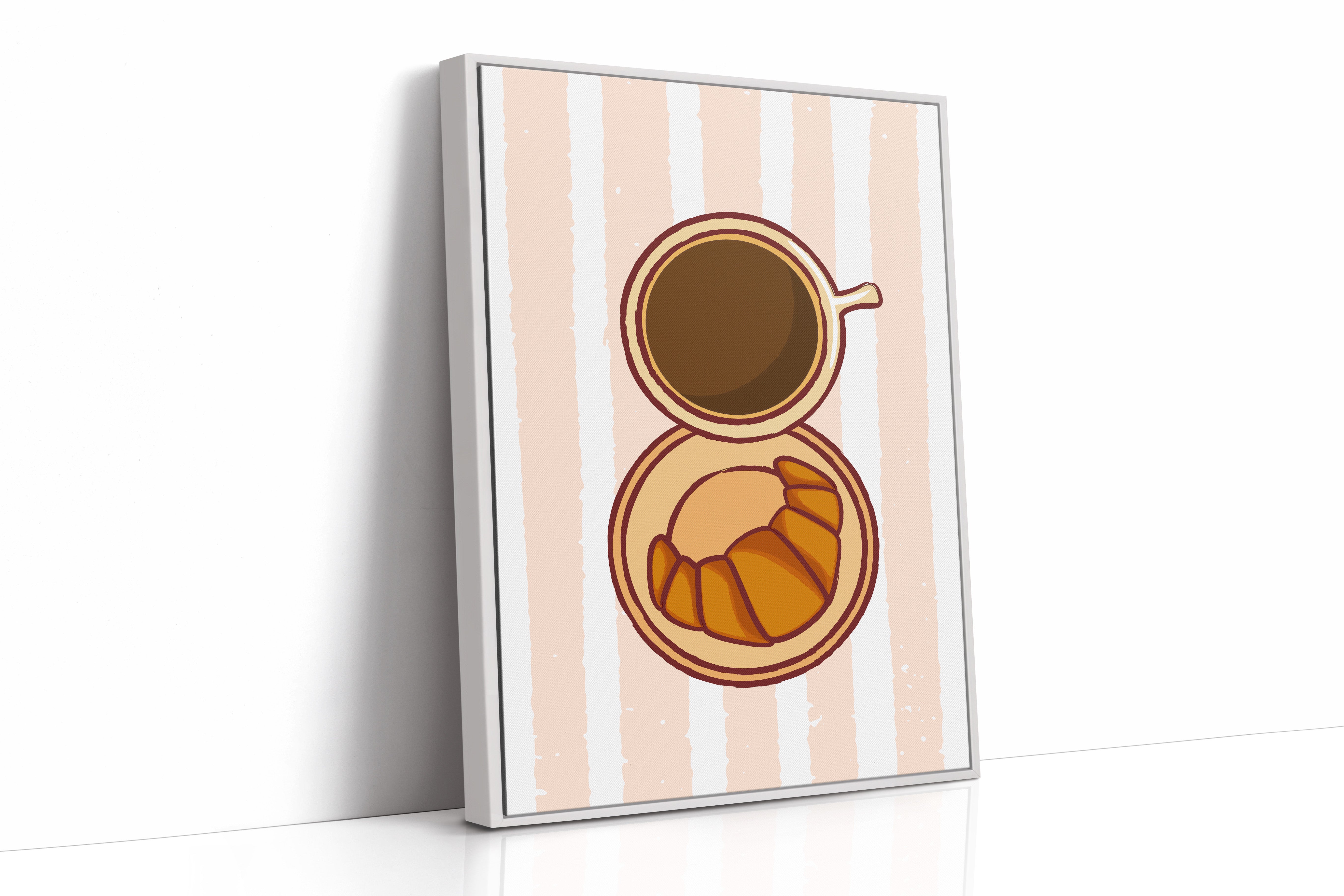 Steam rises gently from a perfectly brewed coffee, paired with a golden croissant on simple ceramic plates against soft striped warmth. A signature piece from our Contemporary collection that celebrates life's quiet morning rituals. The minimalist composition in warm browns and peachy pinks creates an inviting scene, where the buttery layers of the pastry seem to catch the early light. Every curve and shadow speaks to the comfort of familiar routines and anticipated pleasures. This piece brings a touch of Parisian cafe culture to any kitchen or dining space, perfect for creating a cozy breakfast nook or adding character to a coffee station. Each viewing invites you to slow down and savor the moment.