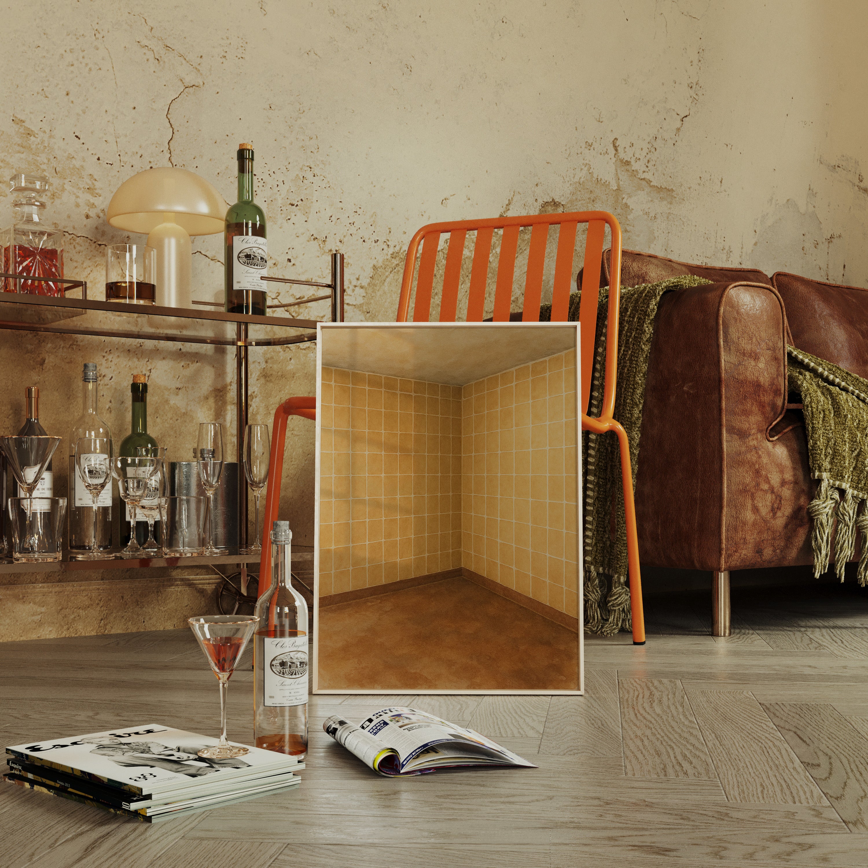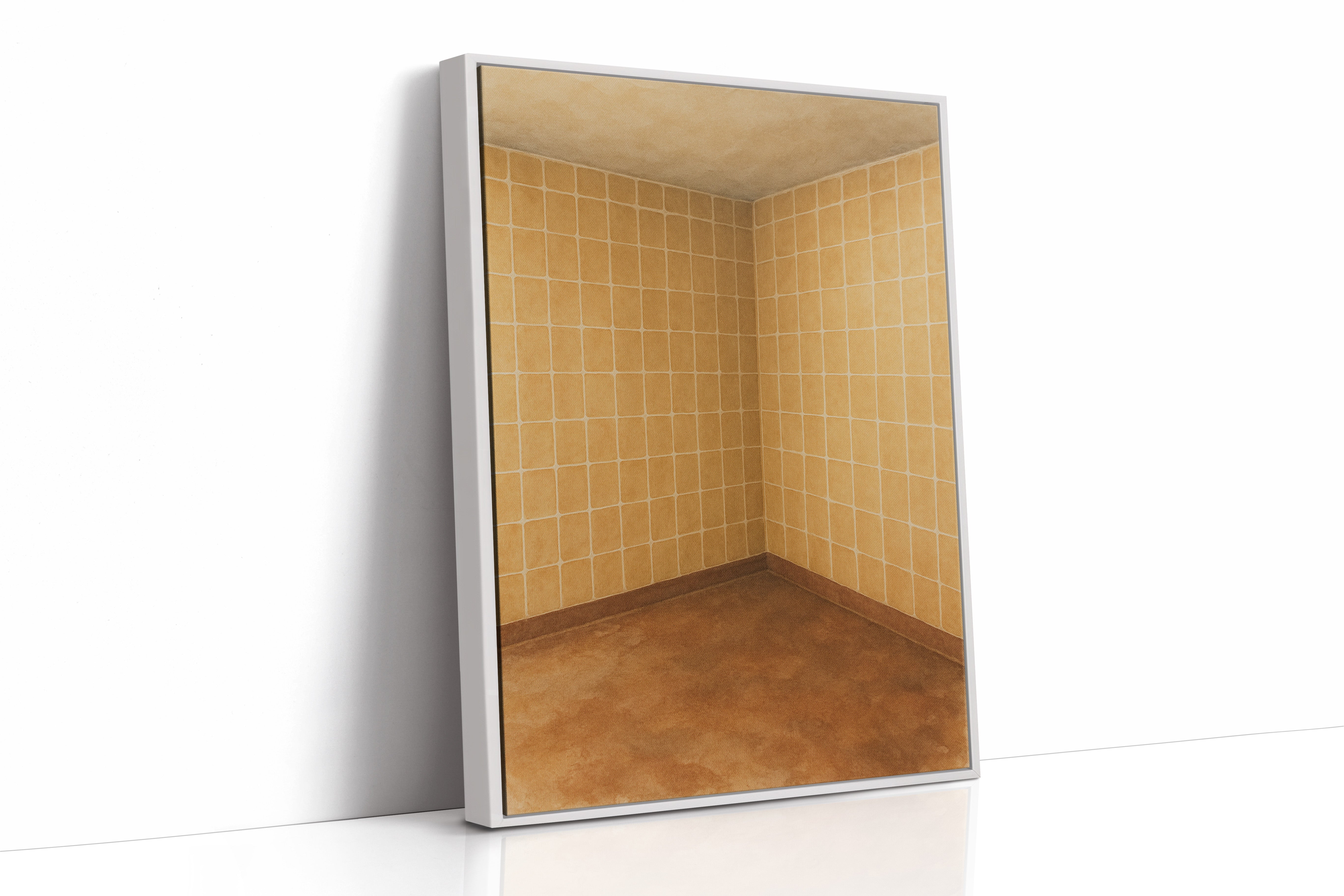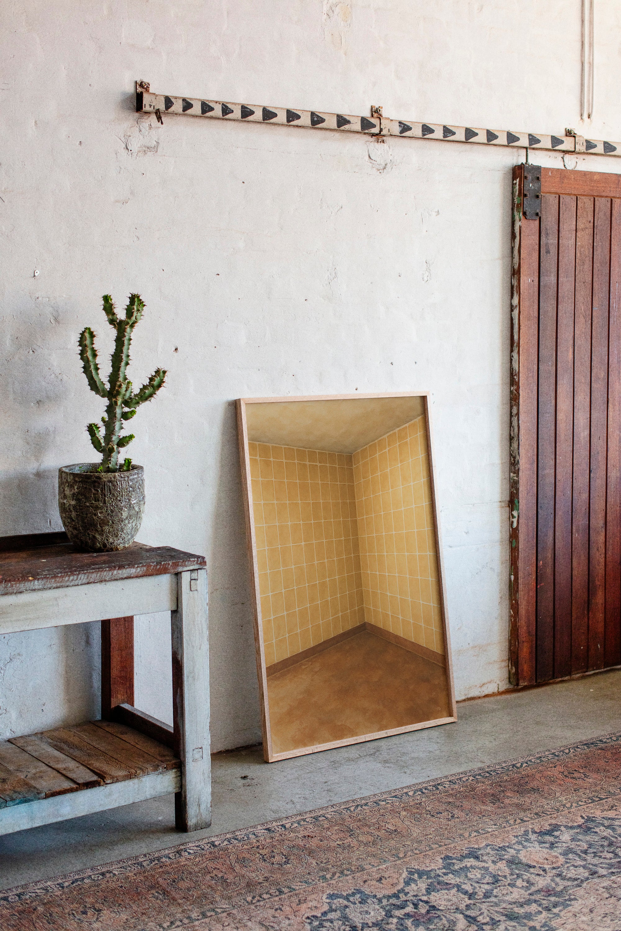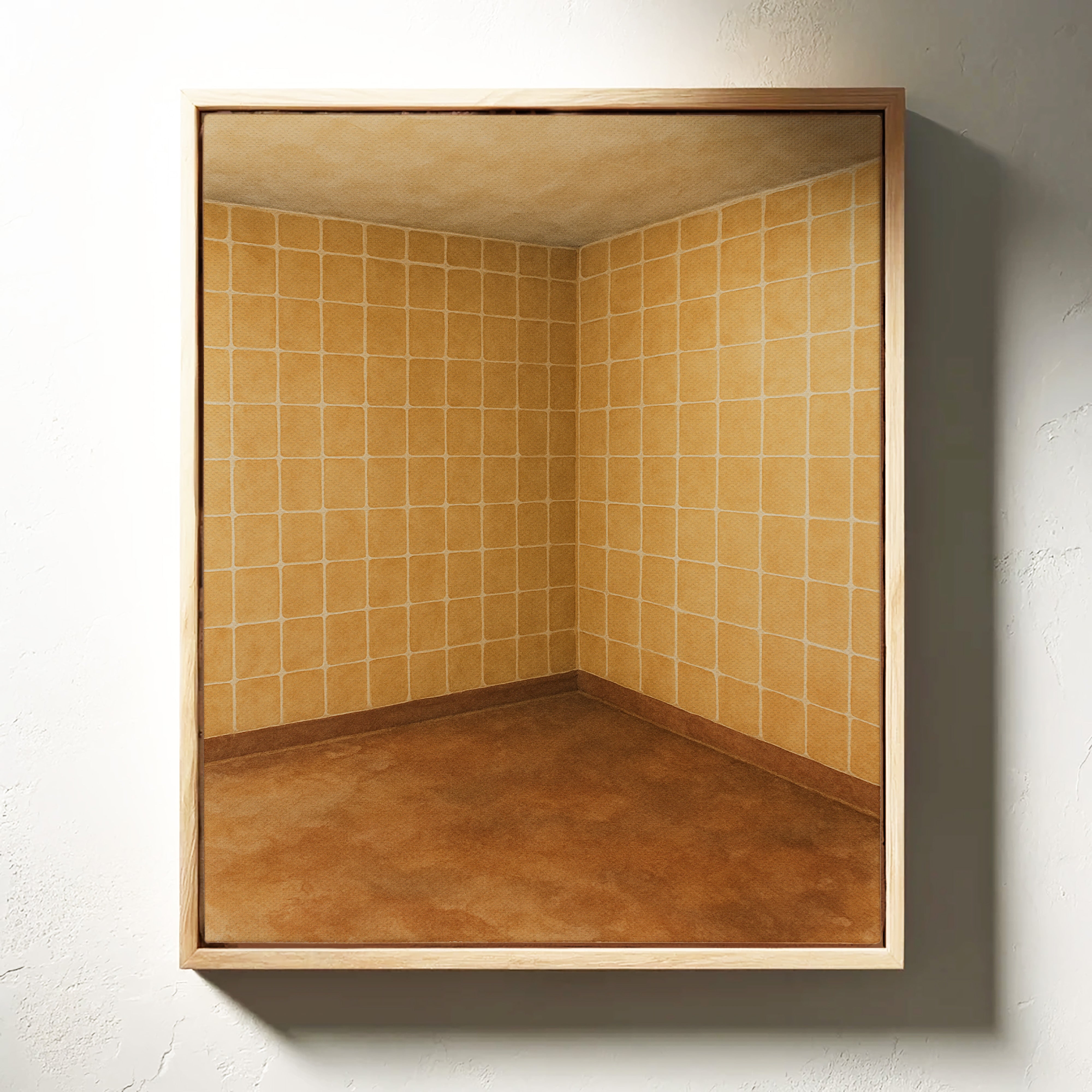 Soft morning rays filter through sheer curtains, casting geometric shadows across pristine white floors. A minimalist scene unfolds where a framed photograph of honey-colored tiles creates an abstract portal of warmth and geometry. Dried baby's breath in a clear vessel adds an organic touch to the precisely composed space, while rumpled white fabric introduces a casual elegance. The interplay of light and shadow transforms this corner into a meditation on form and simplicity.