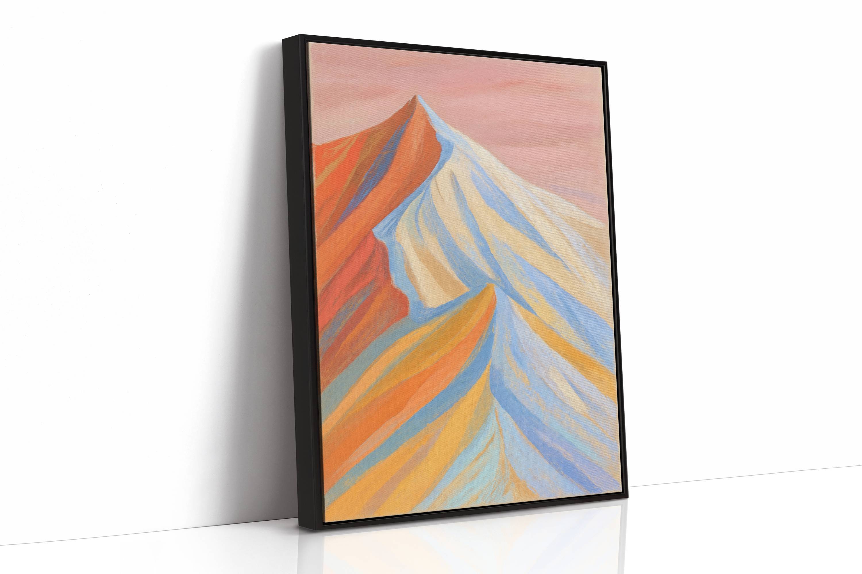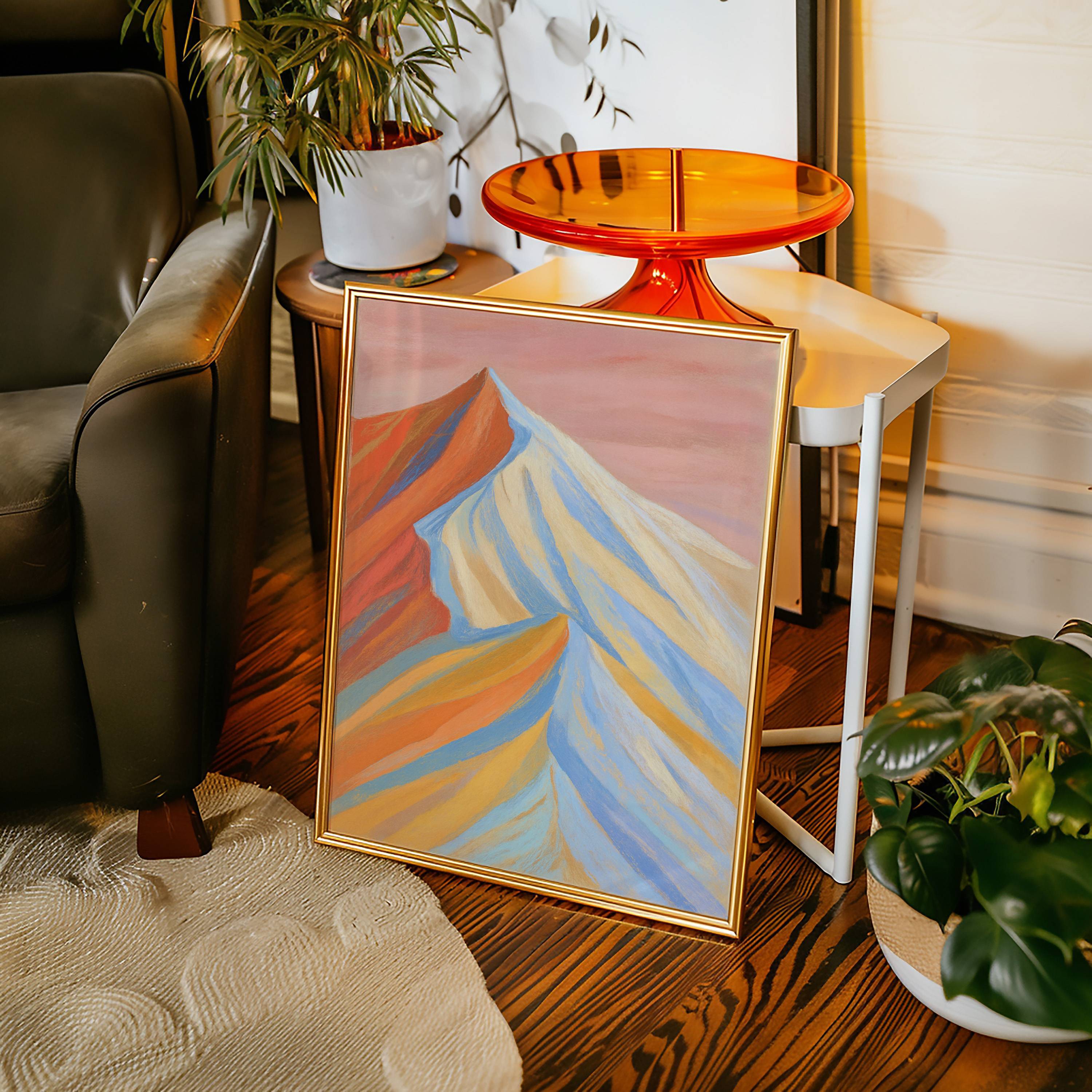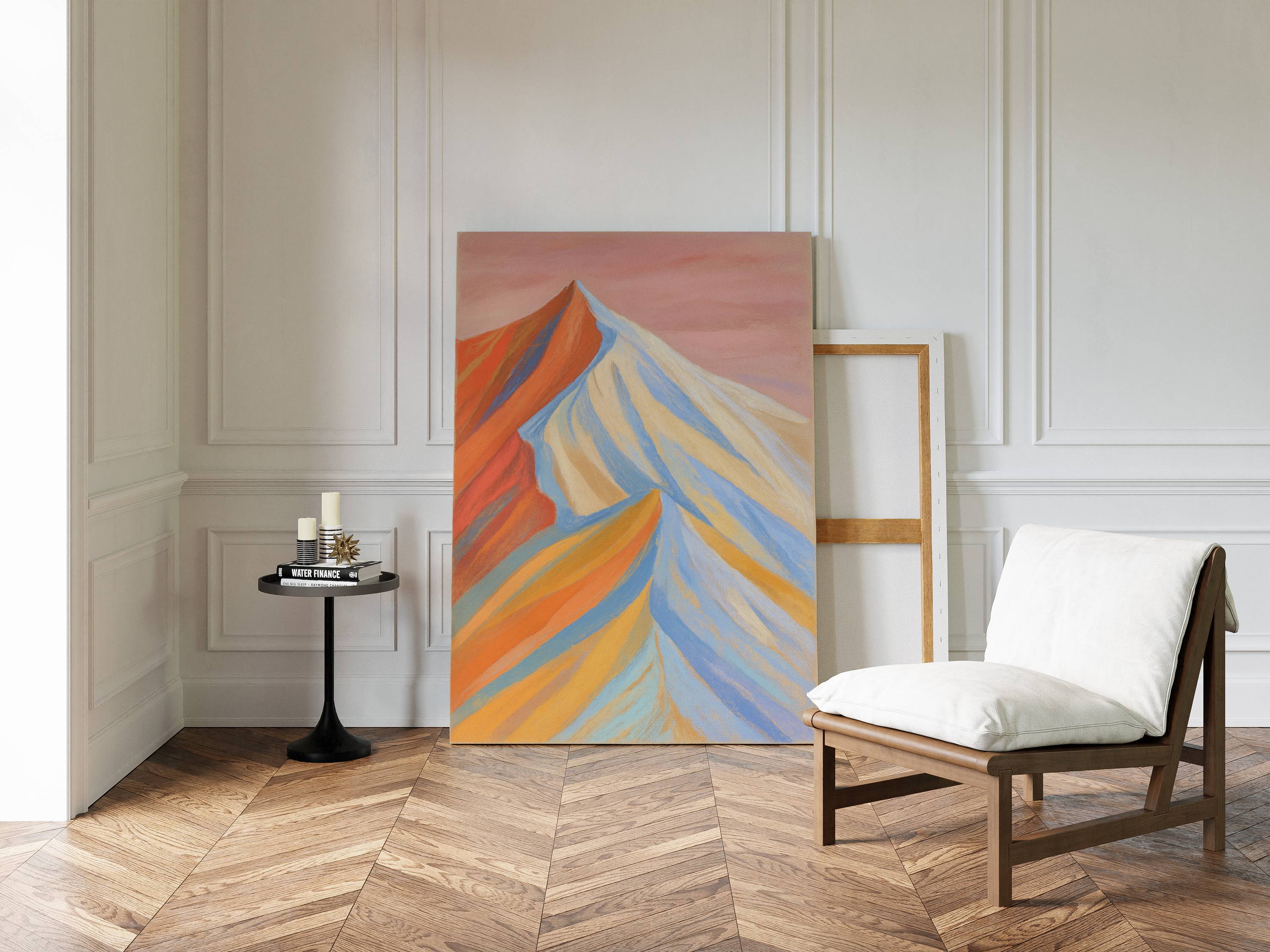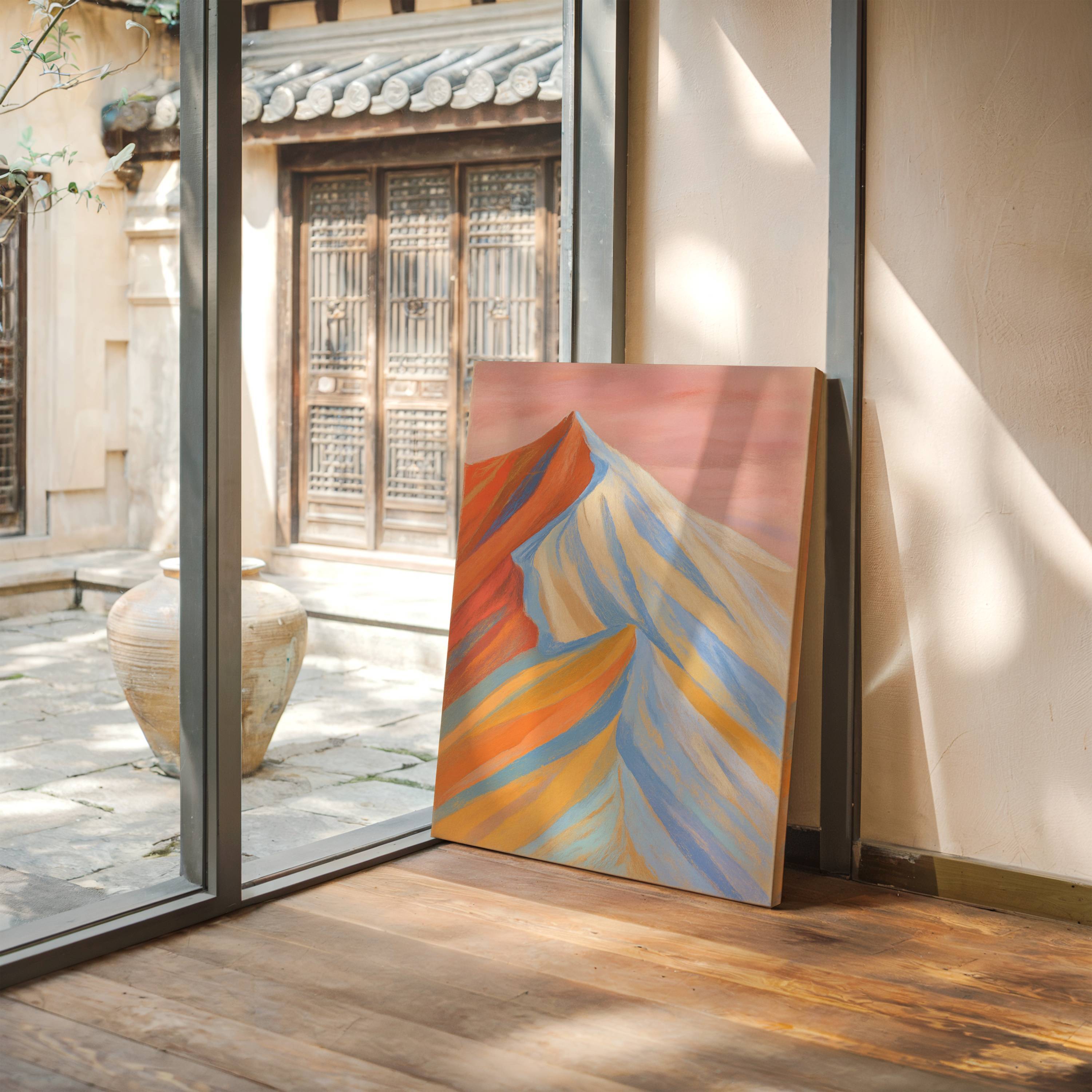 Dawn breaks across the mountain face, painting its slopes in ribbons of coral and cerulean blue. The peaks rise majestically through layers of color, each ridge catching the early light in a different hue - from deep orange to soft cream and cool azure. The abstract interpretation captures the transformative moment when alpenglow turns ordinary rock faces into an ethereal canvas of warm and cool tones dancing together. This contemporary piece would bring a sense of peaceful grandeur to a minimal living space, perfectly suited for a serene bedroom or meditation area where its gentle color transitions can inspire contemplation.