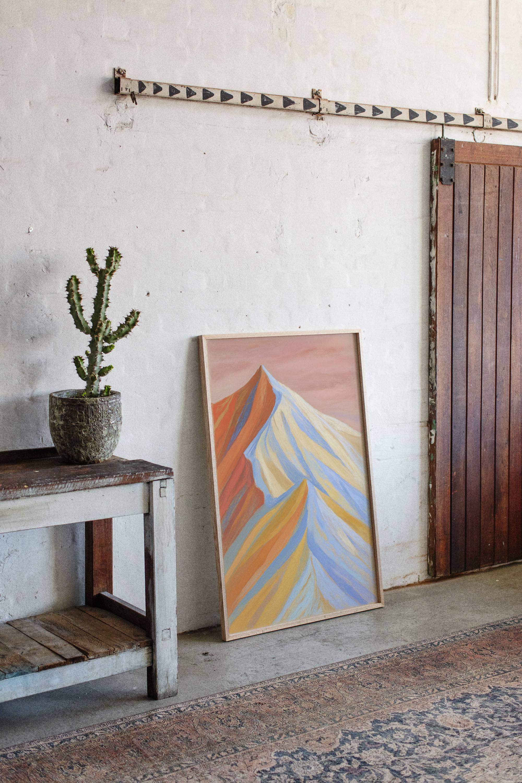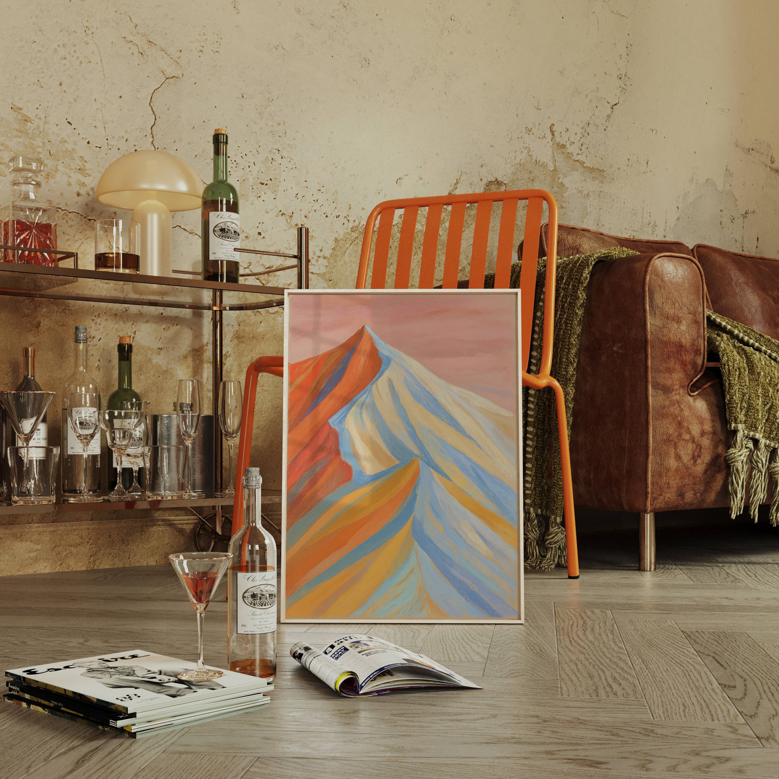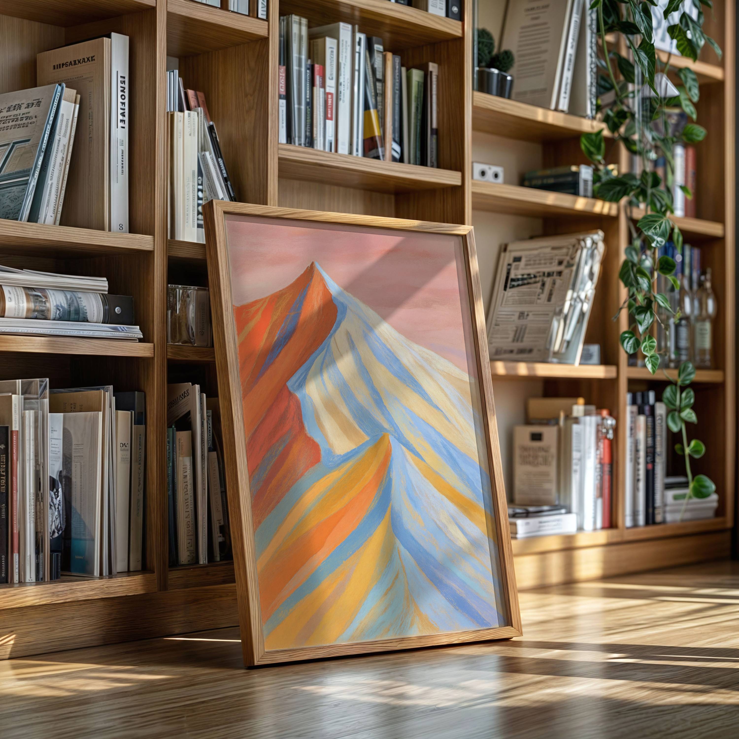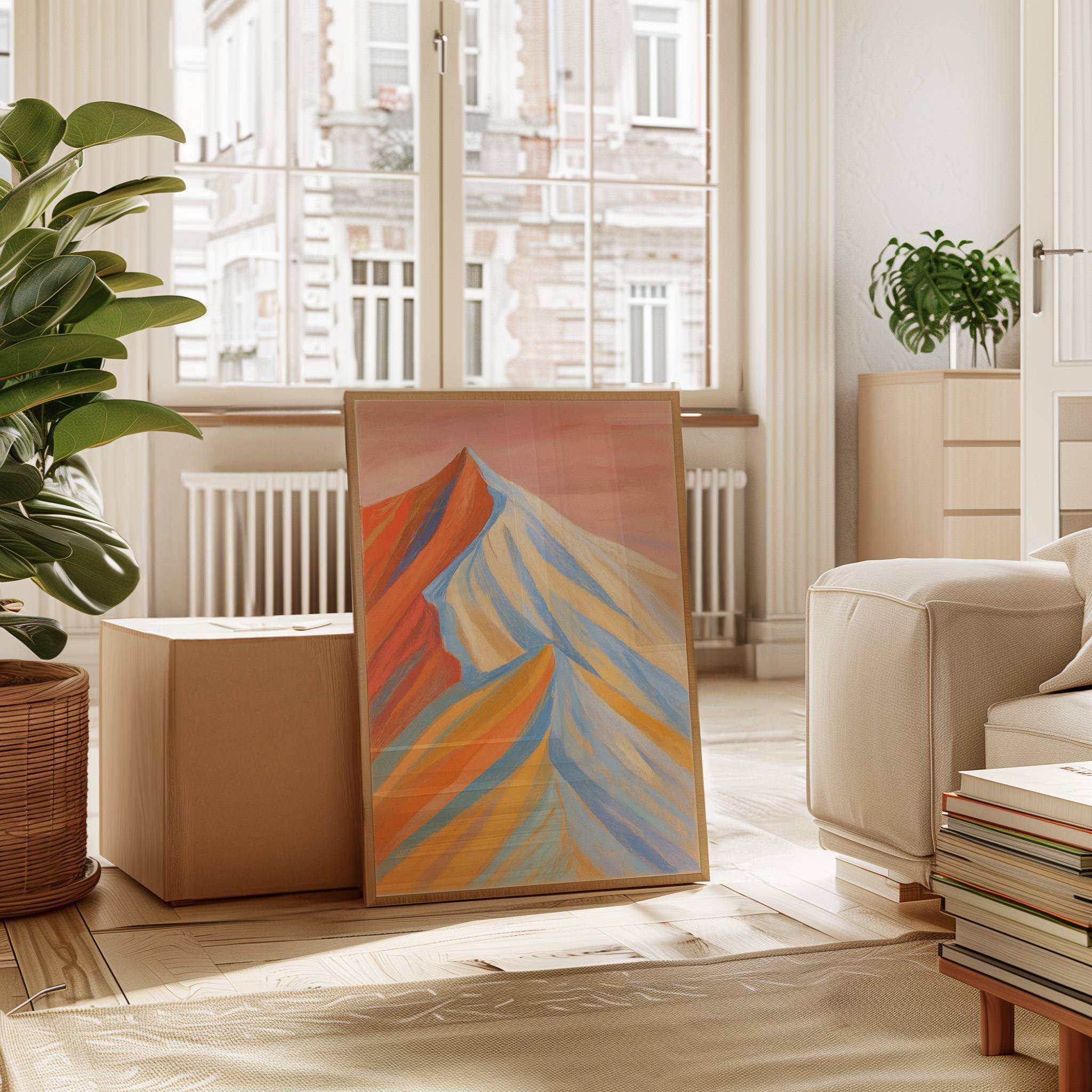 Dawn breaks across the mountain face, painting its slopes in ribbons of coral and cerulean blue. The peaks rise majestically through layers of color, each ridge catching the early light in a different hue - from deep orange to soft cream and cool azure. The abstract interpretation captures the transformative moment when alpenglow turns ordinary rock faces into an ethereal canvas of warm and cool tones dancing together. This contemporary piece would bring a sense of peaceful grandeur to a minimal living space, perfectly suited for a serene bedroom or meditation area where its gentle color transitions can inspire contemplation.