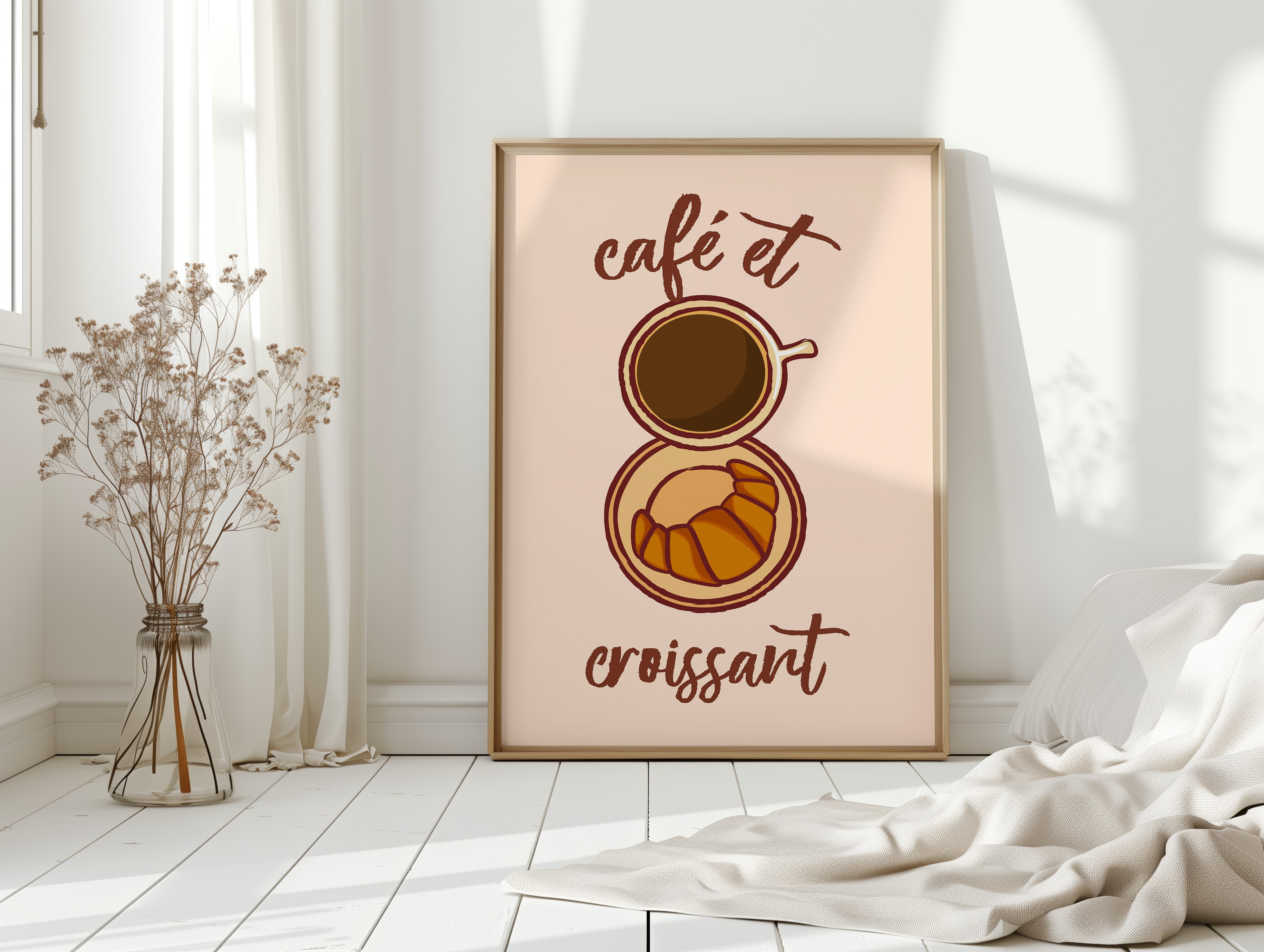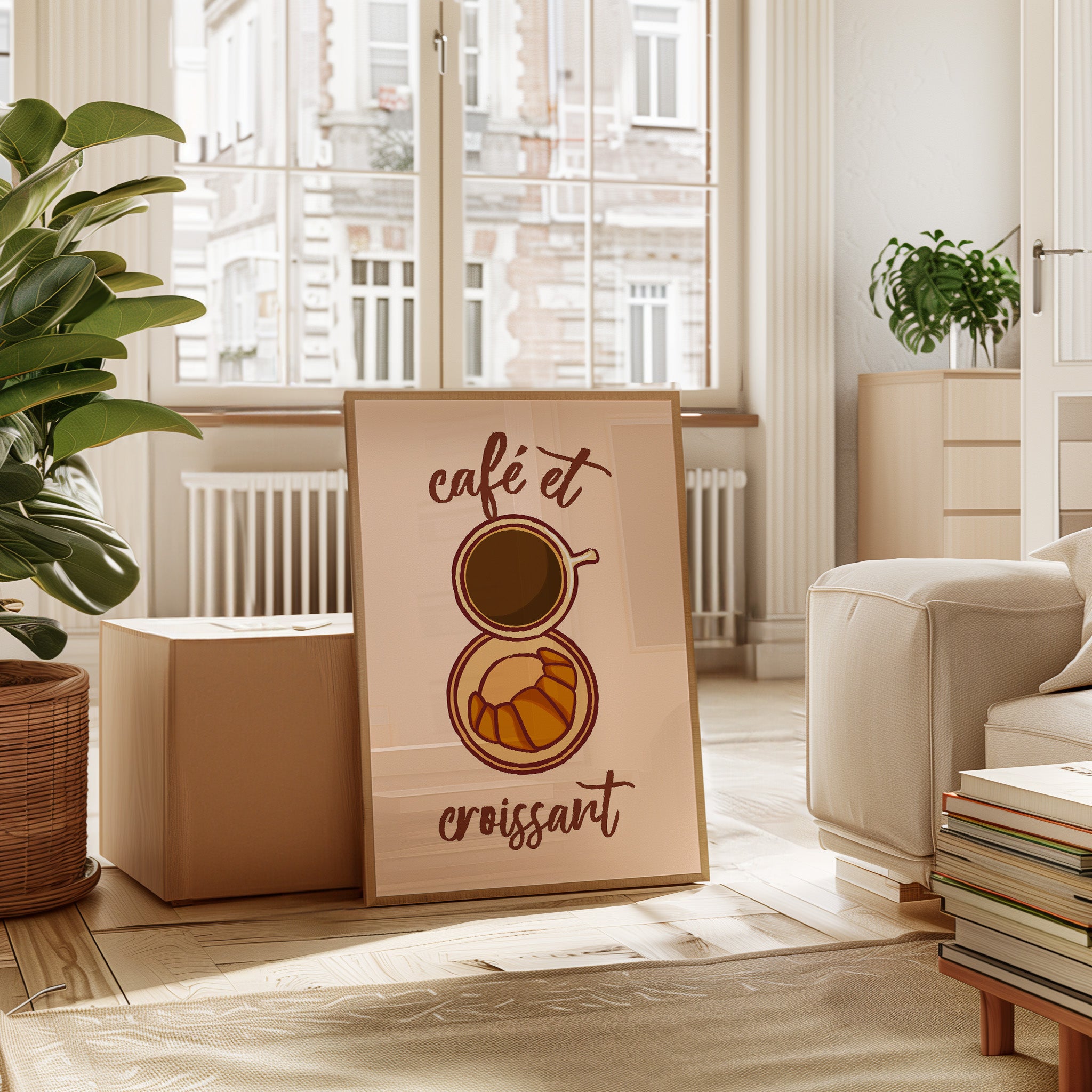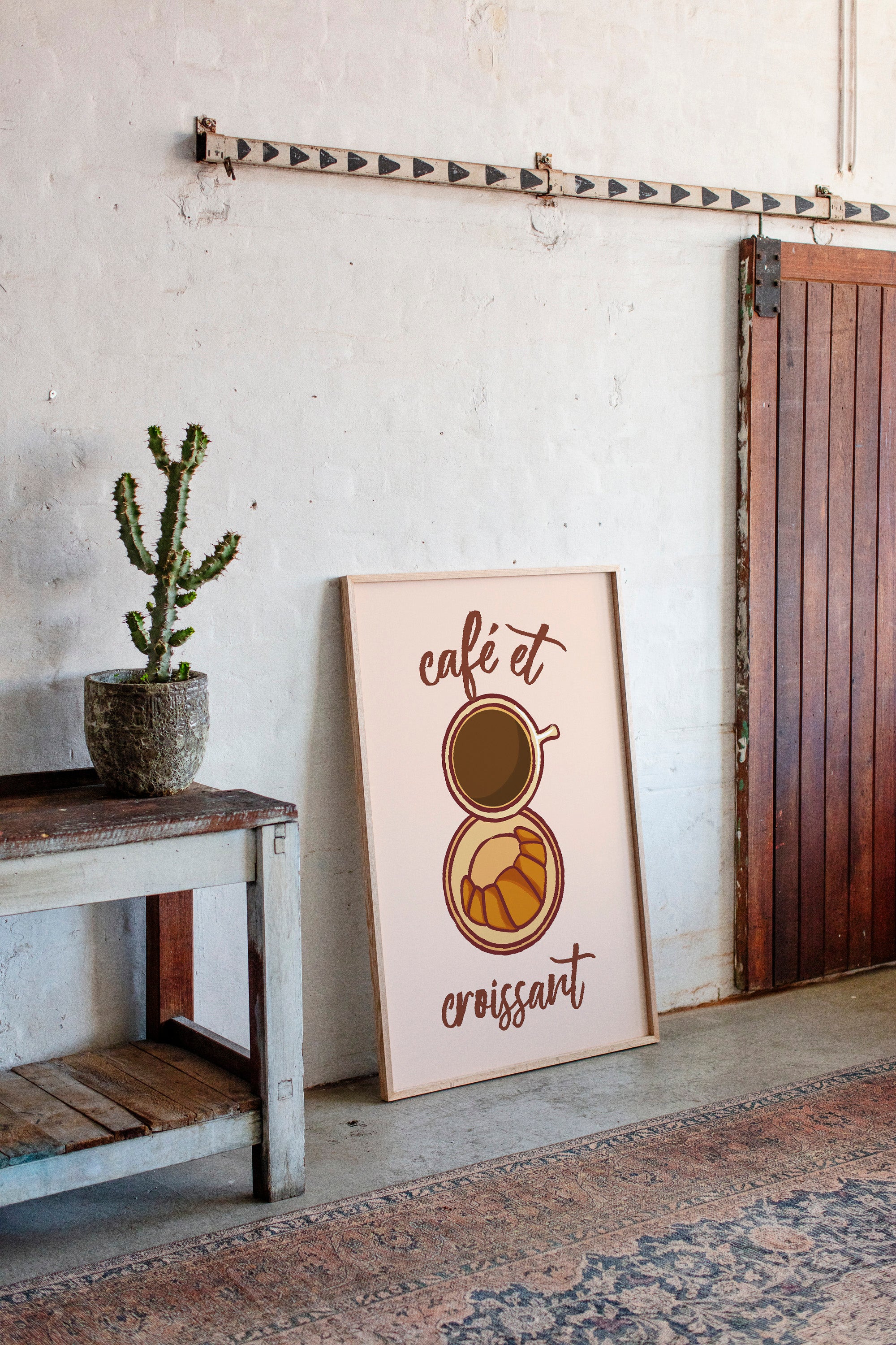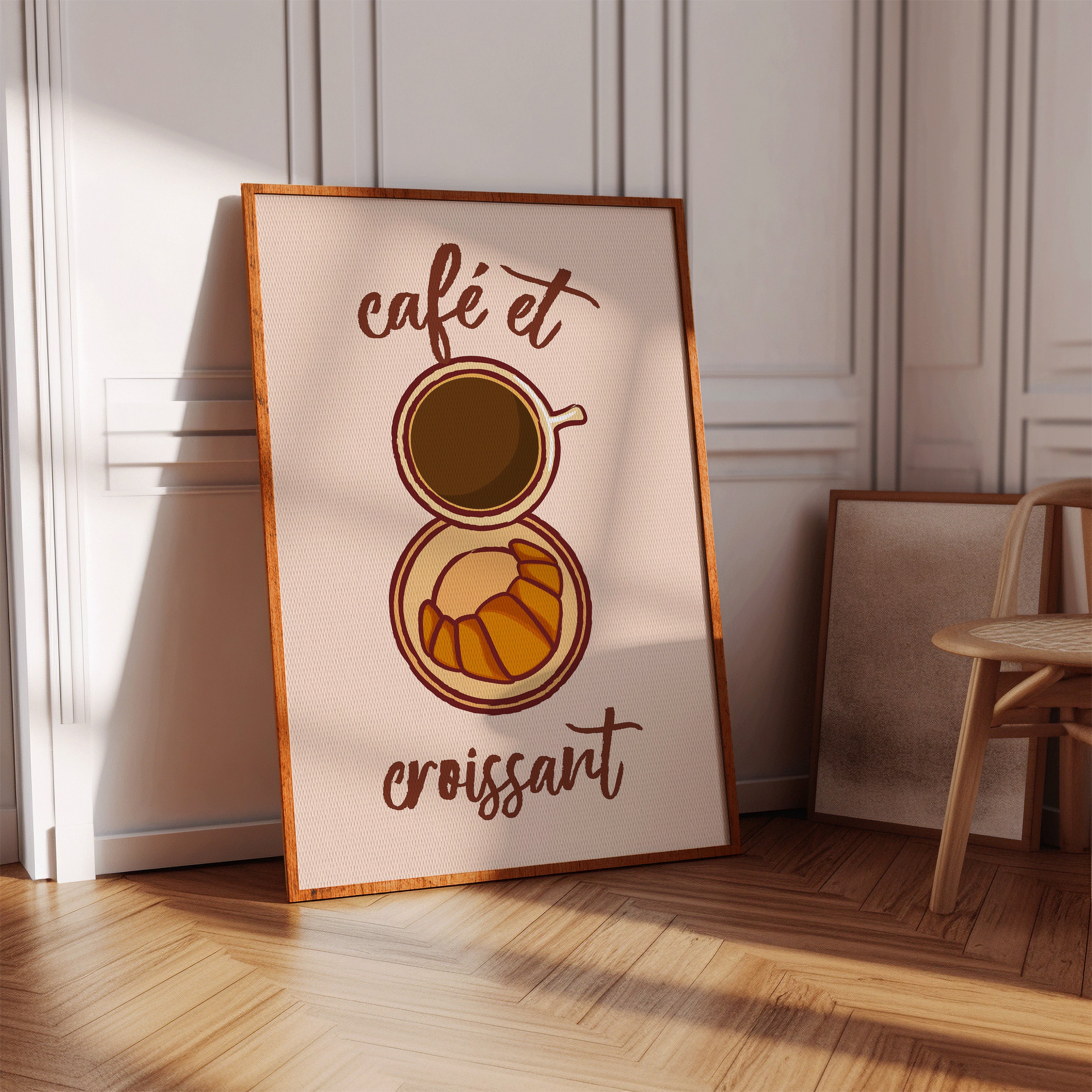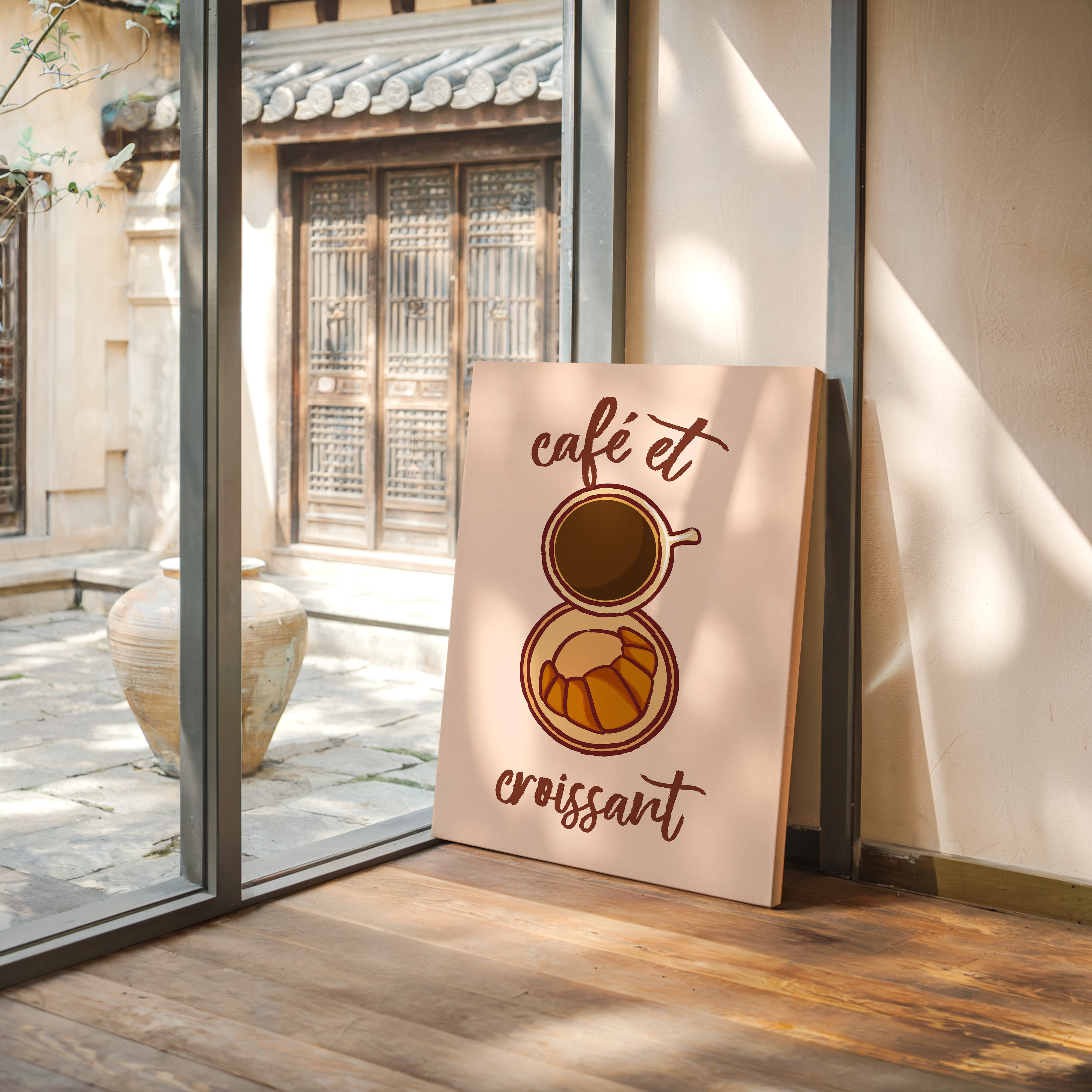 Steam rises like a morning promise, curling above a perfectly placed croissant and coffee cup in warm, inviting tones. This minimalist cafe illustration captures the essence of contemporary French bistro style. Rich browns and soft peach hues blend together in a harmonious composition, while hand-lettered text adds a playful touch of artisanal charm. The simple geometry of circles creates a satisfying balance, transforming an everyday moment into something quietly special. This piece brings Parisian cafe culture to your space, perfect for adding a touch of European sophistication to a kitchen nook or dining area. Let it remind you to slow down and savor life's simple pleasures.