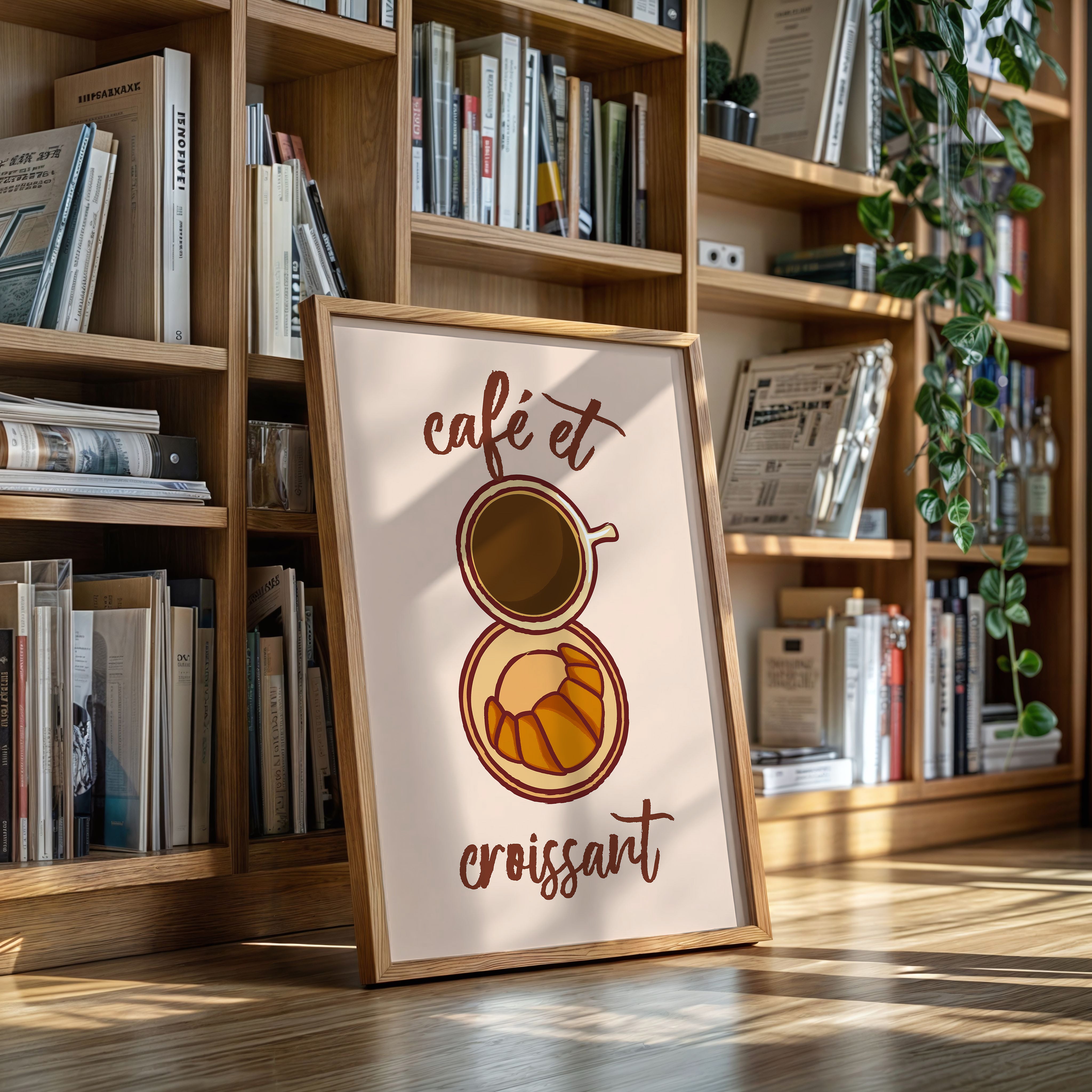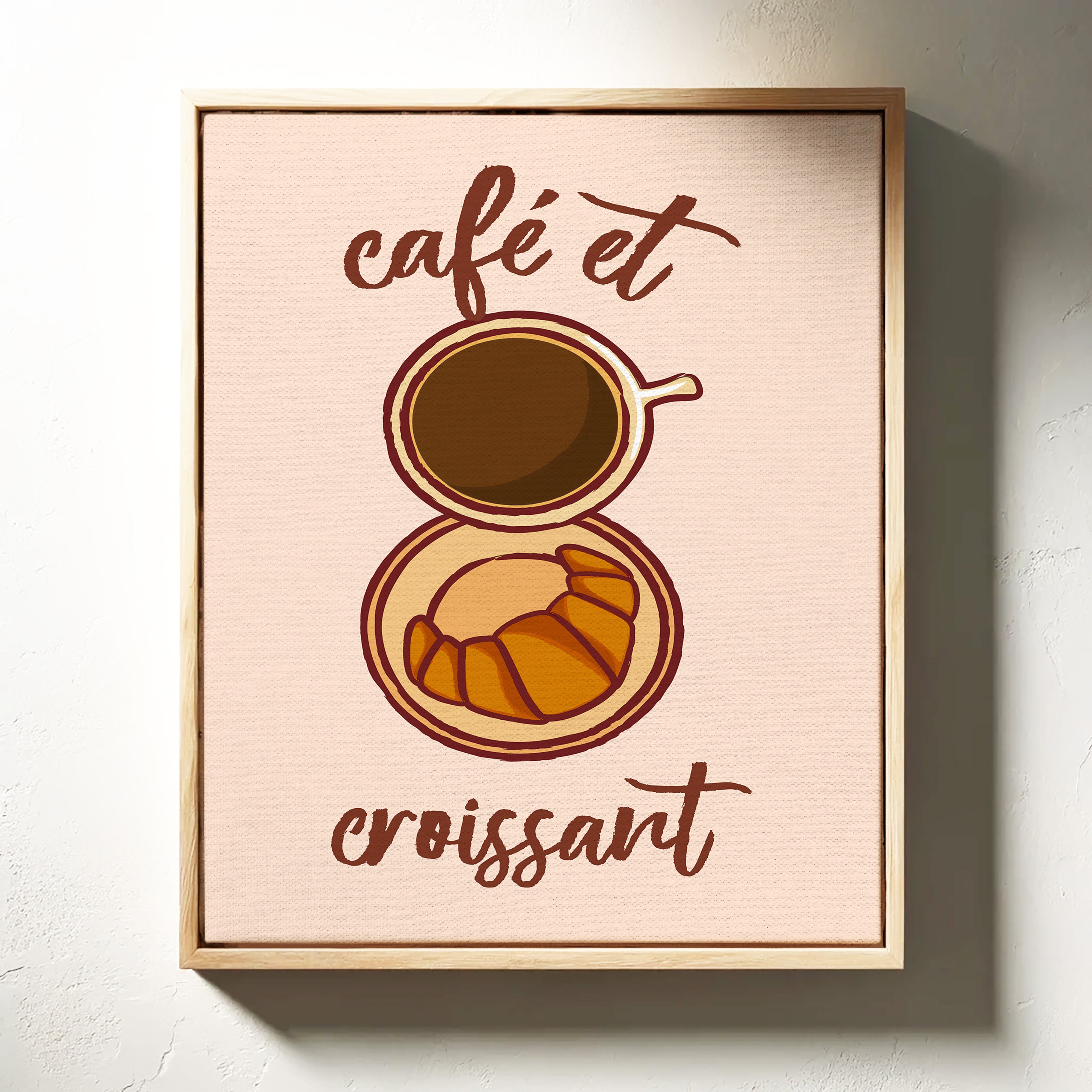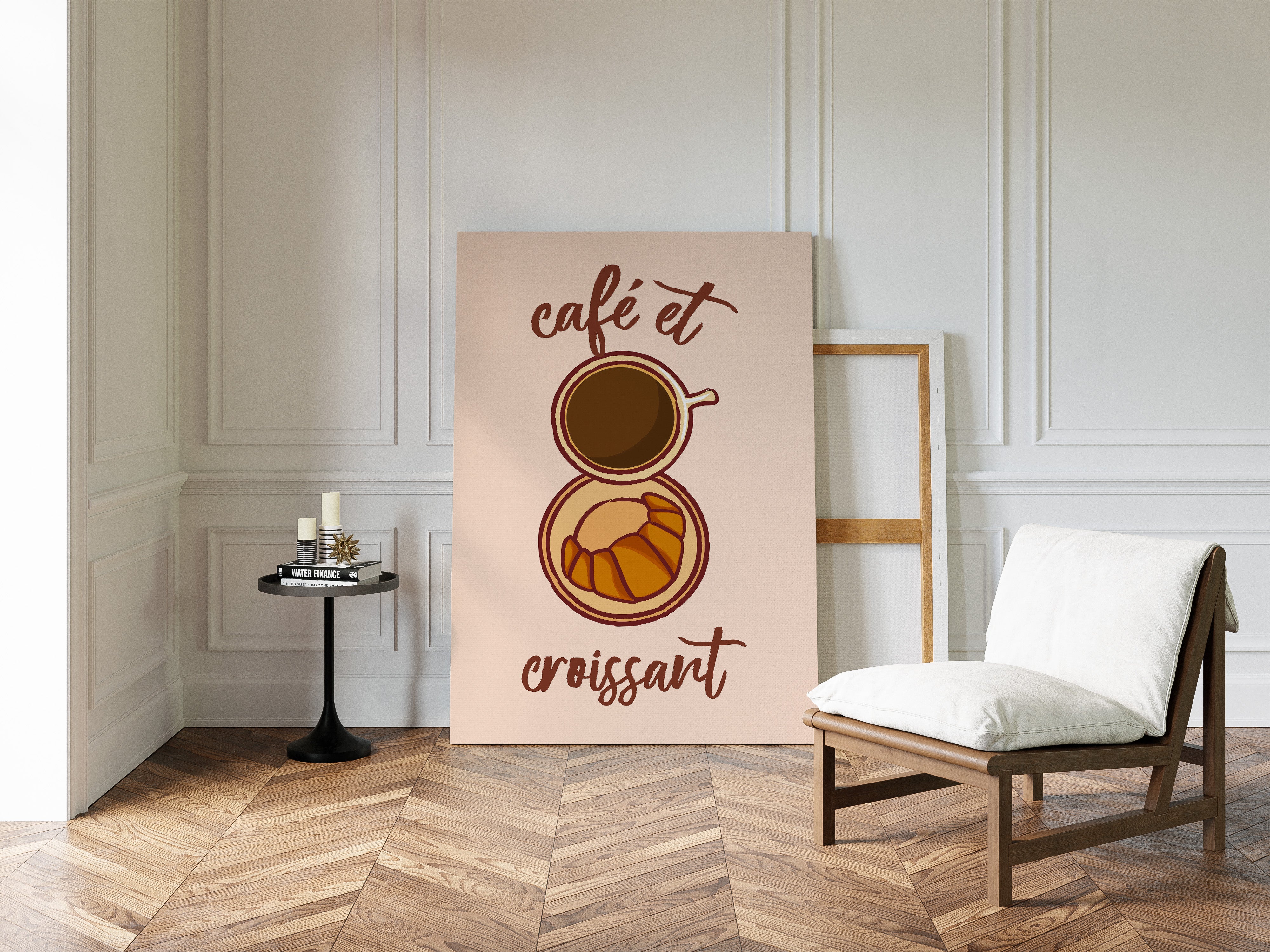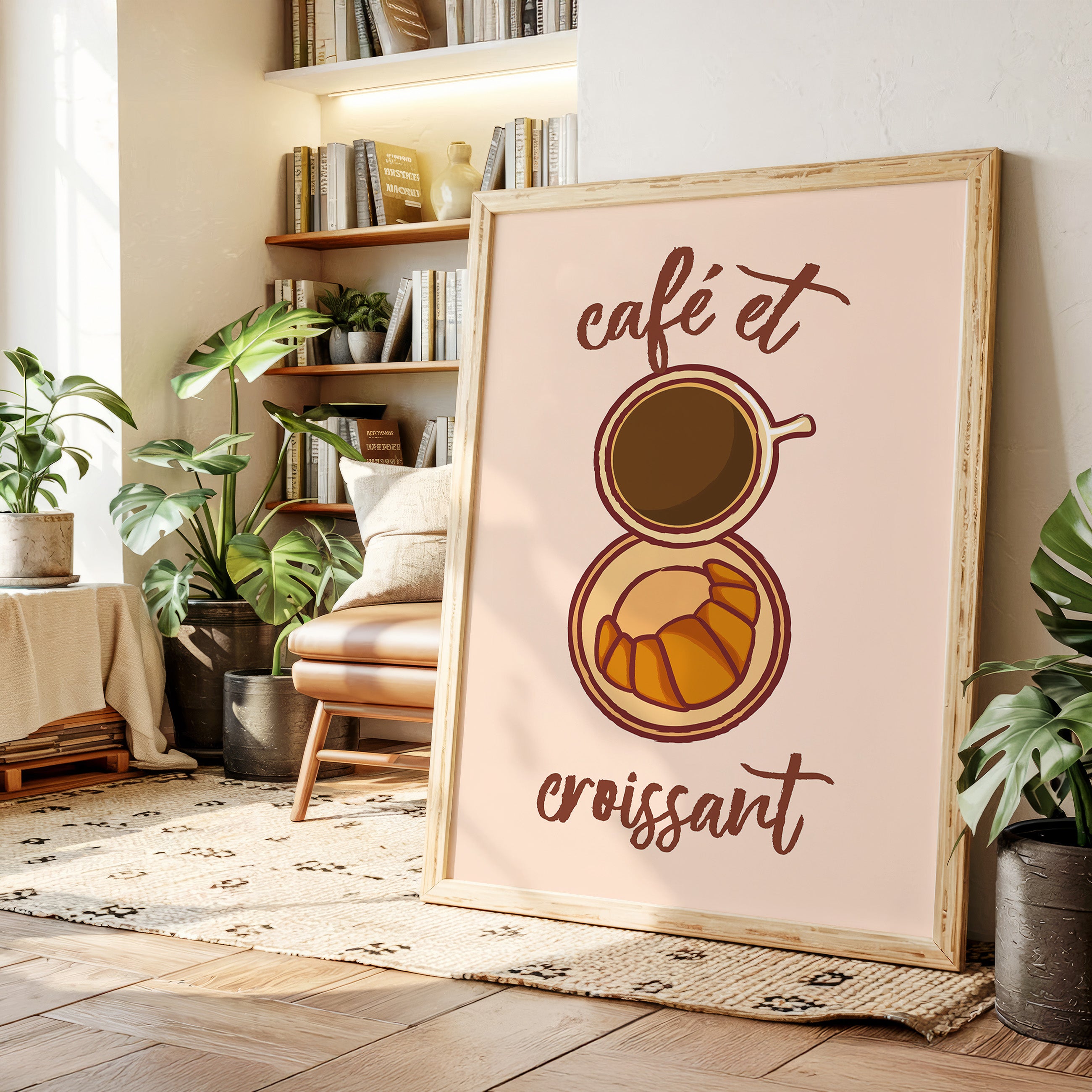 Steam rises like a morning promise, curling above a perfectly placed croissant and coffee cup in warm, inviting tones. This minimalist cafe illustration captures the essence of contemporary French bistro style. Rich browns and soft peach hues blend together in a harmonious composition, while hand-lettered text adds a playful touch of artisanal charm. The simple geometry of circles creates a satisfying balance, transforming an everyday moment into something quietly special. This piece brings Parisian cafe culture to your space, perfect for adding a touch of European sophistication to a kitchen nook or dining area. Let it remind you to slow down and savor life's simple pleasures.