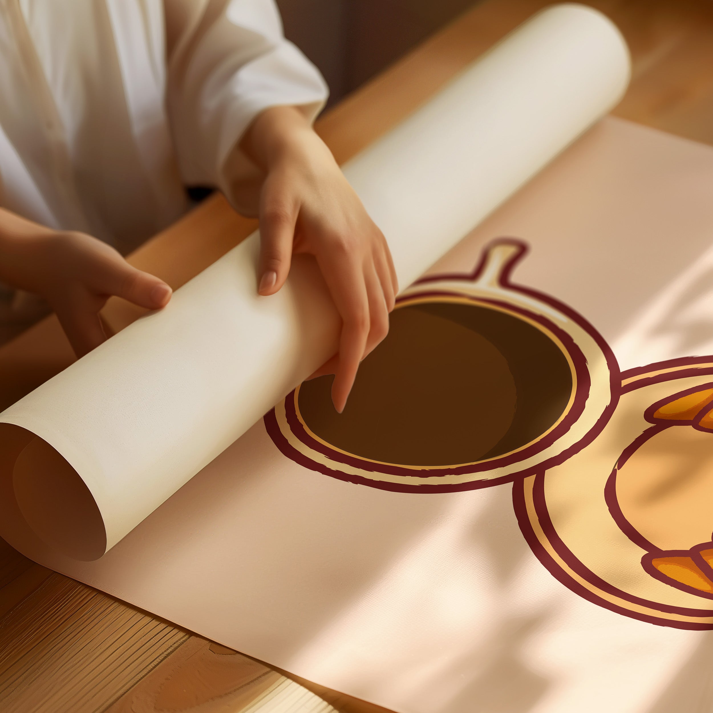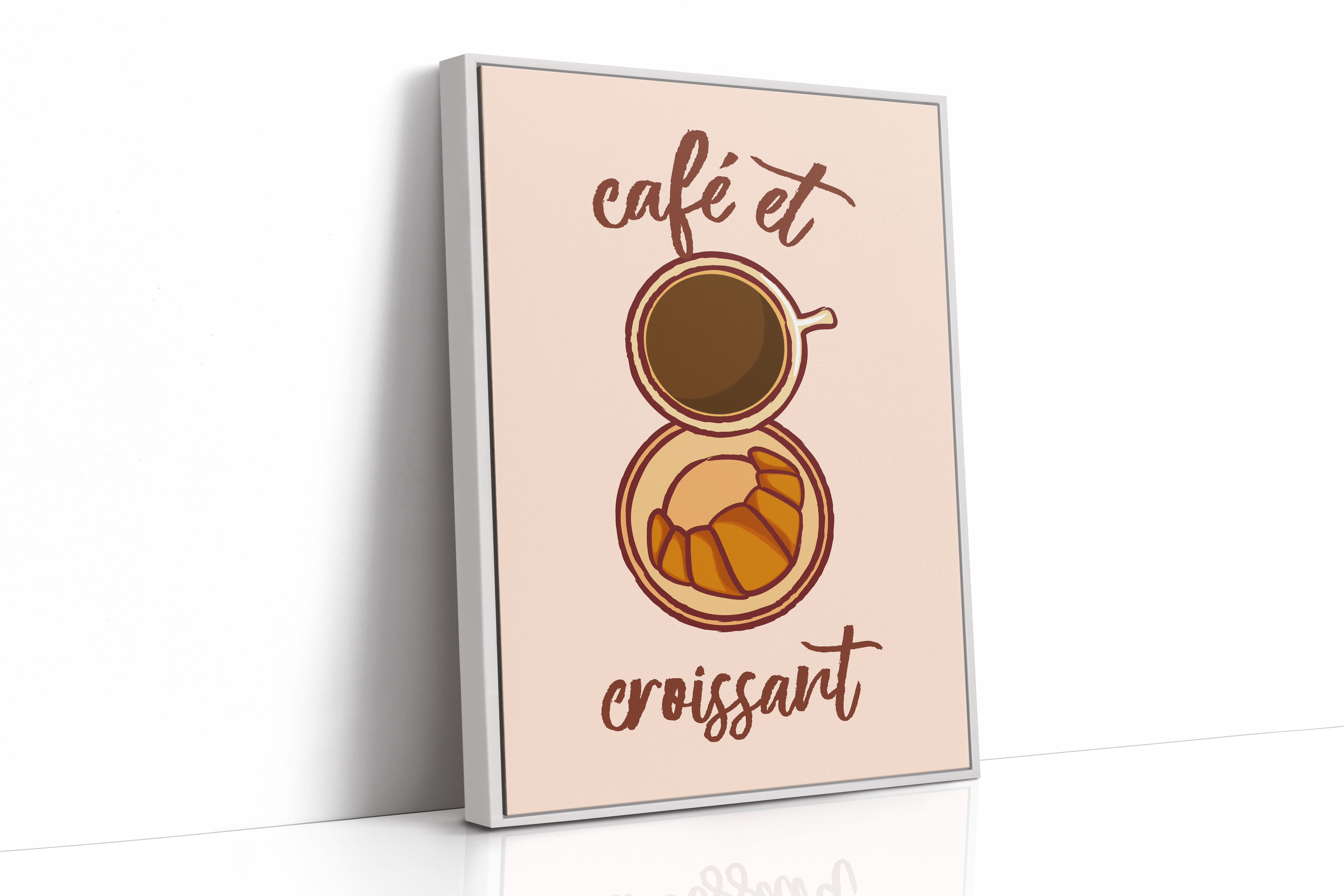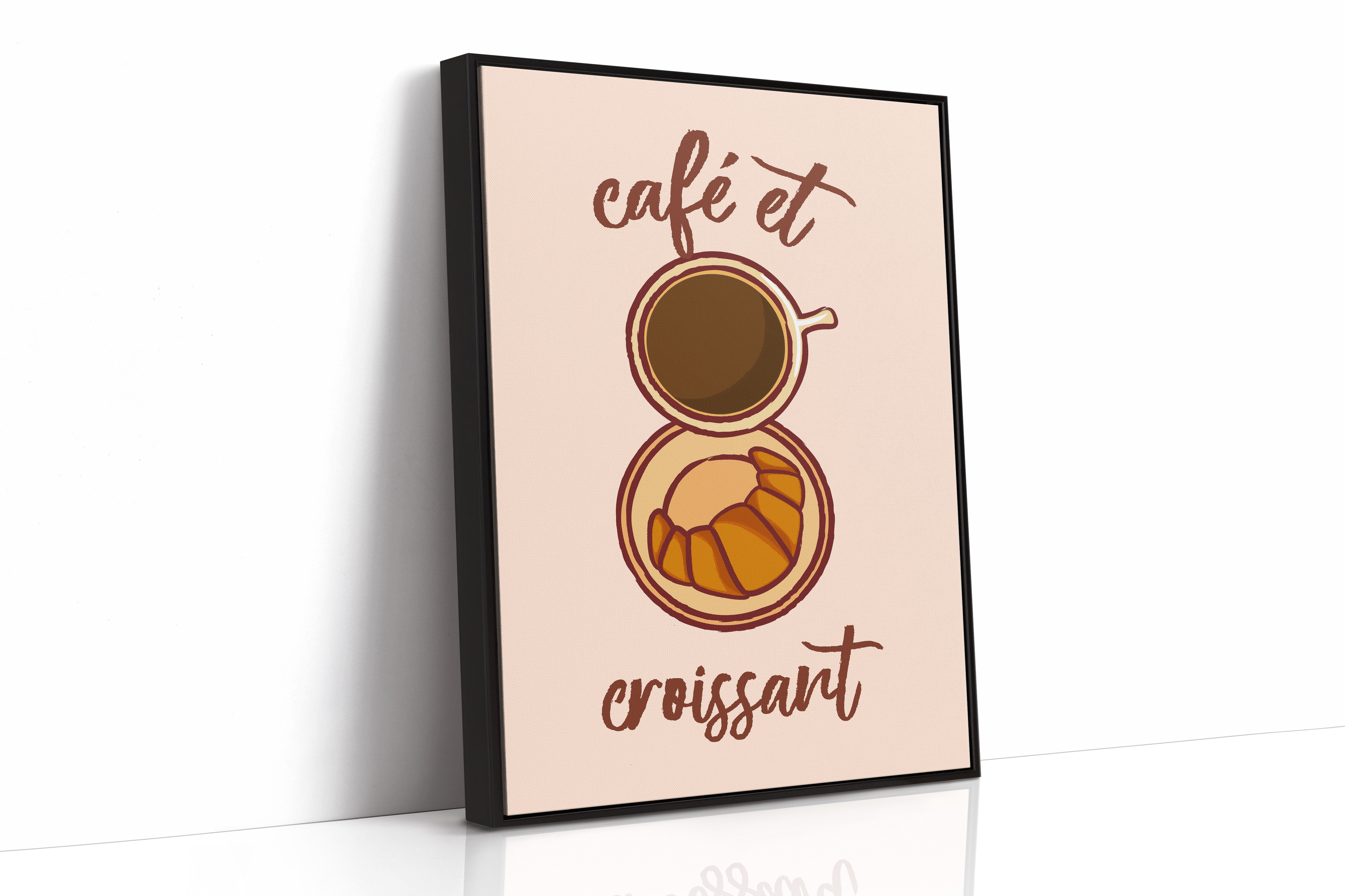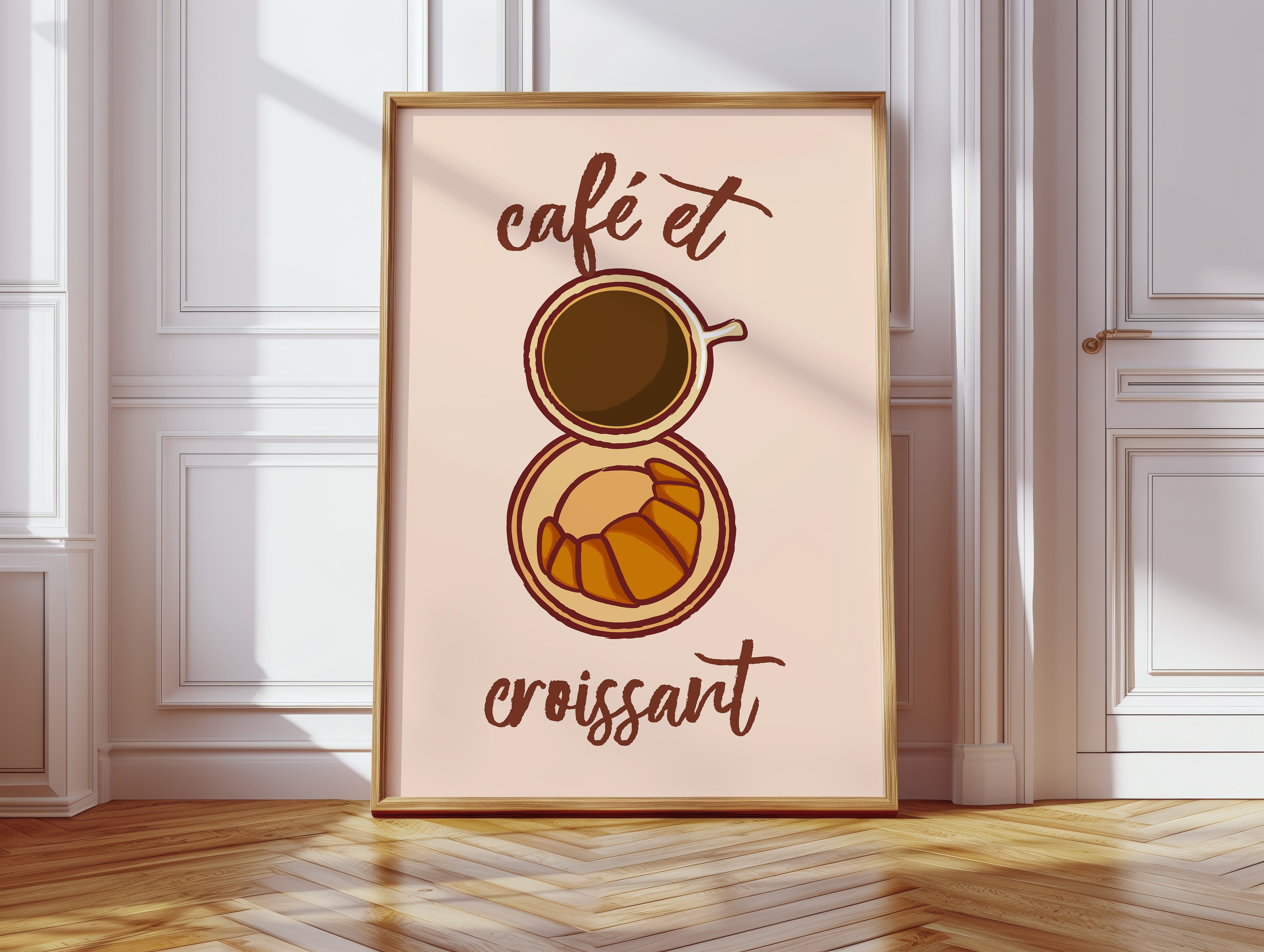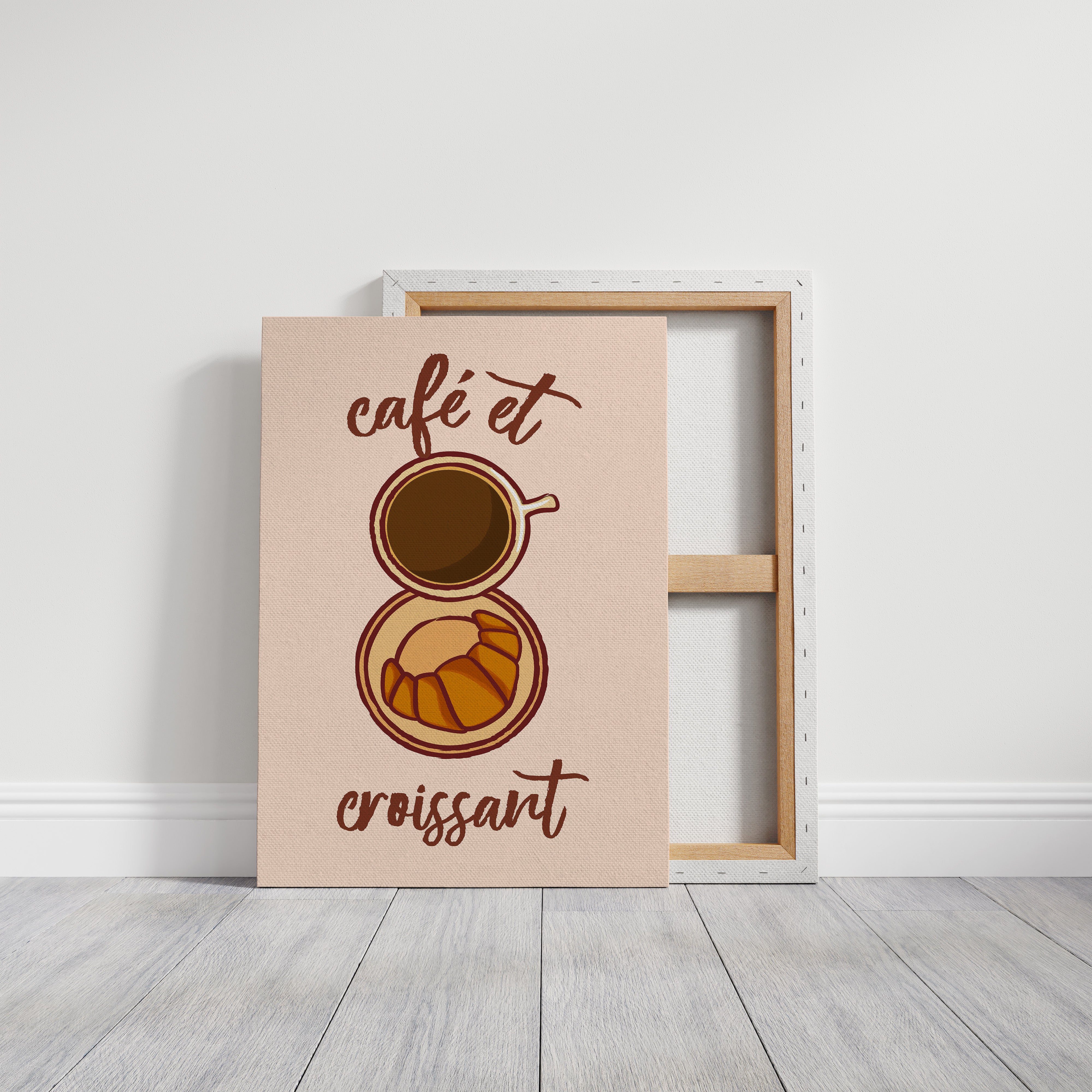 Steam rises like a morning promise, curling above a perfectly placed croissant and coffee cup in warm, inviting tones. This minimalist cafe illustration captures the essence of contemporary French bistro style. Rich browns and soft peach hues blend together in a harmonious composition, while hand-lettered text adds a playful touch of artisanal charm. The simple geometry of circles creates a satisfying balance, transforming an everyday moment into something quietly special. This piece brings Parisian cafe culture to your space, perfect for adding a touch of European sophistication to a kitchen nook or dining area. Let it remind you to slow down and savor life's simple pleasures.