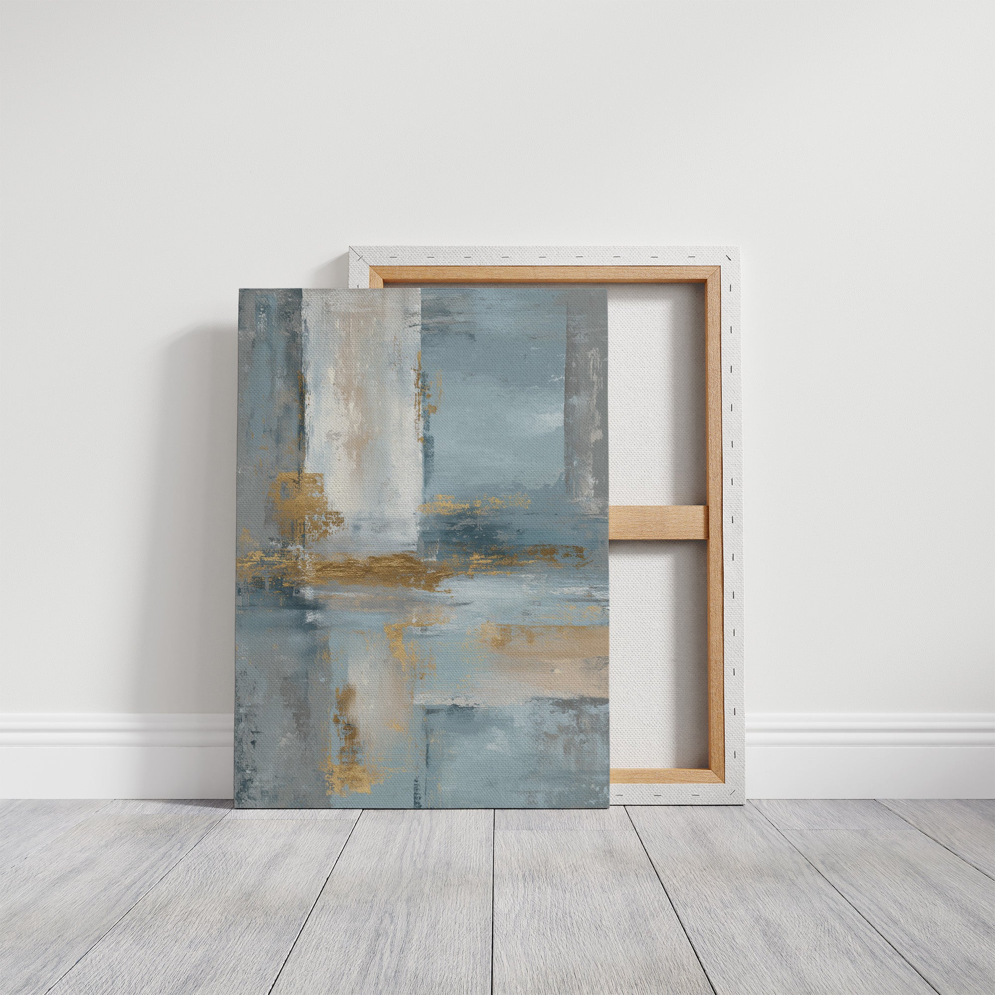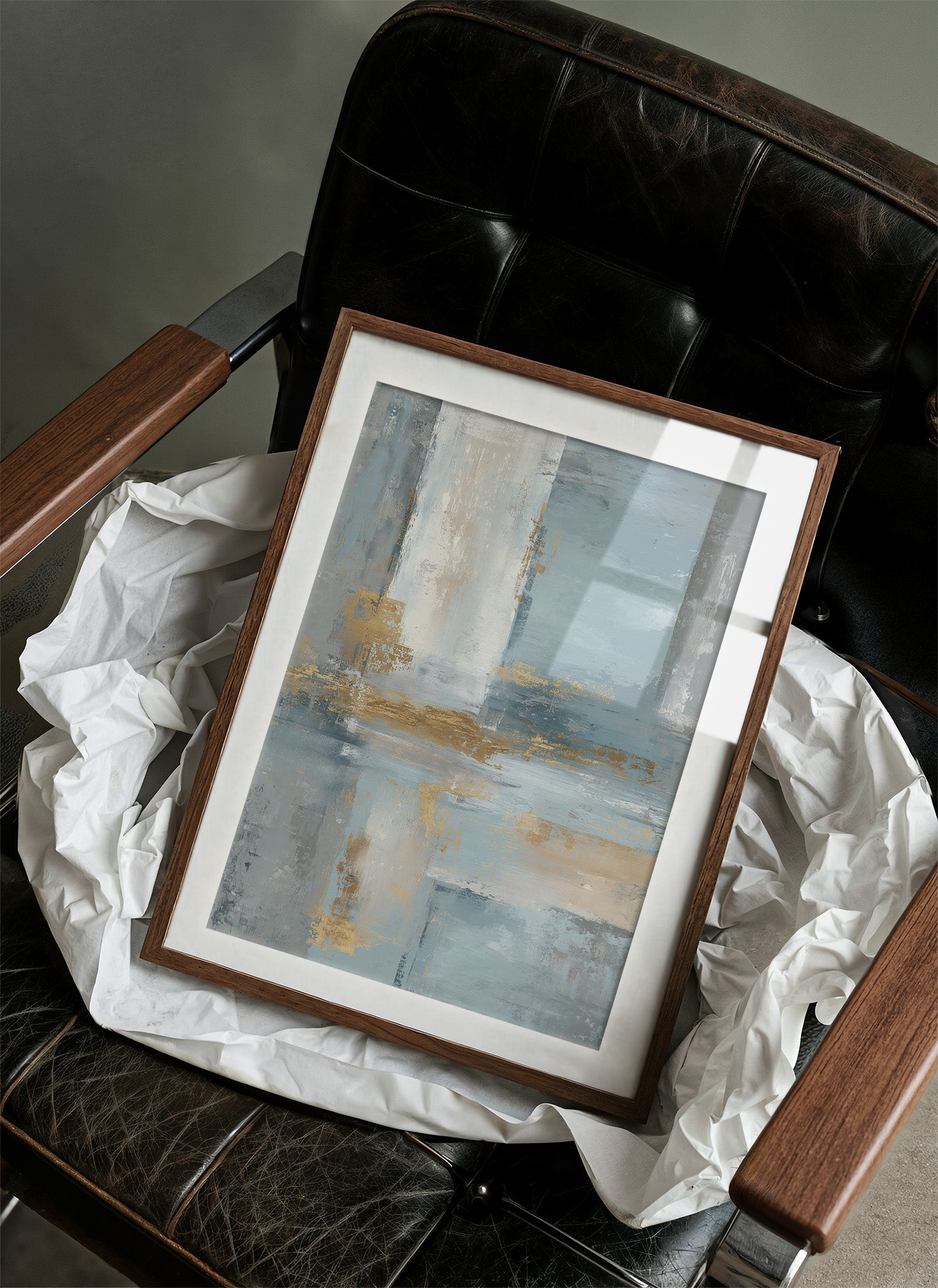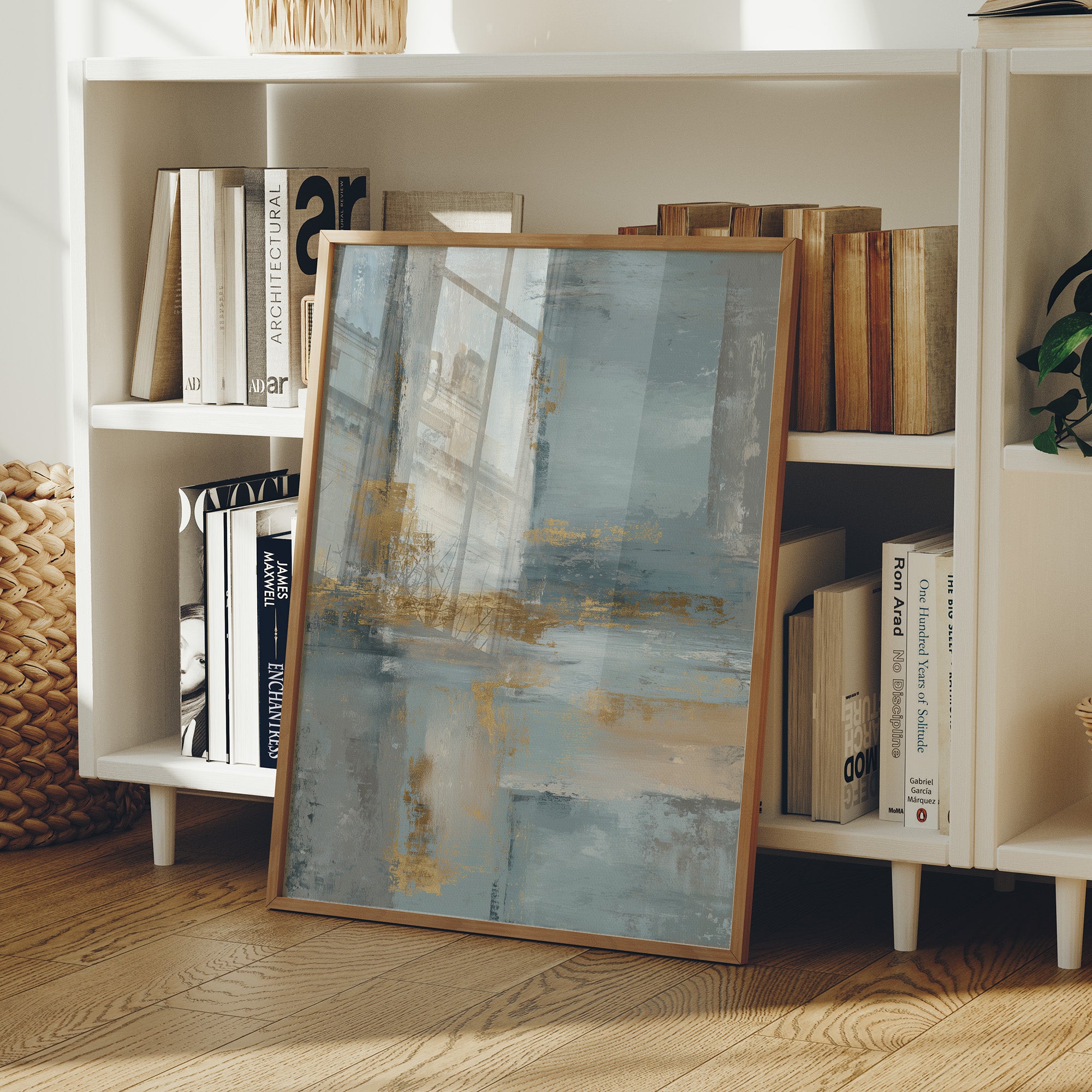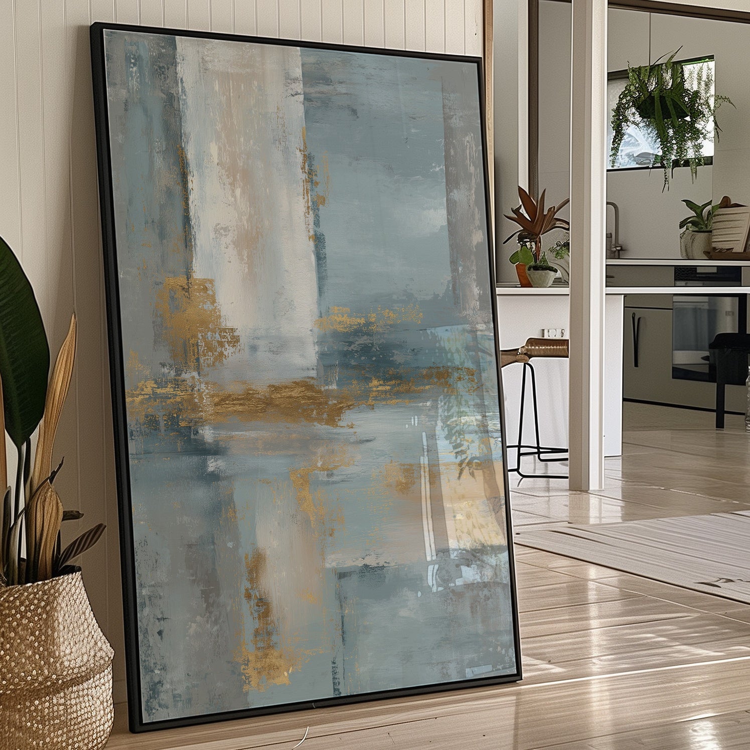 Soft morning light filters through sheer curtains, illuminating an abstract seascape where cool blues merge with sandy golds. The painting's gentle washes of color create a peaceful dialogue between sea and shore, with textured brushstrokes suggesting the meeting of tide and sand. The wooden frame perfectly complements the earthy elements while chrome accents in the furniture echo the painting's metallic highlights. This piece would elevate a modern living space or home office, creating a serene focal point that brings coastal tranquility indoors.