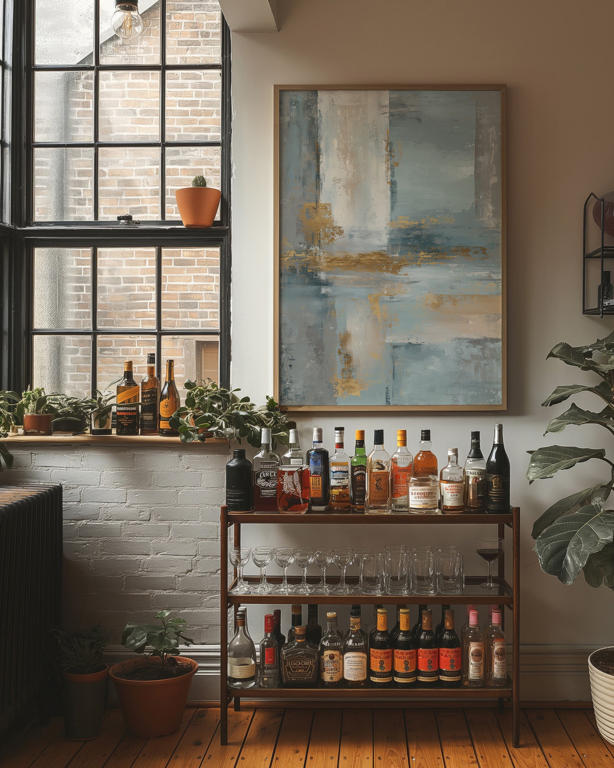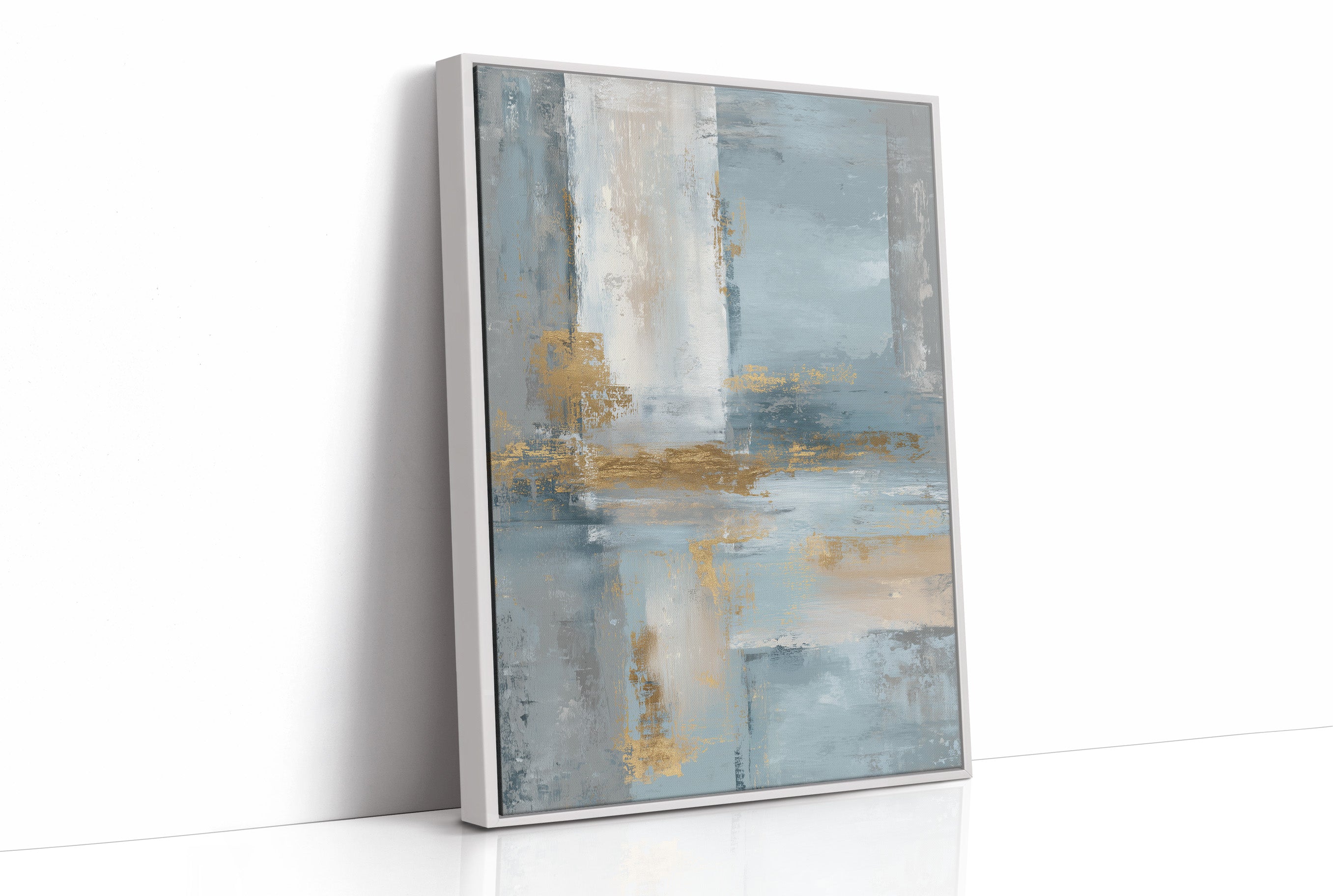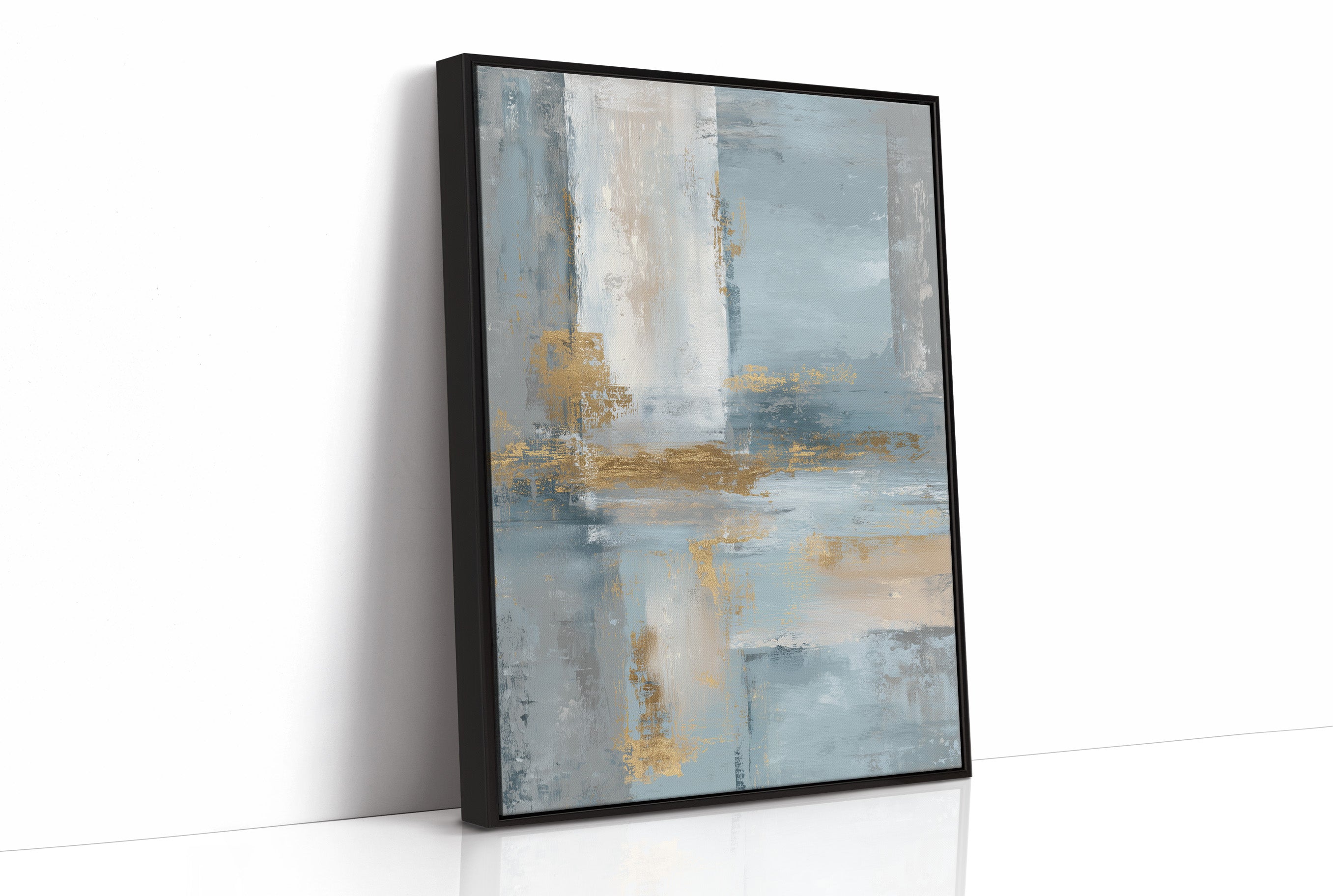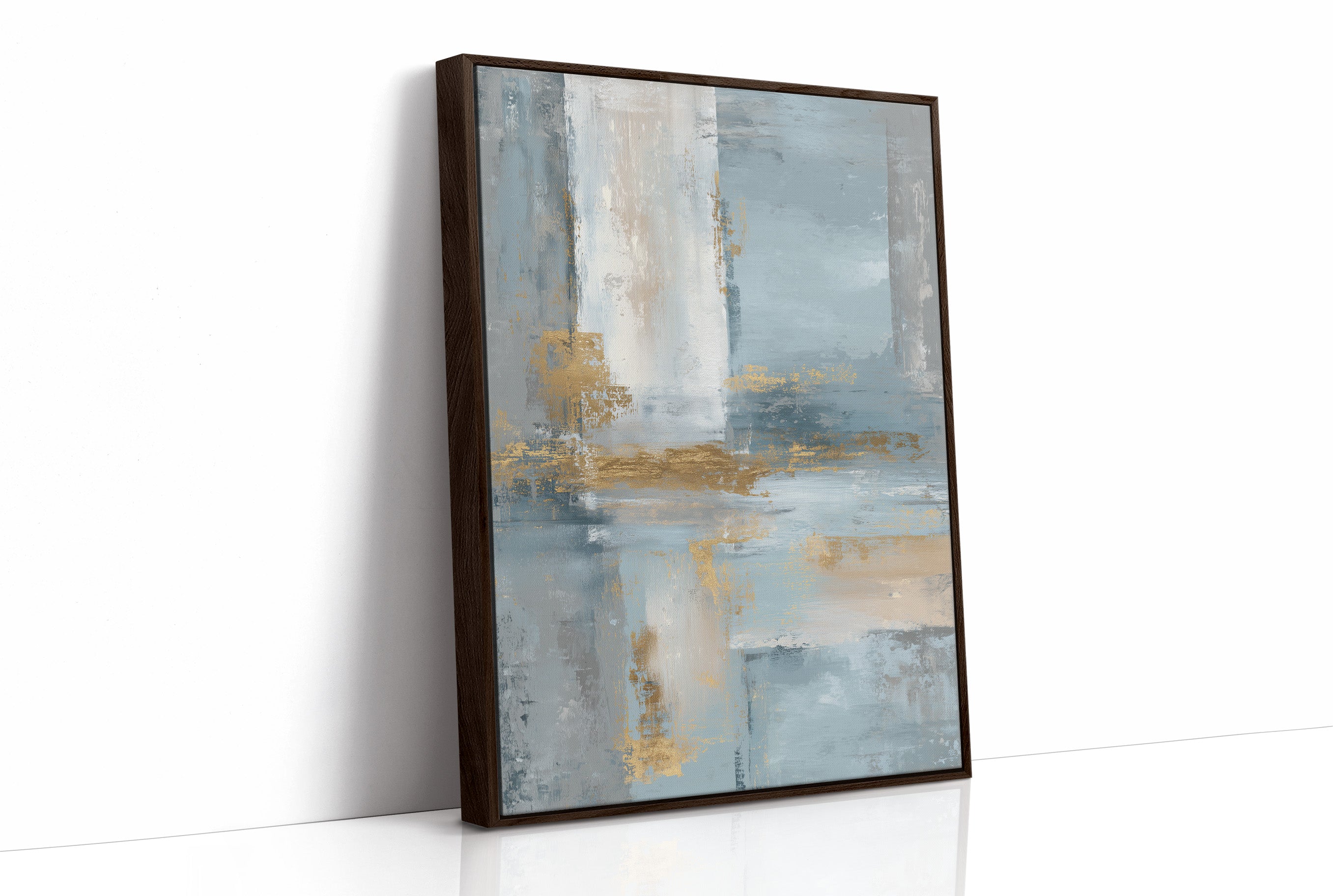 Soft morning light filters through sheer curtains, illuminating an abstract seascape where cool blues merge with sandy golds. The painting's gentle washes of color create a peaceful dialogue between sea and shore, with textured brushstrokes suggesting the meeting of tide and sand. The wooden frame perfectly complements the earthy elements while chrome accents in the furniture echo the painting's metallic highlights. This piece would elevate a modern living space or home office, creating a serene focal point that brings coastal tranquility indoors.
