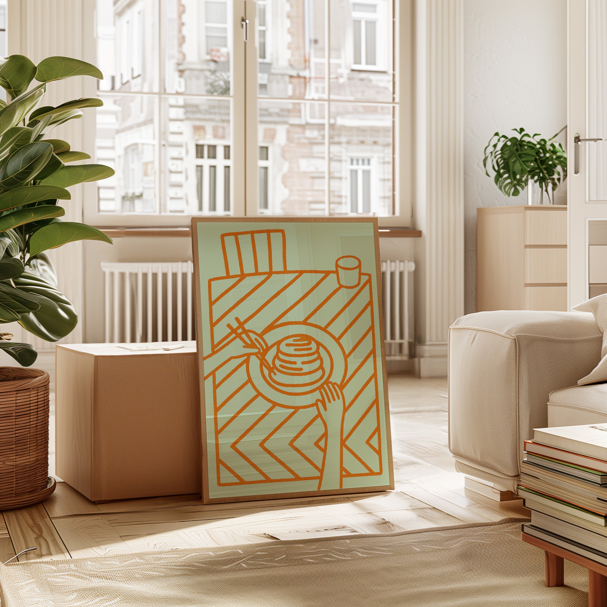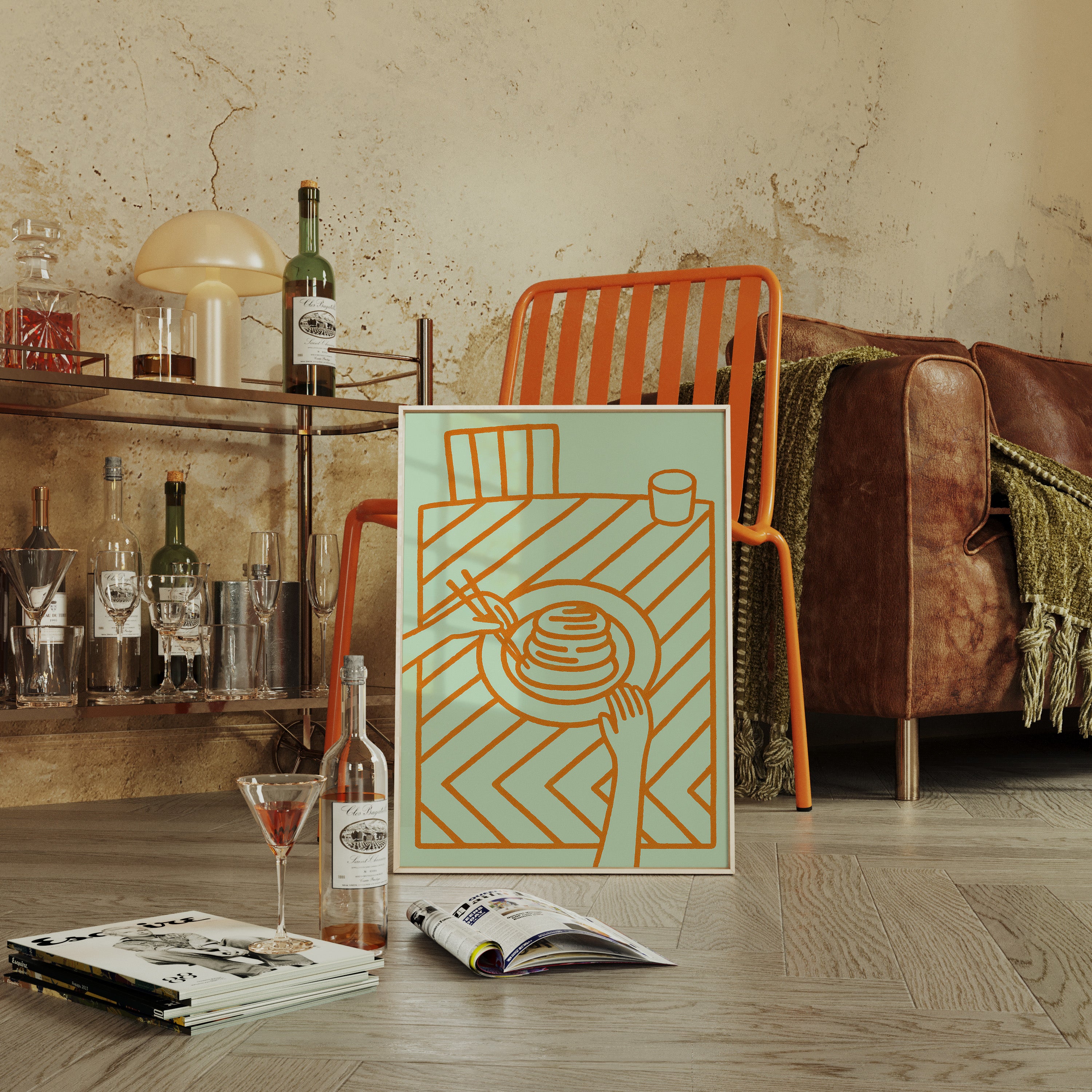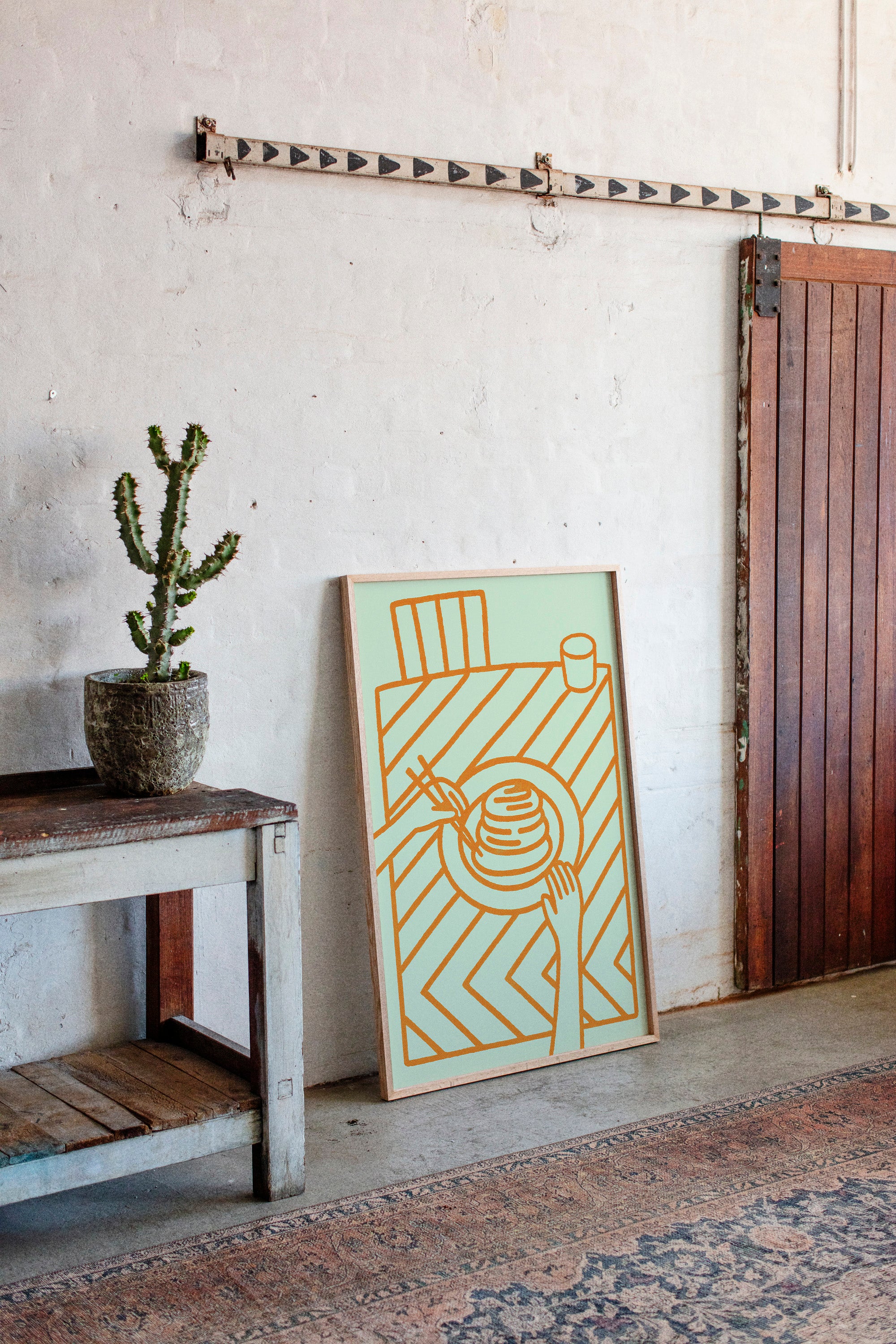 A minimalist scene unfolds where geometric simplicity meets desert charm. The soft mint canvas adorned with copper-toned line art of breakfast essentials creates a playful dialogue with a lone cactus sentinel perched nearby. Industrial elements like the arrow-decorated rail and weathered wooden furniture add character to the raw concrete walls, while the vintage-inspired illustration captures a moment of culinary contemplation. This piece would bring a touch of modern southwestern flair to a breakfast nook or casual dining space.