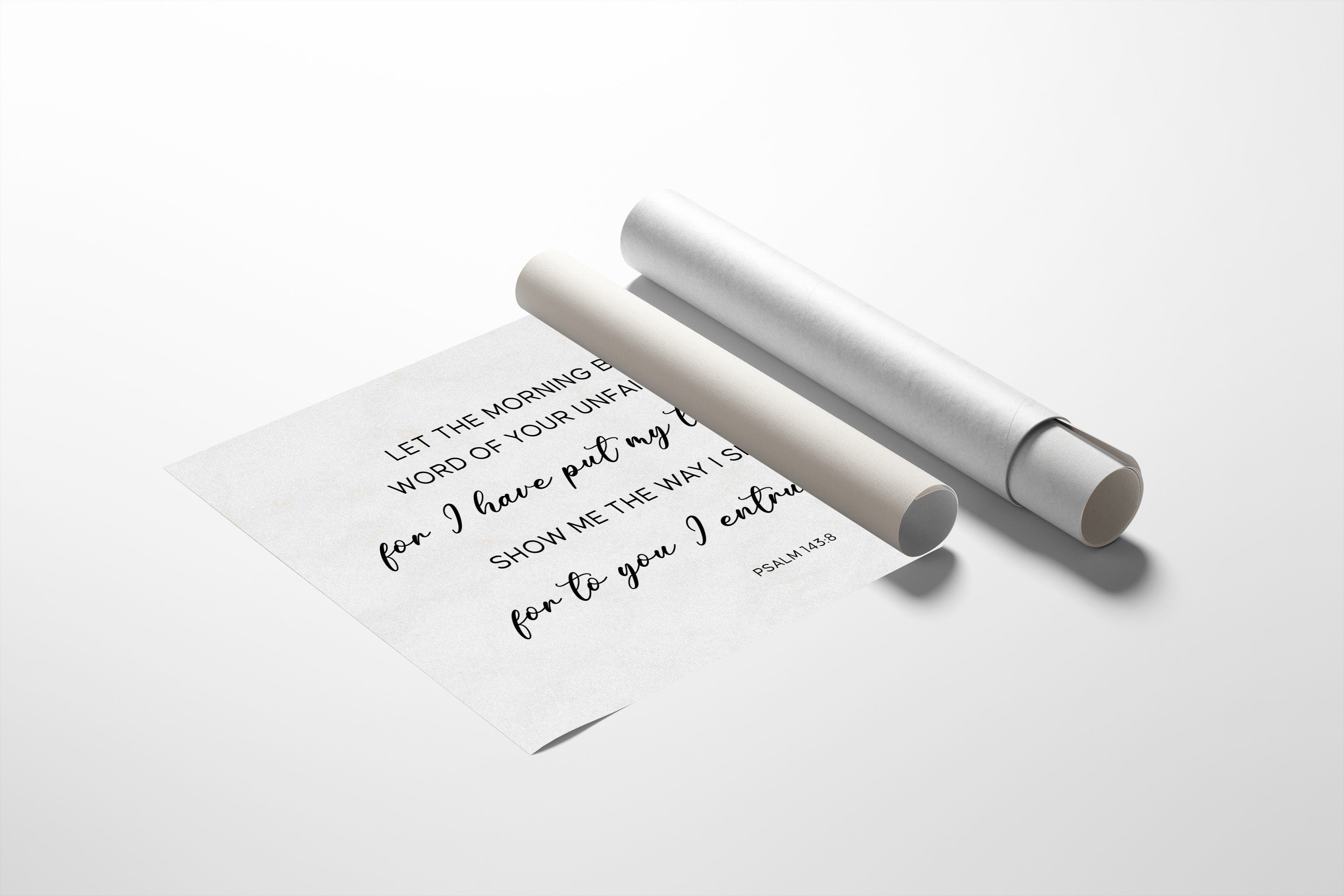 Warm sunlight bathes this tranquil corner where faith meets design. The elegant framed scripture from Psalm 143:8 rests against a backdrop of natural wood shelving, surrounded by well-loved books and complemented by delicate dried pampas grass in an earthen vessel. The minimalist typography blends bold and script lettering, creating a visual rhythm that mirrors the prayer's gentle cadence of trust and guidance.