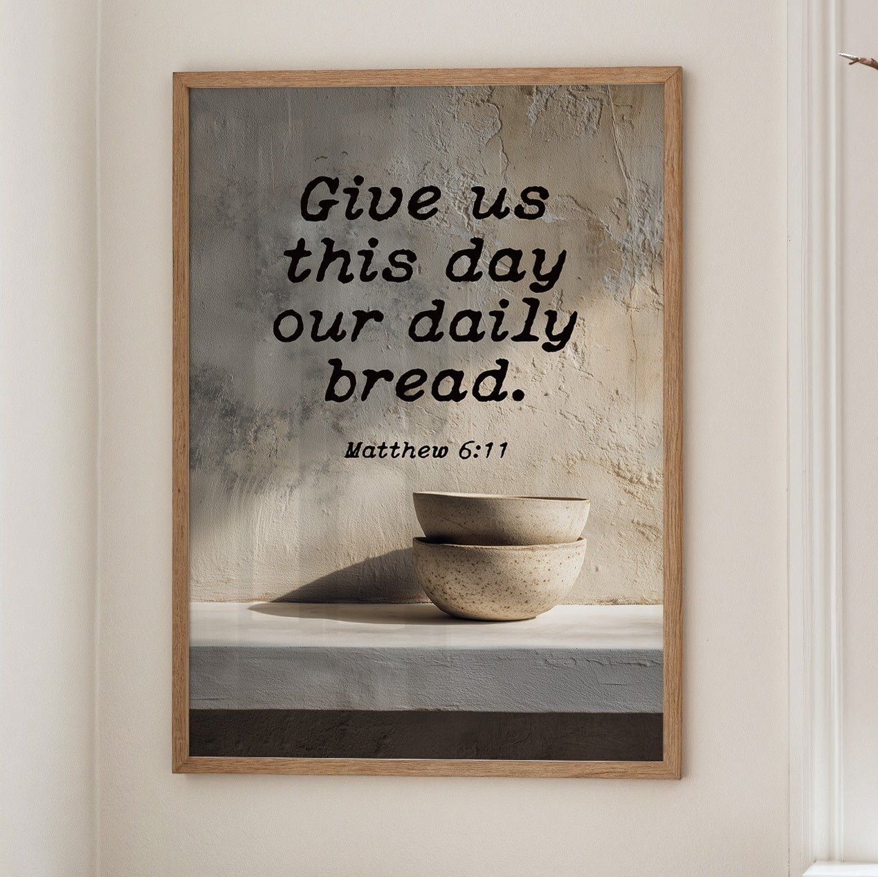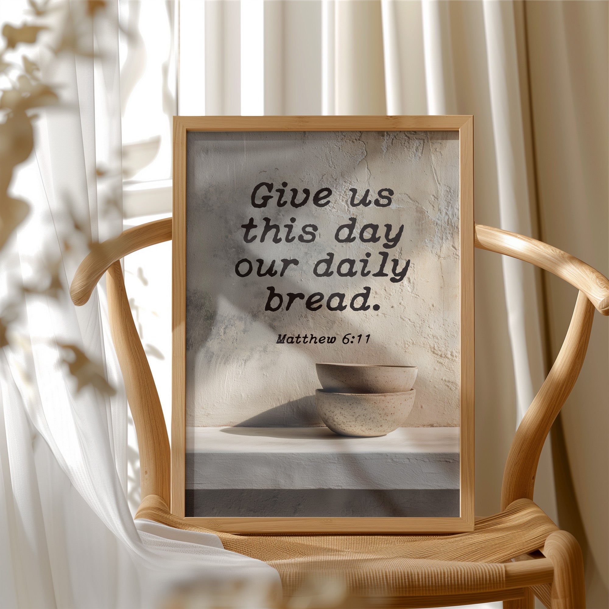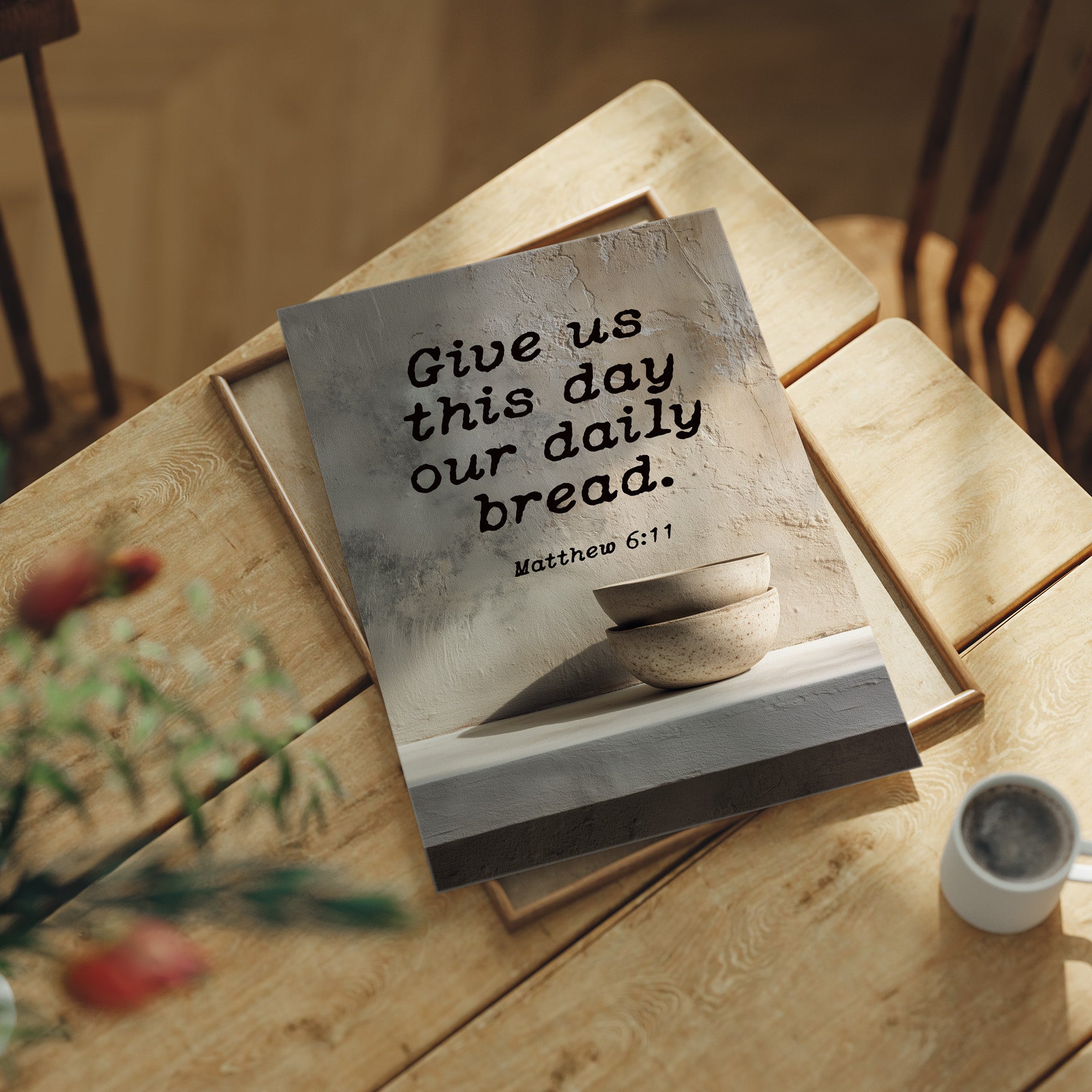 Warm sunlight bathes this moment of quiet devotion, where scripture meets the simplicity of daily ritual. A textured plaque bearing Matthew 6:11 rests on natural wooden slats, accompanied by minimalist ceramic bowls that speak of humility and sustenance. The scene captures that sacred pause in our hurried livesa gentle reminder of gratitude amidst the warm tones of a thoughtfully arranged breakfast nook.