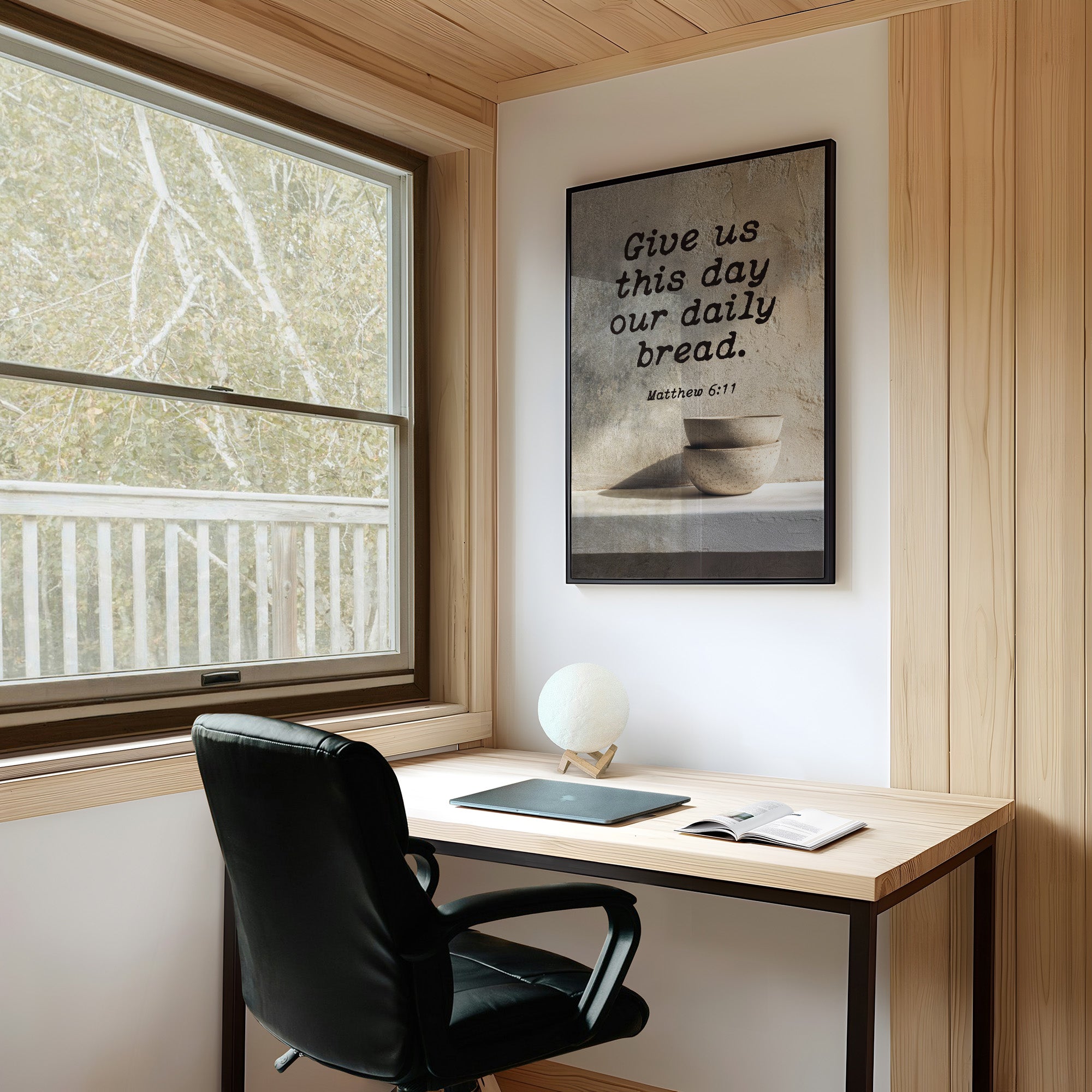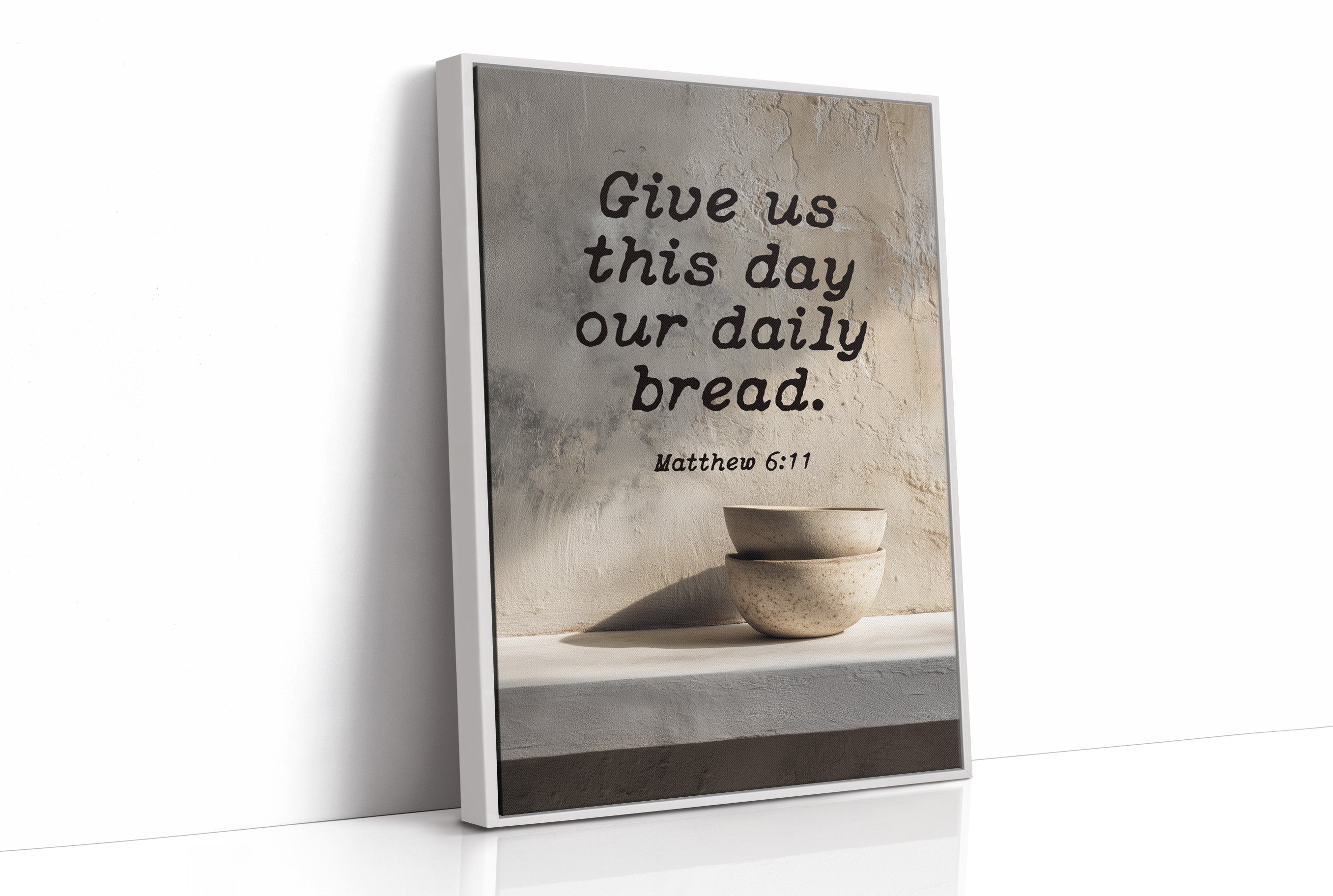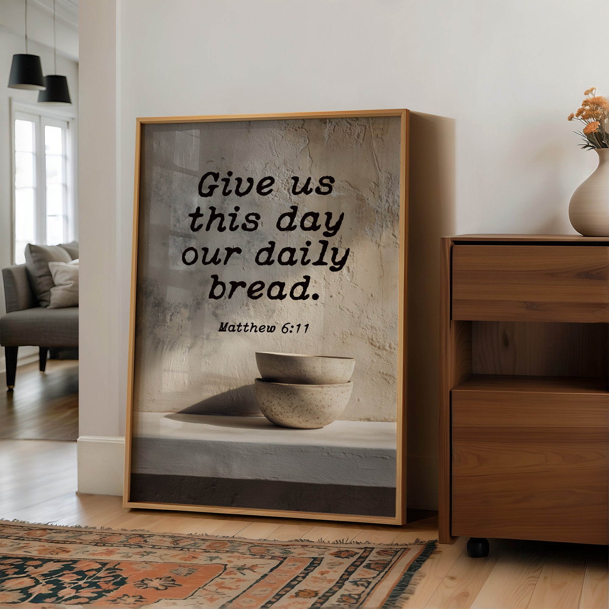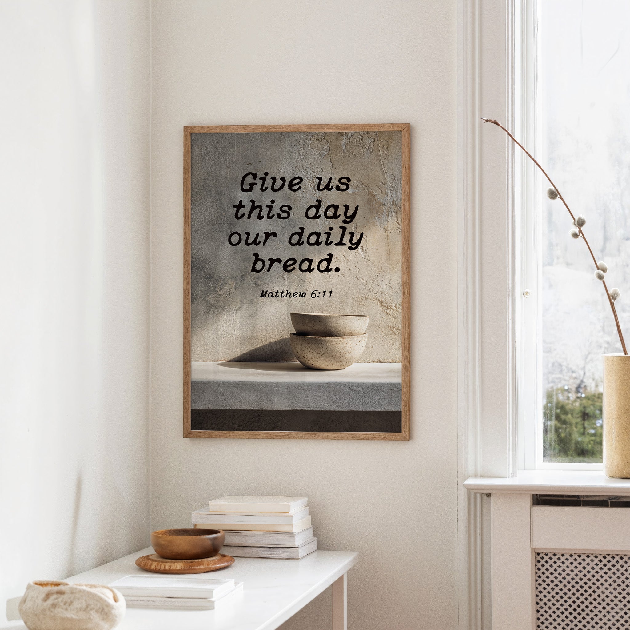 Warm sunlight bathes this moment of quiet devotion, where scripture meets the simplicity of daily ritual. A textured plaque bearing Matthew 6:11 rests on natural wooden slats, accompanied by minimalist ceramic bowls that speak of humility and sustenance. The scene captures that sacred pause in our hurried livesa gentle reminder of gratitude amidst the warm tones of a thoughtfully arranged breakfast nook.