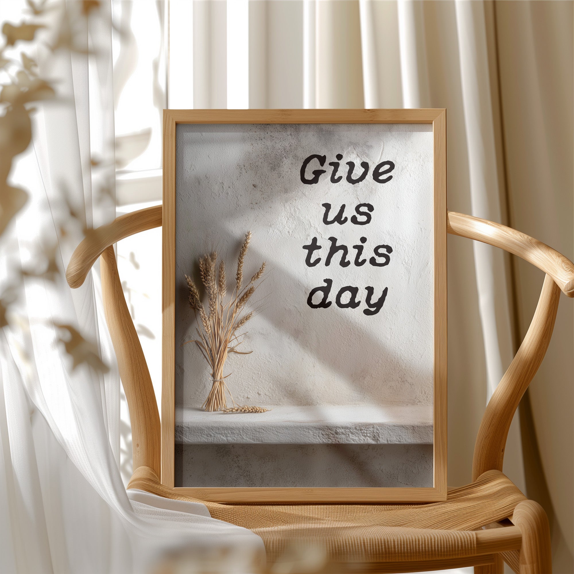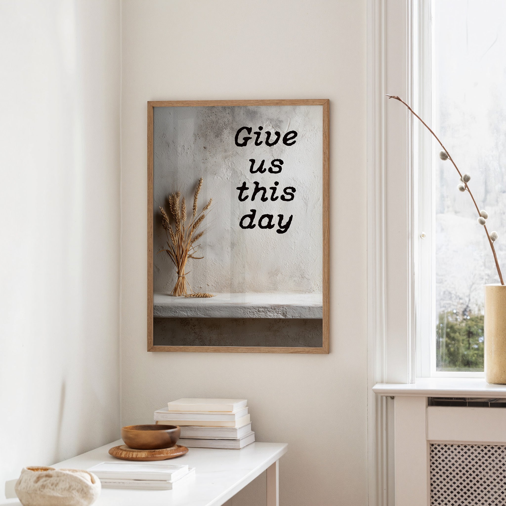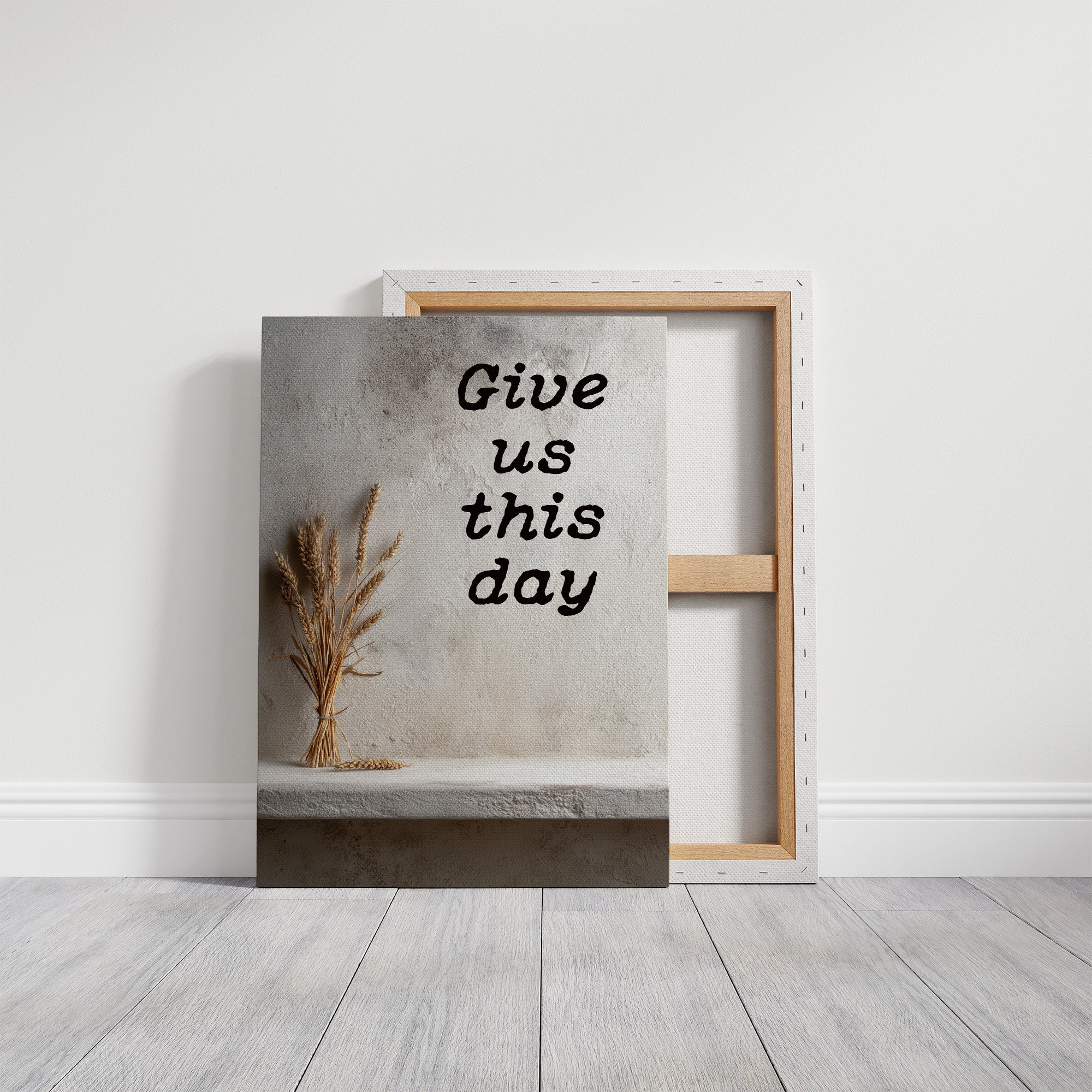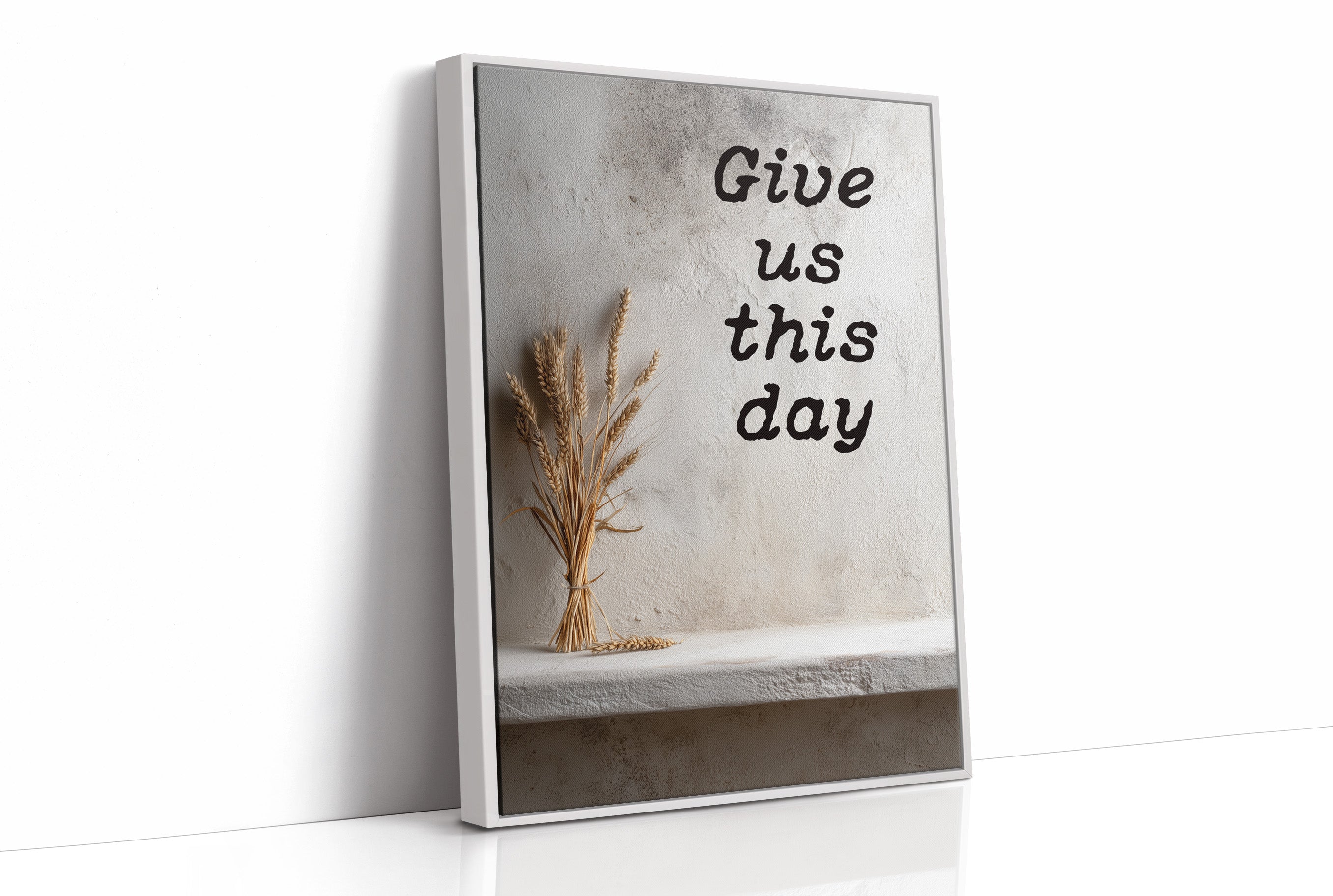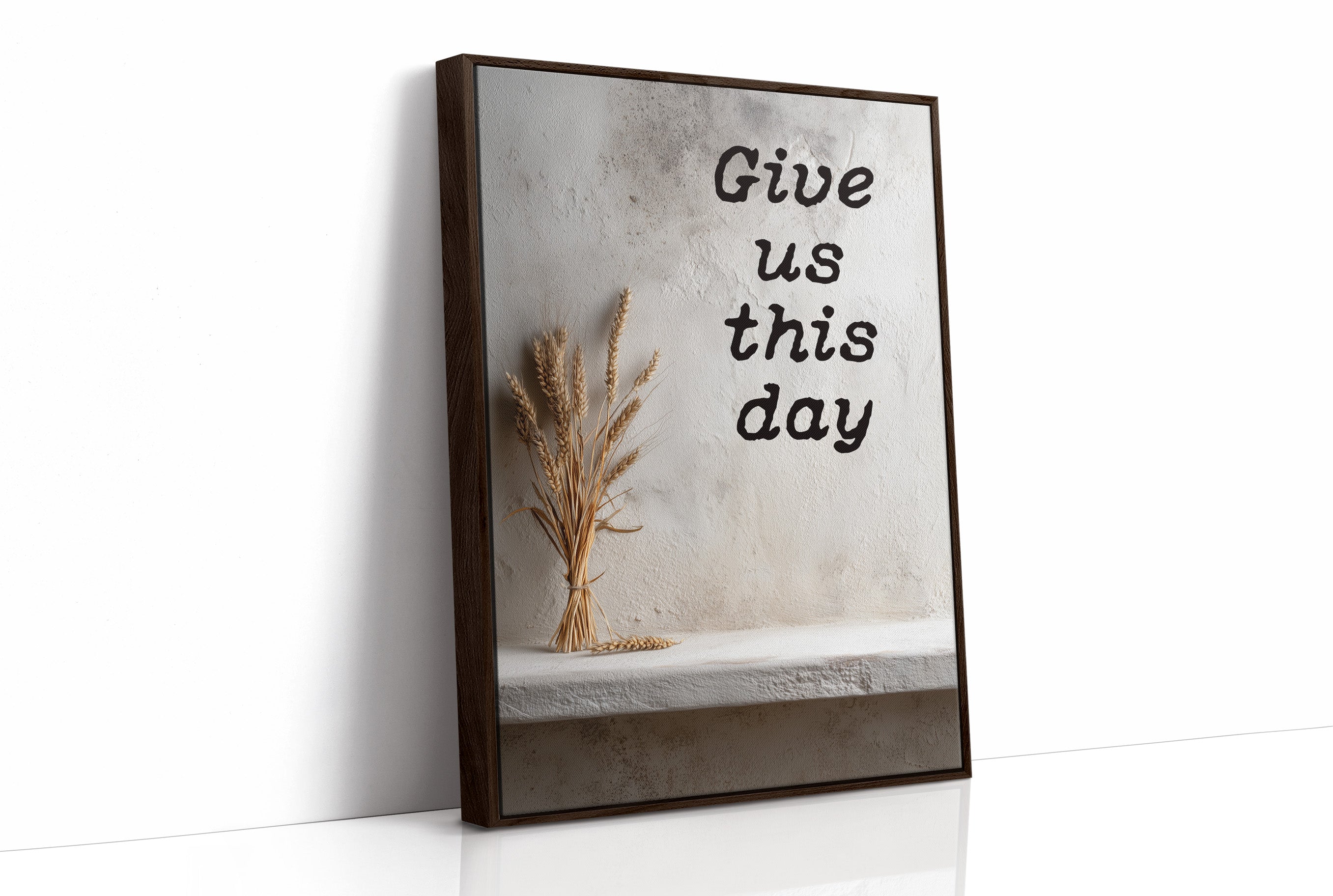 Sunlight falls gently across a moment of quiet devotion, where simplicity speaks volumes. A minimalist canvas bears the humble prayer "Give us this day" alongside a small bundle of dried wheat, resting on a rustic wooden table that tells its own stories of gathered meals and shared blessings. The warm honey tones of the wood contrast beautifully with the textured white surface of the artwork, creating a scene of contemplative stillness that invites pause in our hurried lives.