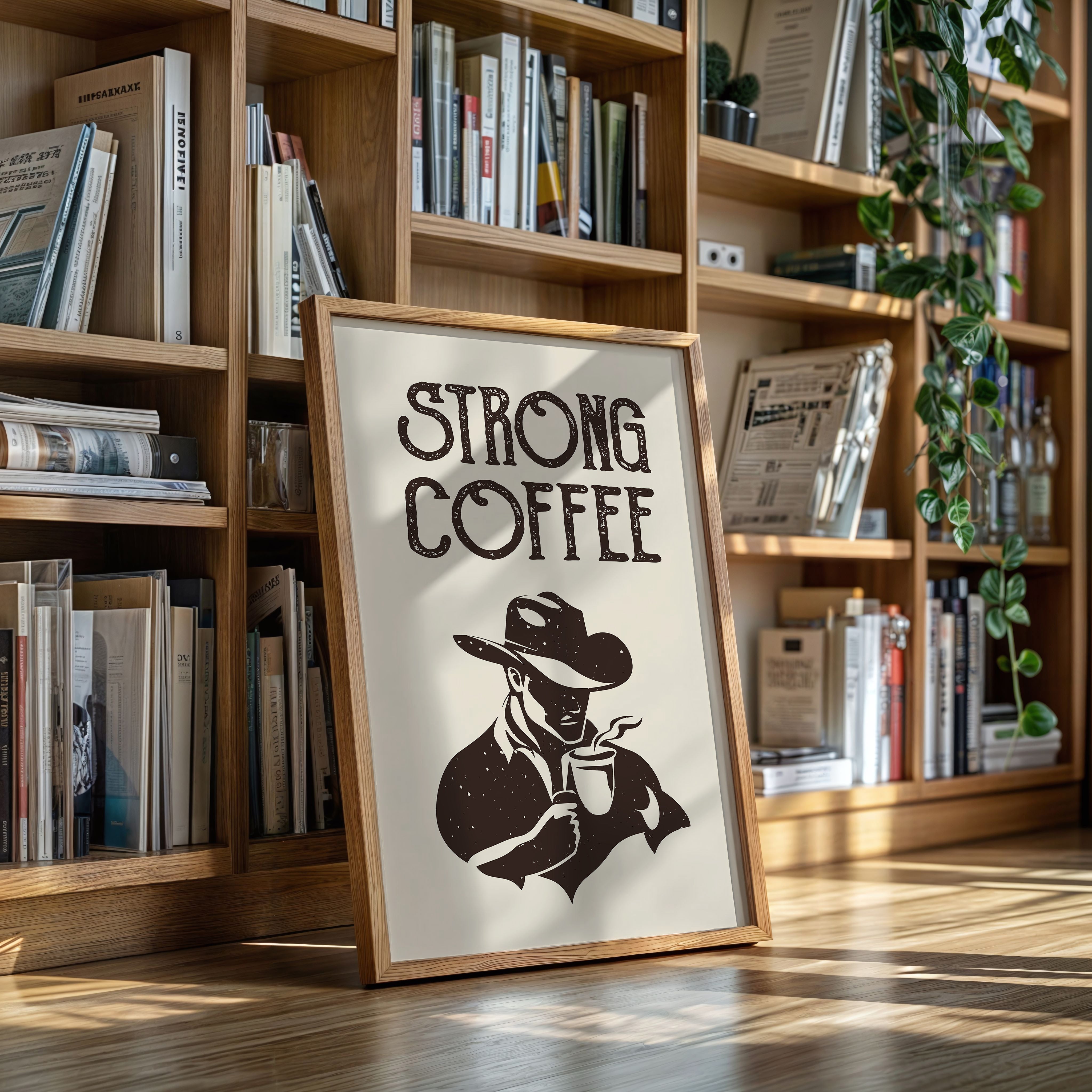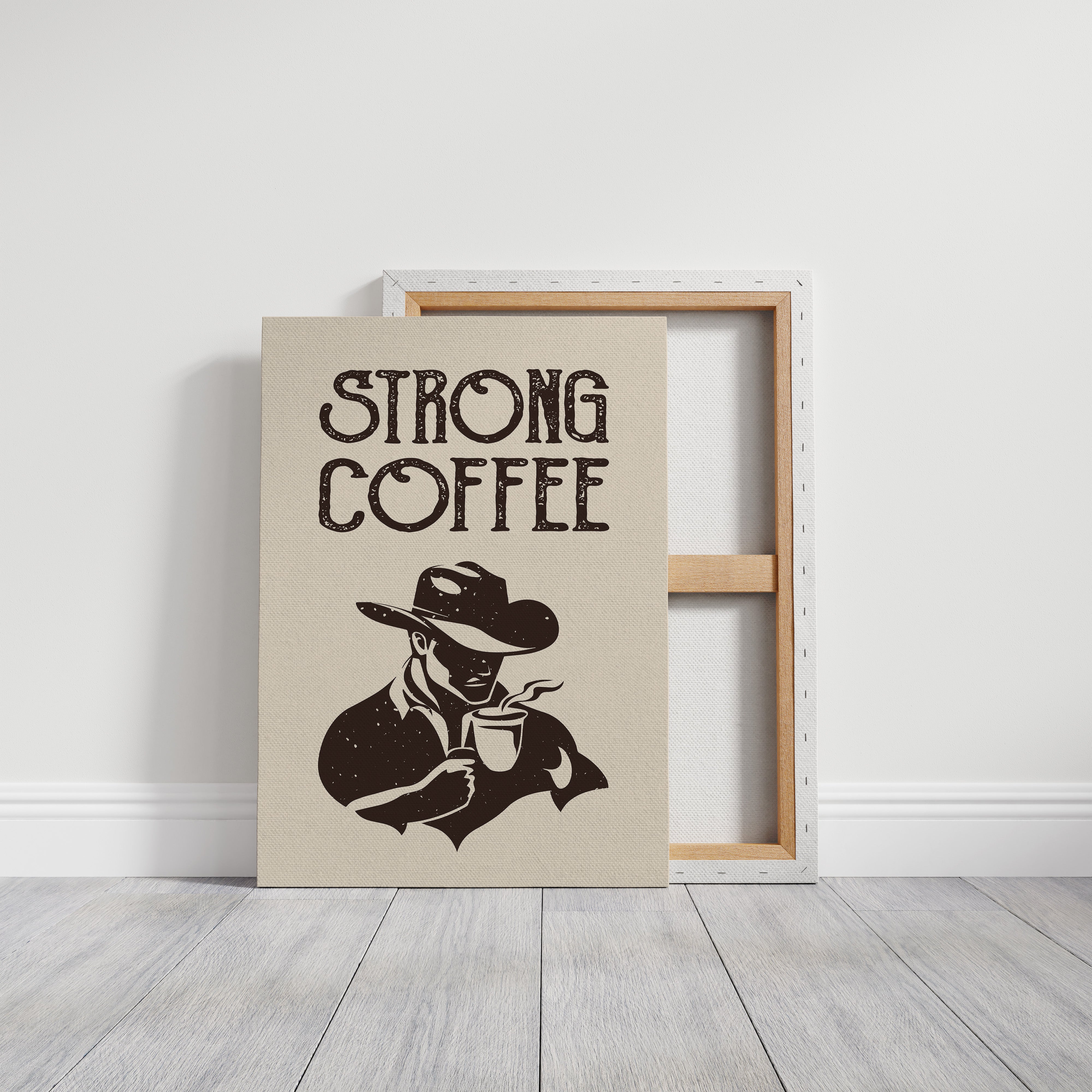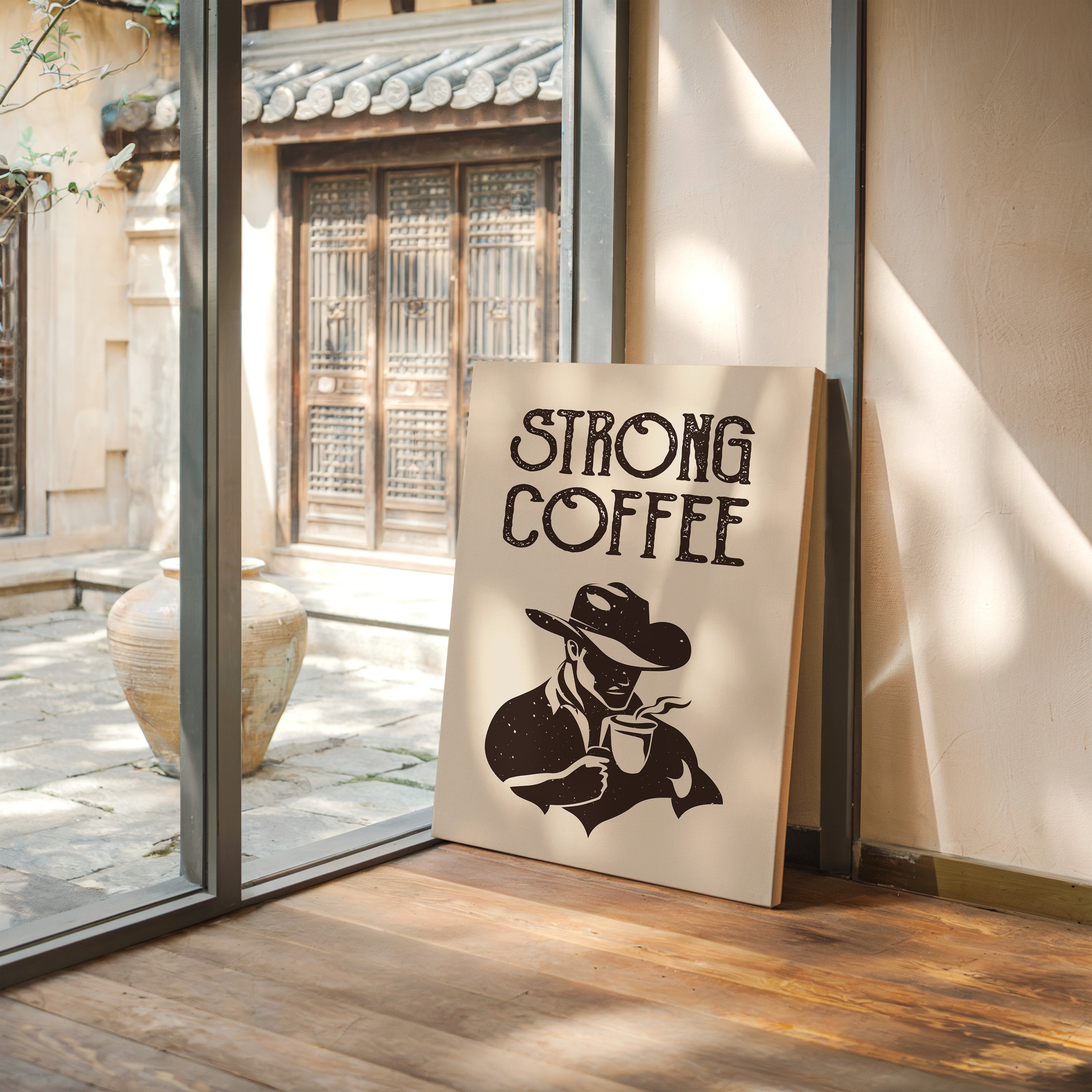 Steam rises like morning fog against a weathered hat brim, carrying stories of dawn patrols and dusty trails. This contemporary take on classic Western imagery merges rustic charm with modern coffee culture. The bold silhouette captures a moment of contemplation, where rugged meets refined in a dance of dark and light. Rich contrasts and textured details create a striking narrative of tradition meeting contemporary life. Perfect for kitchen spaces, coffee bars, or any room seeking to blend vintage Western charm with modern sophistication. Each glance reveals the quiet strength found in daily rituals.