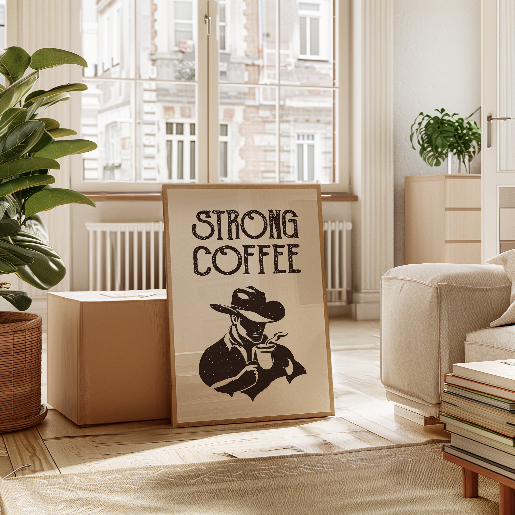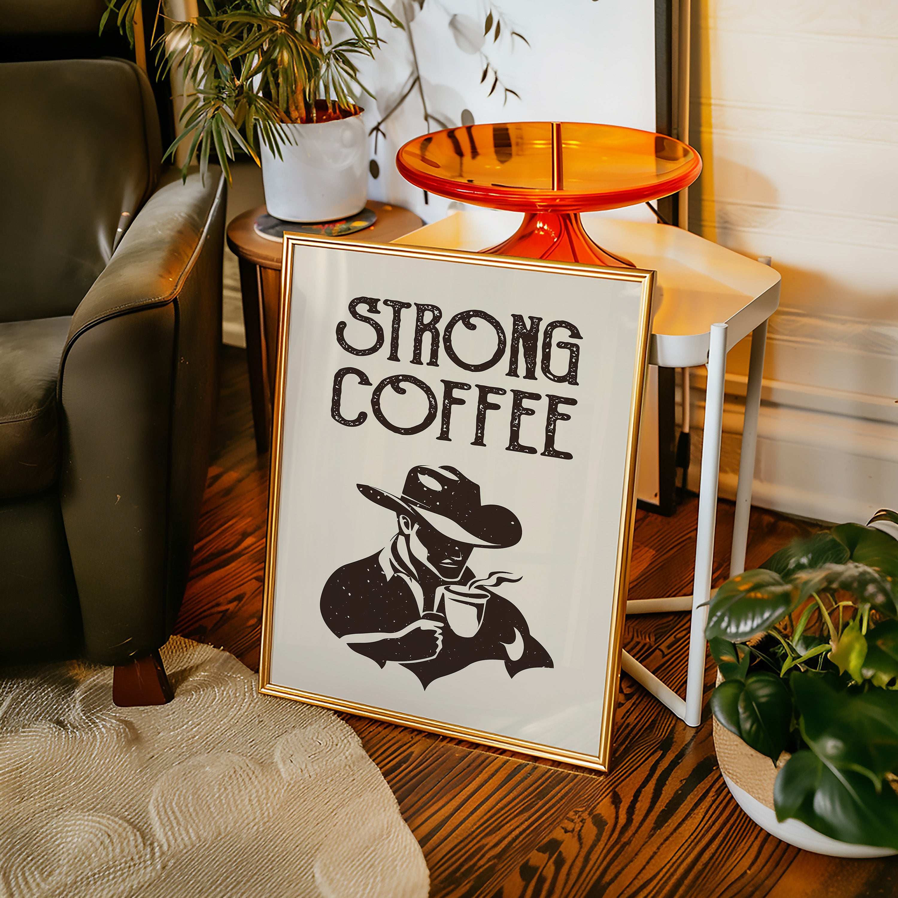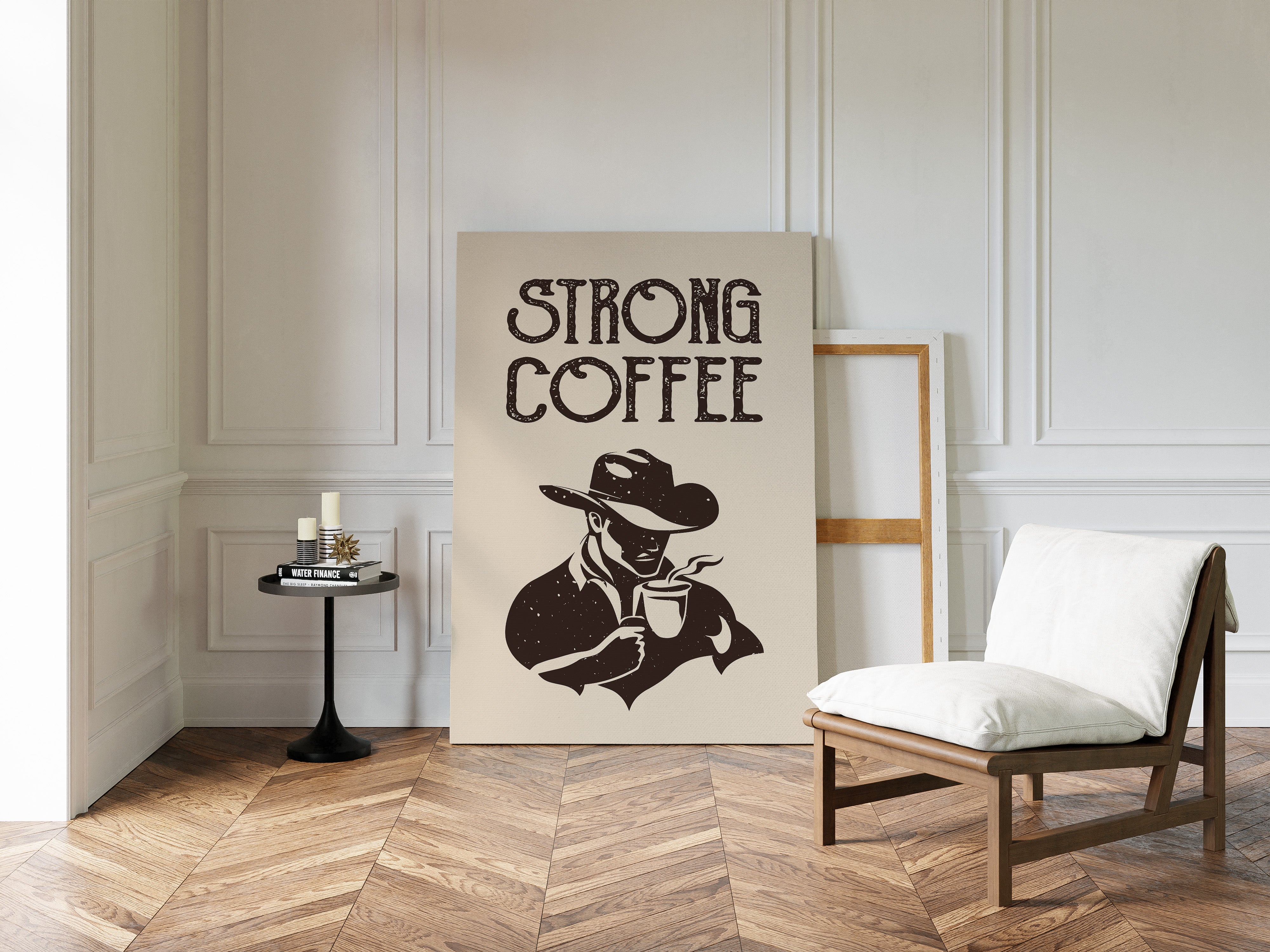 Steam rises like morning fog against a weathered hat brim, carrying stories of dawn patrols and dusty trails. This contemporary take on classic Western imagery merges rustic charm with modern coffee culture. The bold silhouette captures a moment of contemplation, where rugged meets refined in a dance of dark and light. Rich contrasts and textured details create a striking narrative of tradition meeting contemporary life. Perfect for kitchen spaces, coffee bars, or any room seeking to blend vintage Western charm with modern sophistication. Each glance reveals the quiet strength found in daily rituals.