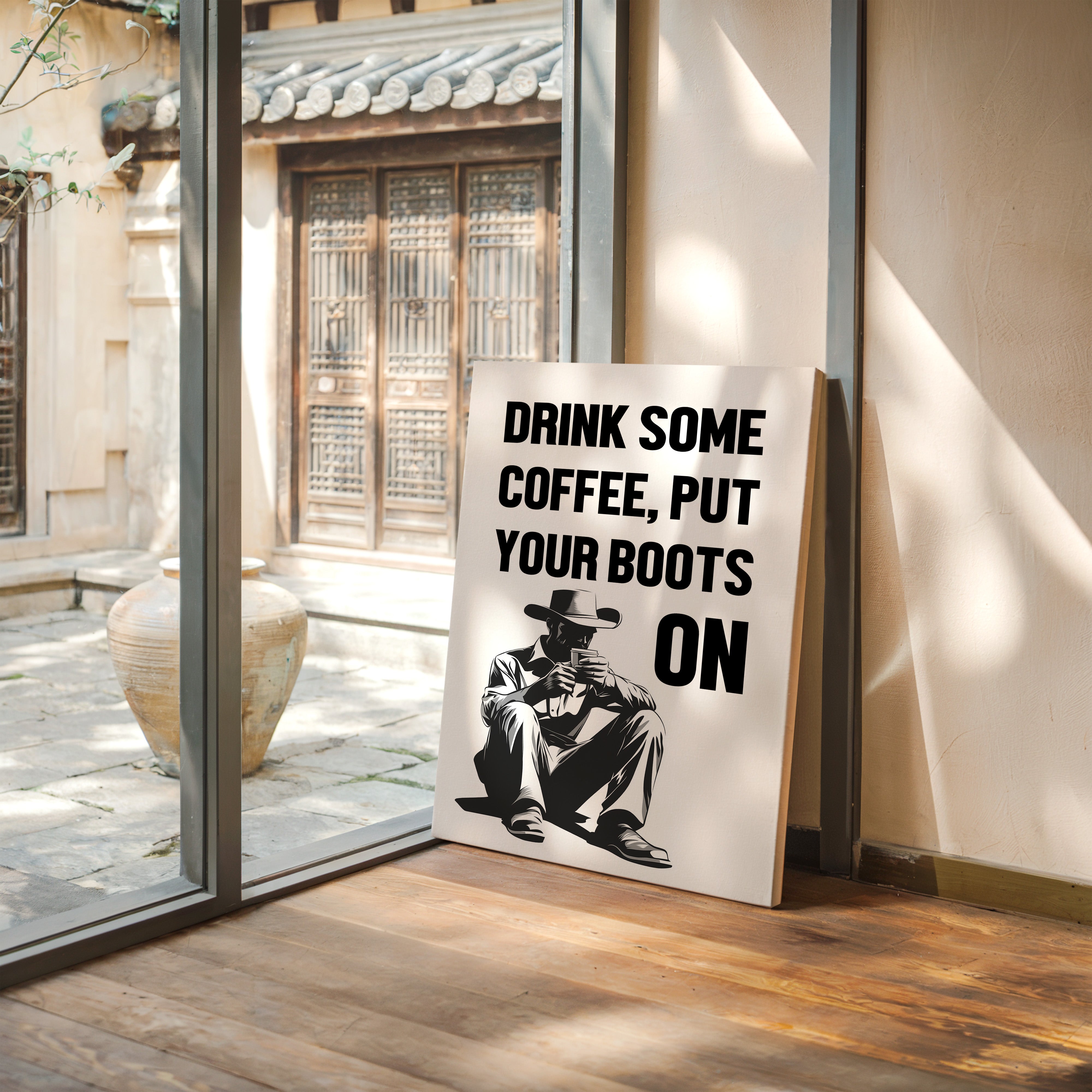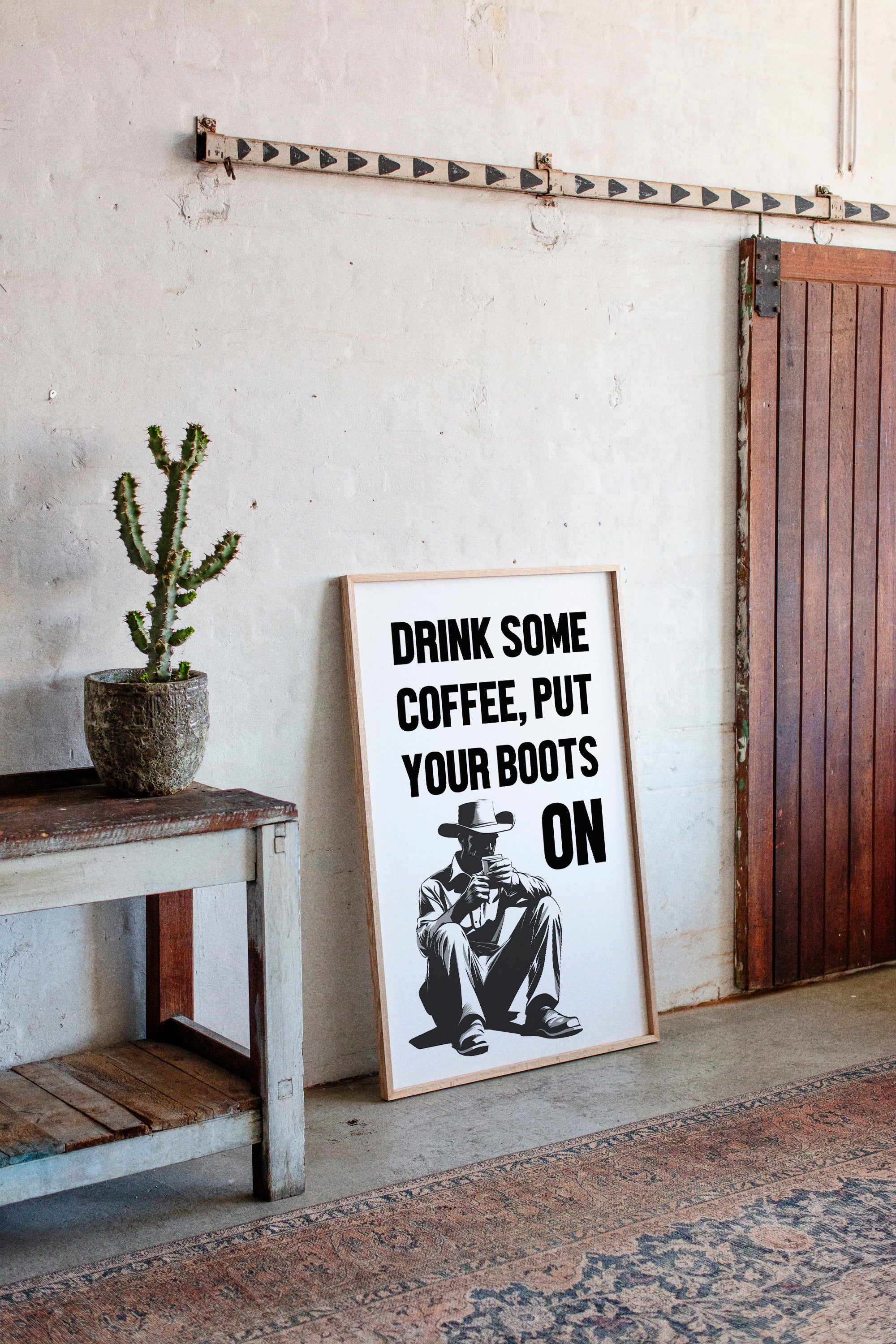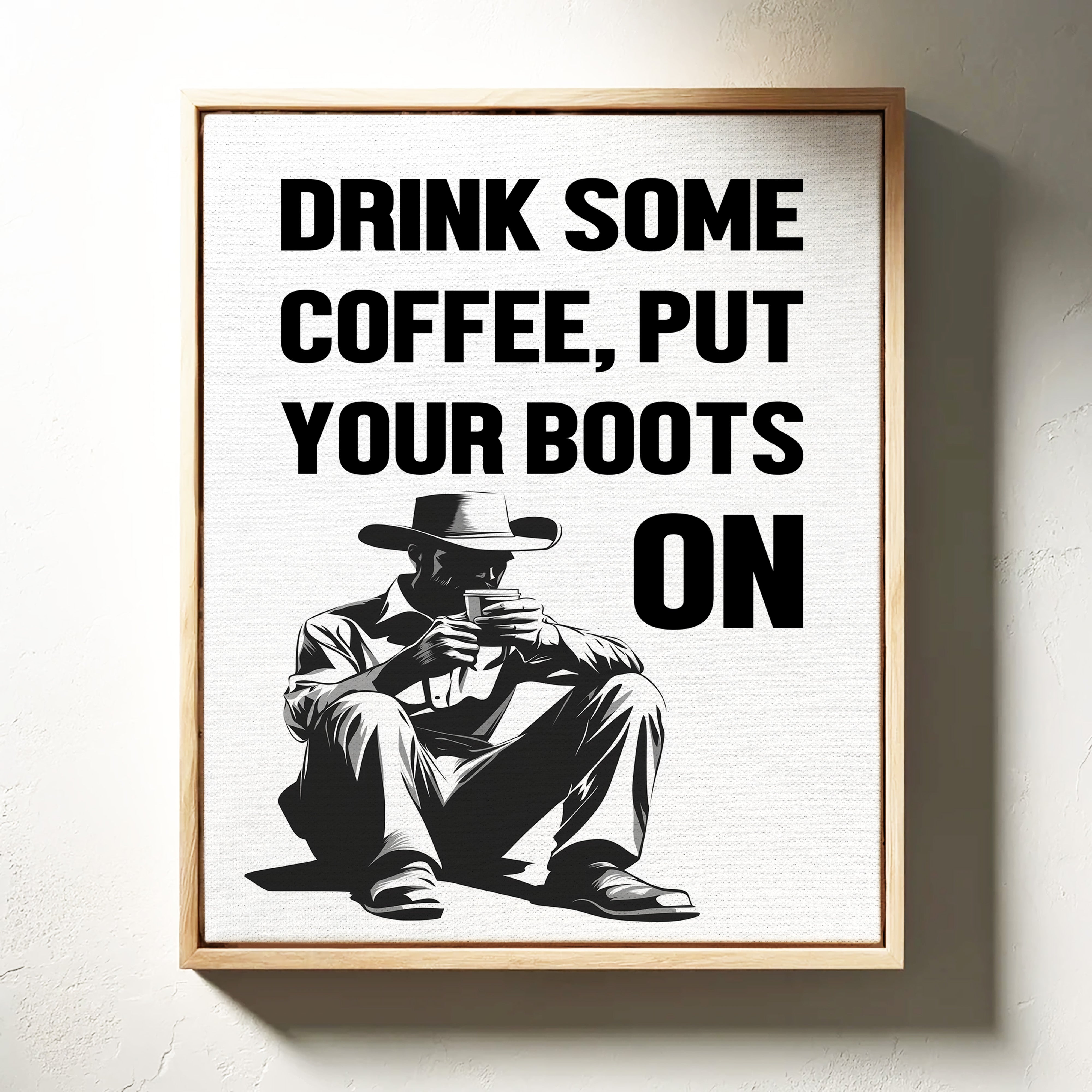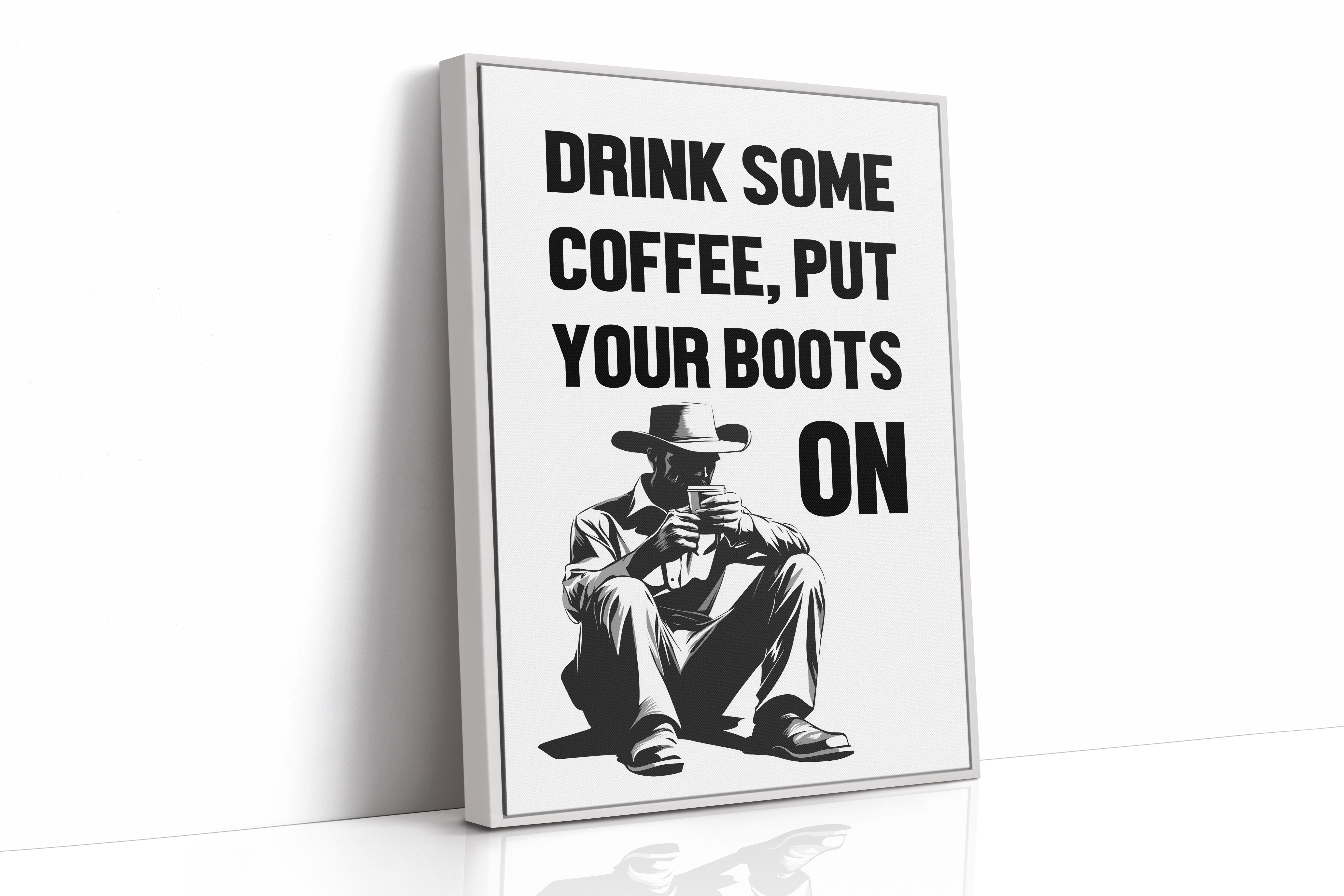 Steam rises like dawn's first breath, mingling with the quiet determination of a new day. This striking monochromatic piece captures the essence of contemporary western minimalism. Against a pristine white background, a lone figure pauses in contemplation, cowboy hat tipped just so, finding sanctuary in that sacred moment between first sip and day's demands. The bold typography and clean lines create a powerful statement about modern ranch life meets coffee culture. This piece commands attention in a kitchen, home office, or coffee bar, bringing both motivation and style to your space. Its message serves as a daily reminder that every morning carries the promise of possibility.